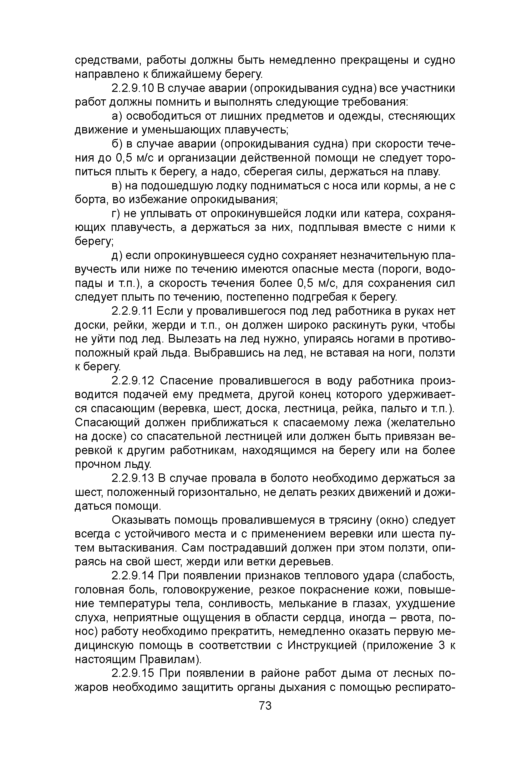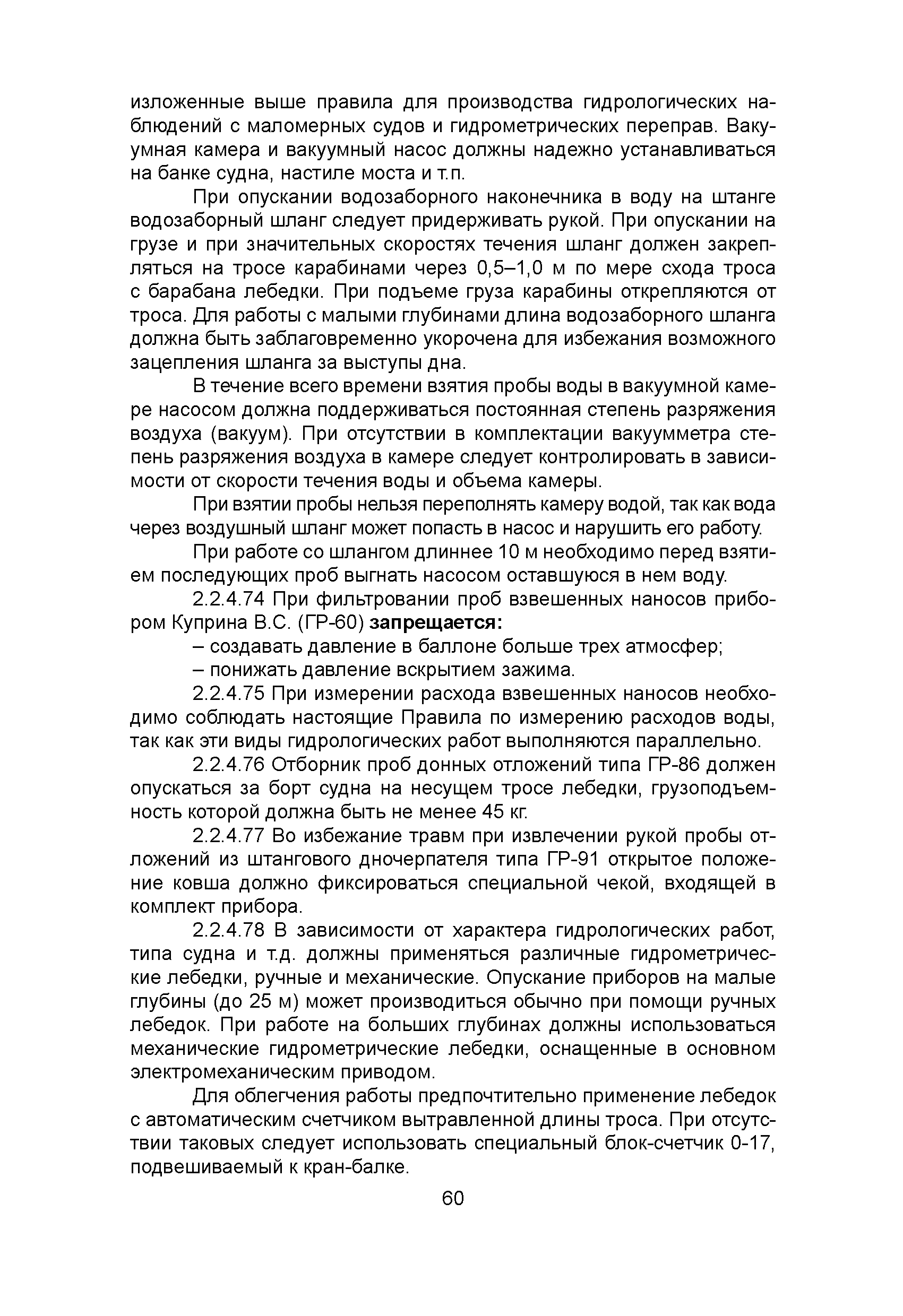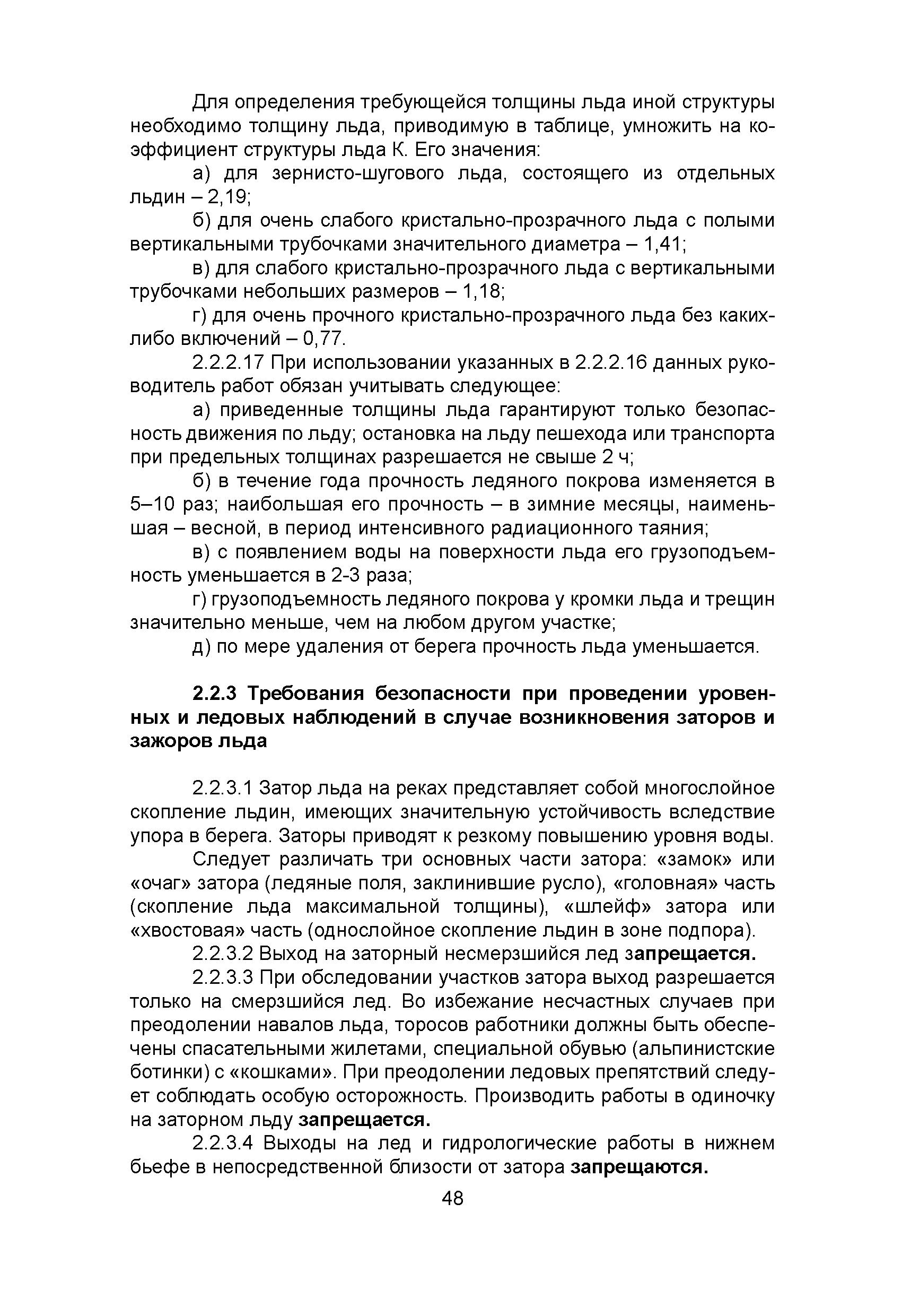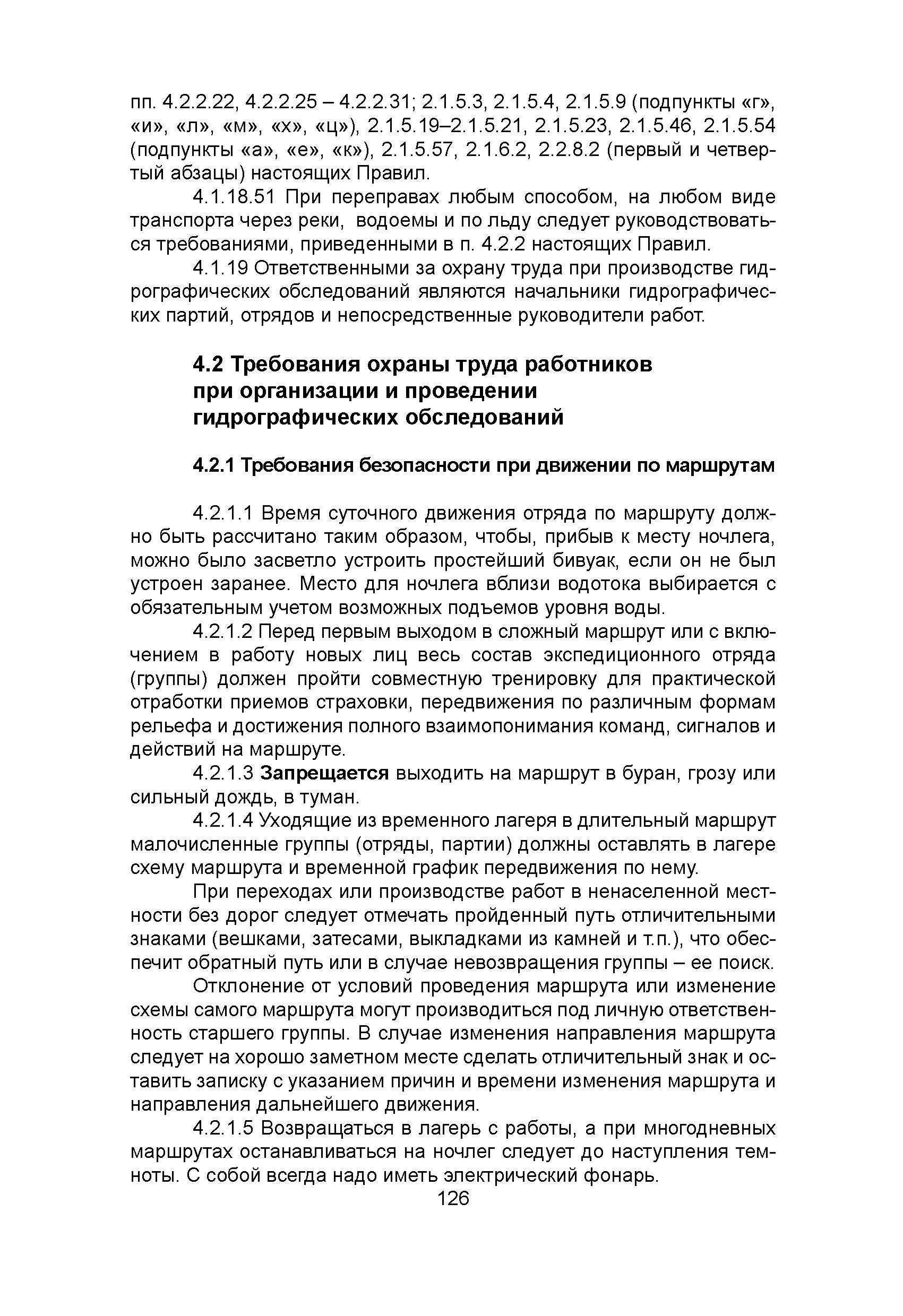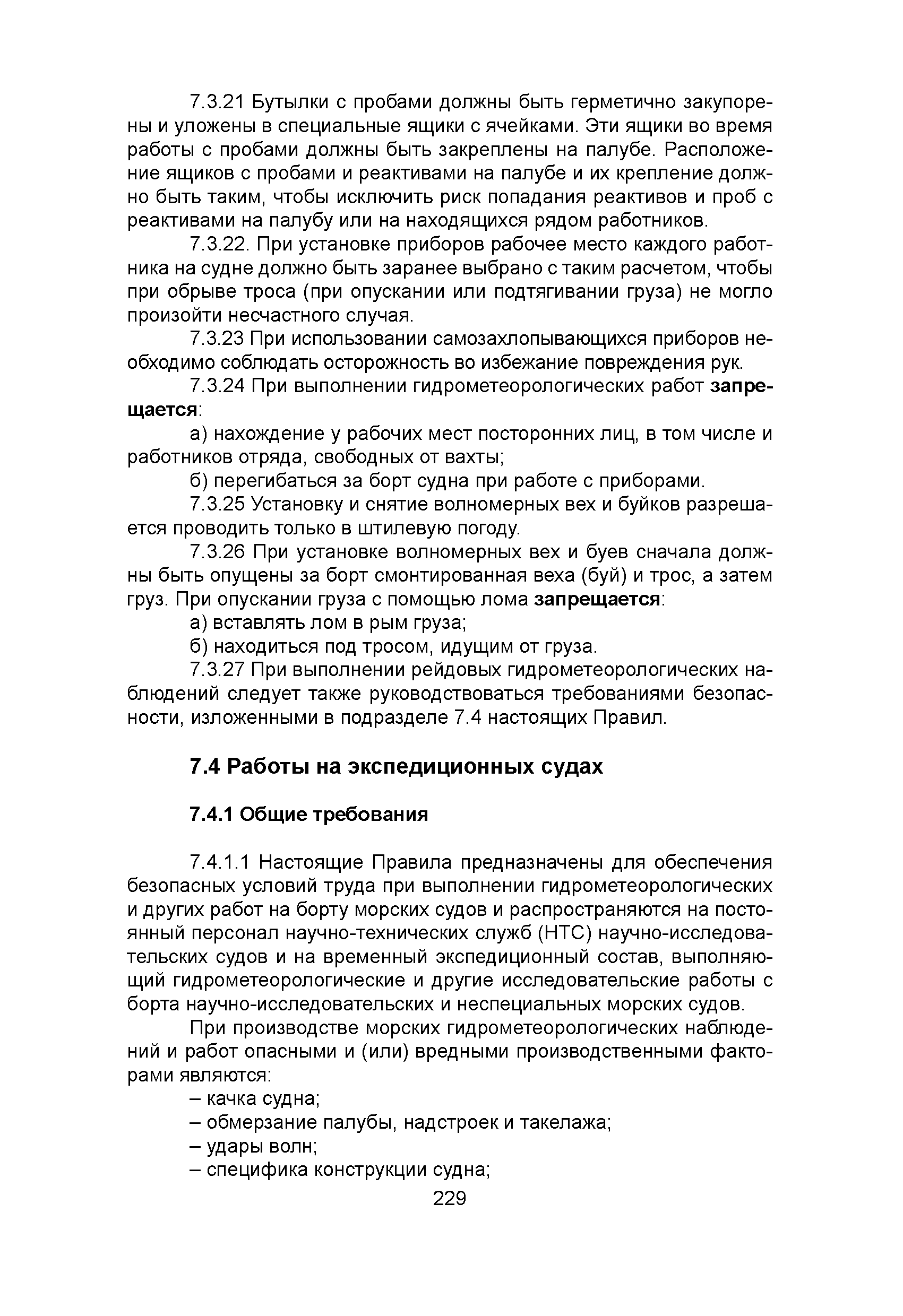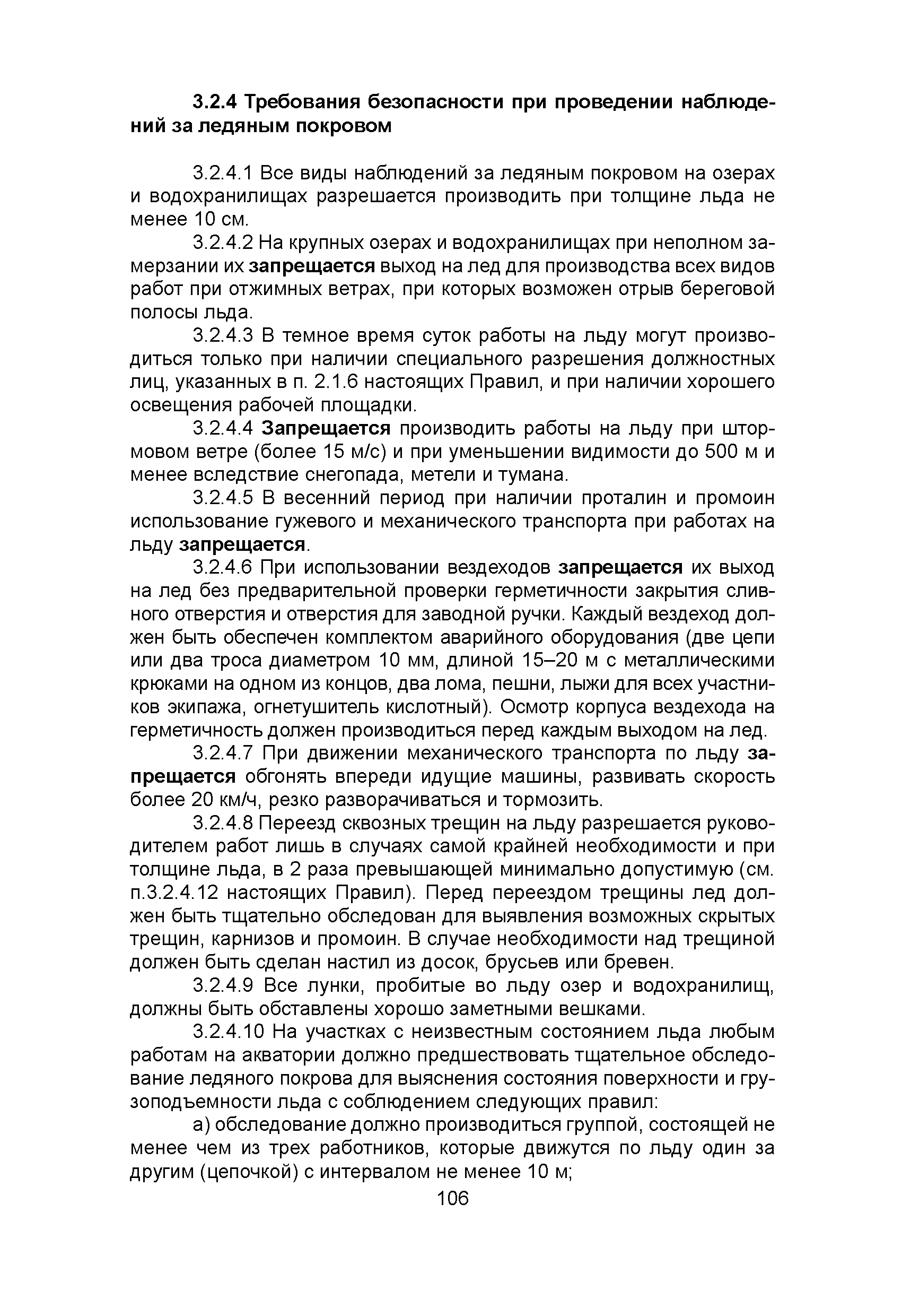 | Оглавление: | Введение 1 Общие положения 2 Гидрологические наблюдения и работы на реках и каналах 2.1 Общие требования 2.2 Требования охраны труда работников при организации и проведении гидрологических наблюдений и работ 2.2.1 Требования безопасности при проведении наблюдений за уровнем воды 2.2.2 Требования безопасности при проведении наблюдений за ледовыми явлениями и толщиной льда 2.2.3 Требования безопасности при проведении уровенных и ледовых наблюдений в случае возникновения заторов и зажоров льда 2.2.4 Требования безопасности при проведении гидрометрических работ по измерению расходов воды и наблюдений за наносами 2.2.5 Требования безопасности при проведении работ на горных и таежных реках, а также в период прохождения весеннего половодья и высоких дождевых паводков 2.2.6 Требования безопасности при организации специализированных гидрологических наблюдений и работ (болотных, воднобалансовых, на наледях) 2.2.7 Требования безопасности при проведении аэрогидрометрических наблюдений и работ 2.2.8 Средства индивидуальной защиты работников 2.2.9 Меры по защите работников при возникновении аварийных ситуаций 2.3 Требования к производственным площадкам, оборудованию, приборам и условиям их эксплуатации 2.3.1 Общие требования 2.3.2 Требования при проведении наблюдений за уровнем воды 2.3.3 Требования при проведении наблюдений за продольным уклоном водной поверхности 2.3.4 Требования при проведении наблюдений за температурой воды 2.3.5 Требования при проведении наблюдений за ледовыми явлениями, толщиной льда, снежным покровом 2.3.6 Требования при проведении измерений расходов воды и взвешенных наносов, при отборе проб донных отложений 3 Гидрометеорологические наблюдения и работы на озерах и водохранилищах 3.1 Общие требования 3.2 Требования охраны труда работников при организации и проведении гидрометеорологических наблюдений и работ 3.2.1 Общие требования 3.2.2 Требования безопасности при проведении гидрометеорологических наблюдений и работ в прибрежной зоне водоемов 3.2.3 Требования безопасности при проведении гидрометеорологических наблюдений и работ на открытой акватории водоемов 3.2.4 Требования безопасности при проведении наблюдений за ледяным покровом 3.2.5 Средства индивидуальной защиты работников 3.2.6 Защита работников при возникновении аварийных ситуаций 3.3 Требования к производственным площадкам 3.3.1 Требования к площадкам для производства гидрометеорологических наблюдений и работ в прибрежной зоне водоемов 3.3.2 Требования к площадкам для гидрометеорологических наблюдений и работ на открытой акватории водоемов 3.3.3 Требования к площадкам для наблюдений за ледяным покровом 3.4 Требования к приборам, оборудованию и условиям их эксплуатации 4 Гидрографические обследования 4.1 Общие требования 4.2 Требования охраны труда работников при организации и проведении гидрографических обследований 4.2.1 Требования безопасности при движении по маршрутам 4.2.2 Требования безопасности при переправах через реки, озера, другие водные преграды и лавины 4.2.3 Требования безопасности при проведении маршрутных снегомерных съемок на равнинной территории 4.2.4 Требования безопасности при применении авиационного транспорта 4.2.5 Средства индивидуальной защиты работников 4.2.6 Защита работников при возникновении аварийных ситуаций 4.3 Требования к пло