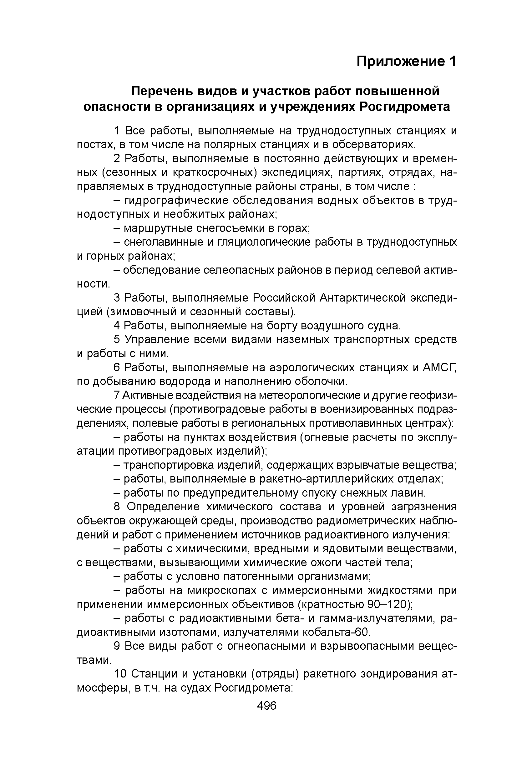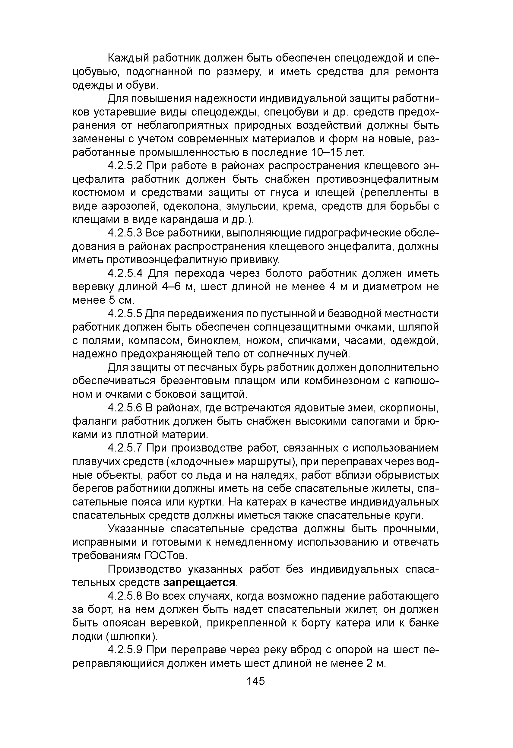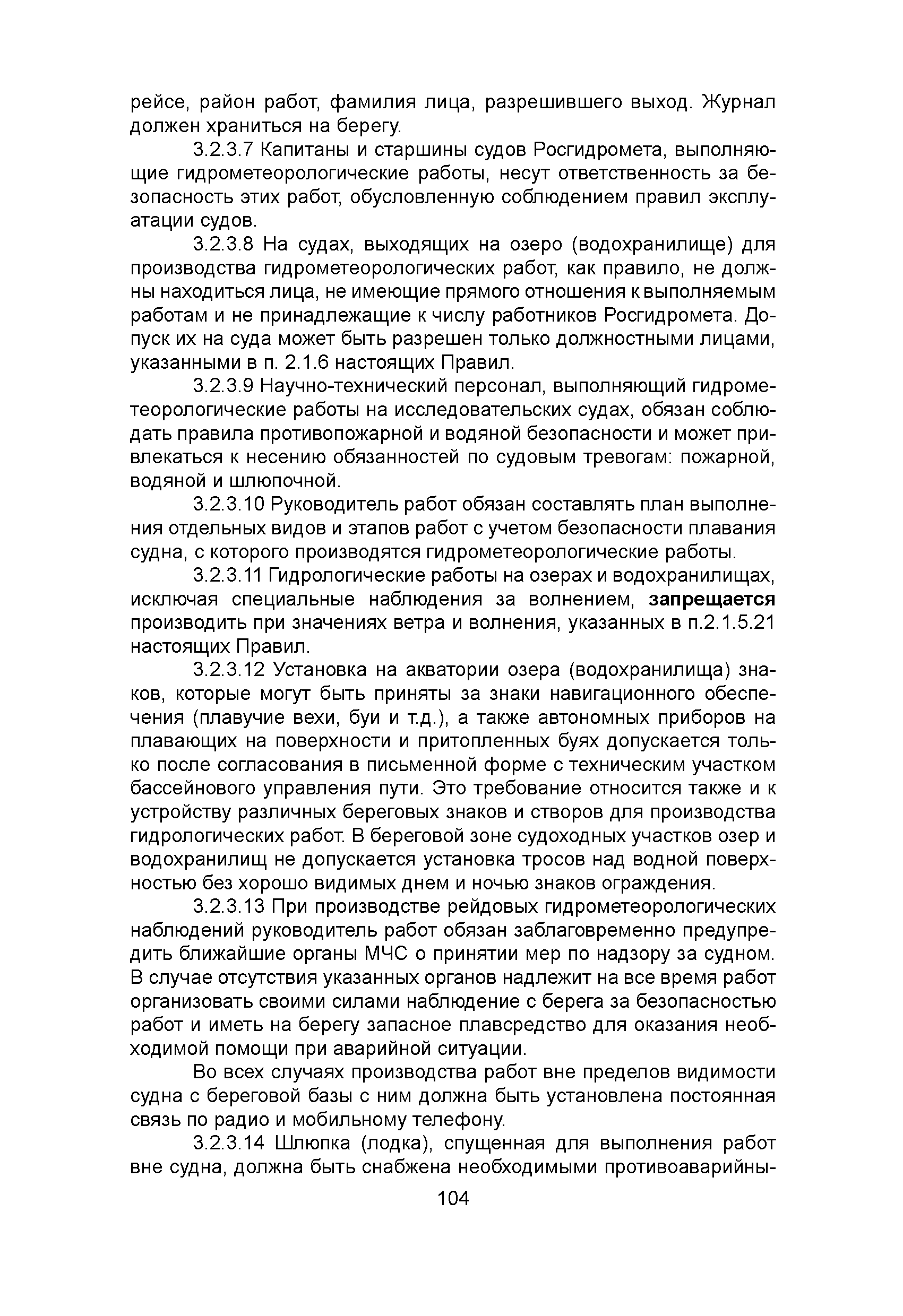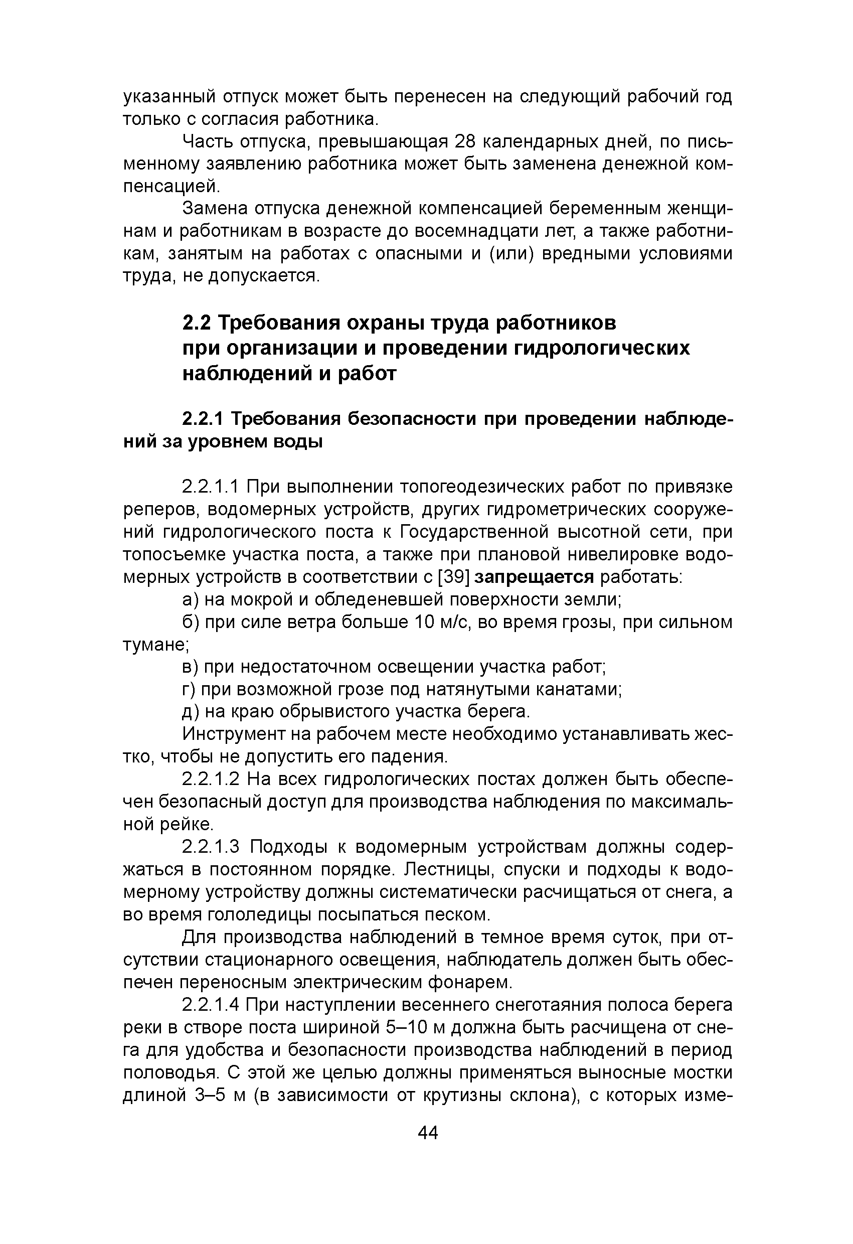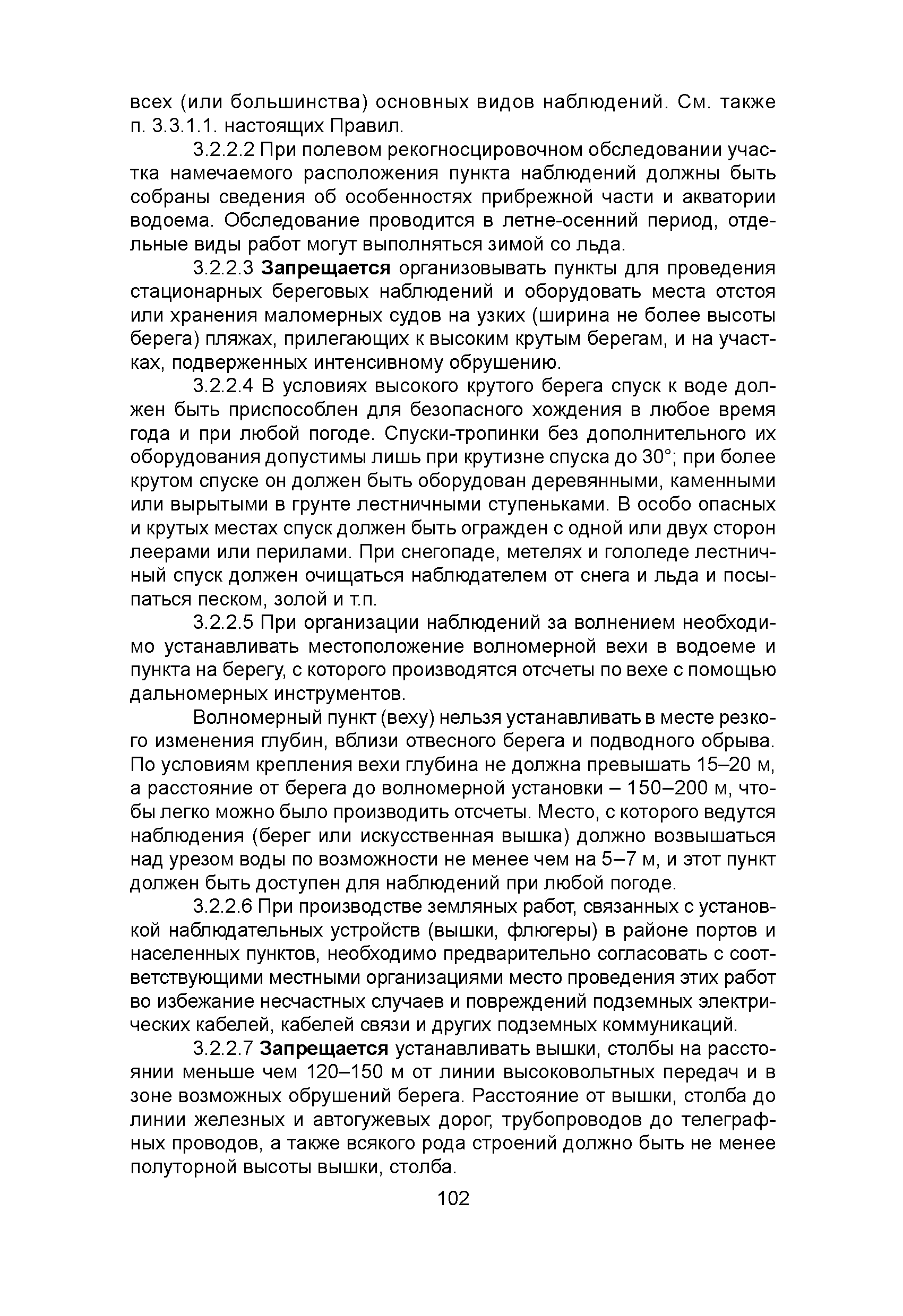 | Оглавление: | Введение 1 Общие положения 2 Гидрологические наблюдения и работы на реках и каналах 2.1 Общие требования 2.2 Требования охраны труда работников при организации и проведении гидрологических наблюдений и работ 2.2.1 Требования безопасности при проведении наблюдений за уровнем воды 2.2.2 Требования безопасности при проведении наблюдений за ледовыми явлениями и толщиной льда 2.2.3 Требования безопасности при проведении уровенных и ледовых наблюдений в случае возникновения заторов и зажоров льда 2.2.4 Требования безопасности при проведении гидрометрических работ по измерению расходов воды и наблюдений за наносами 2.2.5 Требования безопасности при проведении работ на горных и таежных реках, а также в период прохождения весеннего половодья и высоких дождевых паводков 2.2.6 Требования безопасности при организации специализированных гидрологических наблюдений и работ (болотных, воднобалансовых, на наледях) 2.2.7 Требования безопасности при проведении аэрогидрометрических наблюдений и работ 2.2.8 Средства индивидуальной защиты работников 2.2.9 Меры по защите работников при возникновении аварийных ситуаций 2.3 Требования к производственным площадкам, оборудованию, приборам и условиям их эксплуатации 2.3.1 Общие требования 2.3.2 Требования при проведении наблюдений за уровнем воды 2.3.3 Требования при проведении наблюдений за продольным уклоном водной поверхности 2.3.4 Требования при проведении наблюдений за температурой воды 2.3.5 Требования при проведении наблюдений за ледовыми явлениями, толщиной льда, снежным покровом 2.3.6 Требования при проведении измерений расходов воды и взвешенных наносов, при отборе проб донных отложений 3 Гидрометеорологические наблюдения и работы на озерах и водохранилищах 3.1 Общие требования 3.2 Требования охраны труда работников при организации и проведении гидрометеорологических наблюдений и работ 3.2.1 Общие требования 3.2.2 Требования безопасности при проведении гидрометеорологических наблюдений и работ в прибрежной зоне водоемов 3.2.3 Требования безопасности при проведении гидрометеорологических наблюдений и работ на открытой акватории водоемов 3.2.4 Требования безопасности при проведении наблюдений за ледяным покровом 3.2.5 Средства индивидуальной защиты работников 3.2.6 Защита работников при возникновении аварийных ситуаций 3.3 Требования к производственным площадкам 3.3.1 Требования к площадкам для производства гидрометеорологических наблюдений и работ в прибрежной зоне водоемов 3.3.2 Требования к площадкам для гидрометеорологических наблюдений и работ на открытой акватории водоемов 3.3.3 Требования к площадкам для наблюдений за ледяным покровом 3.4 Требования к приборам, оборудованию и условиям их эксплуатации 4 Гидрографические обследования 4.1 Общие требования 4.2 Требования охраны труда работников при организации и проведении гидрографических обследований 4.2.1 Требования безопасности при движении по маршрутам 4.2.2 Требования безопасности при переправах через реки, озера, другие водные преграды и лавины 4.2.3 Требования безопасности при проведении маршрутных снегомерных съемок на равнинной территории 4.2.4 Требования безопасности при применении авиационного транспорта 4.2.5 Средства индивидуальной защиты работников 4.2.6 Защита работников при возникновении аварийных ситуаций 4.3 Требования к пло