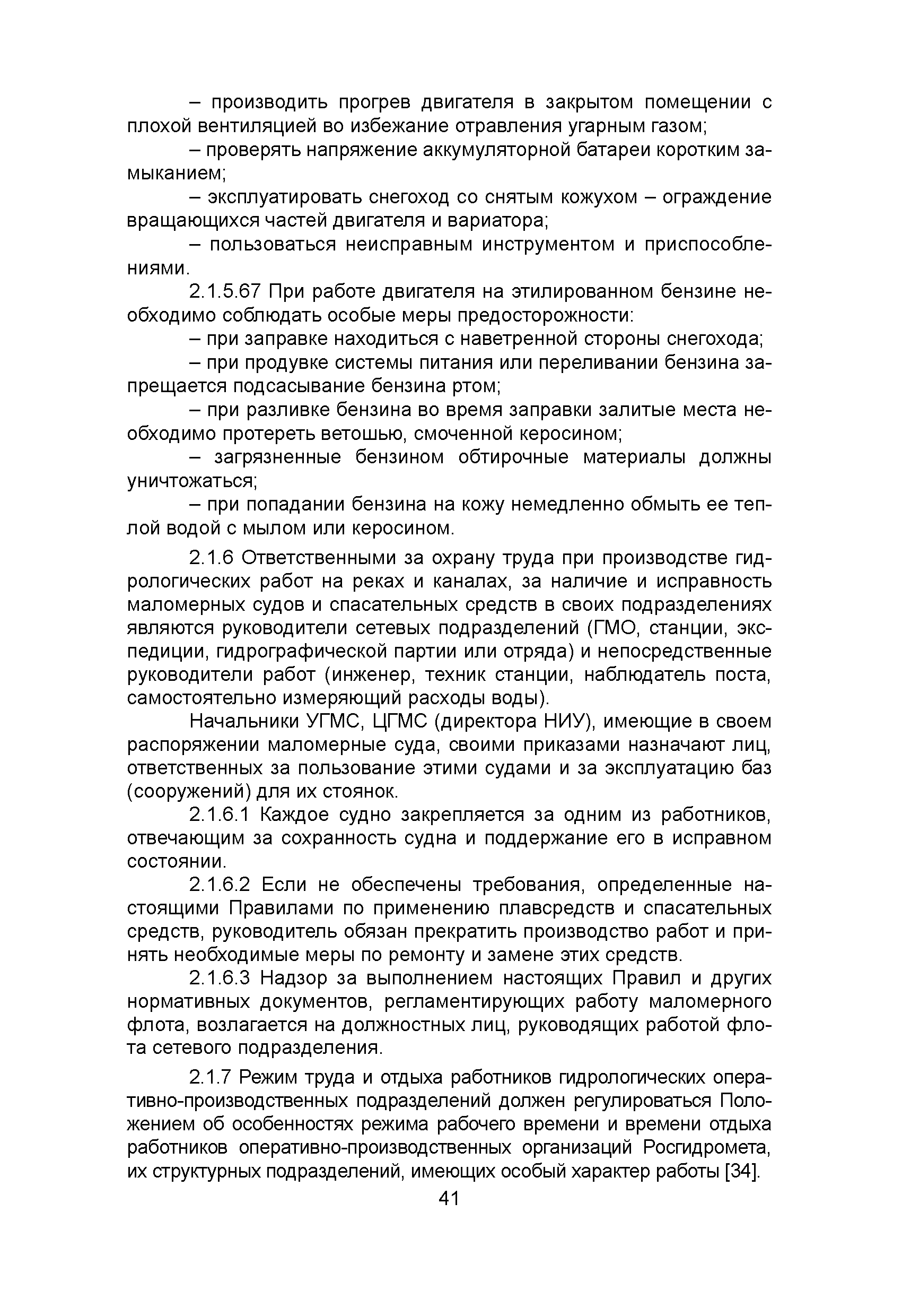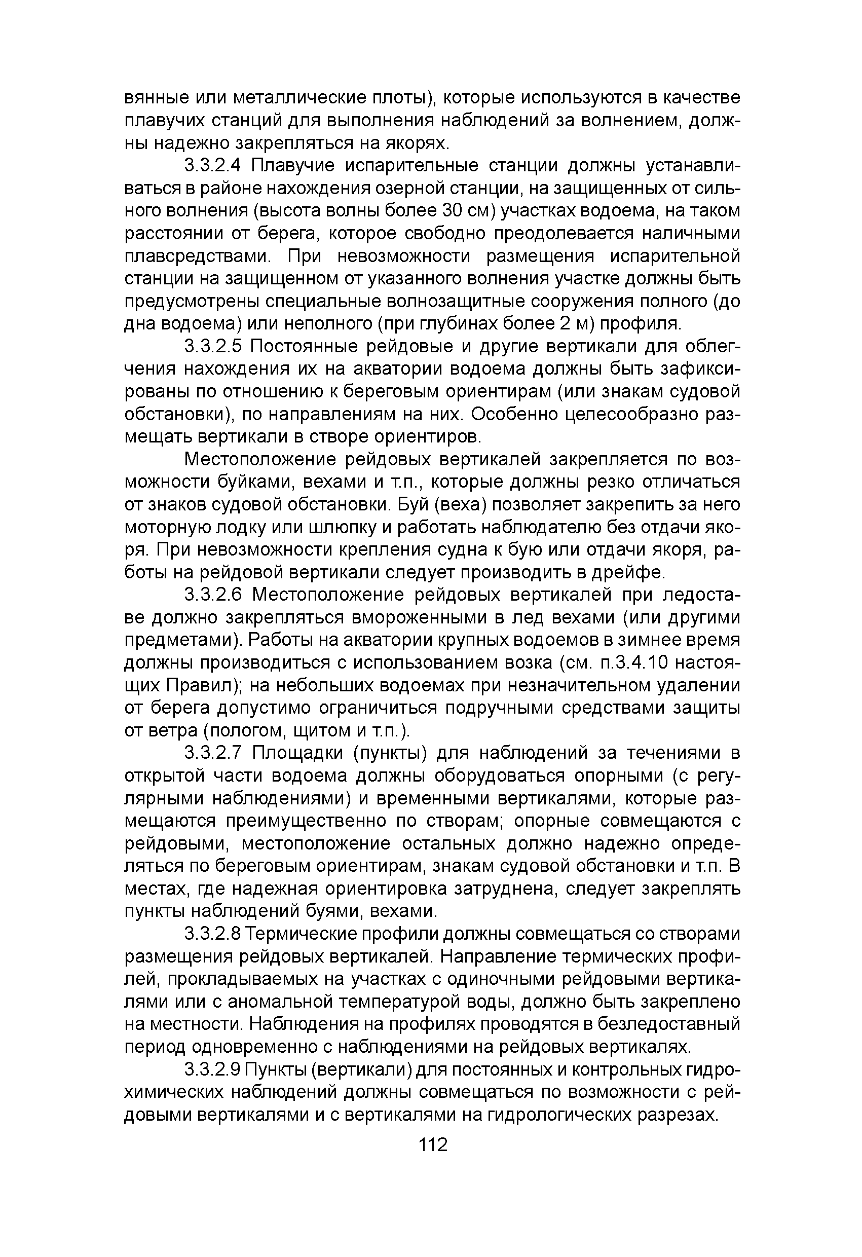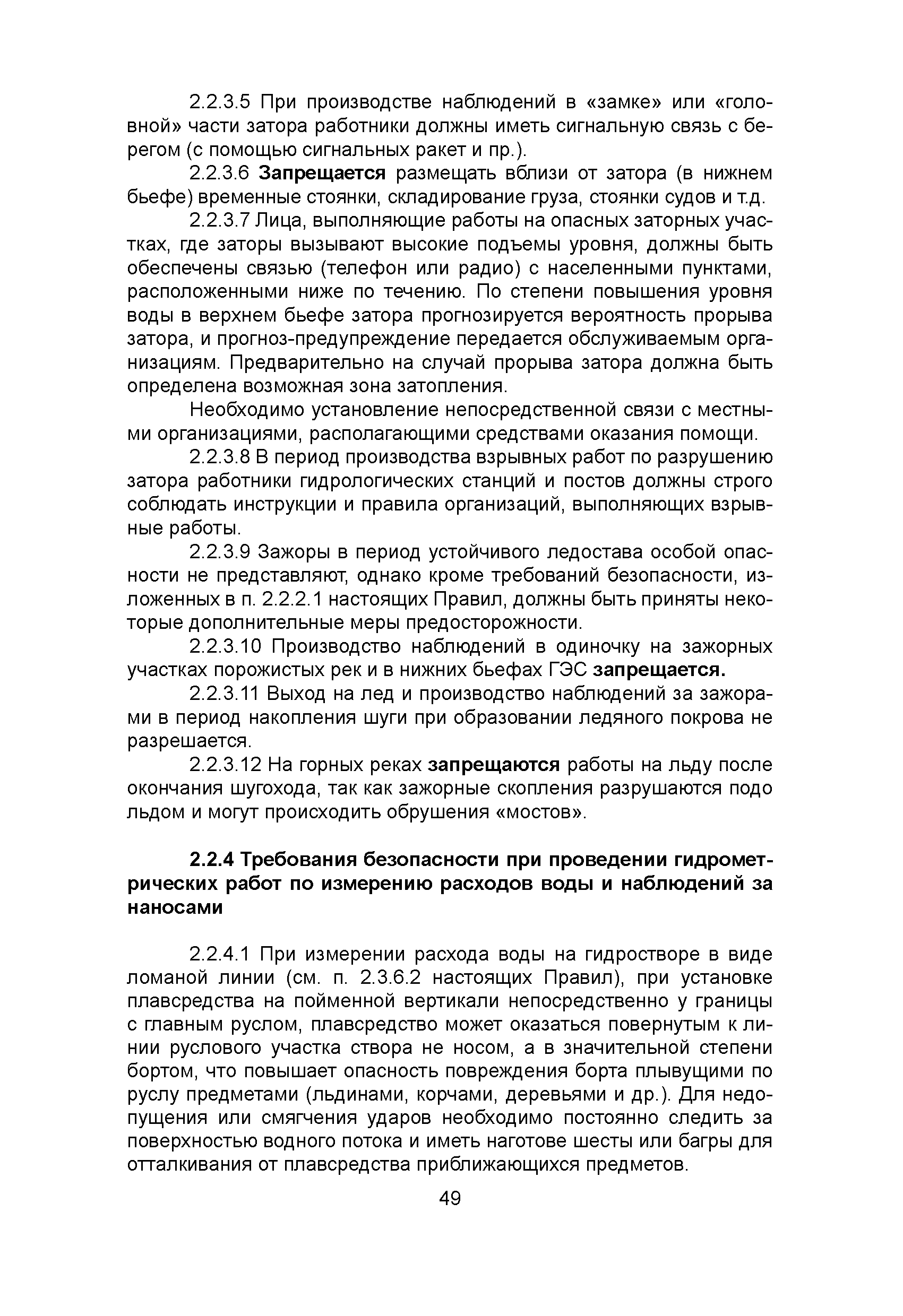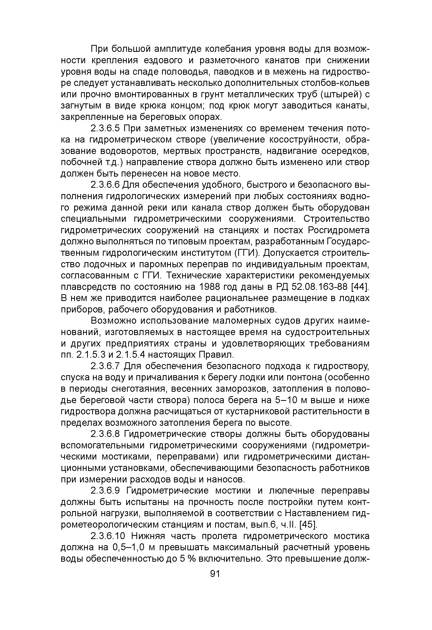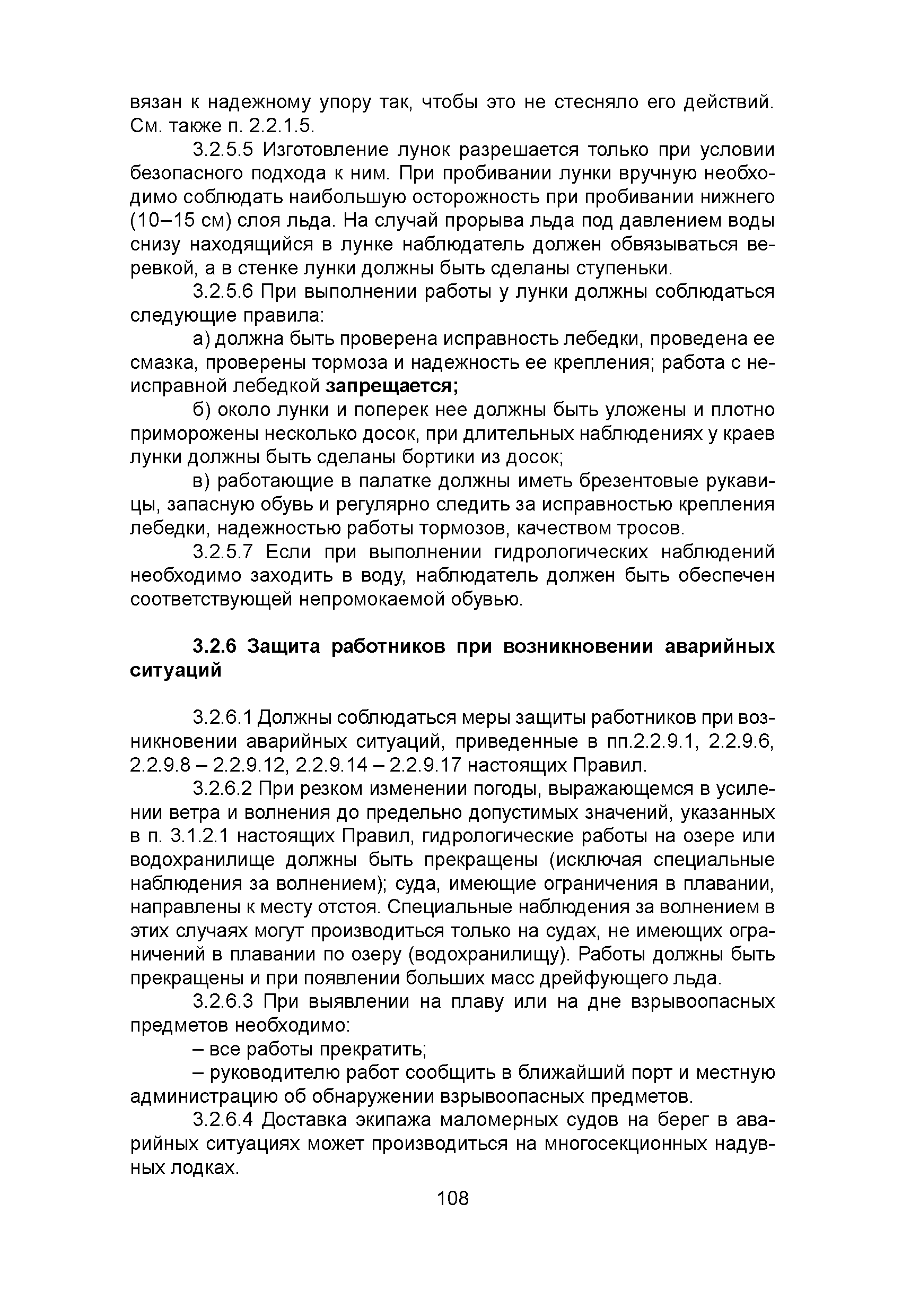| Оглавление: | Введение 1 Общие положения 2 Гидрологические наблюдения и работы на реках и каналах 2.1 Общие требования 2.2 Требования охраны труда работников при организации и проведении гидрологических наблюдений и работ 2.2.1 Требования безопасности при проведении наблюдений за уровнем воды 2.2.2 Требования безопасности при проведении наблюдений за ледовыми явлениями и толщиной льда 2.2.3 Требования безопасности при проведении уровенных и ледовых наблюдений в случае возникновения заторов и зажоров льда 2.2.4 Требования безопасности при проведении гидрометрических работ по измерению расходов воды и наблюдений за наносами 2.2.5 Требования безопасности при проведении работ на горных и таежных реках, а также в период прохождения весеннего половодья и высоких дождевых паводков 2.2.6 Требования безопасности при организации специализированных гидрологических наблюдений и работ (болотных, воднобалансовых, на наледях) 2.2.7 Требования безопасности при проведении аэрогидрометрических наблюдений и работ 2.2.8 Средства индивидуальной защиты работников 2.2.9 Меры по защите работников при возникновении аварийных ситуаций 2.3 Требования к производственным площадкам, оборудованию, приборам и условиям их эксплуатации 2.3.1 Общие требования 2.3.2 Требования при проведении наблюдений за уровнем воды 2.3.3 Требования при проведении наблюдений за продольным уклоном водной поверхности 2.3.4 Требования при проведении наблюдений за температурой воды 2.3.5 Требования при проведении наблюдений за ледовыми явлениями, толщиной льда, снежным покровом 2.3.6 Требования при проведении измерений расходов воды и взвешенных наносов, при отборе проб донных отложений 3 Гидрометеорологические наблюдения и работы на озерах и водохранилищах 3.1 Общие требования 3.2 Требования охраны труда работников при организации и проведении гидрометеорологических наблюдений и работ 3.2.1 Общие требования 3.2.2 Требования безопасности при проведении гидрометеорологических наблюдений и работ в прибрежной зоне водоемов 3.2.3 Требования безопасности при проведении гидрометеорологических наблюдений и работ на открытой акватории водоемов 3.2.4 Требования безопасности при проведении наблюдений за ледяным покровом 3.2.5 Средства индивидуальной защиты работников 3.2.6 Защита работников при возникновении аварийных ситуаций 3.3 Требования к производственным площадкам 3.3.1 Требования к площадкам для производства гидрометеорологических наблюдений и работ в прибрежной зоне водоемов 3.3.2 Требования к площадкам для гидрометеорологических наблюдений и работ на открытой акватории водоемов 3.3.3 Требования к площадкам для наблюдений за ледяным покровом 3.4 Требования к приборам, оборудованию и условиям их эксплуатации 4 Гидрографические обследования 4.1 Общие требования 4.2 Требования охраны труда работников при организации и проведении гидрографических обследований 4.2.1 Требования безопасности при движении по маршрутам 4.2.2 Требования безопасности при переправах через реки, озера, другие водные преграды и лавины 4.2.3 Требования безопасности при проведении маршрутных снегомерных съемок на равнинной территории 4.2.4 Требования безопасности при применении авиационного транспорта 4.2.5 Средства индивидуальной защиты работников 4.2.6 Защита работников при возникновении аварийных ситуаций 4.3 Требования к пло