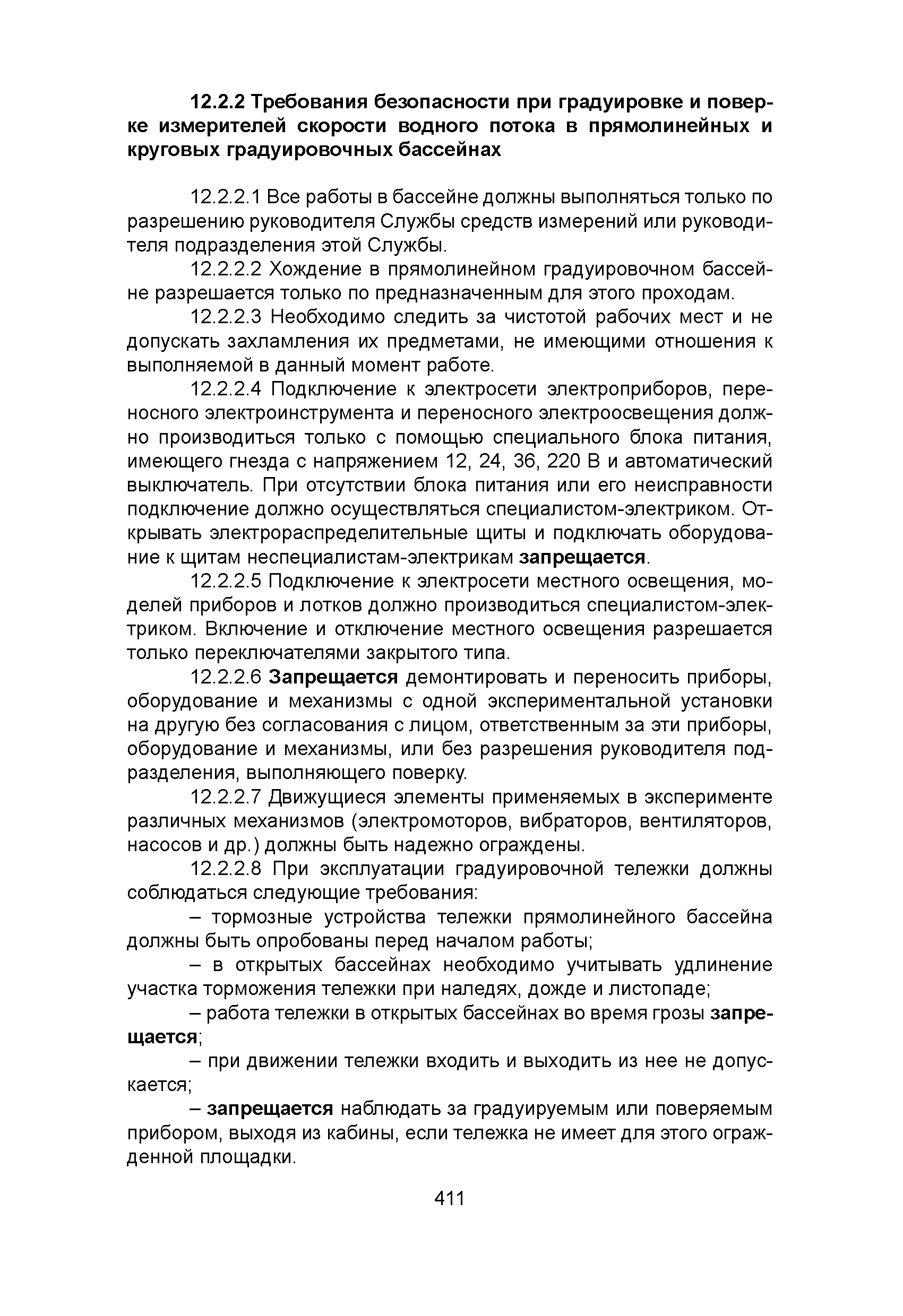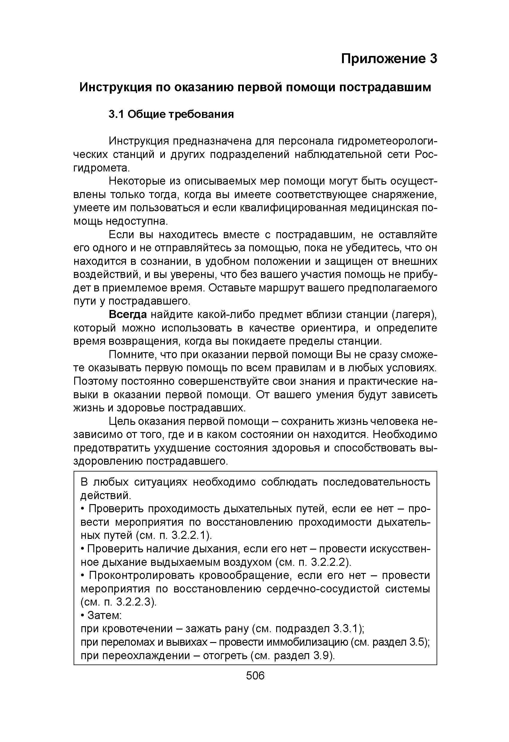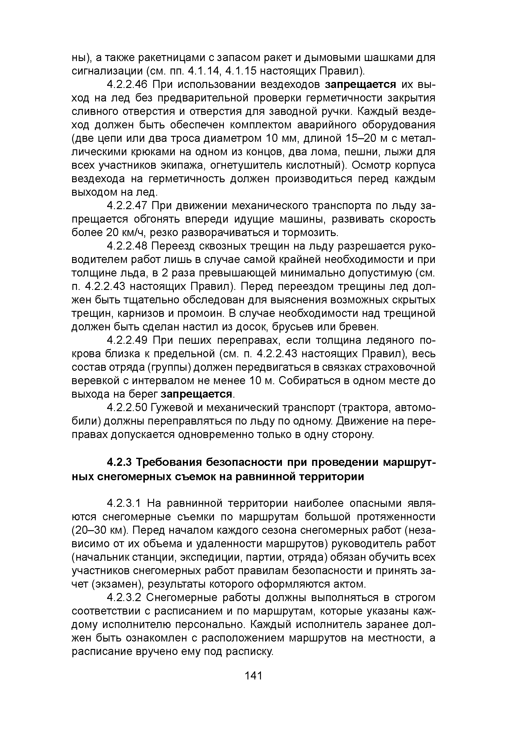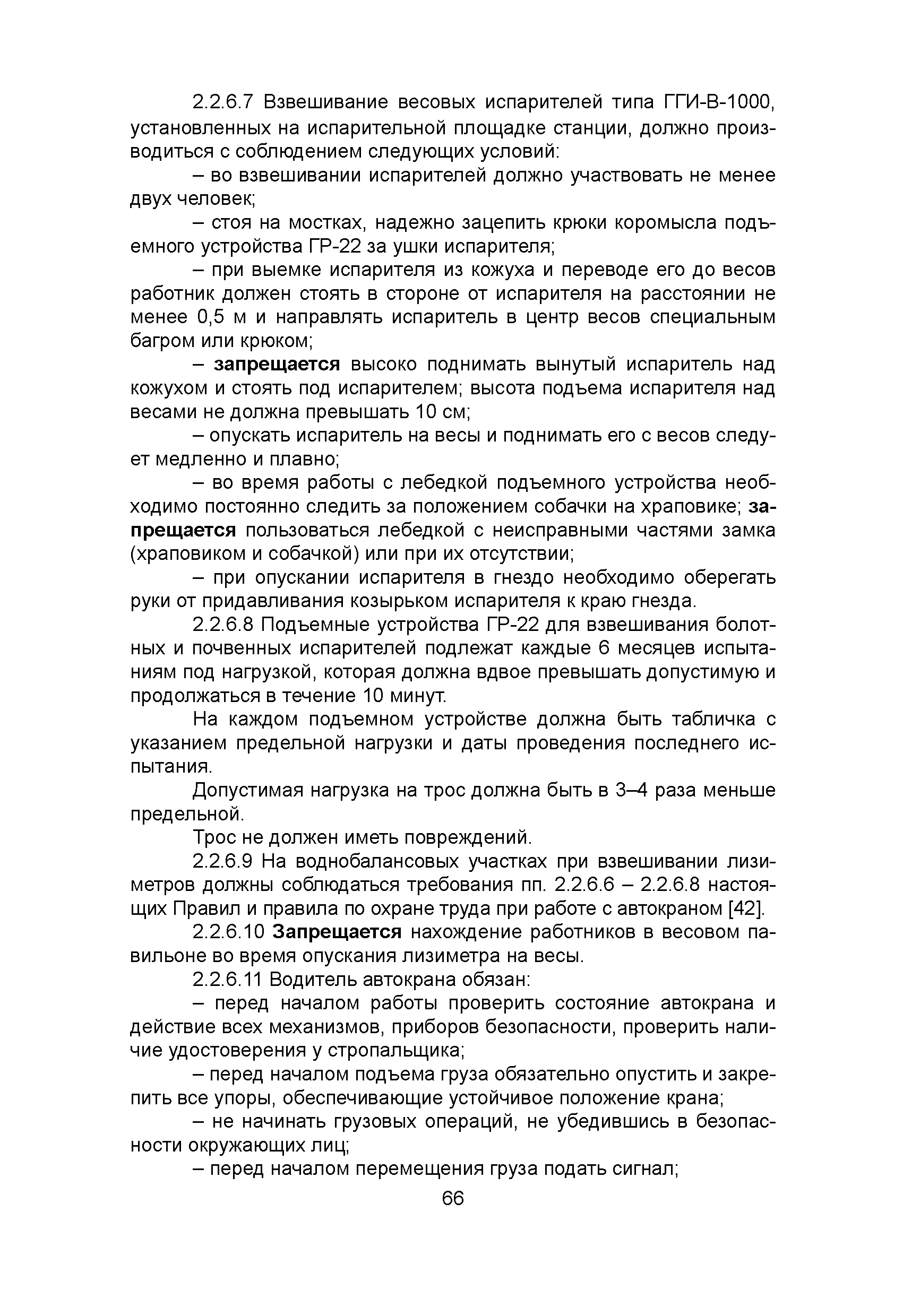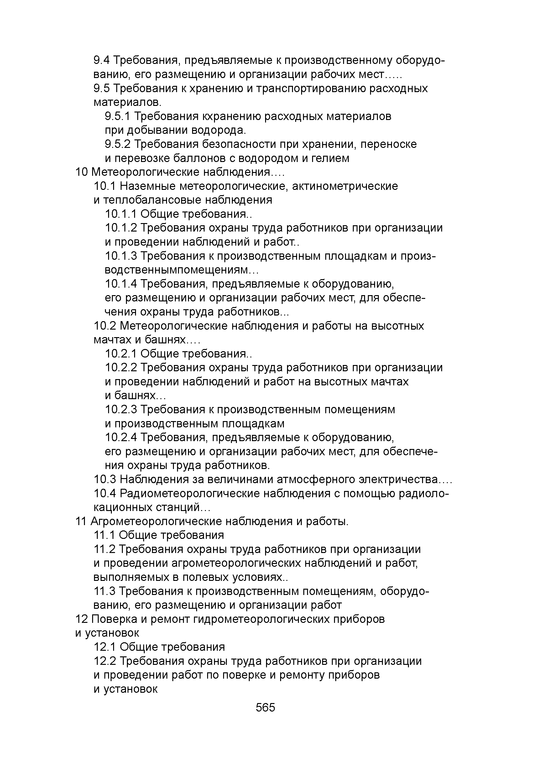 | Оглавление: | Введение 1 Общие положения 2 Гидрологические наблюдения и работы на реках и каналах 2.1 Общие требования 2.2 Требования охраны труда работников при организации и проведении гидрологических наблюдений и работ 2.2.1 Требования безопасности при проведении наблюдений за уровнем воды 2.2.2 Требования безопасности при проведении наблюдений за ледовыми явлениями и толщиной льда 2.2.3 Требования безопасности при проведении уровенных и ледовых наблюдений в случае возникновения заторов и зажоров льда 2.2.4 Требования безопасности при проведении гидрометрических работ по измерению расходов воды и наблюдений за наносами 2.2.5 Требования безопасности при проведении работ на горных и таежных реках, а также в период прохождения весеннего половодья и высоких дождевых паводков 2.2.6 Требования безопасности при организации специализированных гидрологических наблюдений и работ (болотных, воднобалансовых, на наледях) 2.2.7 Требования безопасности при проведении аэрогидрометрических наблюдений и работ 2.2.8 Средства индивидуальной защиты работников 2.2.9 Меры по защите работников при возникновении аварийных ситуаций 2.3 Требования к производственным площадкам, оборудованию, приборам и условиям их эксплуатации 2.3.1 Общие требования 2.3.2 Требования при проведении наблюдений за уровнем воды 2.3.3 Требования при проведении наблюдений за продольным уклоном водной поверхности 2.3.4 Требования при проведении наблюдений за температурой воды 2.3.5 Требования при проведении наблюдений за ледовыми явлениями, толщиной льда, снежным покровом 2.3.6 Требования при проведении измерений расходов воды и взвешенных наносов, при отборе проб донных отложений 3 Гидрометеорологические наблюдения и работы на озерах и водохранилищах 3.1 Общие требования 3.2 Требования охраны труда работников при организации и проведении гидрометеорологических наблюдений и работ 3.2.1 Общие требования 3.2.2 Требования безопасности при проведении гидрометеорологических наблюдений и работ в прибрежной зоне водоемов 3.2.3 Требования безопасности при проведении гидрометеорологических наблюдений и работ на открытой акватории водоемов 3.2.4 Требования безопасности при проведении наблюдений за ледяным покровом 3.2.5 Средства индивидуальной защиты работников 3.2.6 Защита работников при возникновении аварийных ситуаций 3.3 Требования к производственным площадкам 3.3.1 Требования к площадкам для производства гидрометеорологических наблюдений и работ в прибрежной зоне водоемов 3.3.2 Требования к площадкам для гидрометеорологических наблюдений и работ на открытой акватории водоемов 3.3.3 Требования к площадкам для наблюдений за ледяным покровом 3.4 Требования к приборам, оборудованию и условиям их эксплуатации 4 Гидрографические обследования 4.1 Общие требования 4.2 Требования охраны труда работников при организации и проведении гидрографических обследований 4.2.1 Требования безопасности при движении по маршрутам 4.2.2 Требования безопасности при переправах через реки, озера, другие водные преграды и лавины 4.2.3 Требования безопасности при проведении маршрутных снегомерных съемок на равнинной территории 4.2.4 Требования безопасности при применении авиационного транспорта 4.2.5 Средства индивидуальной защиты работников 4.2.6 Защита работников при возникновении аварийных ситуаций 4.3 Требования к пло