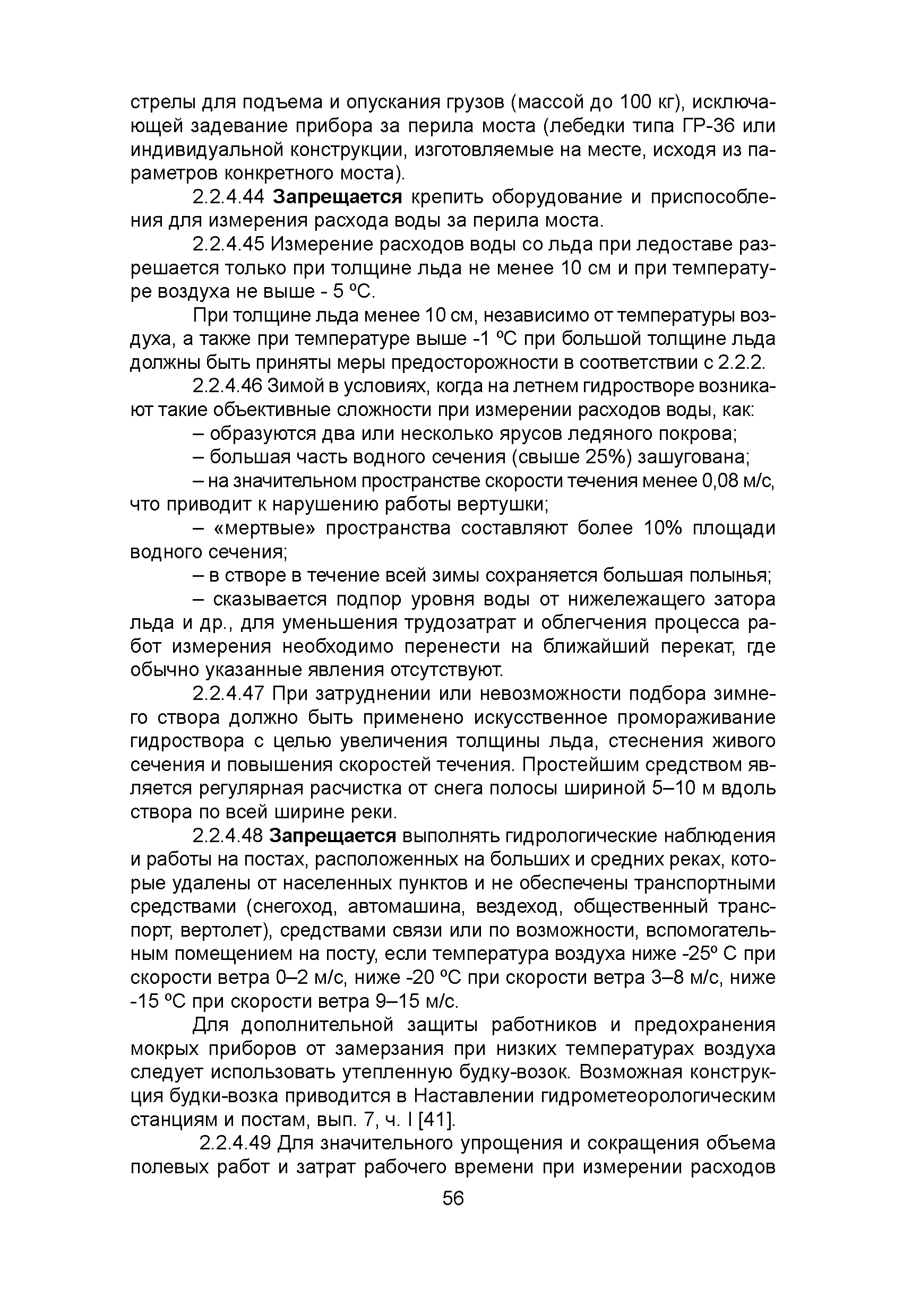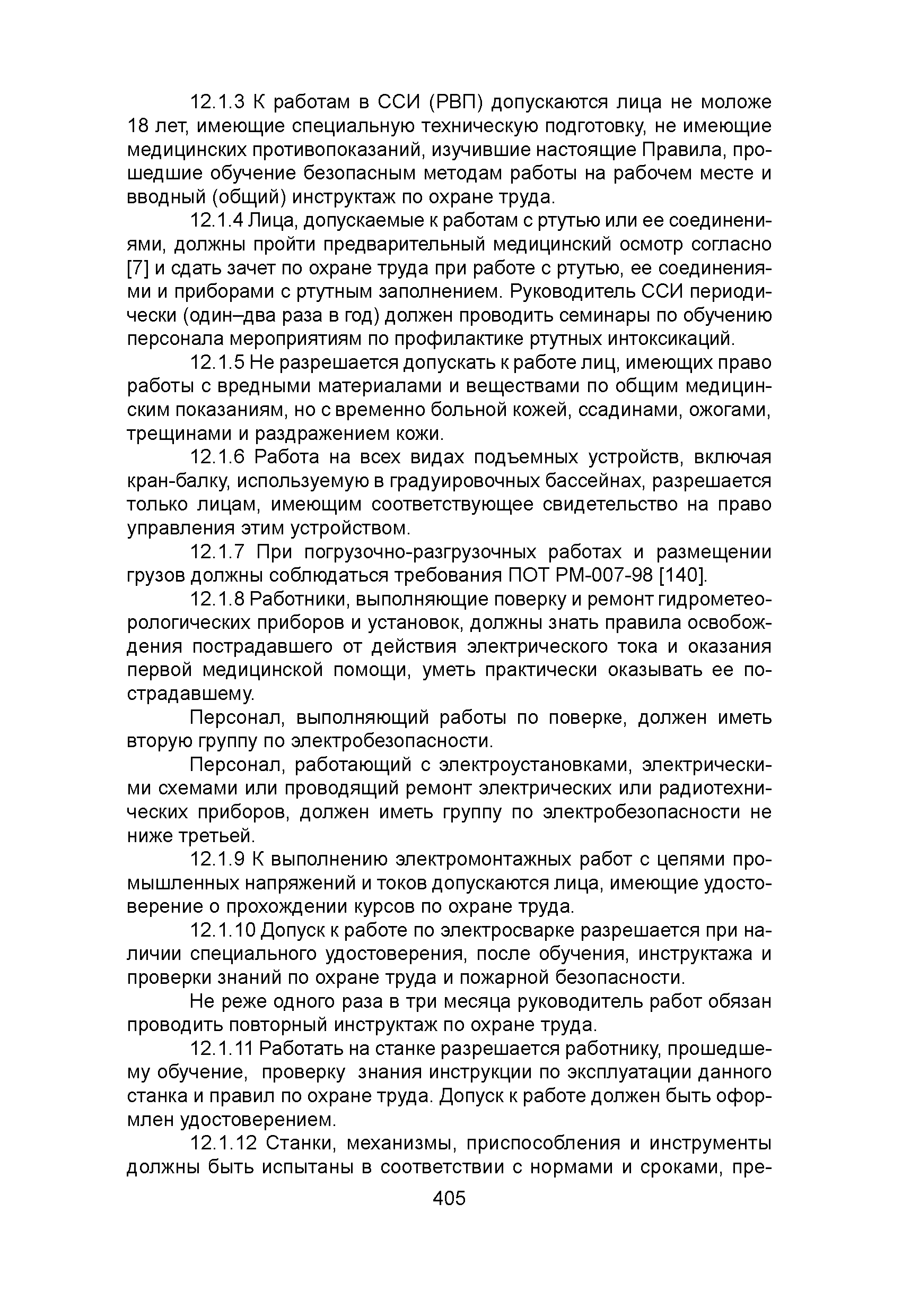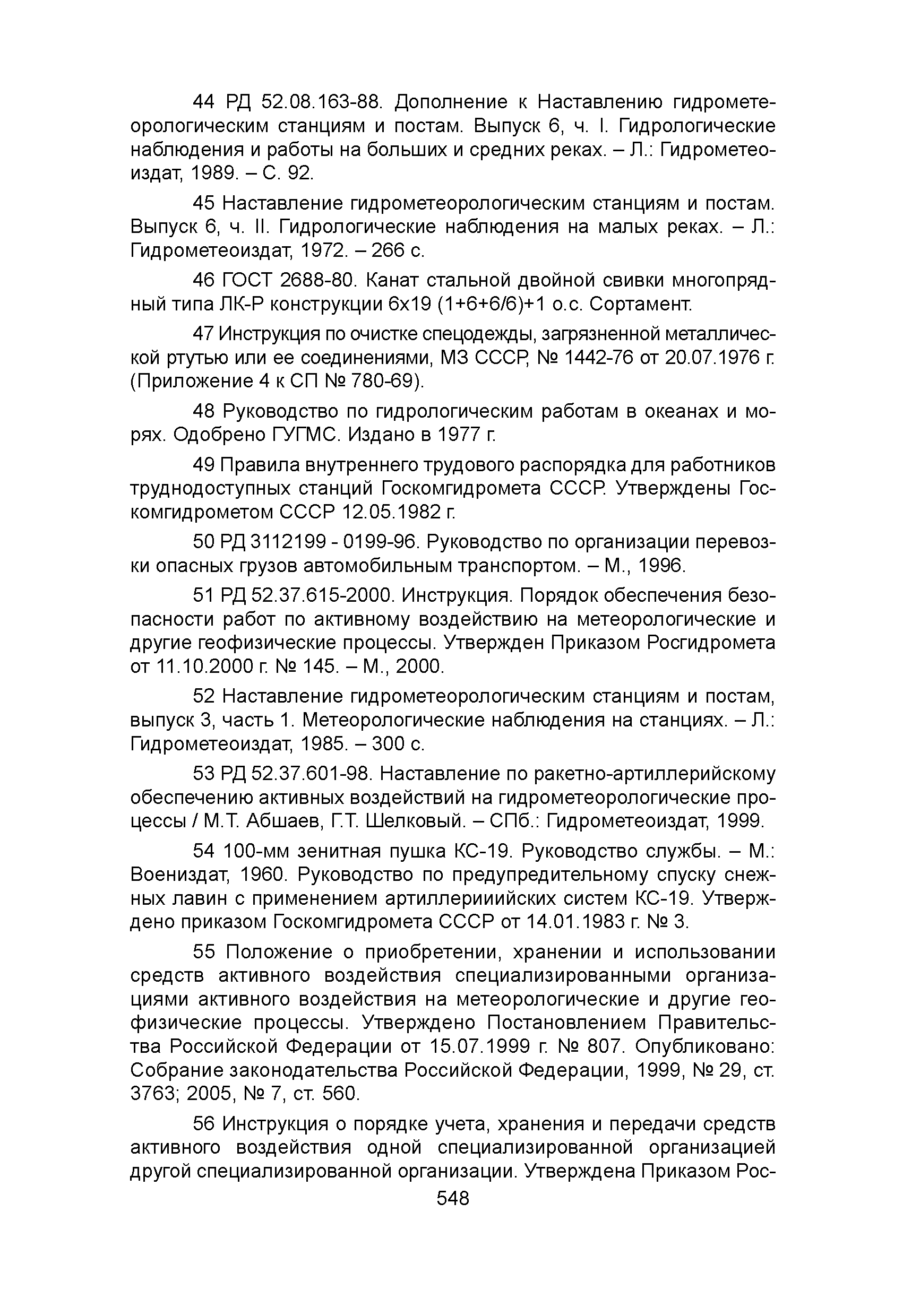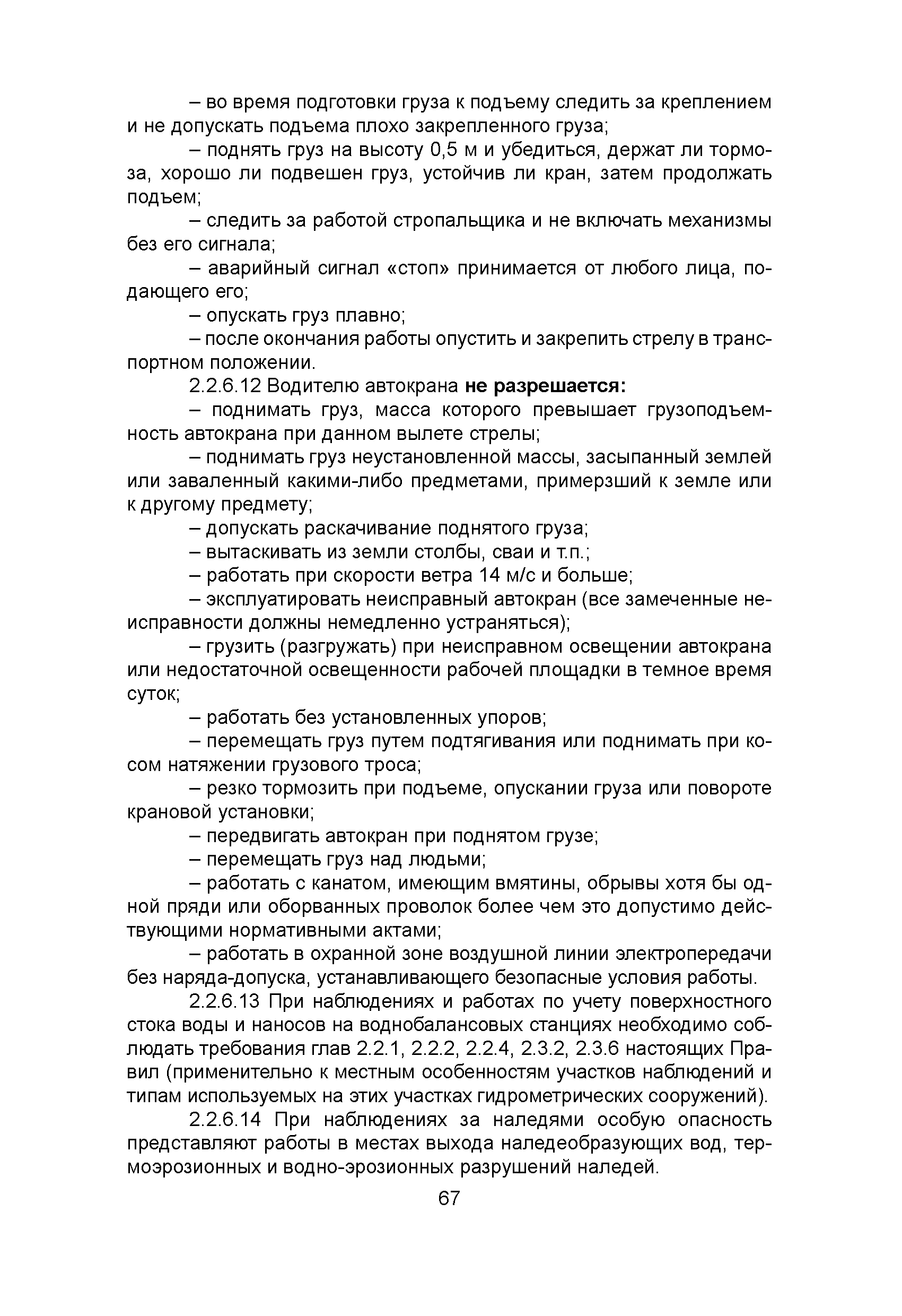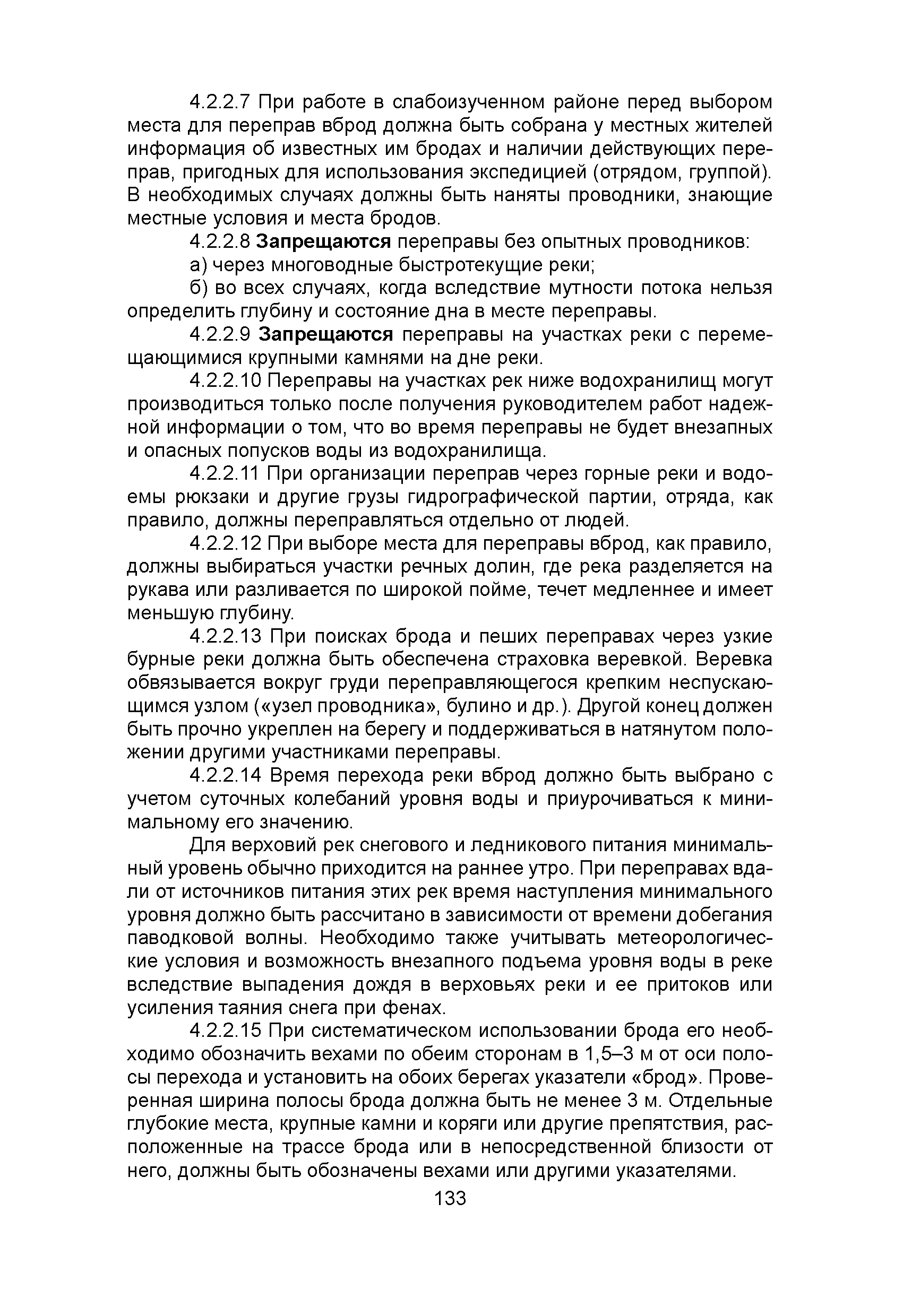 | Оглавление: | Введение 1 Общие положения 2 Гидрологические наблюдения и работы на реках и каналах 2.1 Общие требования 2.2 Требования охраны труда работников при организации и проведении гидрологических наблюдений и работ 2.2.1 Требования безопасности при проведении наблюдений за уровнем воды 2.2.2 Требования безопасности при проведении наблюдений за ледовыми явлениями и толщиной льда 2.2.3 Требования безопасности при проведении уровенных и ледовых наблюдений в случае возникновения заторов и зажоров льда 2.2.4 Требования безопасности при проведении гидрометрических работ по измерению расходов воды и наблюдений за наносами 2.2.5 Требования безопасности при проведении работ на горных и таежных реках, а также в период прохождения весеннего половодья и высоких дождевых паводков 2.2.6 Требования безопасности при организации специализированных гидрологических наблюдений и работ (болотных, воднобалансовых, на наледях) 2.2.7 Требования безопасности при проведении аэрогидрометрических наблюдений и работ 2.2.8 Средства индивидуальной защиты работников 2.2.9 Меры по защите работников при возникновении аварийных ситуаций 2.3 Требования к производственным площадкам, оборудованию, приборам и условиям их эксплуатации 2.3.1 Общие требования 2.3.2 Требования при проведении наблюдений за уровнем воды 2.3.3 Требования при проведении наблюдений за продольным уклоном водной поверхности 2.3.4 Требования при проведении наблюдений за температурой воды 2.3.5 Требования при проведении наблюдений за ледовыми явлениями, толщиной льда, снежным покровом 2.3.6 Требования при проведении измерений расходов воды и взвешенных наносов, при отборе проб донных отложений 3 Гидрометеорологические наблюдения и работы на озерах и водохранилищах 3.1 Общие требования 3.2 Требования охраны труда работников при организации и проведении гидрометеорологических наблюдений и работ 3.2.1 Общие требования 3.2.2 Требования безопасности при проведении гидрометеорологических наблюдений и работ в прибрежной зоне водоемов 3.2.3 Требования безопасности при проведении гидрометеорологических наблюдений и работ на открытой акватории водоемов 3.2.4 Требования безопасности при проведении наблюдений за ледяным покровом 3.2.5 Средства индивидуальной защиты работников 3.2.6 Защита работников при возникновении аварийных ситуаций 3.3 Требования к производственным площадкам 3.3.1 Требования к площадкам для производства гидрометеорологических наблюдений и работ в прибрежной зоне водоемов 3.3.2 Требования к площадкам для гидрометеорологических наблюдений и работ на открытой акватории водоемов 3.3.3 Требования к площадкам для наблюдений за ледяным покровом 3.4 Требования к приборам, оборудованию и условиям их эксплуатации 4 Гидрографические обследования 4.1 Общие требования 4.2 Требования охраны труда работников при организации и проведении гидрографических обследований 4.2.1 Требования безопасности при движении по маршрутам 4.2.2 Требования безопасности при переправах через реки, озера, другие водные преграды и лавины 4.2.3 Требования безопасности при проведении маршрутных снегомерных съемок на равнинной территории 4.2.4 Требования безопасности при применении авиационного транспорта 4.2.5 Средства индивидуальной защиты работников 4.2.6 Защита работников при возникновении аварийных ситуаций 4.3 Требования к пло
