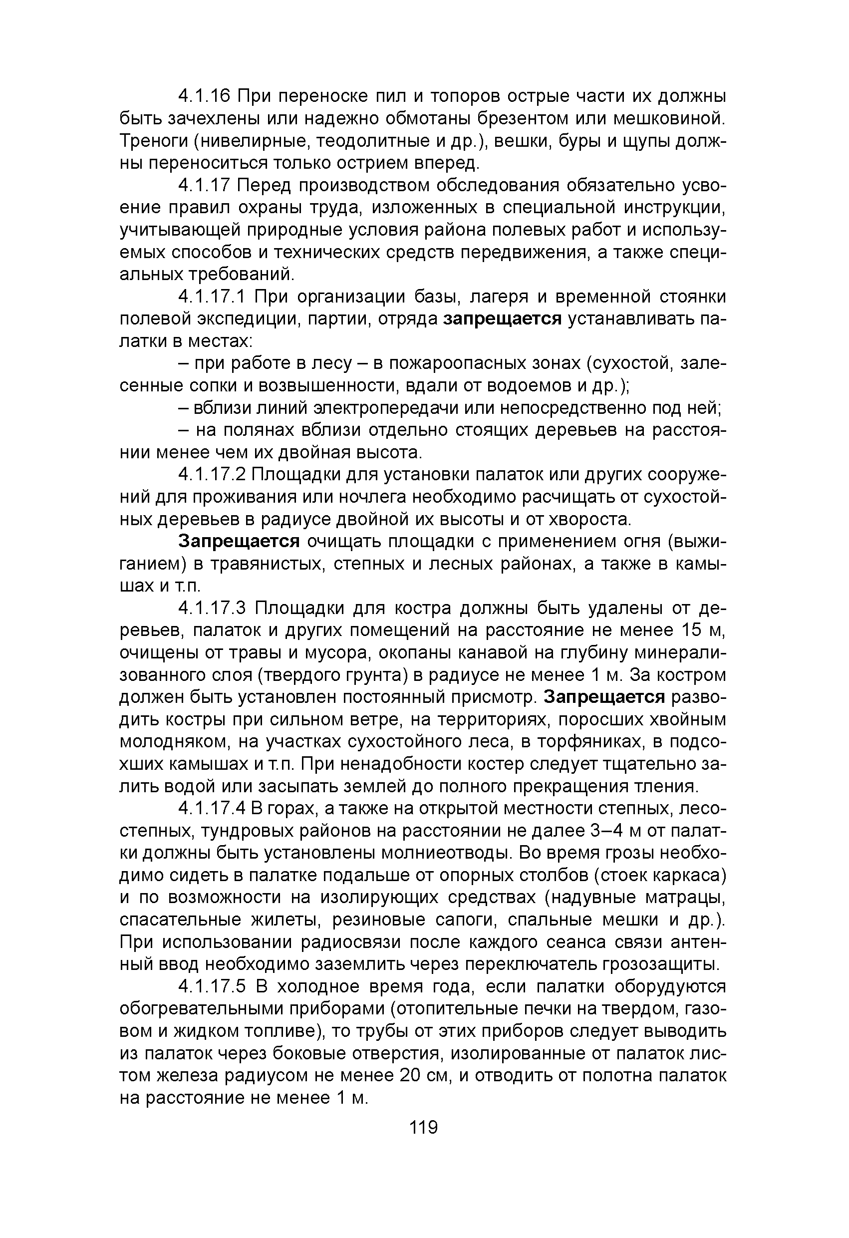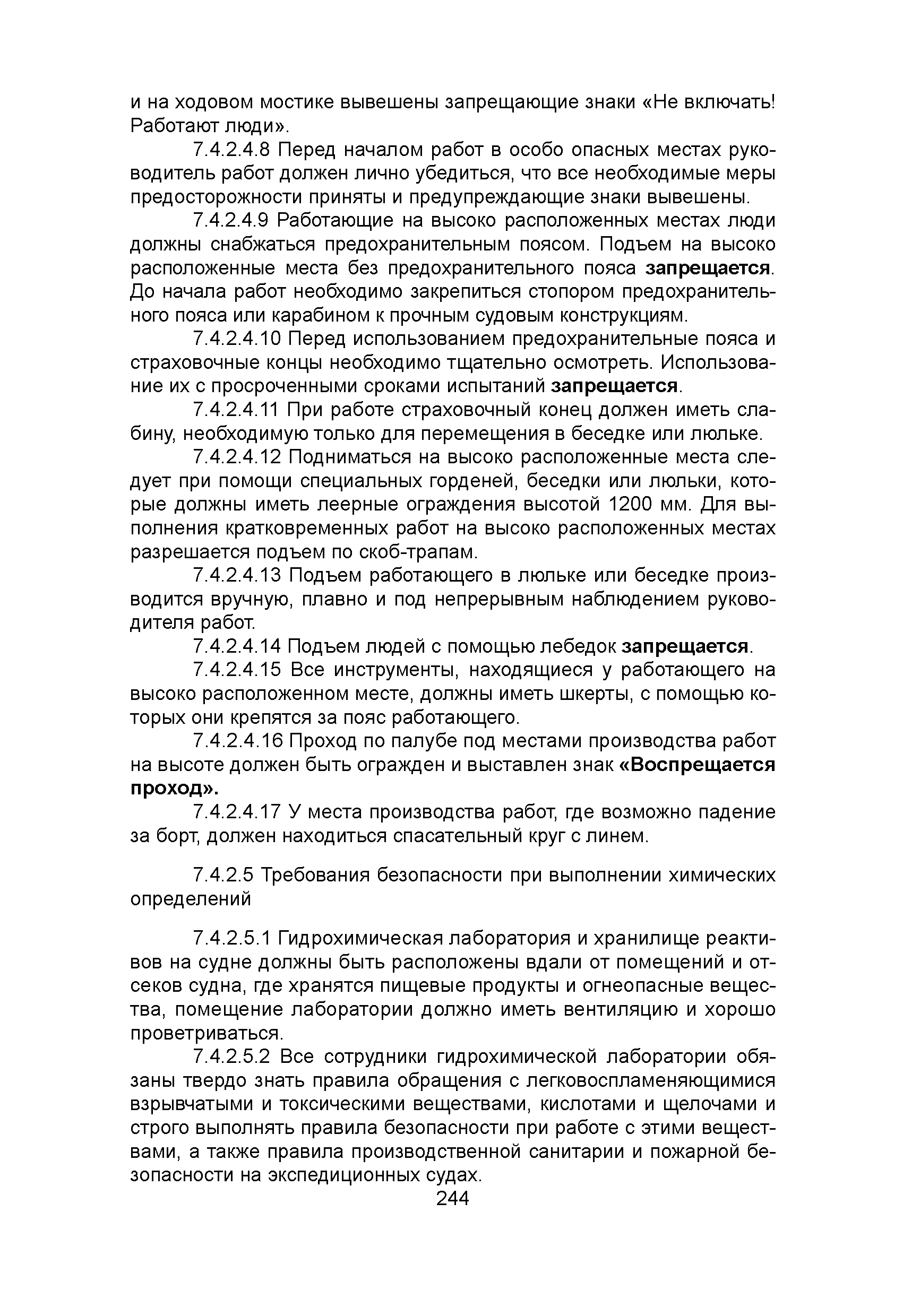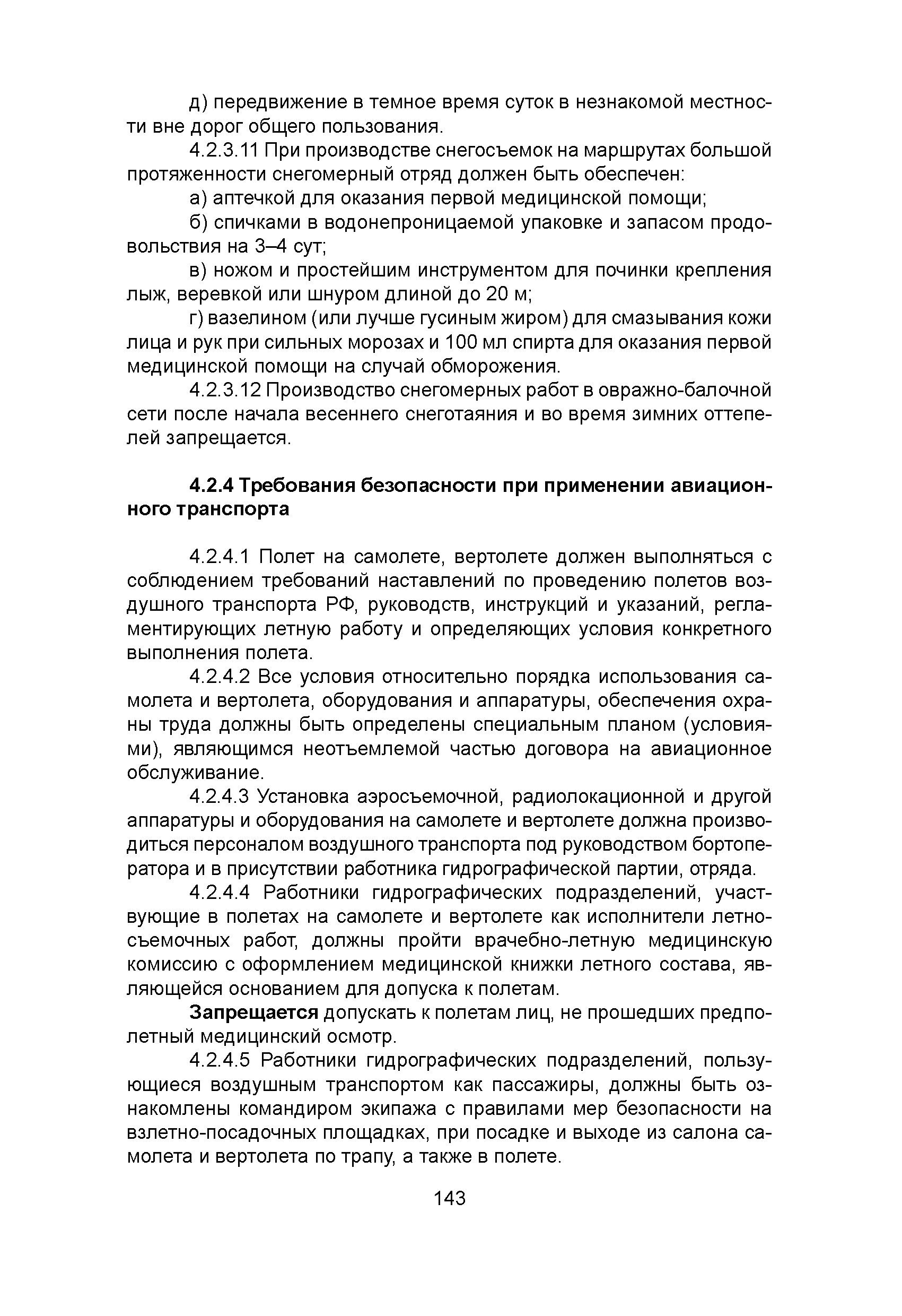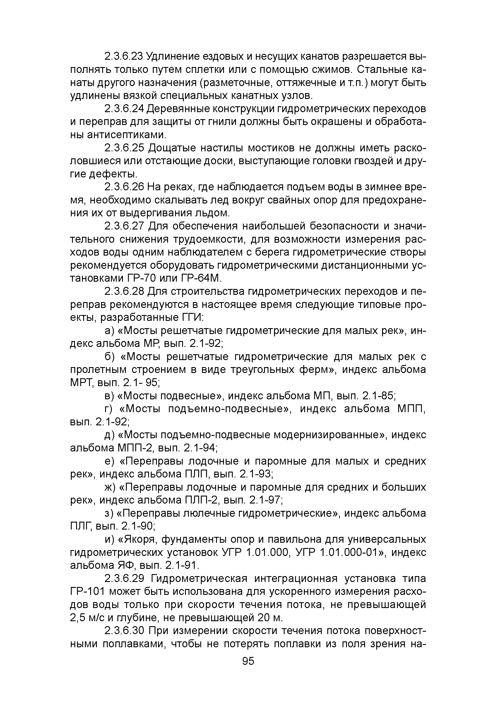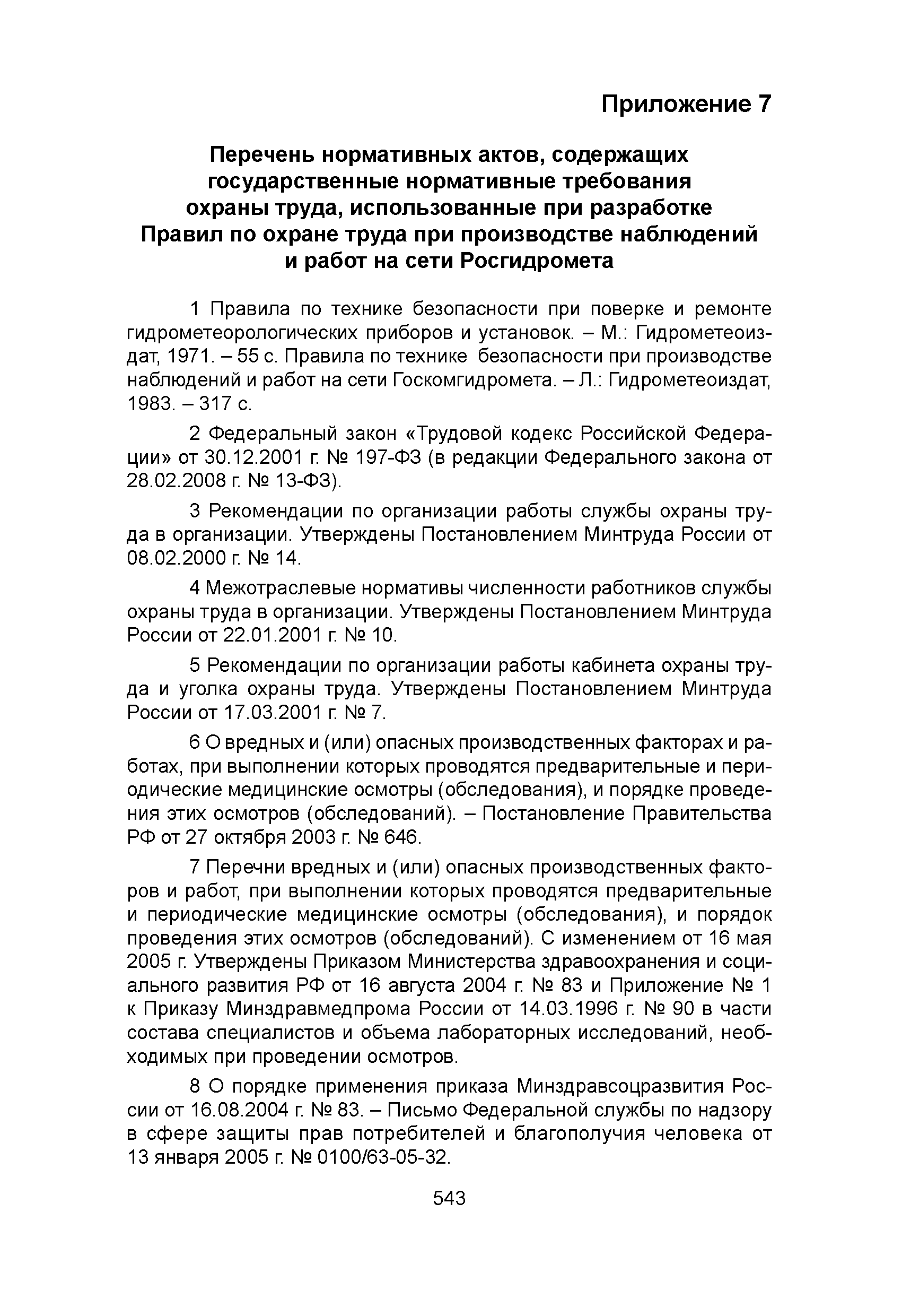 | Оглавление: | Введение 1 Общие положения 2 Гидрологические наблюдения и работы на реках и каналах 2.1 Общие требования 2.2 Требования охраны труда работников при организации и проведении гидрологических наблюдений и работ 2.2.1 Требования безопасности при проведении наблюдений за уровнем воды 2.2.2 Требования безопасности при проведении наблюдений за ледовыми явлениями и толщиной льда 2.2.3 Требования безопасности при проведении уровенных и ледовых наблюдений в случае возникновения заторов и зажоров льда 2.2.4 Требования безопасности при проведении гидрометрических работ по измерению расходов воды и наблюдений за наносами 2.2.5 Требования безопасности при проведении работ на горных и таежных реках, а также в период прохождения весеннего половодья и высоких дождевых паводков 2.2.6 Требования безопасности при организации специализированных гидрологических наблюдений и работ (болотных, воднобалансовых, на наледях) 2.2.7 Требования безопасности при проведении аэрогидрометрических наблюдений и работ 2.2.8 Средства индивидуальной защиты работников 2.2.9 Меры по защите работников при возникновении аварийных ситуаций 2.3 Требования к производственным площадкам, оборудованию, приборам и условиям их эксплуатации 2.3.1 Общие требования 2.3.2 Требования при проведении наблюдений за уровнем воды 2.3.3 Требования при проведении наблюдений за продольным уклоном водной поверхности 2.3.4 Требования при проведении наблюдений за температурой воды 2.3.5 Требования при проведении наблюдений за ледовыми явлениями, толщиной льда, снежным покровом 2.3.6 Требования при проведении измерений расходов воды и взвешенных наносов, при отборе проб донных отложений 3 Гидрометеорологические наблюдения и работы на озерах и водохранилищах 3.1 Общие требования 3.2 Требования охраны труда работников при организации и проведении гидрометеорологических наблюдений и работ 3.2.1 Общие требования 3.2.2 Требования безопасности при проведении гидрометеорологических наблюдений и работ в прибрежной зоне водоемов 3.2.3 Требования безопасности при проведении гидрометеорологических наблюдений и работ на открытой акватории водоемов 3.2.4 Требования безопасности при проведении наблюдений за ледяным покровом 3.2.5 Средства индивидуальной защиты работников 3.2.6 Защита работников при возникновении аварийных ситуаций 3.3 Требования к производственным площадкам 3.3.1 Требования к площадкам для производства гидрометеорологических наблюдений и работ в прибрежной зоне водоемов 3.3.2 Требования к площадкам для гидрометеорологических наблюдений и работ на открытой акватории водоемов 3.3.3 Требования к площадкам для наблюдений за ледяным покровом 3.4 Требования к приборам, оборудованию и условиям их эксплуатации 4 Гидрографические обследования 4.1 Общие требования 4.2 Требования охраны труда работников при организации и проведении гидрографических обследований 4.2.1 Требования безопасности при движении по маршрутам 4.2.2 Требования безопасности при переправах через реки, озера, другие водные преграды и лавины 4.2.3 Требования безопасности при проведении маршрутных снегомерных съемок на равнинной территории 4.2.4 Требования безопасности при применении авиационного транспорта 4.2.5 Средства индивидуальной защиты работников 4.2.6 Защита работников при возникновении аварийных ситуаций 4.3 Требования к пло