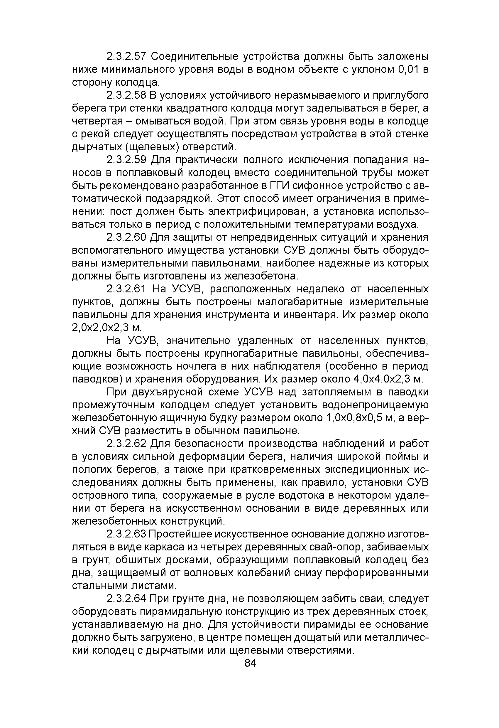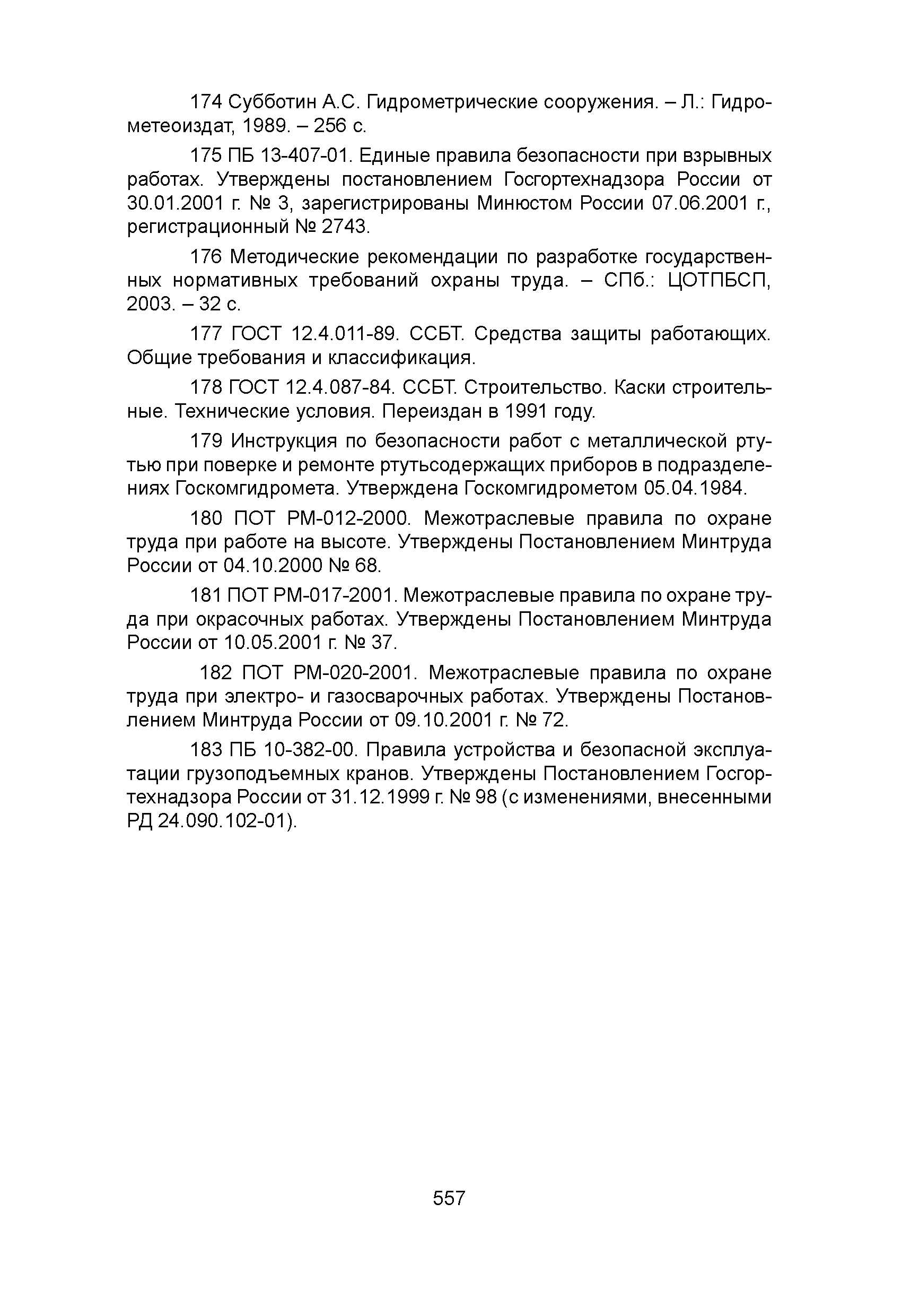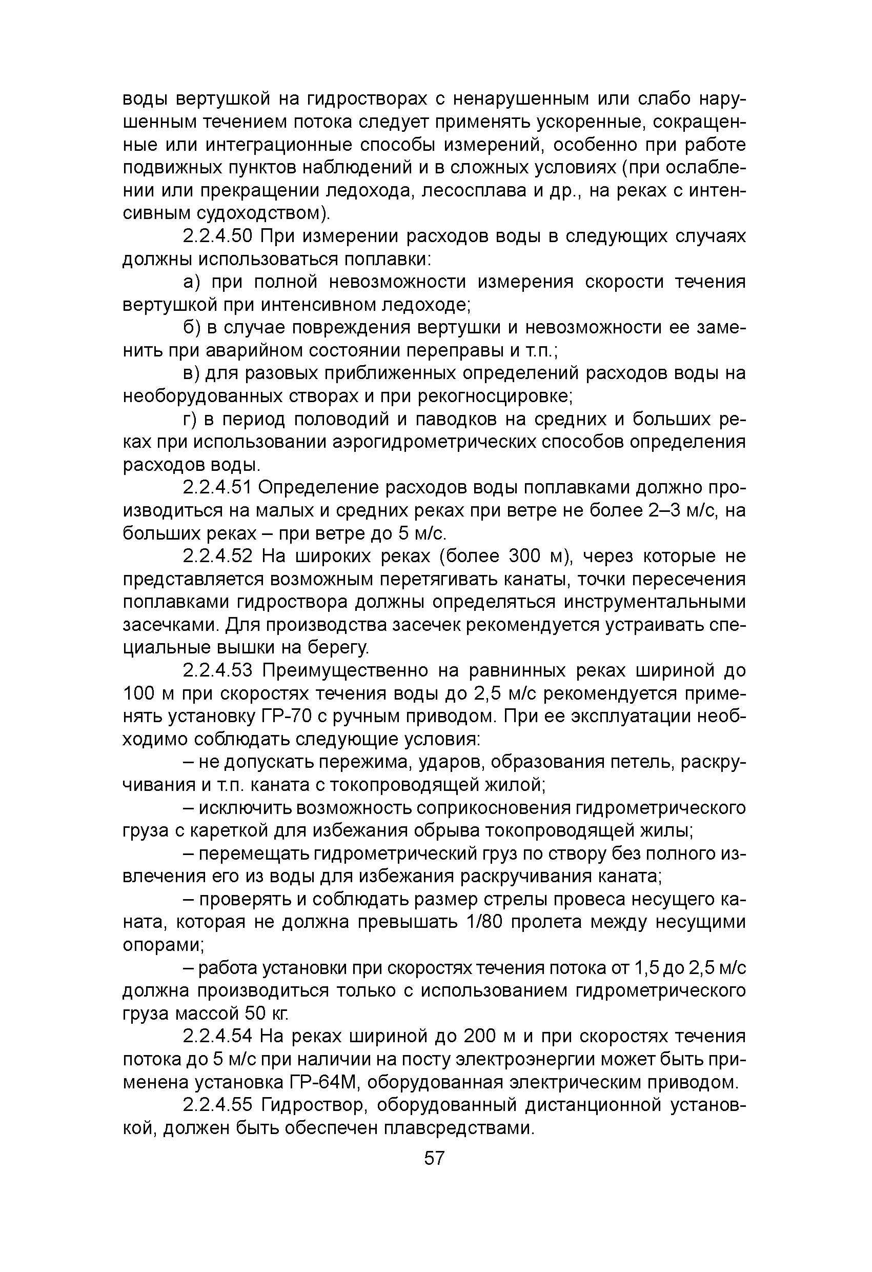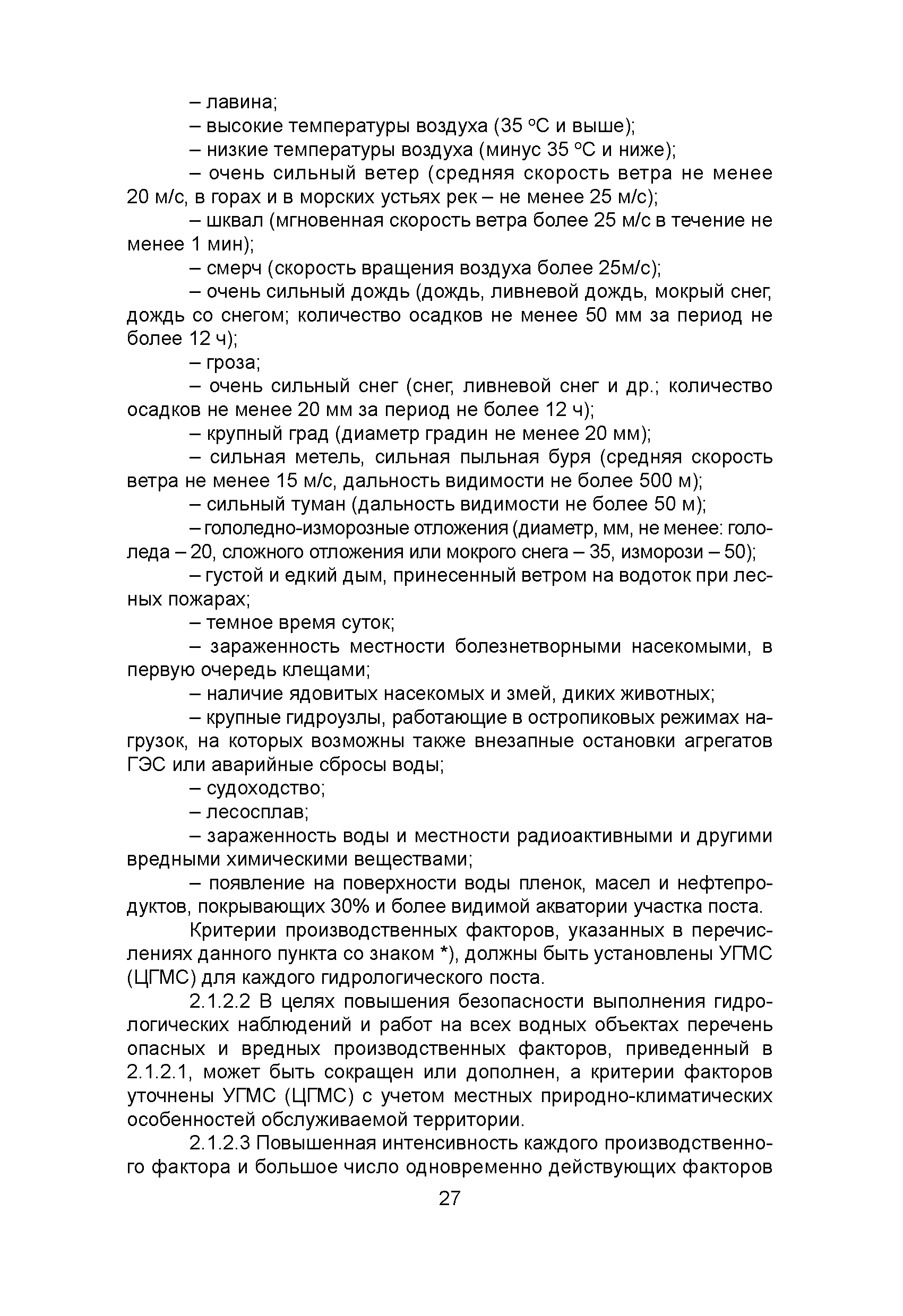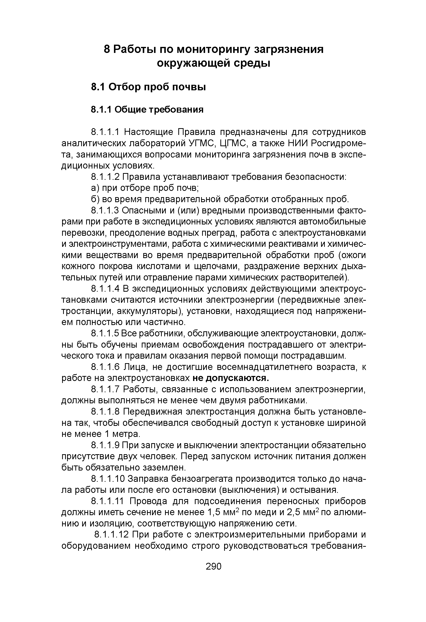 | Оглавление: | Введение 1 Общие положения 2 Гидрологические наблюдения и работы на реках и каналах 2.1 Общие требования 2.2 Требования охраны труда работников при организации и проведении гидрологических наблюдений и работ 2.2.1 Требования безопасности при проведении наблюдений за уровнем воды 2.2.2 Требования безопасности при проведении наблюдений за ледовыми явлениями и толщиной льда 2.2.3 Требования безопасности при проведении уровенных и ледовых наблюдений в случае возникновения заторов и зажоров льда 2.2.4 Требования безопасности при проведении гидрометрических работ по измерению расходов воды и наблюдений за наносами 2.2.5 Требования безопасности при проведении работ на горных и таежных реках, а также в период прохождения весеннего половодья и высоких дождевых паводков 2.2.6 Требования безопасности при организации специализированных гидрологических наблюдений и работ (болотных, воднобалансовых, на наледях) 2.2.7 Требования безопасности при проведении аэрогидрометрических наблюдений и работ 2.2.8 Средства индивидуальной защиты работников 2.2.9 Меры по защите работников при возникновении аварийных ситуаций 2.3 Требования к производственным площадкам, оборудованию, приборам и условиям их эксплуатации 2.3.1 Общие требования 2.3.2 Требования при проведении наблюдений за уровнем воды 2.3.3 Требования при проведении наблюдений за продольным уклоном водной поверхности 2.3.4 Требования при проведении наблюдений за температурой воды 2.3.5 Требования при проведении наблюдений за ледовыми явлениями, толщиной льда, снежным покровом 2.3.6 Требования при проведении измерений расходов воды и взвешенных наносов, при отборе проб донных отложений 3 Гидрометеорологические наблюдения и работы на озерах и водохранилищах 3.1 Общие требования 3.2 Требования охраны труда работников при организации и проведении гидрометеорологических наблюдений и работ 3.2.1 Общие требования 3.2.2 Требования безопасности при проведении гидрометеорологических наблюдений и работ в прибрежной зоне водоемов 3.2.3 Требования безопасности при проведении гидрометеорологических наблюдений и работ на открытой акватории водоемов 3.2.4 Требования безопасности при проведении наблюдений за ледяным покровом 3.2.5 Средства индивидуальной защиты работников 3.2.6 Защита работников при возникновении аварийных ситуаций 3.3 Требования к производственным площадкам 3.3.1 Требования к площадкам для производства гидрометеорологических наблюдений и работ в прибрежной зоне водоемов 3.3.2 Требования к площадкам для гидрометеорологических наблюдений и работ на открытой акватории водоемов 3.3.3 Требования к площадкам для наблюдений за ледяным покровом 3.4 Требования к приборам, оборудованию и условиям их эксплуатации 4 Гидрографические обследования 4.1 Общие требования 4.2 Требования охраны труда работников при организации и проведении гидрографических обследований 4.2.1 Требования безопасности при движении по маршрутам 4.2.2 Требования безопасности при переправах через реки, озера, другие водные преграды и лавины 4.2.3 Требования безопасности при проведении маршрутных снегомерных съемок на равнинной территории 4.2.4 Требования безопасности при применении авиационного транспорта 4.2.5 Средства индивидуальной защиты работников 4.2.6 Защита работников при возникновении аварийных ситуаций 4.3 Требования к пло