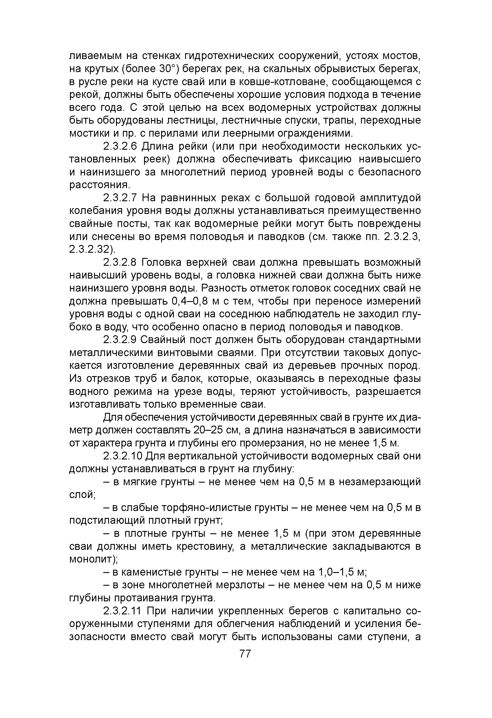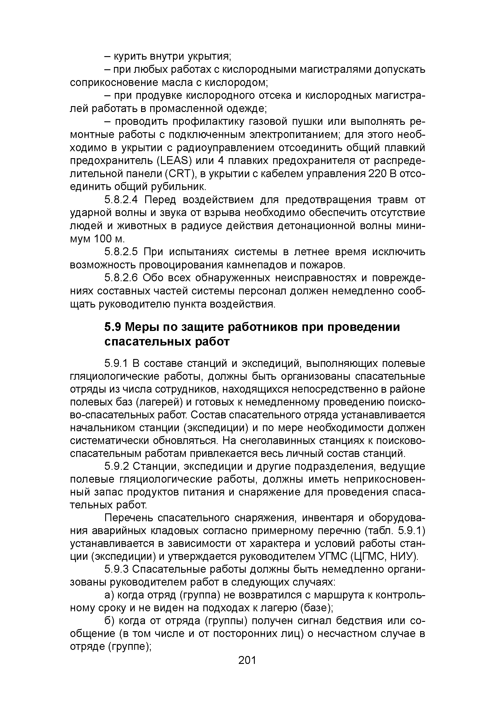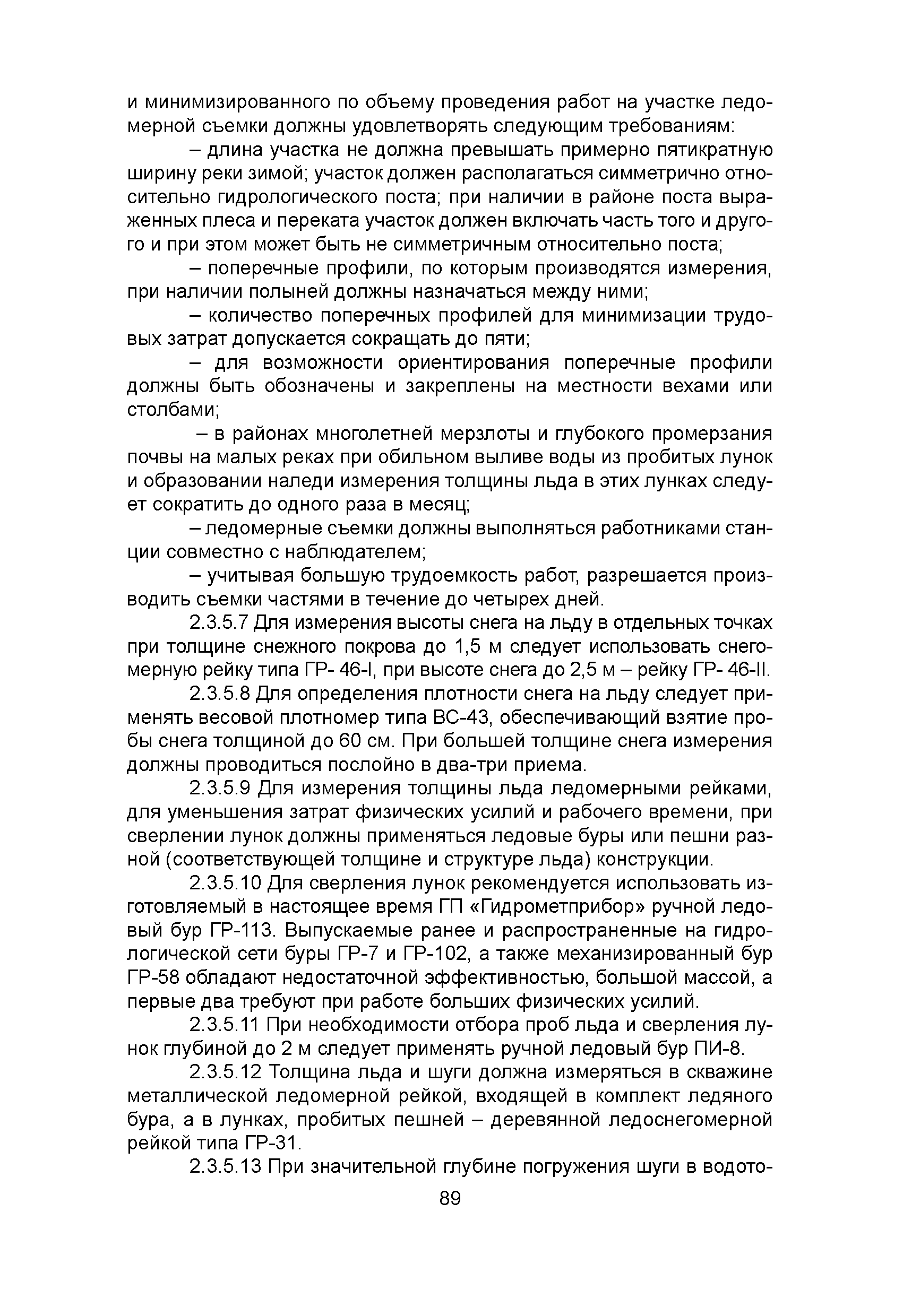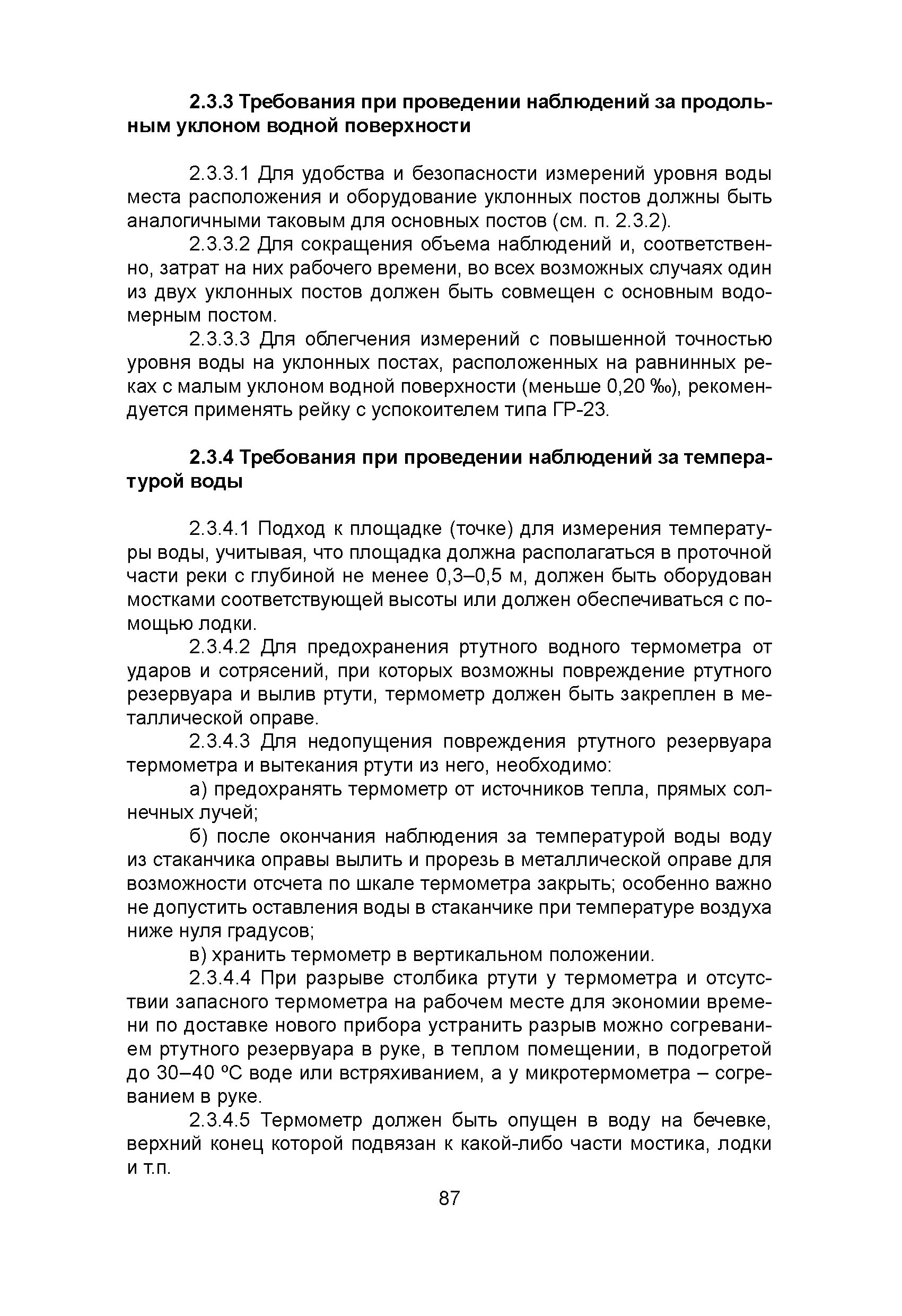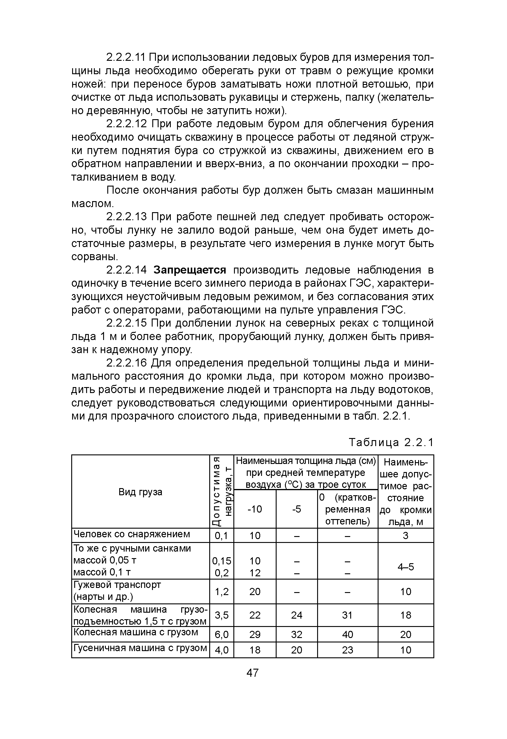 | Оглавление: | Введение 1 Общие положения 2 Гидрологические наблюдения и работы на реках и каналах 2.1 Общие требования 2.2 Требования охраны труда работников при организации и проведении гидрологических наблюдений и работ 2.2.1 Требования безопасности при проведении наблюдений за уровнем воды 2.2.2 Требования безопасности при проведении наблюдений за ледовыми явлениями и толщиной льда 2.2.3 Требования безопасности при проведении уровенных и ледовых наблюдений в случае возникновения заторов и зажоров льда 2.2.4 Требования безопасности при проведении гидрометрических работ по измерению расходов воды и наблюдений за наносами 2.2.5 Требования безопасности при проведении работ на горных и таежных реках, а также в период прохождения весеннего половодья и высоких дождевых паводков 2.2.6 Требования безопасности при организации специализированных гидрологических наблюдений и работ (болотных, воднобалансовых, на наледях) 2.2.7 Требования безопасности при проведении аэрогидрометрических наблюдений и работ 2.2.8 Средства индивидуальной защиты работников 2.2.9 Меры по защите работников при возникновении аварийных ситуаций 2.3 Требования к производственным площадкам, оборудованию, приборам и условиям их эксплуатации 2.3.1 Общие требования 2.3.2 Требования при проведении наблюдений за уровнем воды 2.3.3 Требования при проведении наблюдений за продольным уклоном водной поверхности 2.3.4 Требования при проведении наблюдений за температурой воды 2.3.5 Требования при проведении наблюдений за ледовыми явлениями, толщиной льда, снежным покровом 2.3.6 Требования при проведении измерений расходов воды и взвешенных наносов, при отборе проб донных отложений 3 Гидрометеорологические наблюдения и работы на озерах и водохранилищах 3.1 Общие требования 3.2 Требования охраны труда работников при организации и проведении гидрометеорологических наблюдений и работ 3.2.1 Общие требования 3.2.2 Требования безопасности при проведении гидрометеорологических наблюдений и работ в прибрежной зоне водоемов 3.2.3 Требования безопасности при проведении гидрометеорологических наблюдений и работ на открытой акватории водоемов 3.2.4 Требования безопасности при проведении наблюдений за ледяным покровом 3.2.5 Средства индивидуальной защиты работников 3.2.6 Защита работников при возникновении аварийных ситуаций 3.3 Требования к производственным площадкам 3.3.1 Требования к площадкам для производства гидрометеорологических наблюдений и работ в прибрежной зоне водоемов 3.3.2 Требования к площадкам для гидрометеорологических наблюдений и работ на открытой акватории водоемов 3.3.3 Требования к площадкам для наблюдений за ледяным покровом 3.4 Требования к приборам, оборудованию и условиям их эксплуатации 4 Гидрографические обследования 4.1 Общие требования 4.2 Требования охраны труда работников при организации и проведении гидрографических обследований 4.2.1 Требования безопасности при движении по маршрутам 4.2.2 Требования безопасности при переправах через реки, озера, другие водные преграды и лавины 4.2.3 Требования безопасности при проведении маршрутных снегомерных съемок на равнинной территории 4.2.4 Требования безопасности при применении авиационного транспорта 4.2.5 Средства индивидуальной защиты работников 4.2.6 Защита работников при возникновении аварийных ситуаций 4.3 Требования к пло