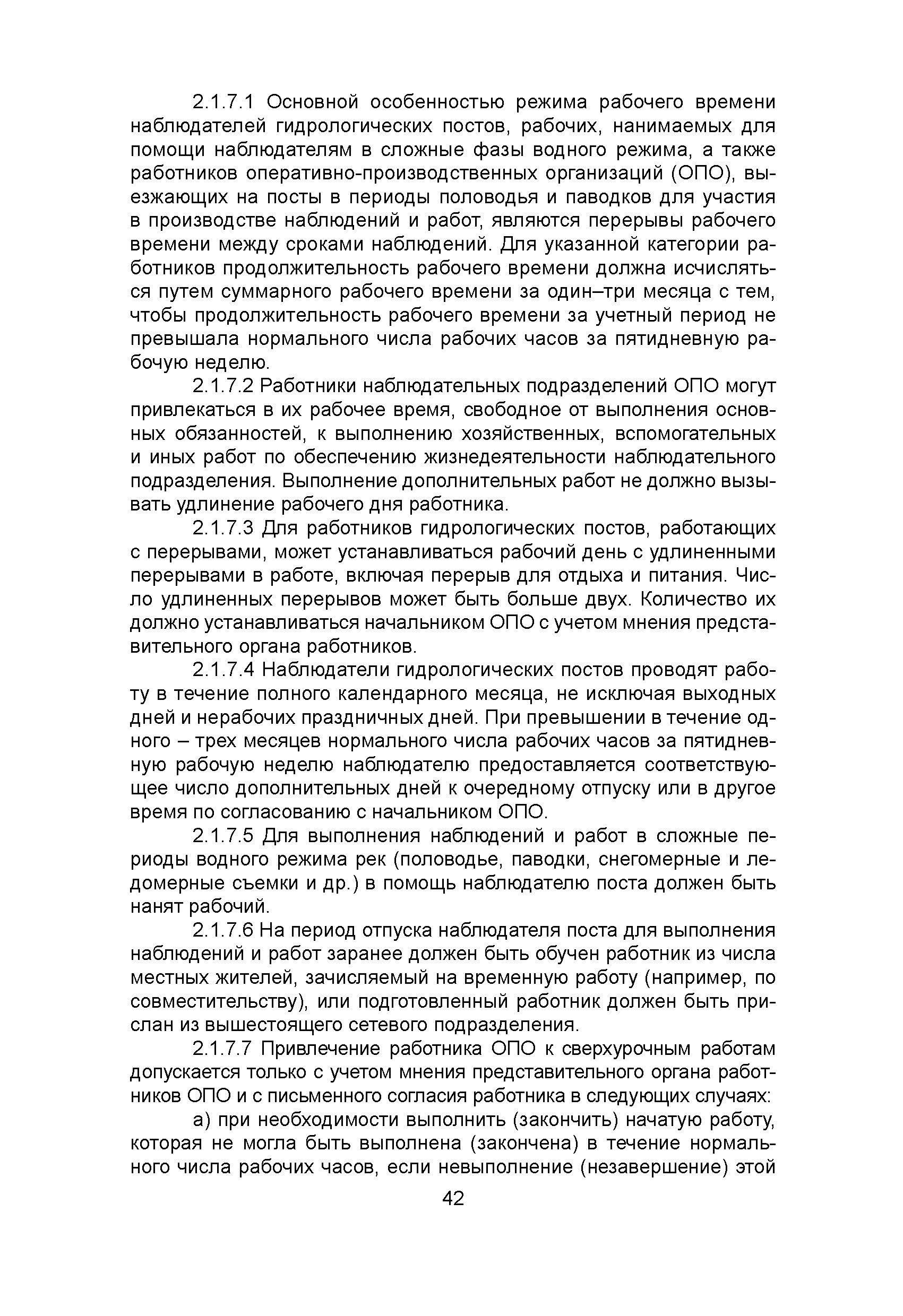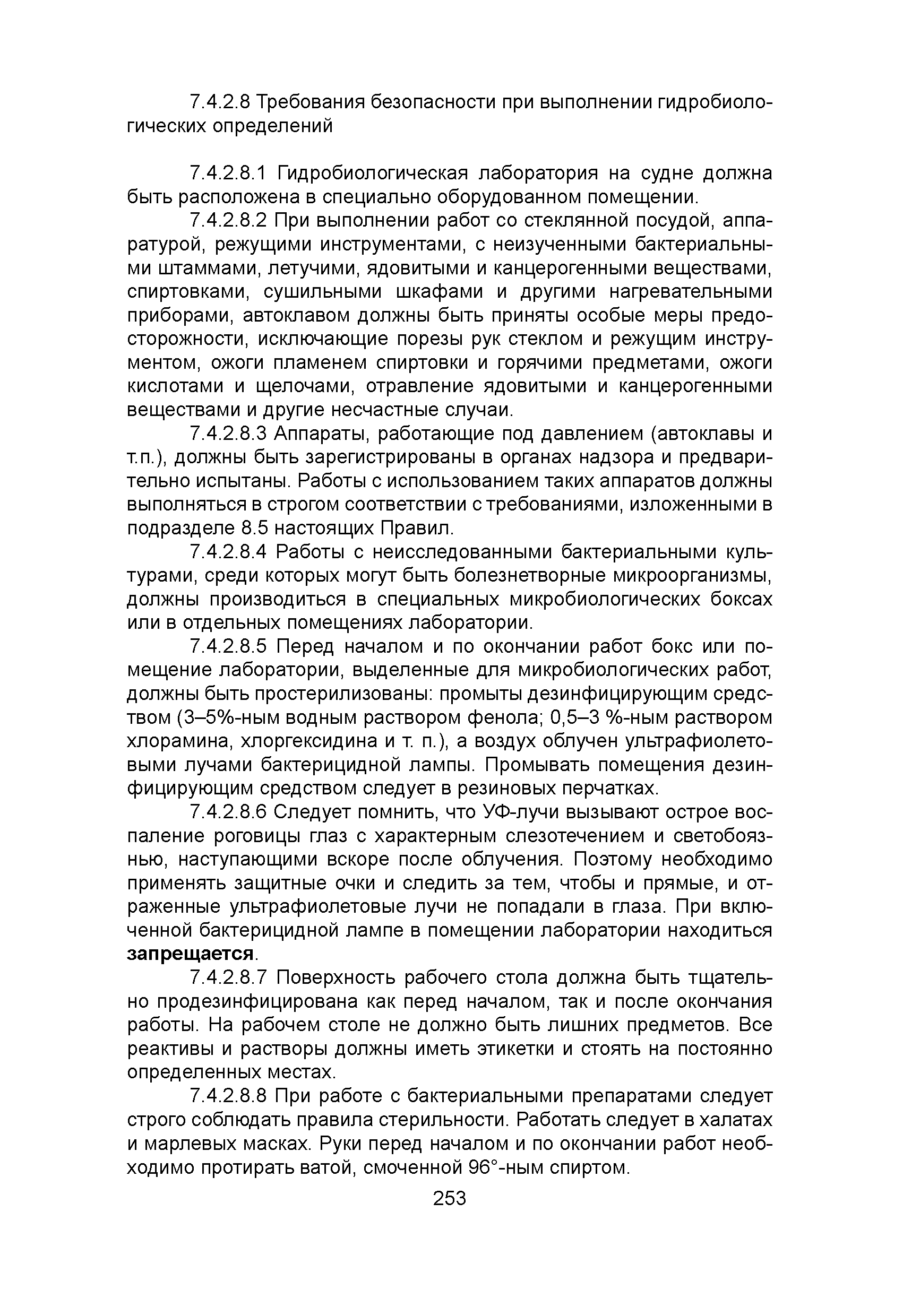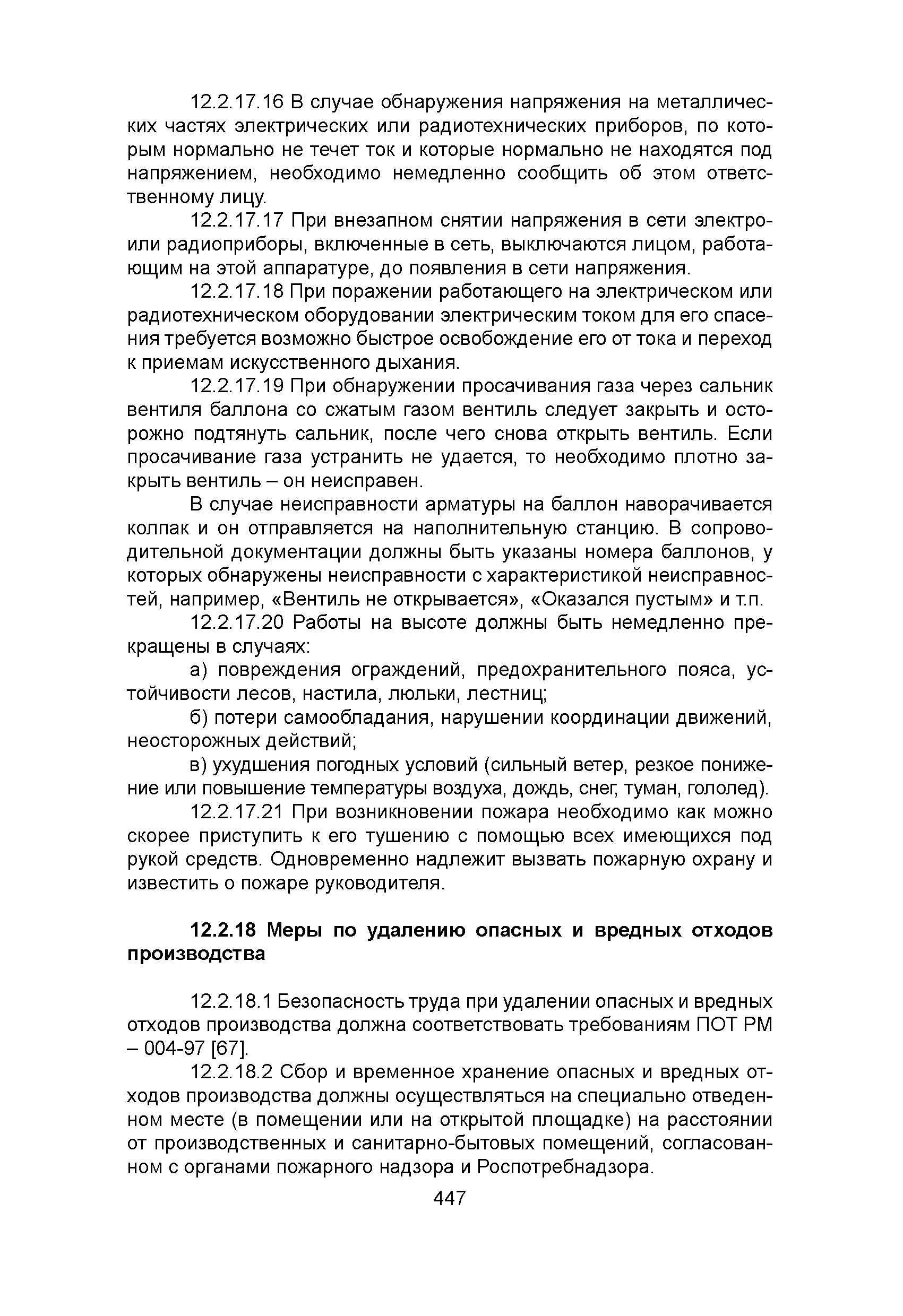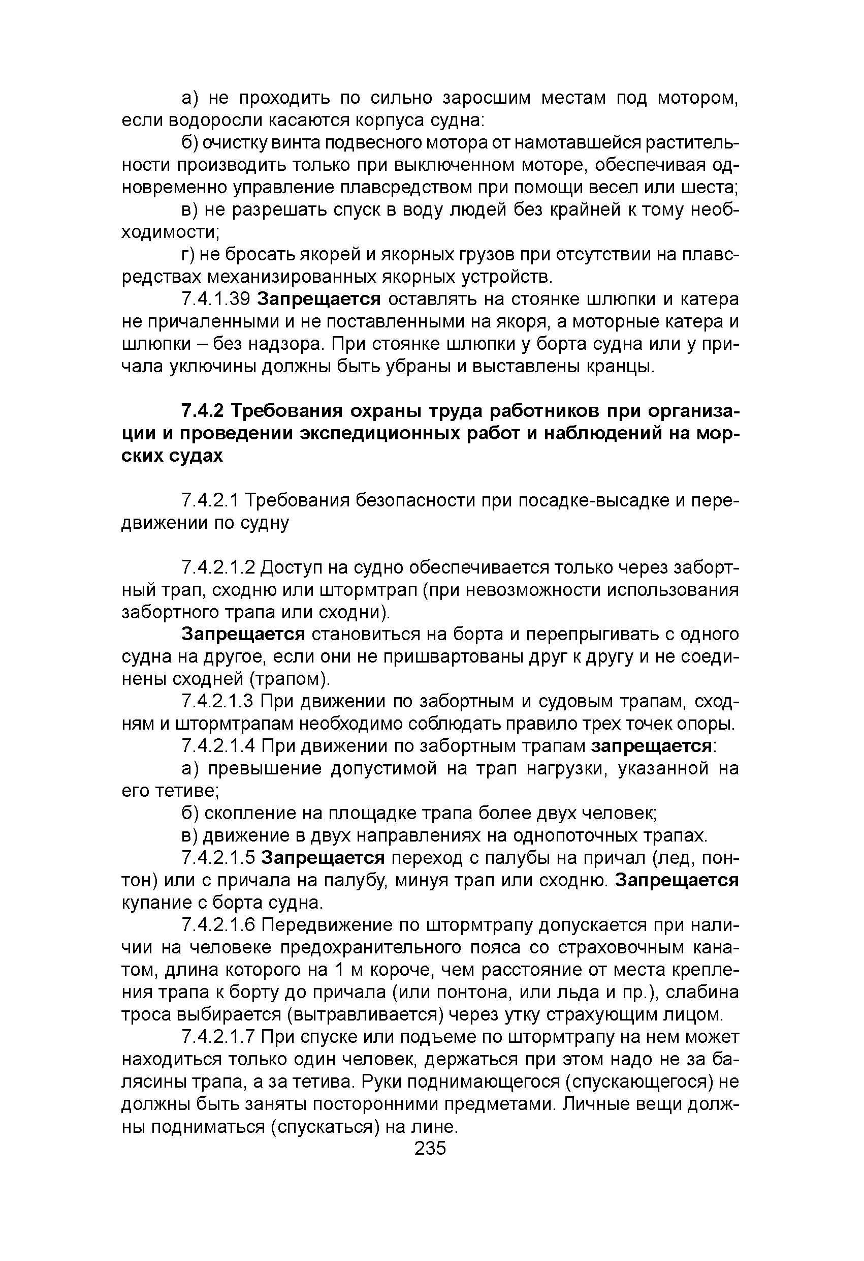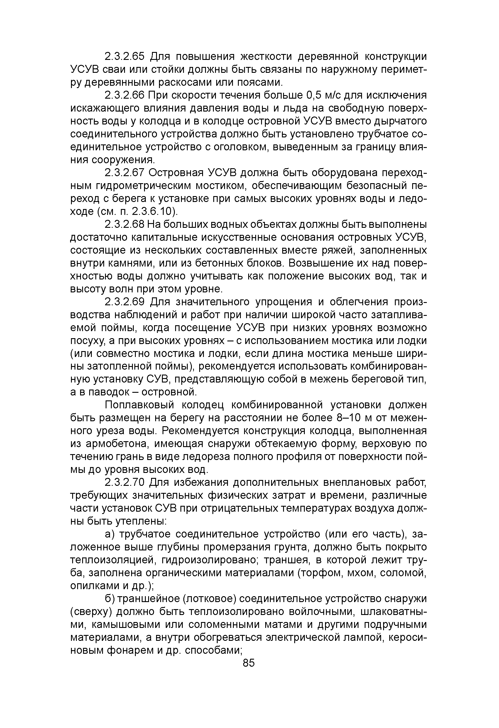 | Оглавление: | Введение 1 Общие положения 2 Гидрологические наблюдения и работы на реках и каналах 2.1 Общие требования 2.2 Требования охраны труда работников при организации и проведении гидрологических наблюдений и работ 2.2.1 Требования безопасности при проведении наблюдений за уровнем воды 2.2.2 Требования безопасности при проведении наблюдений за ледовыми явлениями и толщиной льда 2.2.3 Требования безопасности при проведении уровенных и ледовых наблюдений в случае возникновения заторов и зажоров льда 2.2.4 Требования безопасности при проведении гидрометрических работ по измерению расходов воды и наблюдений за наносами 2.2.5 Требования безопасности при проведении работ на горных и таежных реках, а также в период прохождения весеннего половодья и высоких дождевых паводков 2.2.6 Требования безопасности при организации специализированных гидрологических наблюдений и работ (болотных, воднобалансовых, на наледях) 2.2.7 Требования безопасности при проведении аэрогидрометрических наблюдений и работ 2.2.8 Средства индивидуальной защиты работников 2.2.9 Меры по защите работников при возникновении аварийных ситуаций 2.3 Требования к производственным площадкам, оборудованию, приборам и условиям их эксплуатации 2.3.1 Общие требования 2.3.2 Требования при проведении наблюдений за уровнем воды 2.3.3 Требования при проведении наблюдений за продольным уклоном водной поверхности 2.3.4 Требования при проведении наблюдений за температурой воды 2.3.5 Требования при проведении наблюдений за ледовыми явлениями, толщиной льда, снежным покровом 2.3.6 Требования при проведении измерений расходов воды и взвешенных наносов, при отборе проб донных отложений 3 Гидрометеорологические наблюдения и работы на озерах и водохранилищах 3.1 Общие требования 3.2 Требования охраны труда работников при организации и проведении гидрометеорологических наблюдений и работ 3.2.1 Общие требования 3.2.2 Требования безопасности при проведении гидрометеорологических наблюдений и работ в прибрежной зоне водоемов 3.2.3 Требования безопасности при проведении гидрометеорологических наблюдений и работ на открытой акватории водоемов 3.2.4 Требования безопасности при проведении наблюдений за ледяным покровом 3.2.5 Средства индивидуальной защиты работников 3.2.6 Защита работников при возникновении аварийных ситуаций 3.3 Требования к производственным площадкам 3.3.1 Требования к площадкам для производства гидрометеорологических наблюдений и работ в прибрежной зоне водоемов 3.3.2 Требования к площадкам для гидрометеорологических наблюдений и работ на открытой акватории водоемов 3.3.3 Требования к площадкам для наблюдений за ледяным покровом 3.4 Требования к приборам, оборудованию и условиям их эксплуатации 4 Гидрографические обследования 4.1 Общие требования 4.2 Требования охраны труда работников при организации и проведении гидрографических обследований 4.2.1 Требования безопасности при движении по маршрутам 4.2.2 Требования безопасности при переправах через реки, озера, другие водные преграды и лавины 4.2.3 Требования безопасности при проведении маршрутных снегомерных съемок на равнинной территории 4.2.4 Требования безопасности при применении авиационного транспорта 4.2.5 Средства индивидуальной защиты работников 4.2.6 Защита работников при возникновении аварийных ситуаций 4.3 Требования к пло