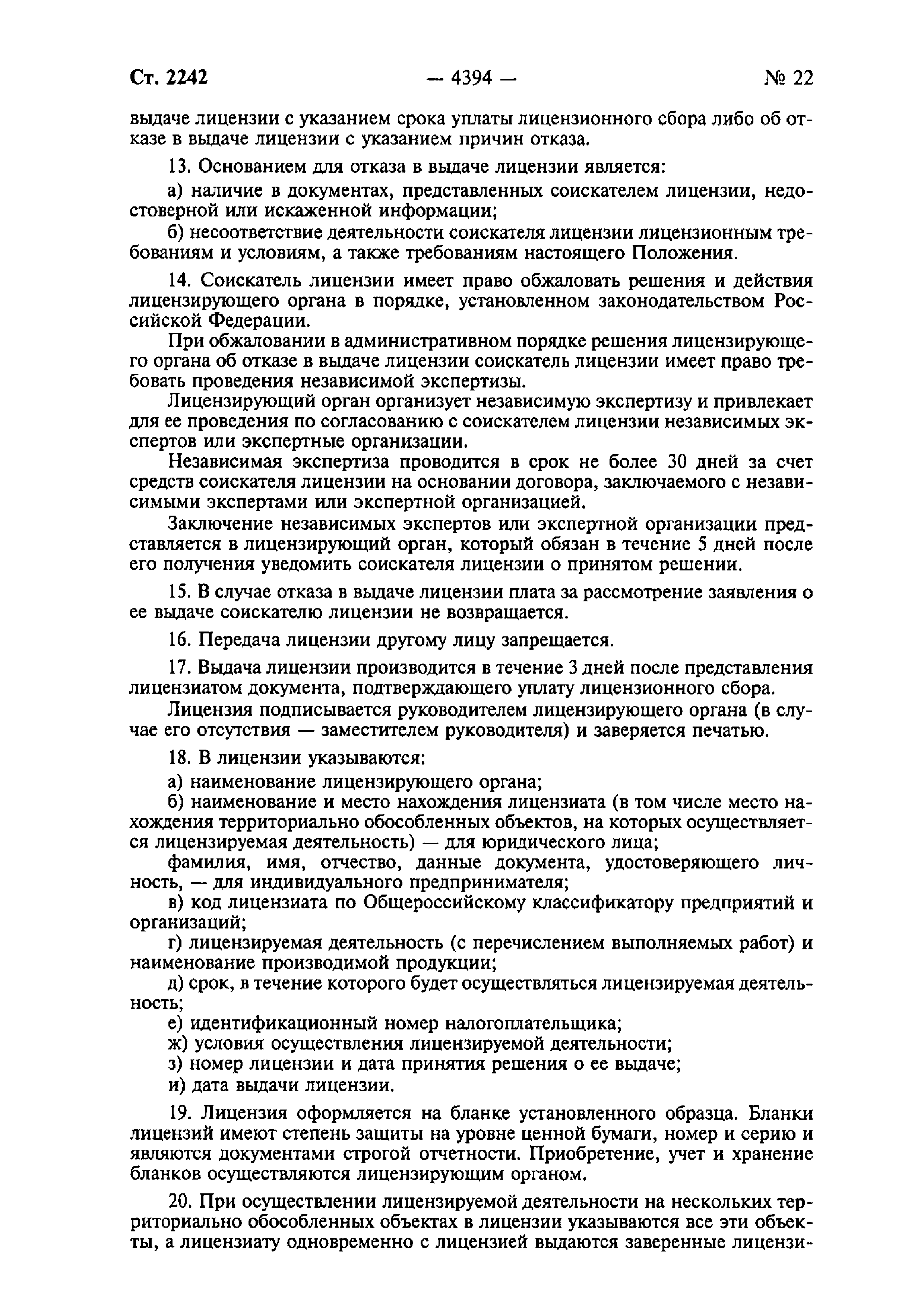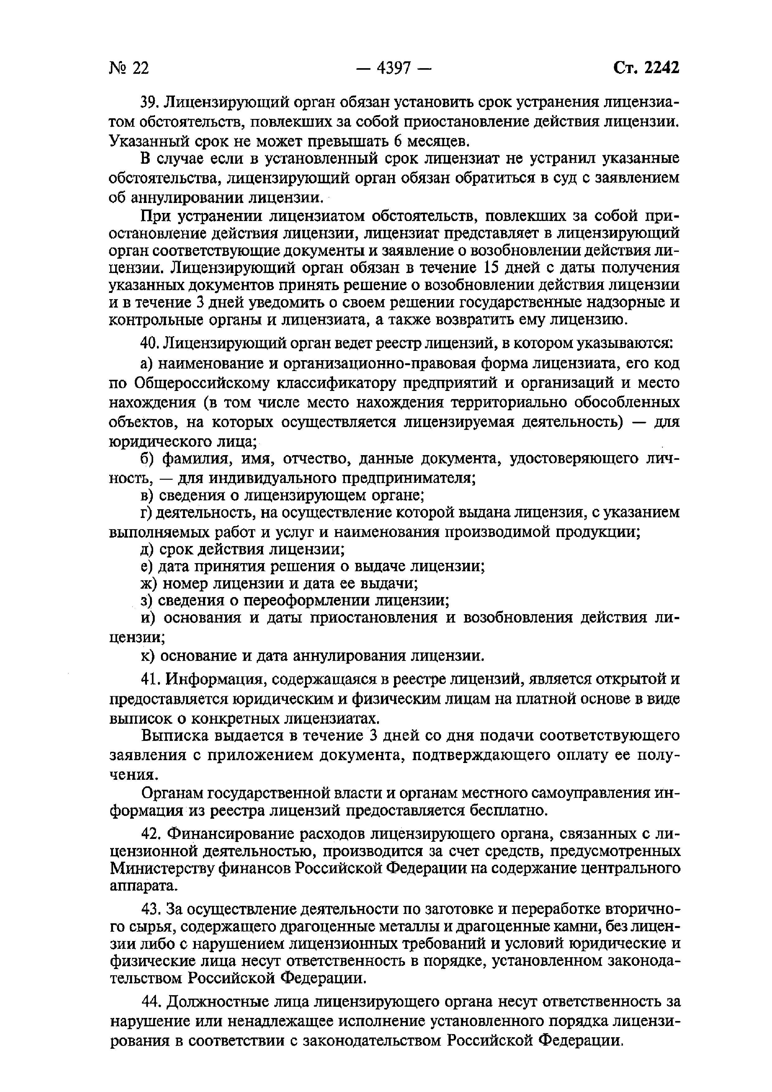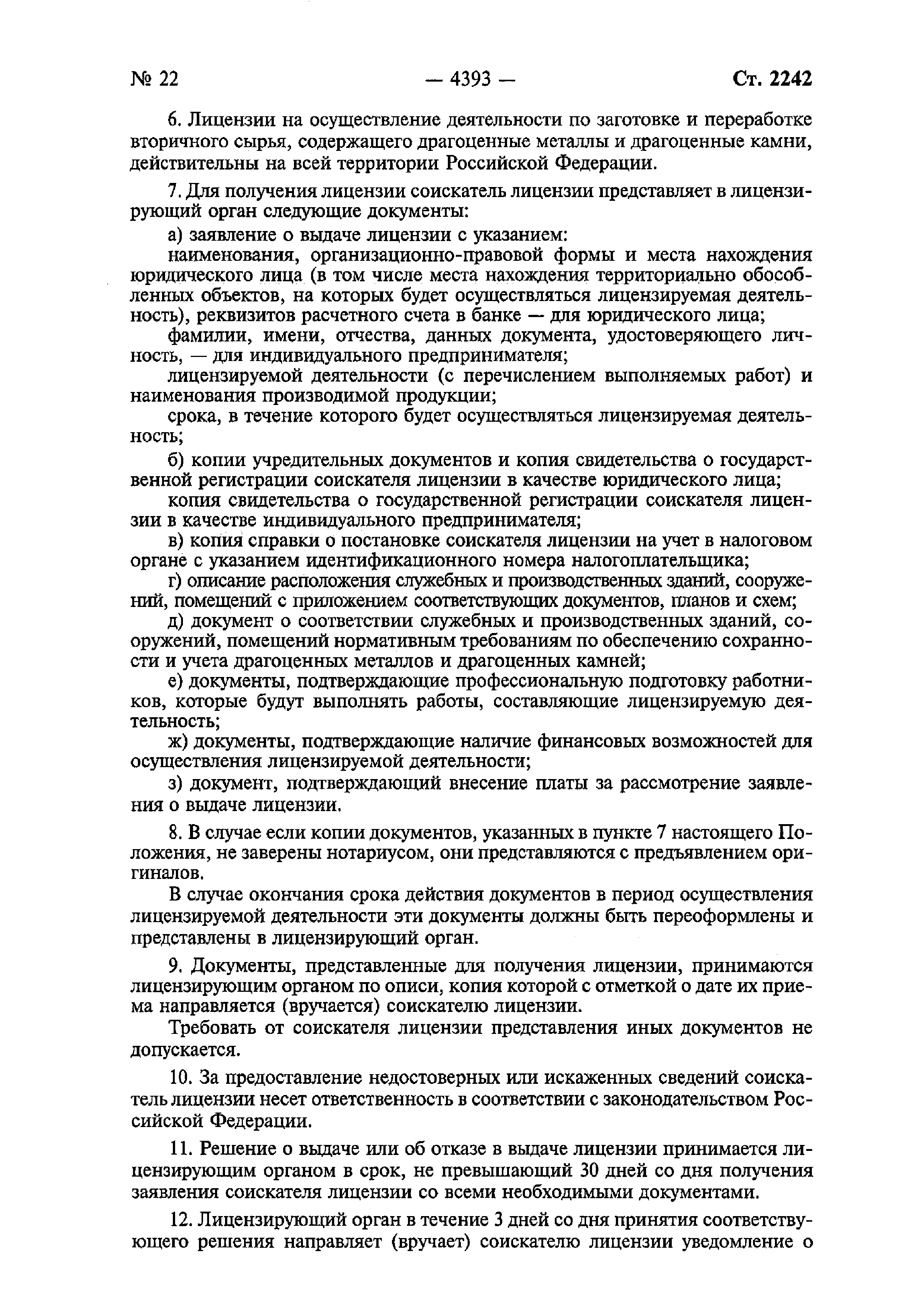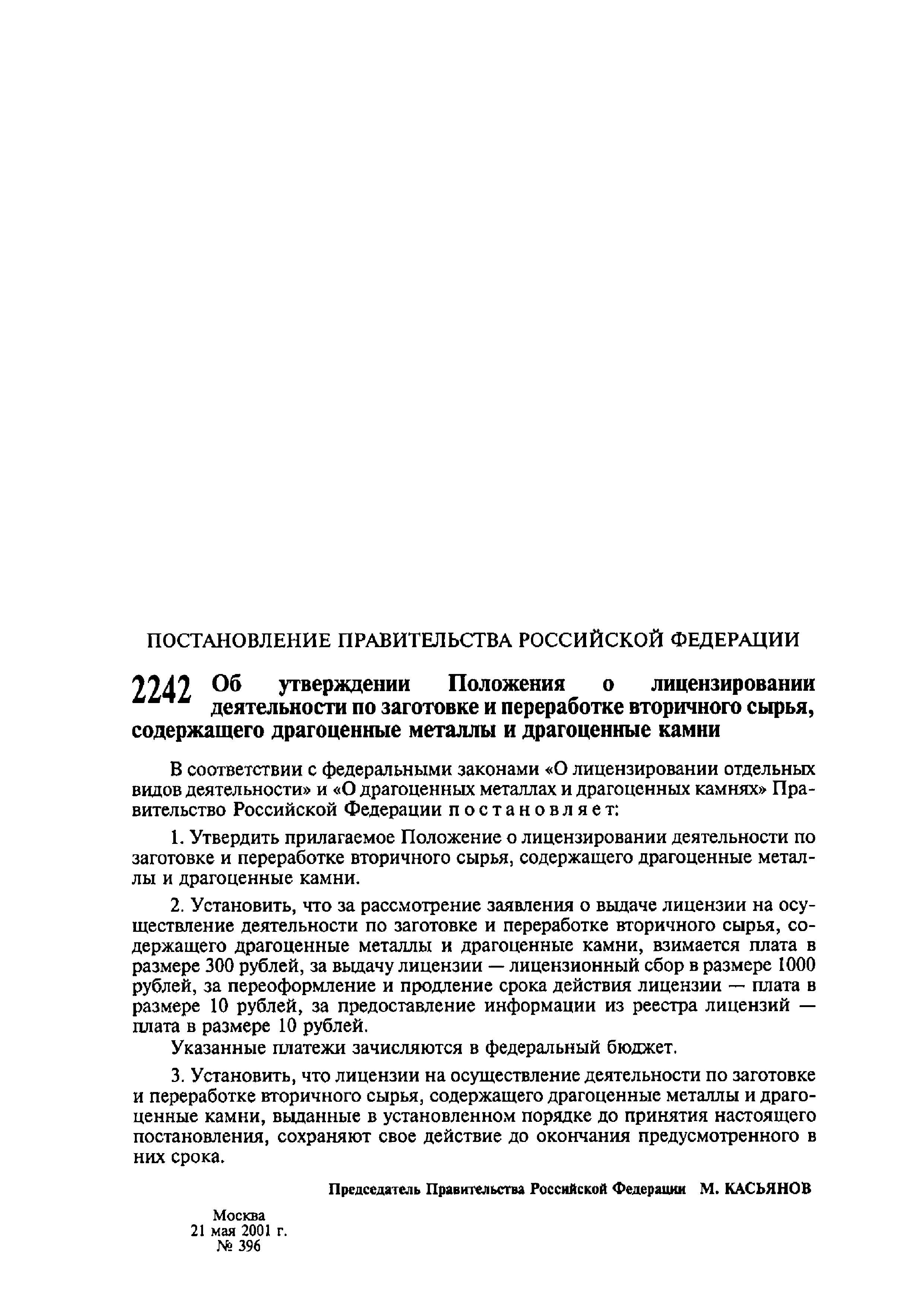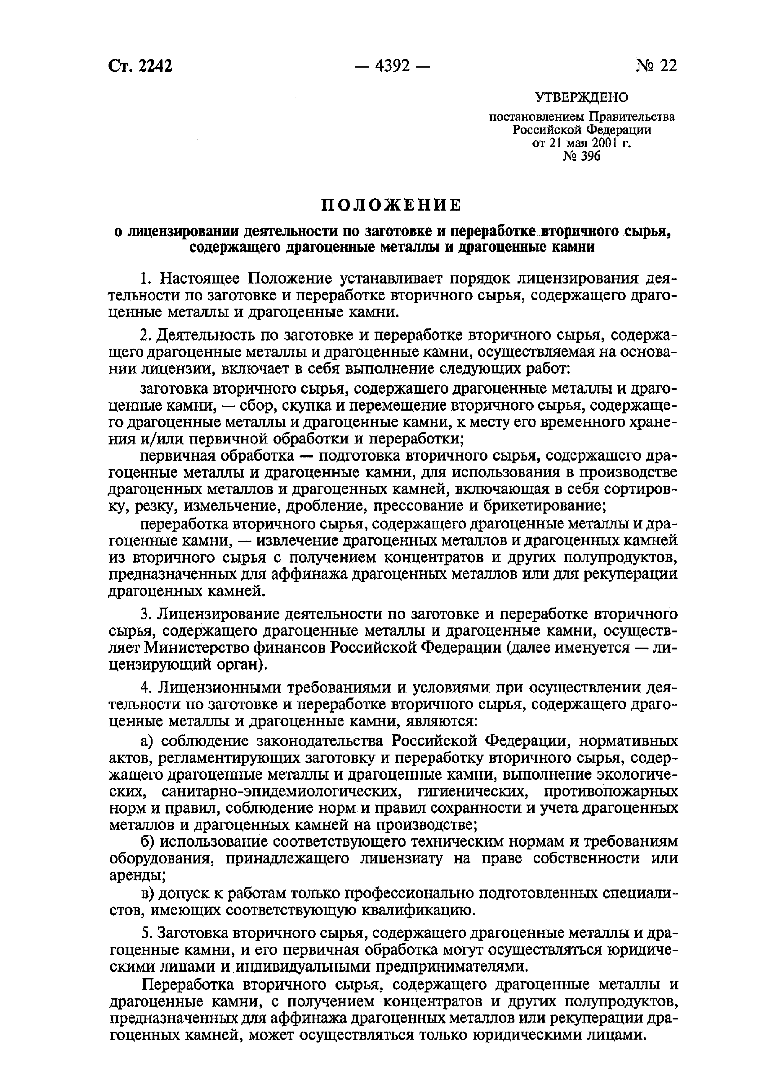 Положение о лицензировании деятельности по заготовке и переработке вторичного сырья, содержащего драгоценные металлы и драгоценные камни| Статус: | утратил силу | | Название рус.: | Положение о лицензировании деятельности по заготовке и переработке вторичного сырья, содержащего драгоценные металлы и драгоценные камни | | Дата добавления в базу: | 01.01.2021 | | Дата актуализации: | 01.01.2021 | | Дата введения: | 05.06.2001 | | Дата окончания срока действия: | 28.05.2002 | | Область применения: | Положение устанавливает порядок лицензирования деятельности по заготовке и переработке вторичного сырья, содержащего драгоценные металлы и драгоценные камни | | Утверждён: | 21.05.2001 Правительство Российской Федерации (396)