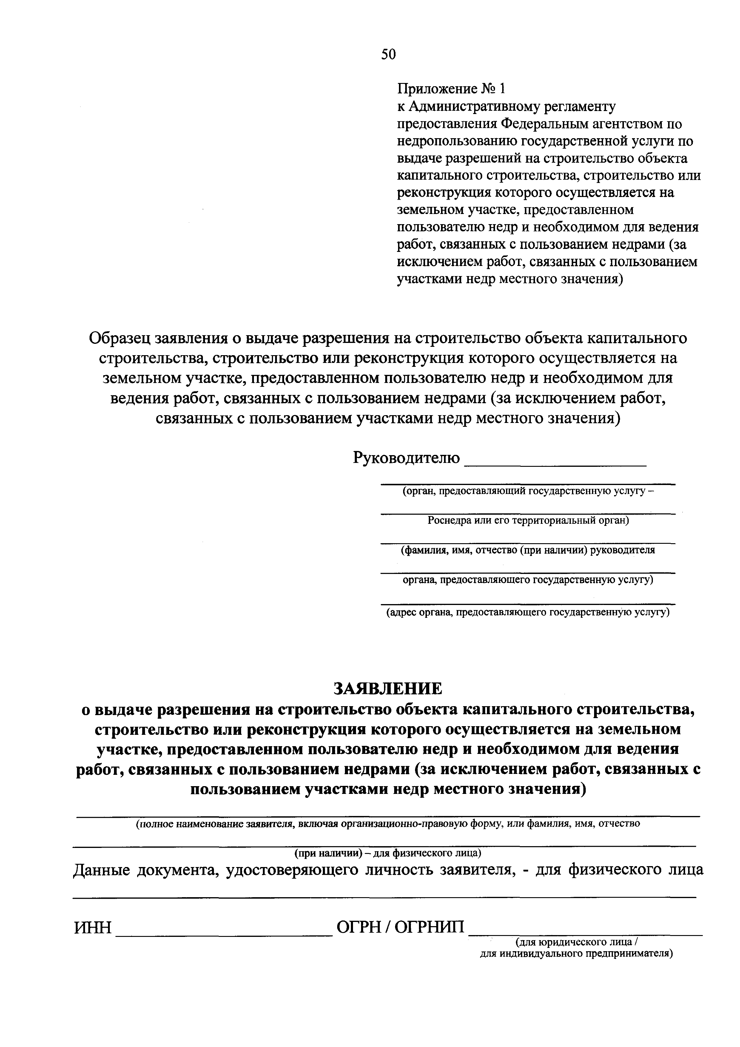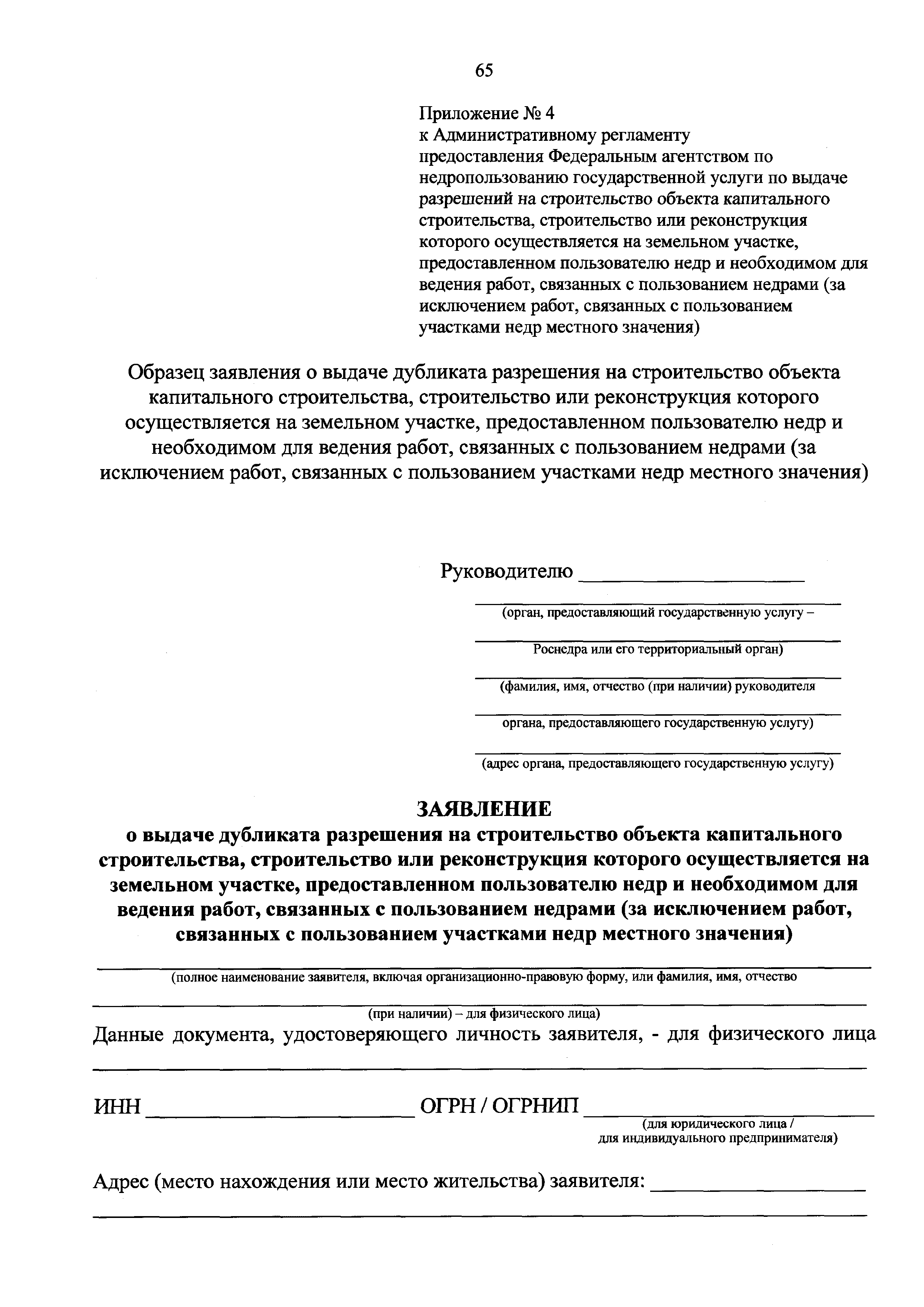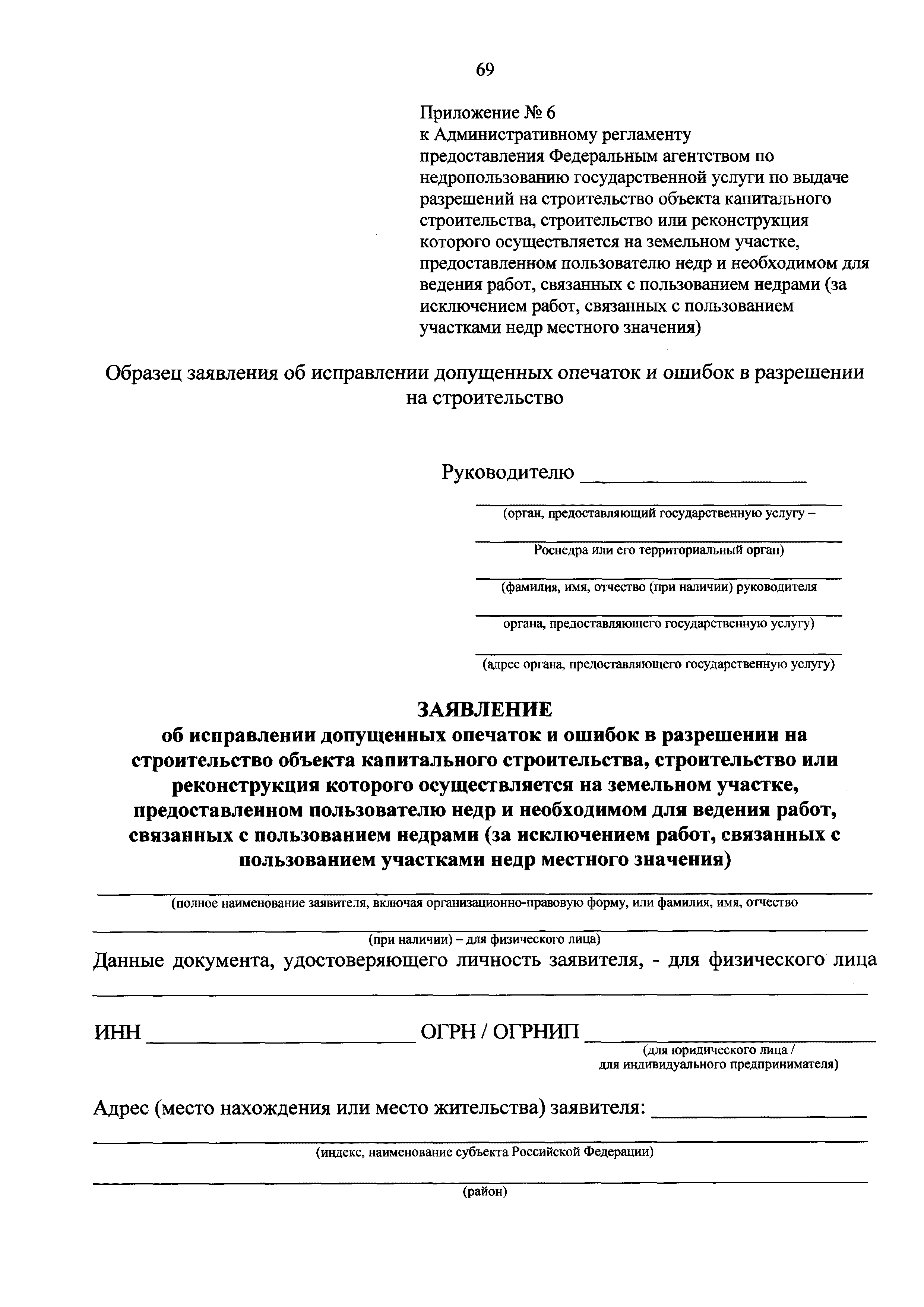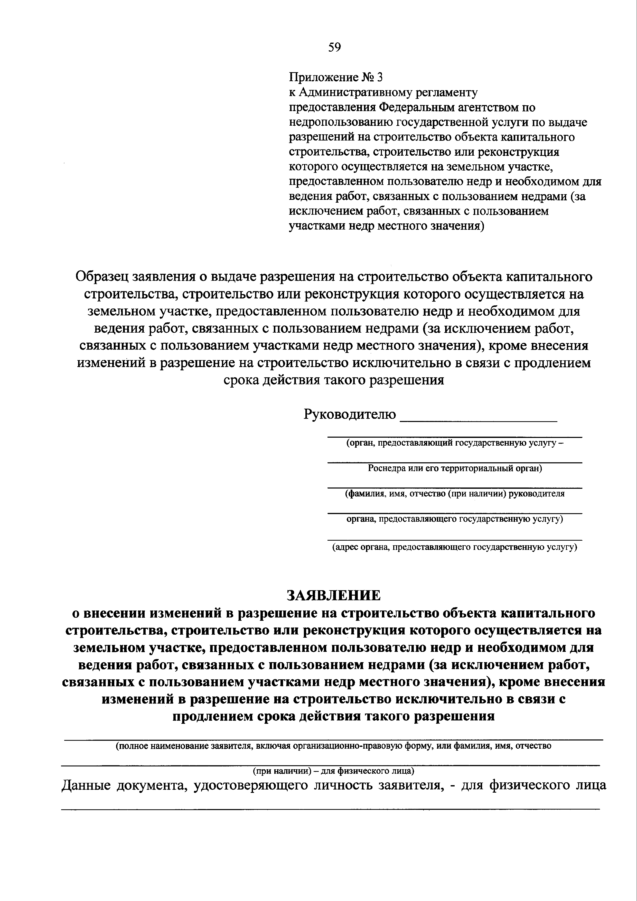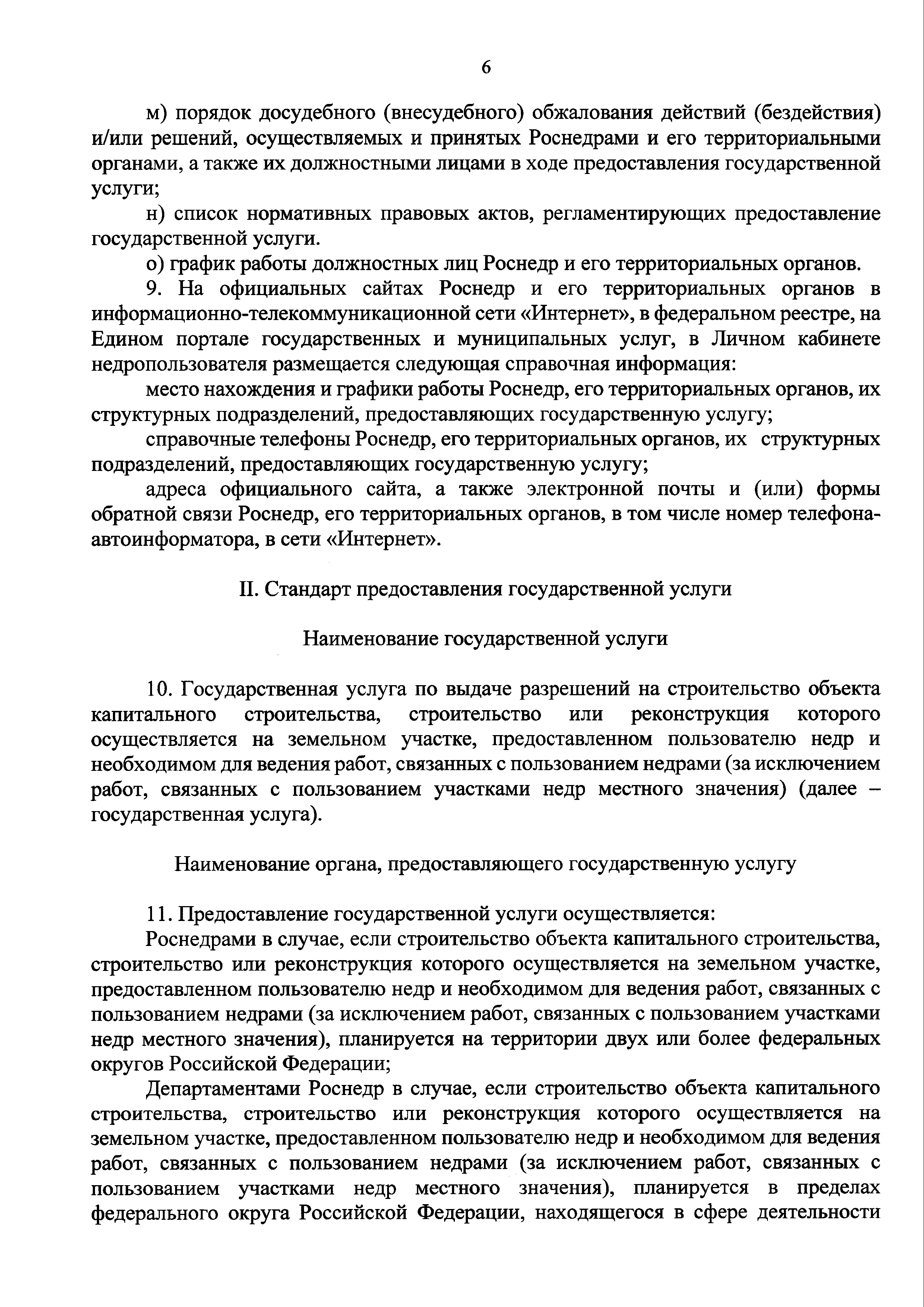 | Оглавление: | I. Общие положения II. Стандарт предоставления государственной услуги III. Состав, последовательность и сроки выполнения административных процедур (действий), требования к порядку их выполнения, в том числе особенности выполнения административных процедур (действий) в электронной форме IV. Формы контроля за предоставлением государственной услуги V. Досудебный (внесудебный) порядок обжалования решений и действий (бездействия) Роснедр и территориальных органов Роснедр, предоставляющих государственную услугу, а также их должностных лиц VI. Особенности выполнения административных процедур (действий) в многофункциональных центрах предоставления государственных и муниципальных услуг Приложение № 1. Образец заявления о выдаче разрешения на строительство объекта капитального строительства, строительство или реконструкция которого осуществляется на земельном участке, предоставленном пользователю недр и необходимом для ведения работ, связанных с пользованием недрами (за исключением работ, связанных с пользованием участками недр местного значения) Приложение № 2. Образец заявления о внесении изменений в разрешение на строительство объекта капитального строительства, строительство или реконструкция которого осуществляется на земельном участке, предоставленном пользователю недр и необходимом для ведения работ, связанных с пользованием недрами (за исключением работ, связанных с пользованием участками недр местного значения), в связи с изменением срока действия такого разрешения Приложение № 3. Образец заявления о выдаче разрешения на строительство объекта капитального строительства, строительство или реконструкция которого осуществляется на земельном участке, предоставленном пользователю недр и необходимом для ведения работ, связанных с пользованием недрами (за исключением работ, связанных с пользованием участками недр местного значения), кроме внесения изменений в разрешение на строительство исключительно в связи с продлением срока действия такого разрешения Приложение № 4. Образец заявления о выдаче дубликата разрешения на строительство объекта капитального строительства, строительство или реконструкция которого осуществляется на земельном участке, предоставленном пользователю недр и необходимом для ведения работ, связанных с пользованием недрами (за исключением работ, связанных с пользованием участками недр местного значения) Приложение № 5. Образец штампа дубликата разрешения на строительство Приложение № 6. Образец заявления об исправлении допущенных опечаток и ошибок в разрешении на строительство |