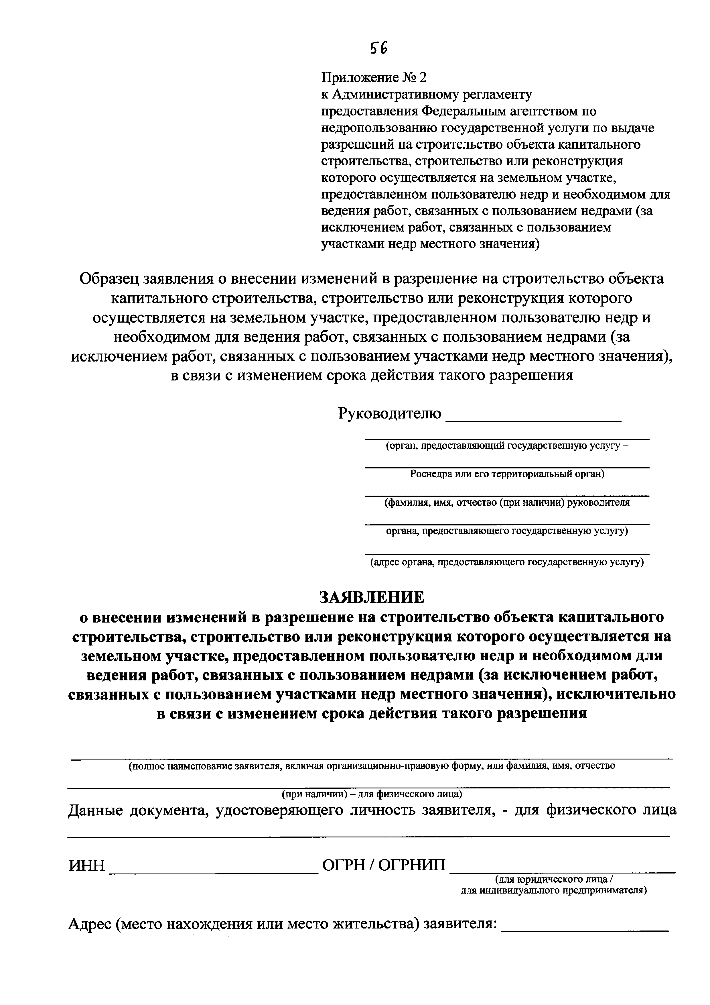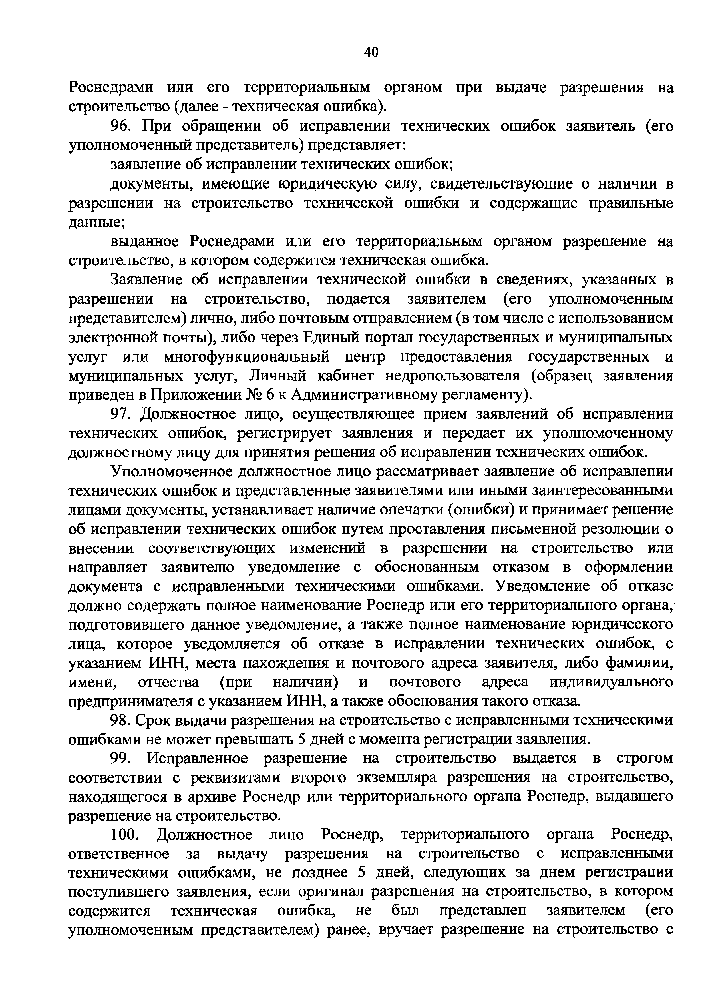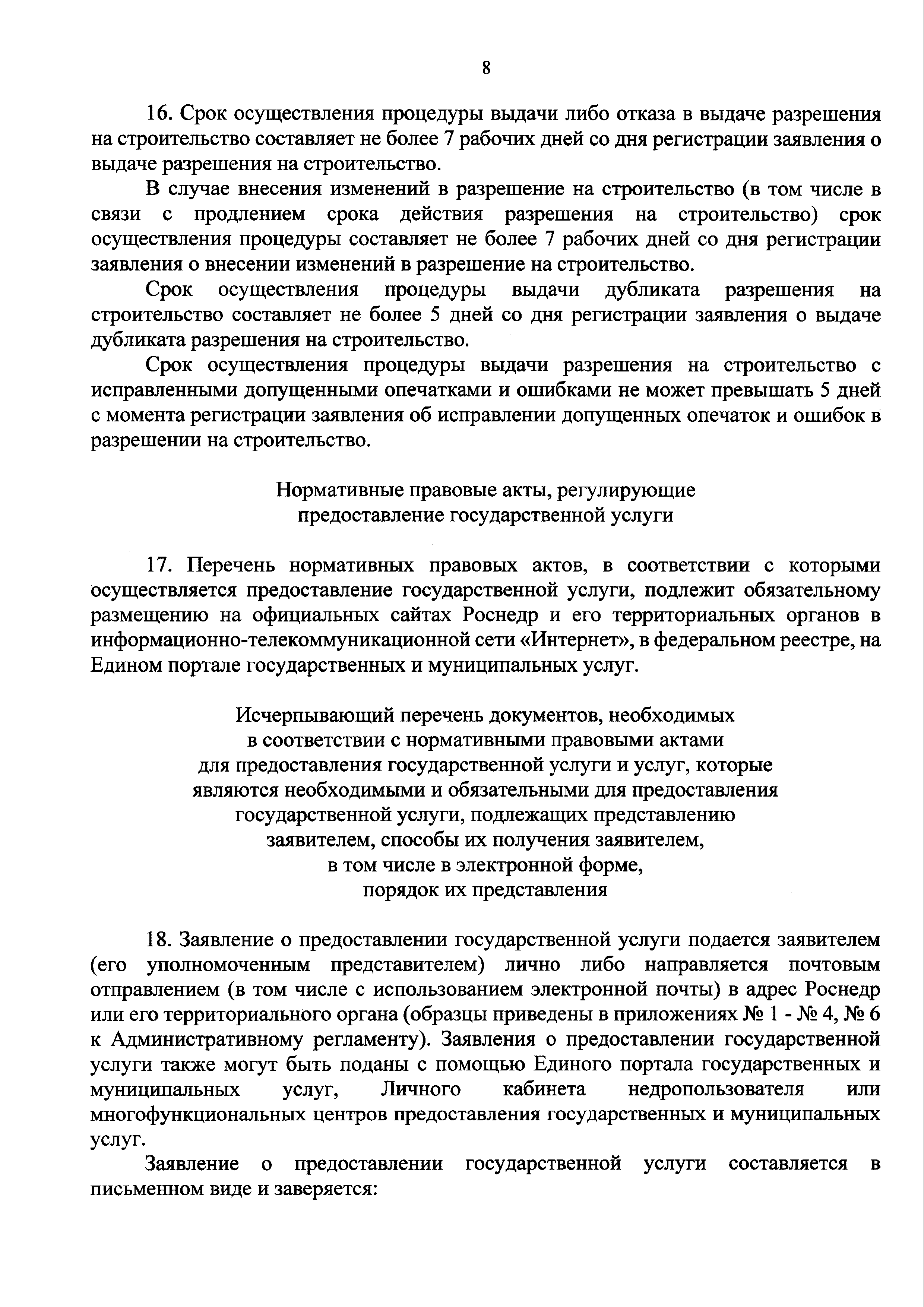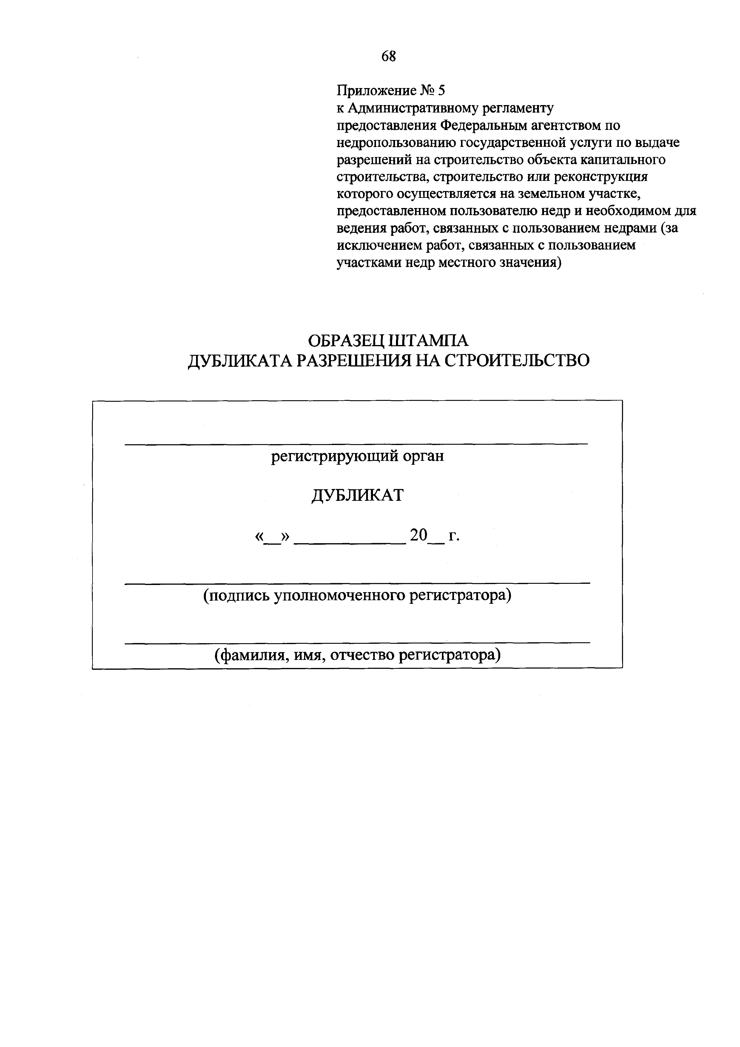 | Оглавление: | I. Общие положения II. Стандарт предоставления государственной услуги III. Состав, последовательность и сроки выполнения административных процедур (действий), требования к порядку их выполнения, в том числе особенности выполнения административных процедур (действий) в электронной форме IV. Формы контроля за предоставлением государственной услуги V. Досудебный (внесудебный) порядок обжалования решений и действий (бездействия) Роснедр и территориальных органов Роснедр, предоставляющих государственную услугу, а также их должностных лиц VI. Особенности выполнения административных процедур (действий) в многофункциональных центрах предоставления государственных и муниципальных услуг Приложение № 1. Образец заявления о выдаче разрешения на строительство объекта капитального строительства, строительство или реконструкция которого осуществляется на земельном участке, предоставленном пользователю недр и необходимом для ведения работ, связанных с пользованием недрами (за исключением работ, связанных с пользованием участками недр местного значения) Приложение № 2. Образец заявления о внесении изменений в разрешение на строительство объекта капитального строительства, строительство или реконструкция которого осуществляется на земельном участке, предоставленном пользователю недр и необходимом для ведения работ, связанных с пользованием недрами (за исключением работ, связанных с пользованием участками недр местного значения), в связи с изменением срока действия такого разрешения Приложение № 3. Образец заявления о выдаче разрешения на строительство объекта капитального строительства, строительство или реконструкция которого осуществляется на земельном участке, предоставленном пользователю недр и необходимом для ведения работ, связанных с пользованием недрами (за исключением работ, связанных с пользованием участками недр местного значения), кроме внесения изменений в разрешение на строительство исключительно в связи с продлением срока действия такого разрешения Приложение № 4. Образец заявления о выдаче дубликата разрешения на строительство объекта капитального строительства, строительство или реконструкция которого осуществляется на земельном участке, предоставленном пользователю недр и необходимом для ведения работ, связанных с пользованием недрами (за исключением работ, связанных с пользованием участками недр местного значения) Приложение № 5. Образец штампа дубликата разрешения на строительство Приложение № 6. Образец заявления об исправлении допущенных опечаток и ошибок в разрешении на строительство |