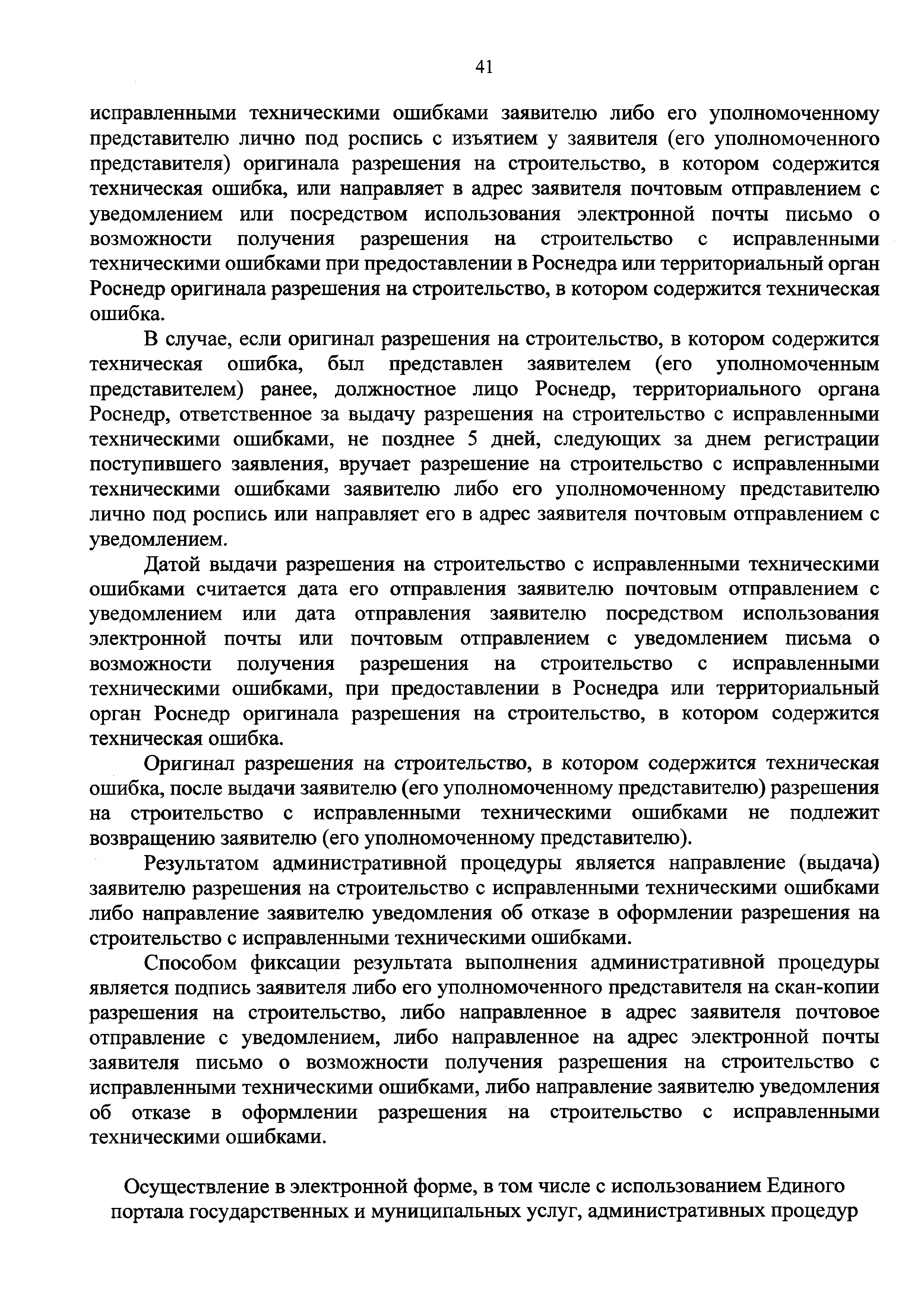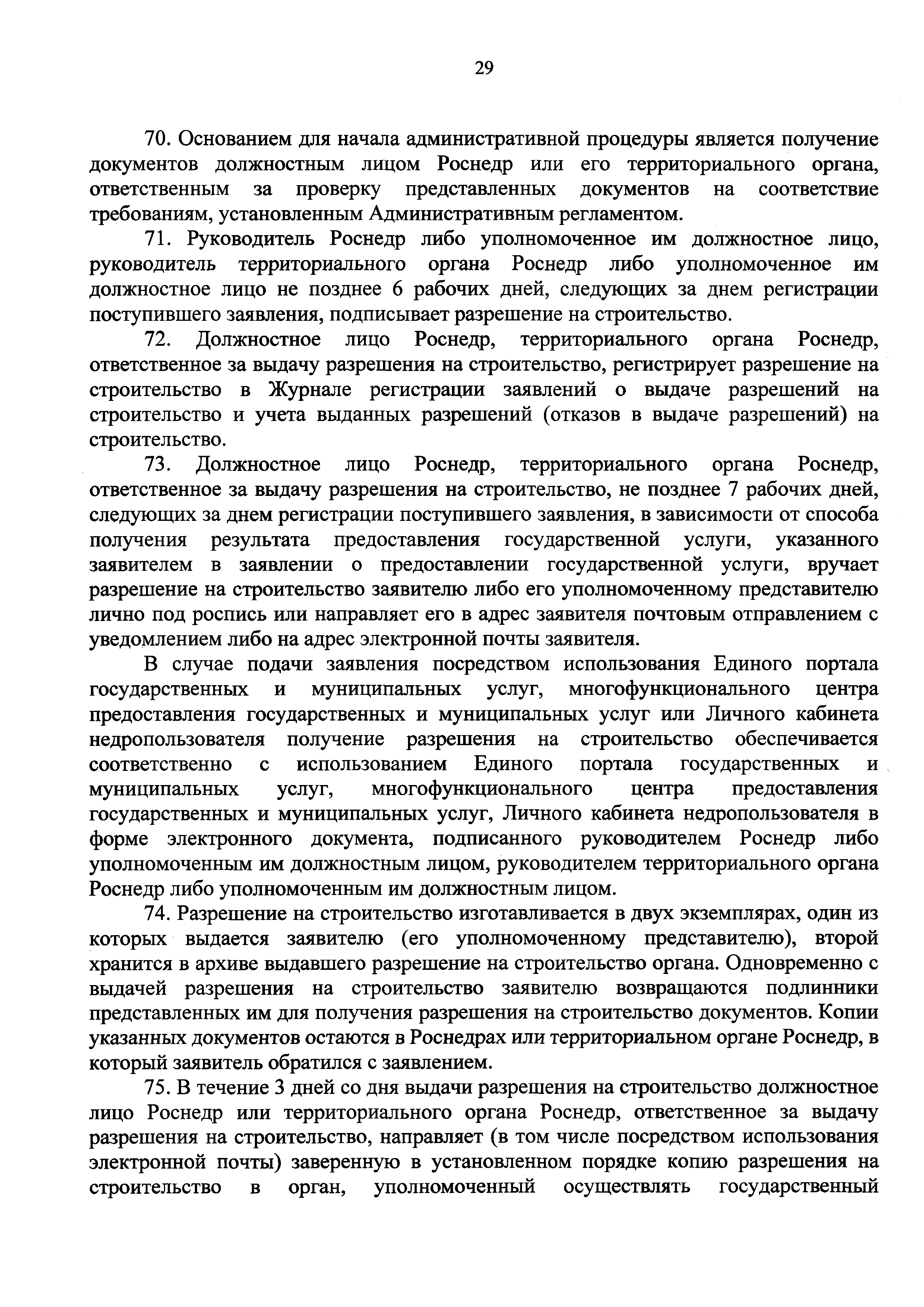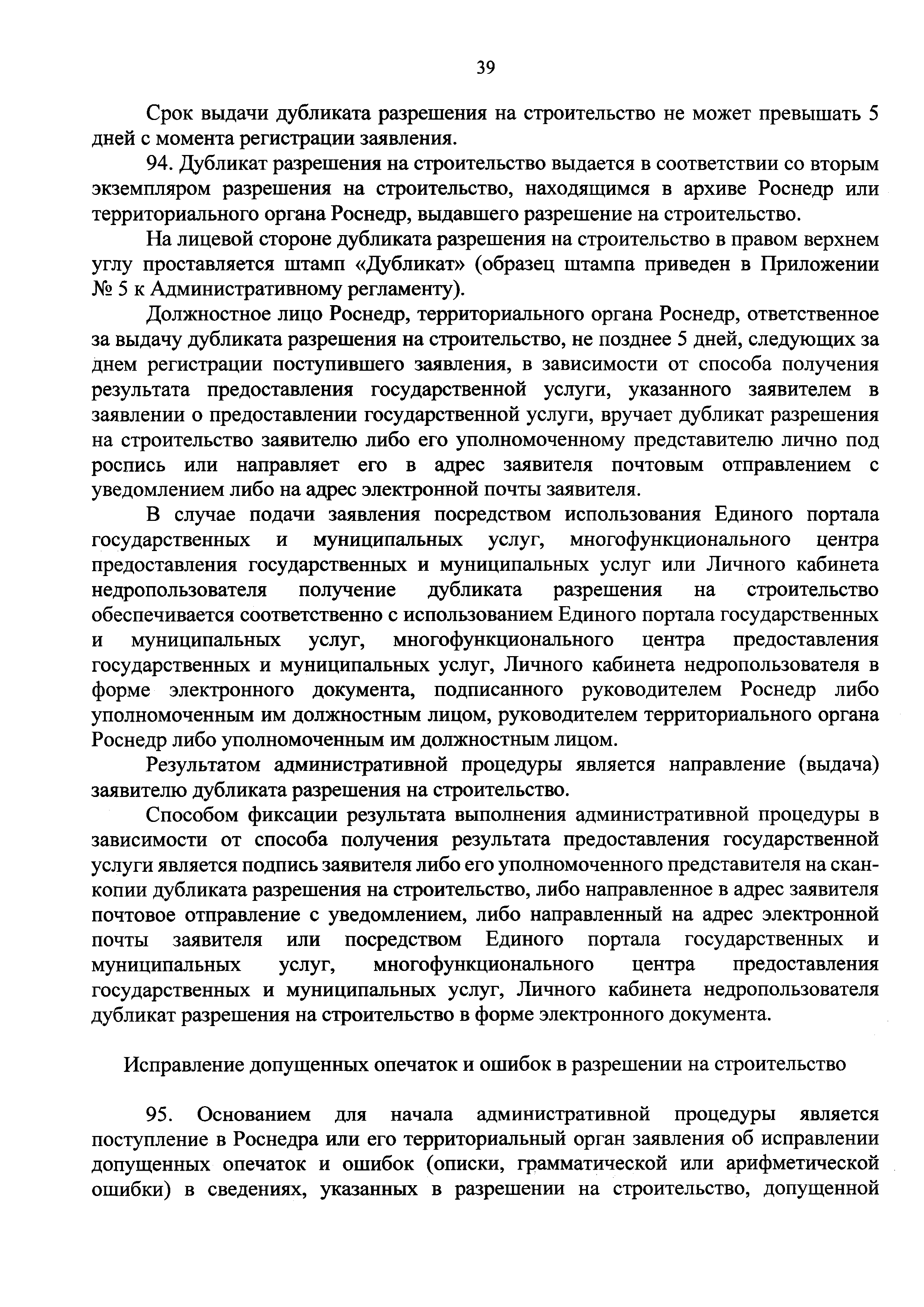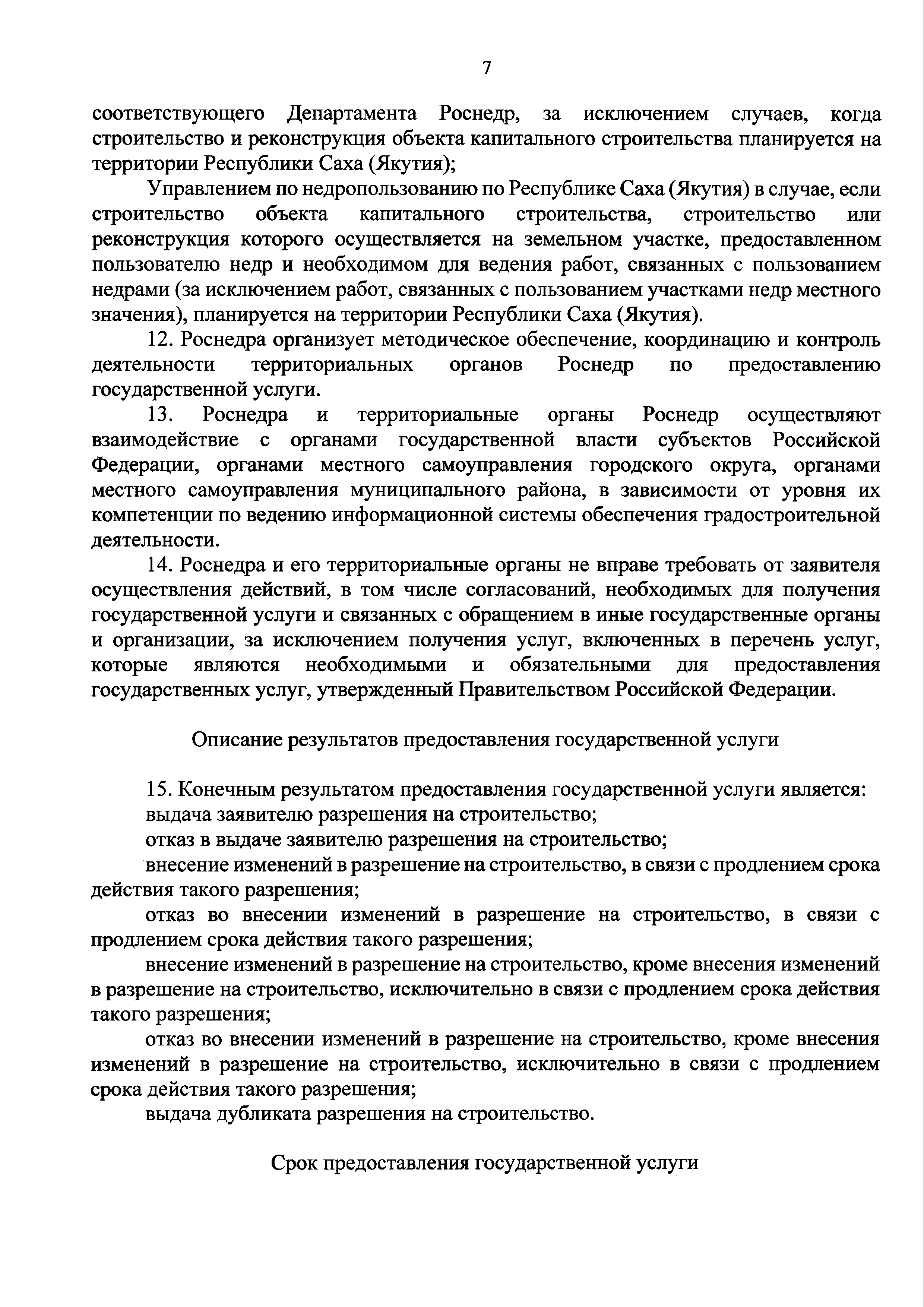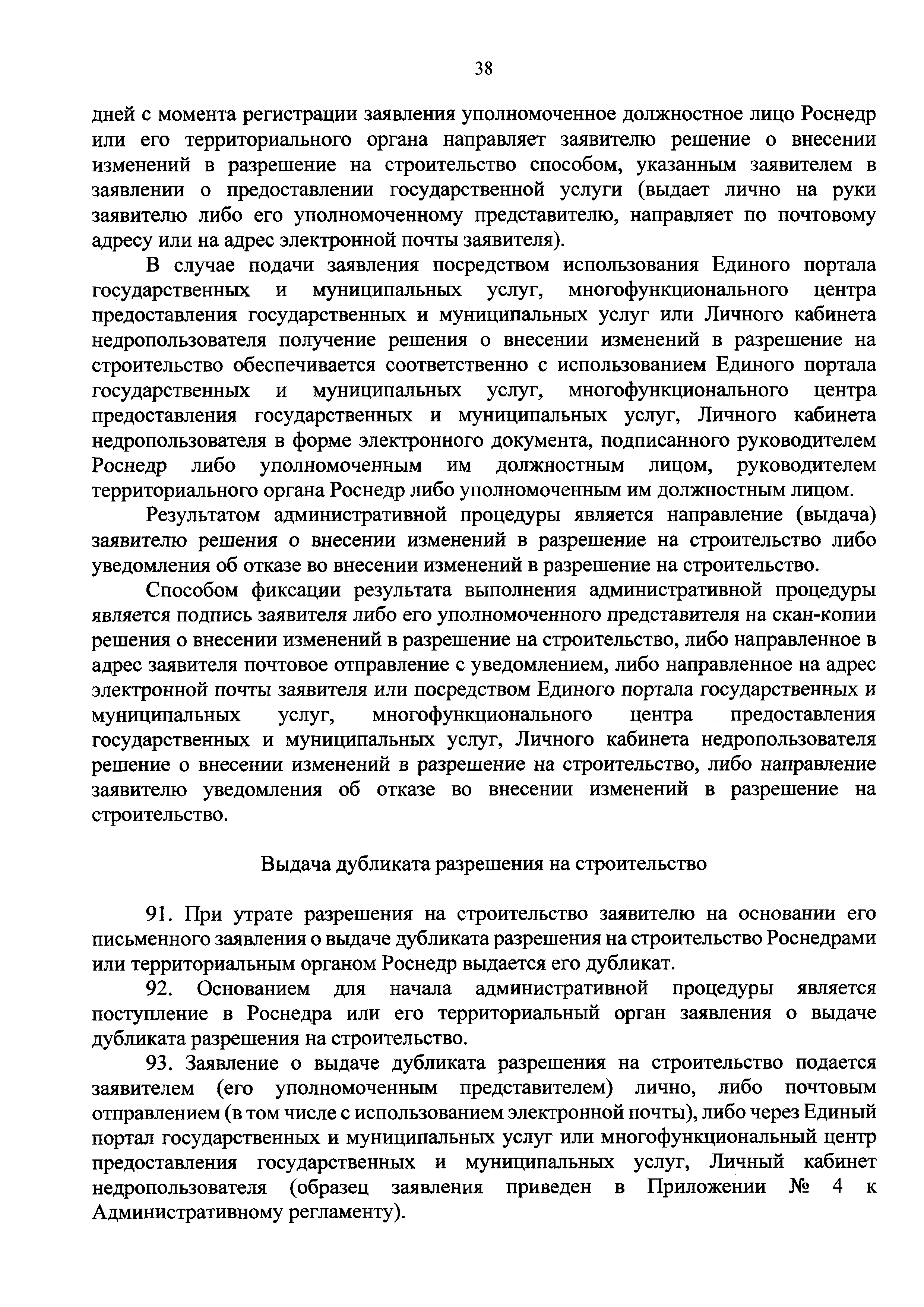 | Оглавление: | I. Общие положения II. Стандарт предоставления государственной услуги III. Состав, последовательность и сроки выполнения административных процедур (действий), требования к порядку их выполнения, в том числе особенности выполнения административных процедур (действий) в электронной форме IV. Формы контроля за предоставлением государственной услуги V. Досудебный (внесудебный) порядок обжалования решений и действий (бездействия) Роснедр и территориальных органов Роснедр, предоставляющих государственную услугу, а также их должностных лиц VI. Особенности выполнения административных процедур (действий) в многофункциональных центрах предоставления государственных и муниципальных услуг Приложение № 1. Образец заявления о выдаче разрешения на строительство объекта капитального строительства, строительство или реконструкция которого осуществляется на земельном участке, предоставленном пользователю недр и необходимом для ведения работ, связанных с пользованием недрами (за исключением работ, связанных с пользованием участками недр местного значения) Приложение № 2. Образец заявления о внесении изменений в разрешение на строительство объекта капитального строительства, строительство или реконструкция которого осуществляется на земельном участке, предоставленном пользователю недр и необходимом для ведения работ, связанных с пользованием недрами (за исключением работ, связанных с пользованием участками недр местного значения), в связи с изменением срока действия такого разрешения Приложение № 3. Образец заявления о выдаче разрешения на строительство объекта капитального строительства, строительство или реконструкция которого осуществляется на земельном участке, предоставленном пользователю недр и необходимом для ведения работ, связанных с пользованием недрами (за исключением работ, связанных с пользованием участками недр местного значения), кроме внесения изменений в разрешение на строительство исключительно в связи с продлением срока действия такого разрешения Приложение № 4. Образец заявления о выдаче дубликата разрешения на строительство объекта капитального строительства, строительство или реконструкция которого осуществляется на земельном участке, предоставленном пользователю недр и необходимом для ведения работ, связанных с пользованием недрами (за исключением работ, связанных с пользованием участками недр местного значения) Приложение № 5. Образец штампа дубликата разрешения на строительство Приложение № 6. Образец заявления об исправлении допущенных опечаток и ошибок в разрешении на строительство |