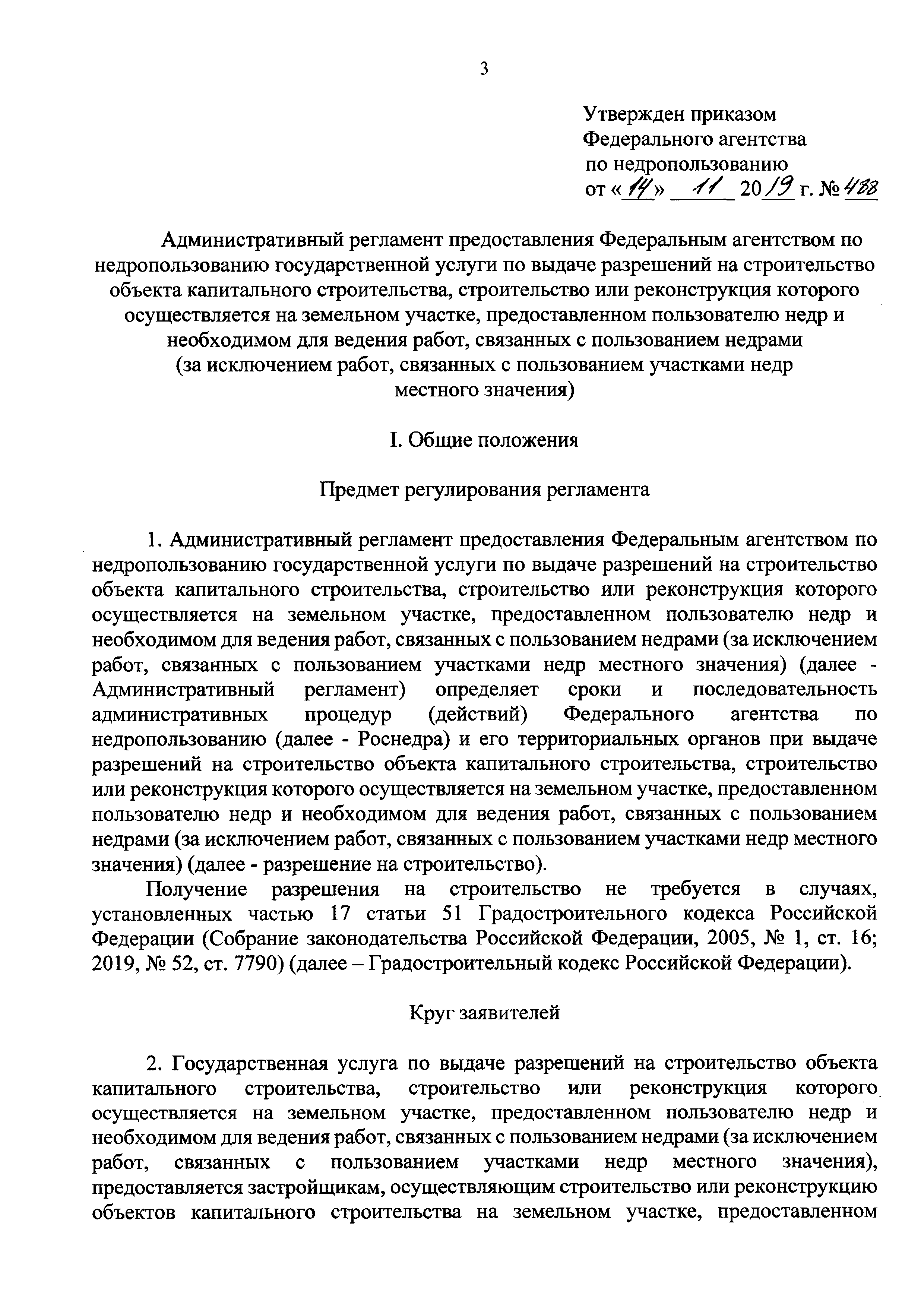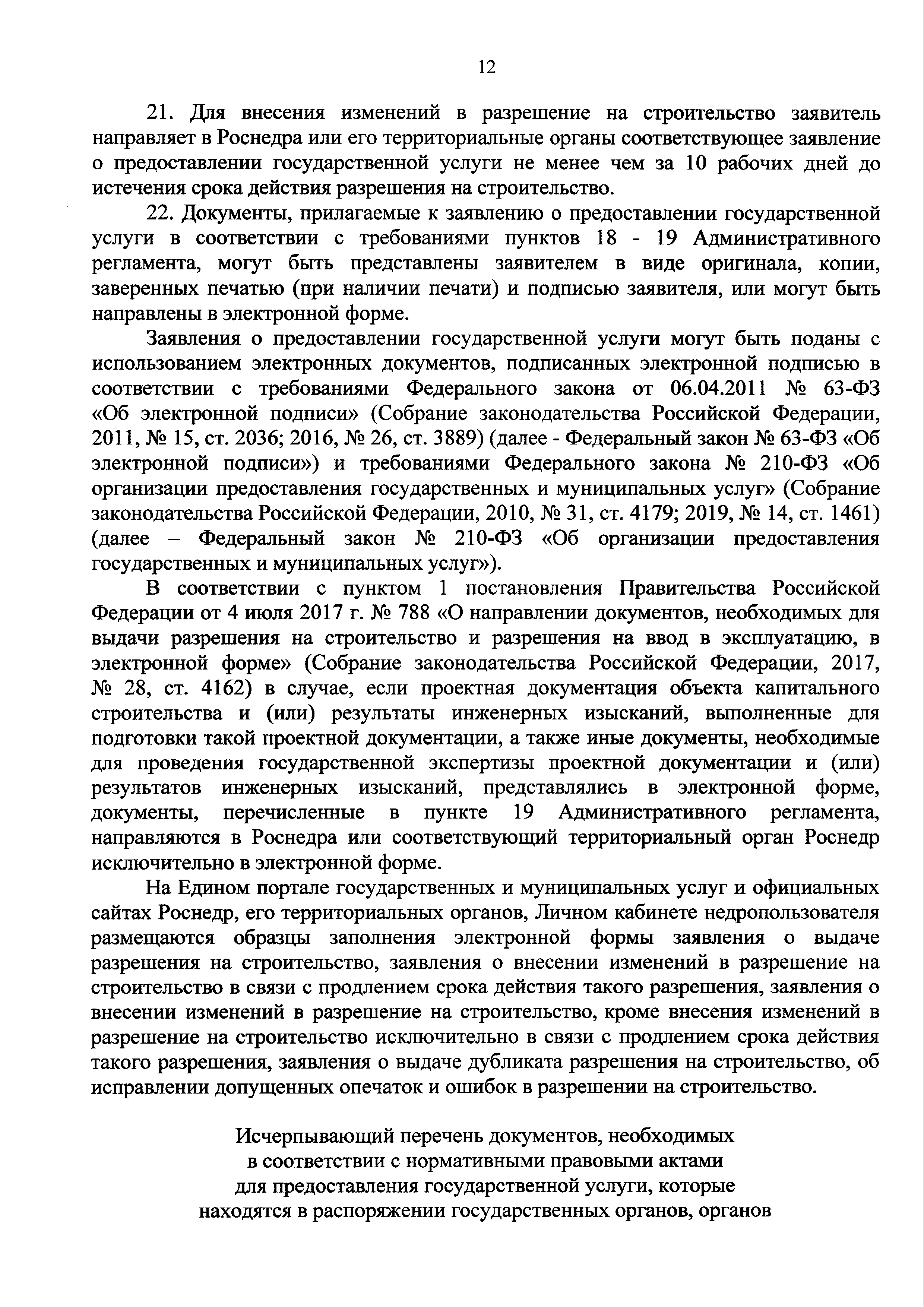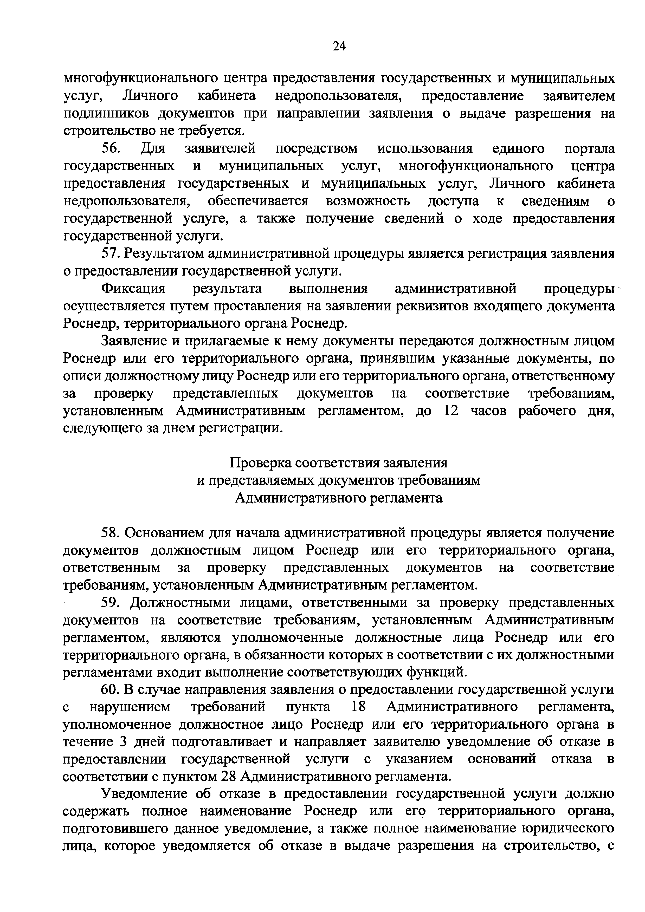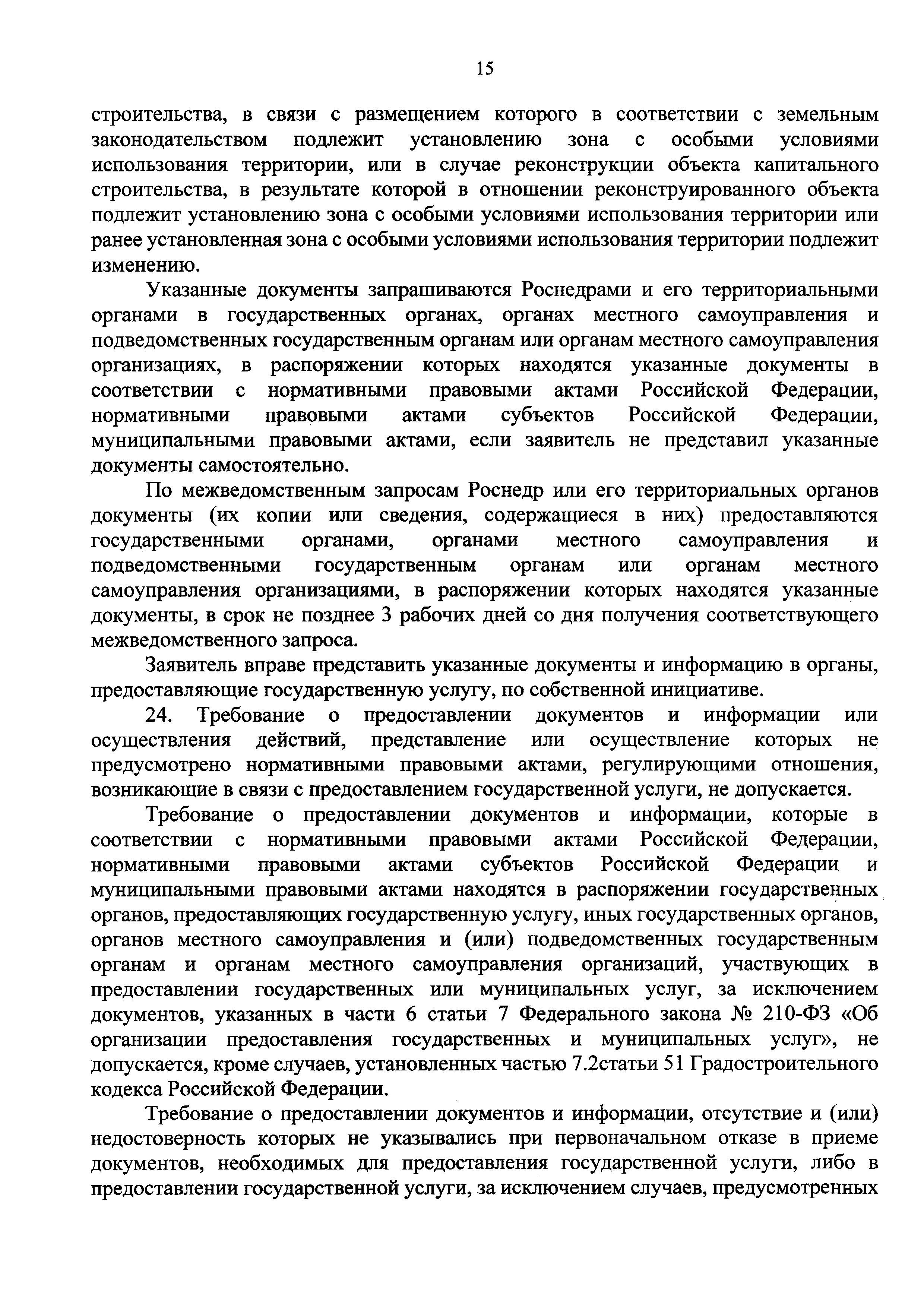 | Оглавление: | I. Общие положения II. Стандарт предоставления государственной услуги III. Состав, последовательность и сроки выполнения административных процедур (действий), требования к порядку их выполнения, в том числе особенности выполнения административных процедур (действий) в электронной форме IV. Формы контроля за предоставлением государственной услуги V. Досудебный (внесудебный) порядок обжалования решений и действий (бездействия) Роснедр и территориальных органов Роснедр, предоставляющих государственную услугу, а также их должностных лиц VI. Особенности выполнения административных процедур (действий) в многофункциональных центрах предоставления государственных и муниципальных услуг Приложение № 1. Образец заявления о выдаче разрешения на строительство объекта капитального строительства, строительство или реконструкция которого осуществляется на земельном участке, предоставленном пользователю недр и необходимом для ведения работ, связанных с пользованием недрами (за исключением работ, связанных с пользованием участками недр местного значения) Приложение № 2. Образец заявления о внесении изменений в разрешение на строительство объекта капитального строительства, строительство или реконструкция которого осуществляется на земельном участке, предоставленном пользователю недр и необходимом для ведения работ, связанных с пользованием недрами (за исключением работ, связанных с пользованием участками недр местного значения), в связи с изменением срока действия такого разрешения Приложение № 3. Образец заявления о выдаче разрешения на строительство объекта капитального строительства, строительство или реконструкция которого осуществляется на земельном участке, предоставленном пользователю недр и необходимом для ведения работ, связанных с пользованием недрами (за исключением работ, связанных с пользованием участками недр местного значения), кроме внесения изменений в разрешение на строительство исключительно в связи с продлением срока действия такого разрешения Приложение № 4. Образец заявления о выдаче дубликата разрешения на строительство объекта капитального строительства, строительство или реконструкция которого осуществляется на земельном участке, предоставленном пользователю недр и необходимом для ведения работ, связанных с пользованием недрами (за исключением работ, связанных с пользованием участками недр местного значения) Приложение № 5. Образец штампа дубликата разрешения на строительство Приложение № 6. Образец заявления об исправлении допущенных опечаток и ошибок в разрешении на строительство |