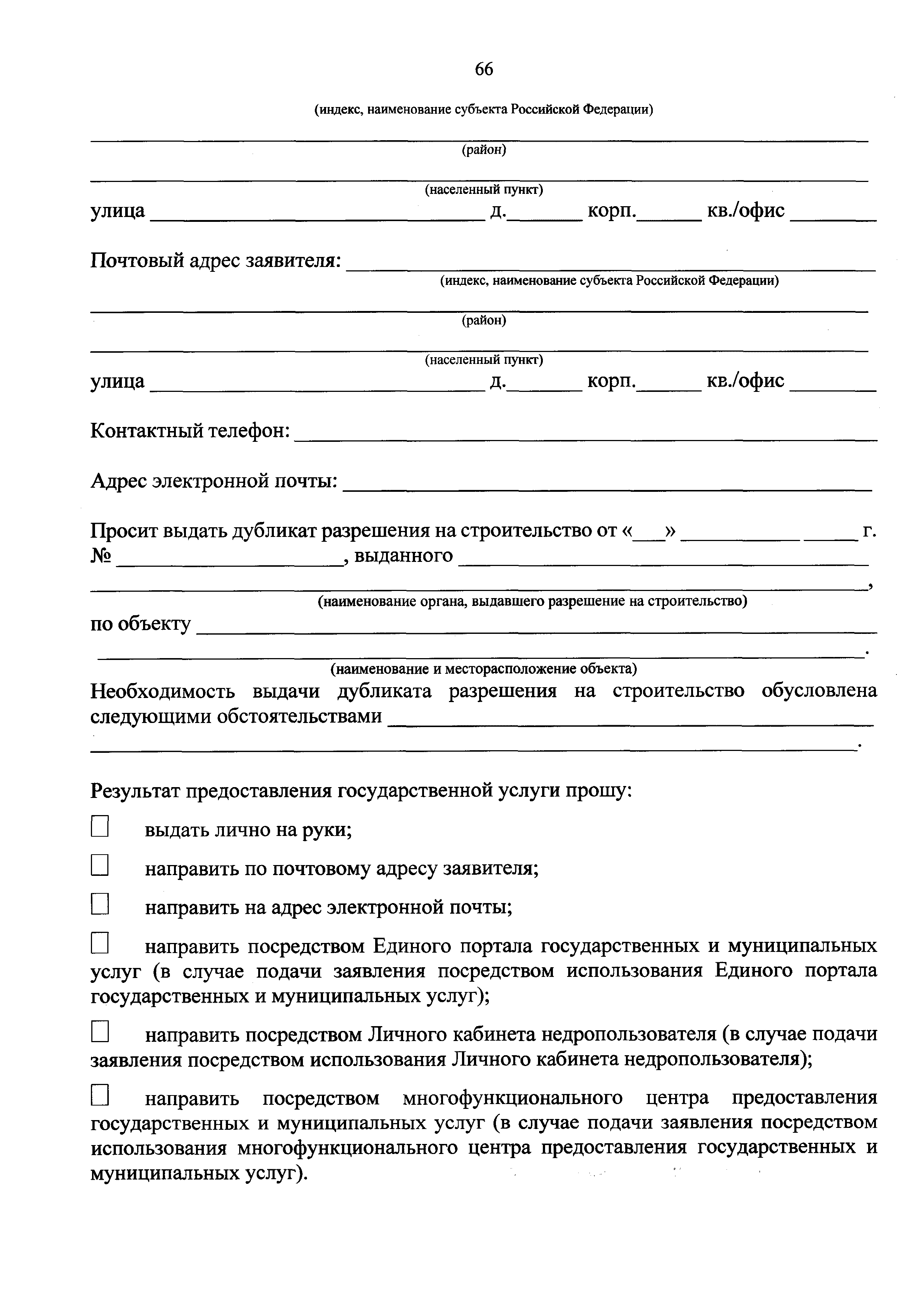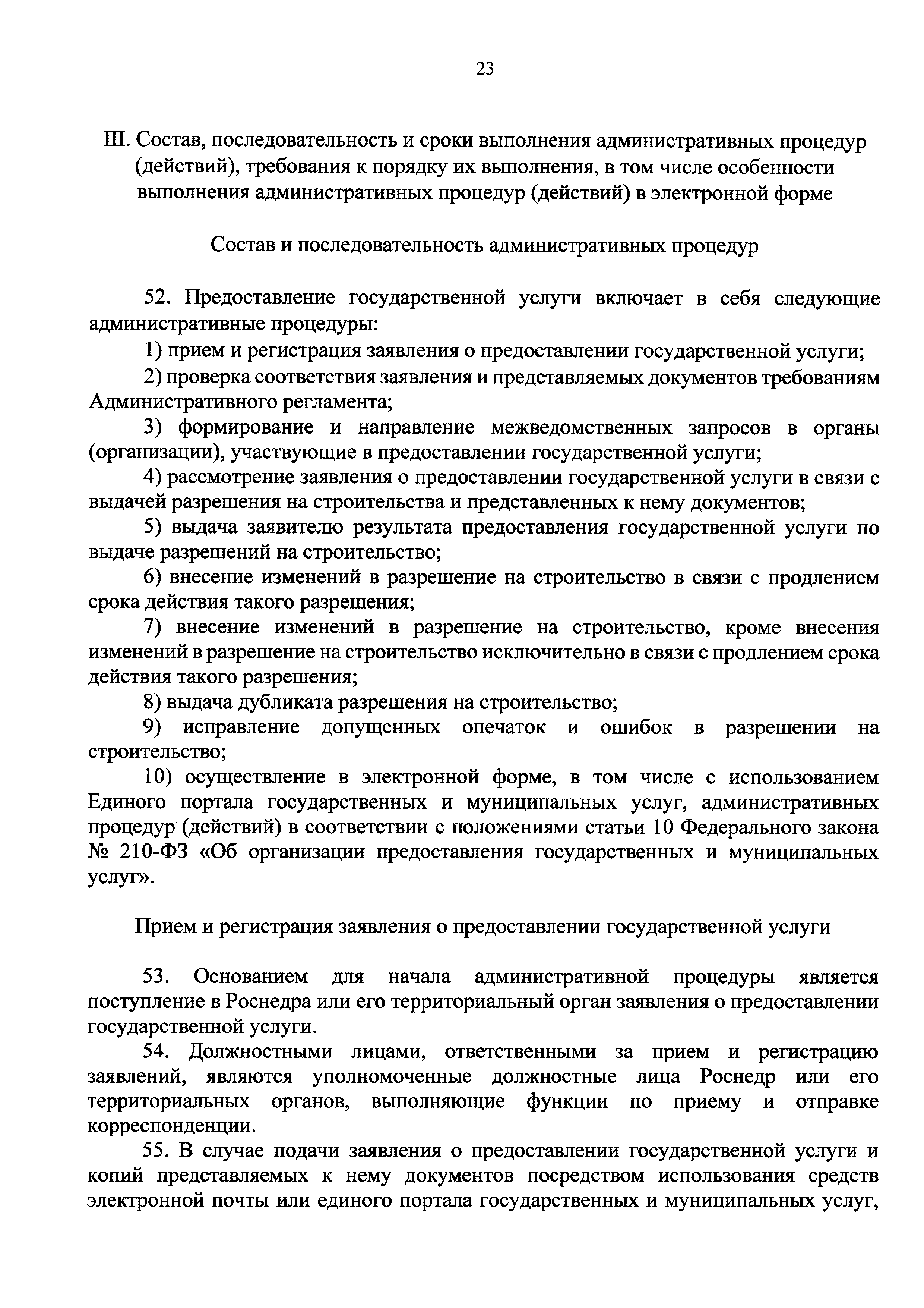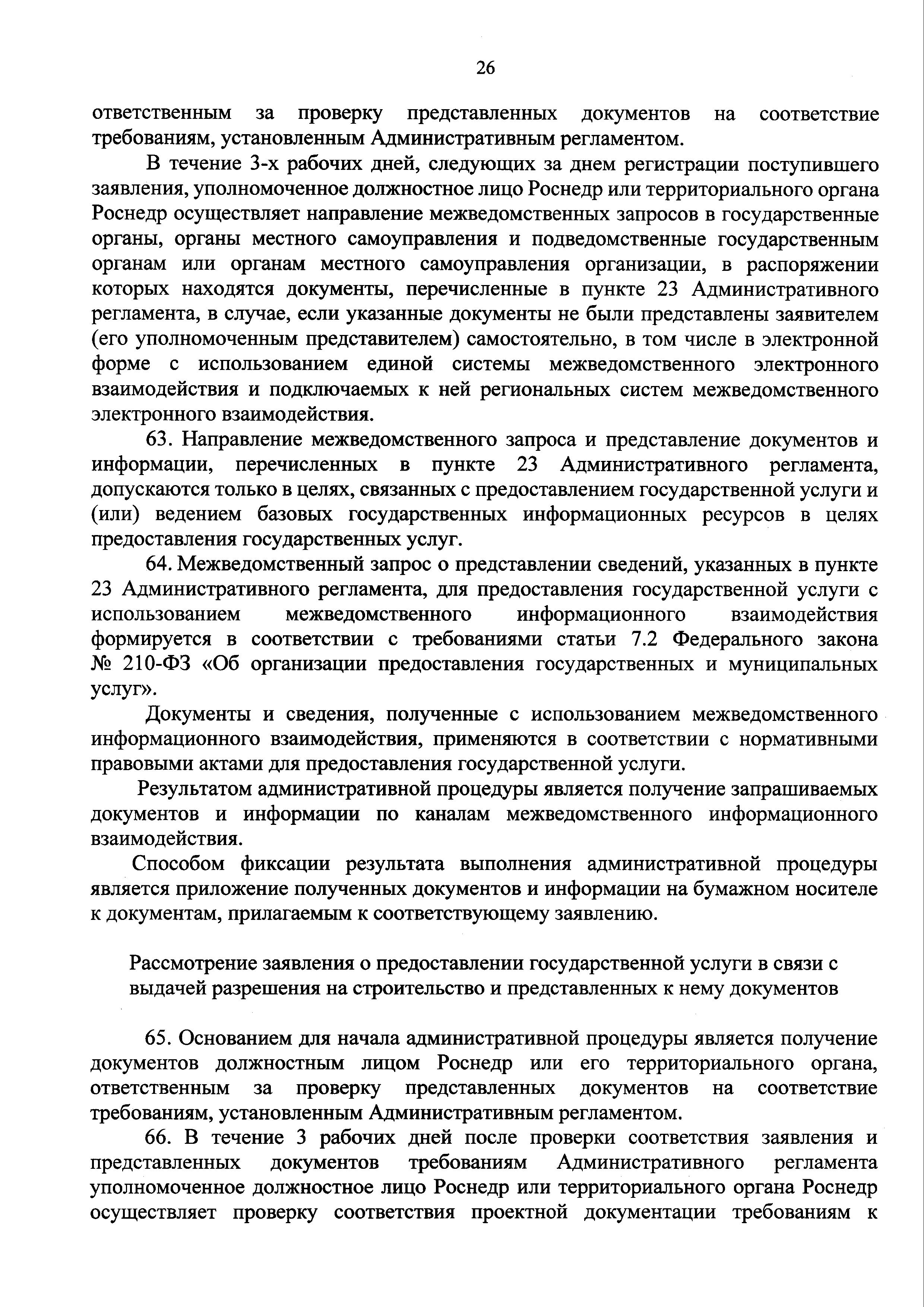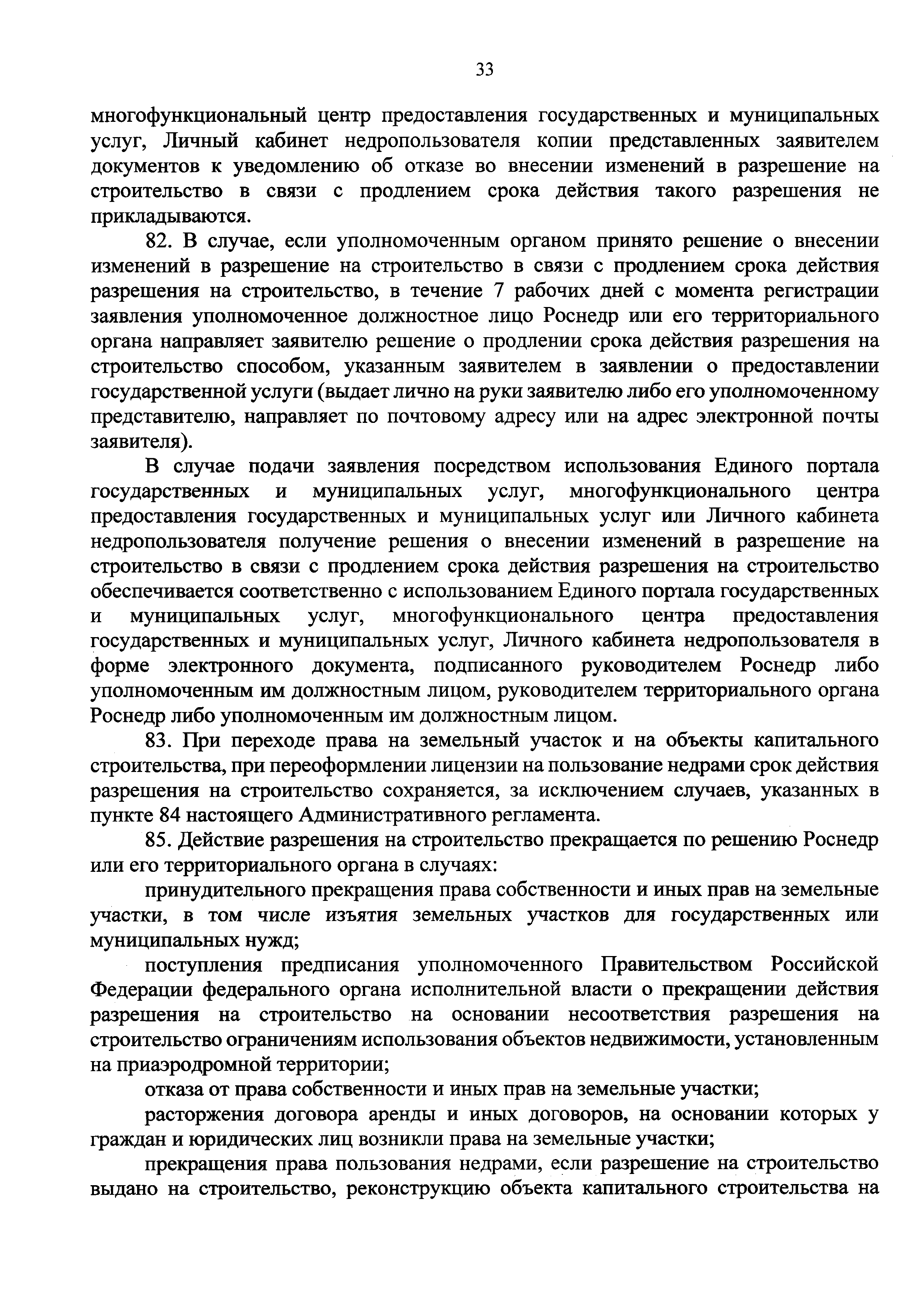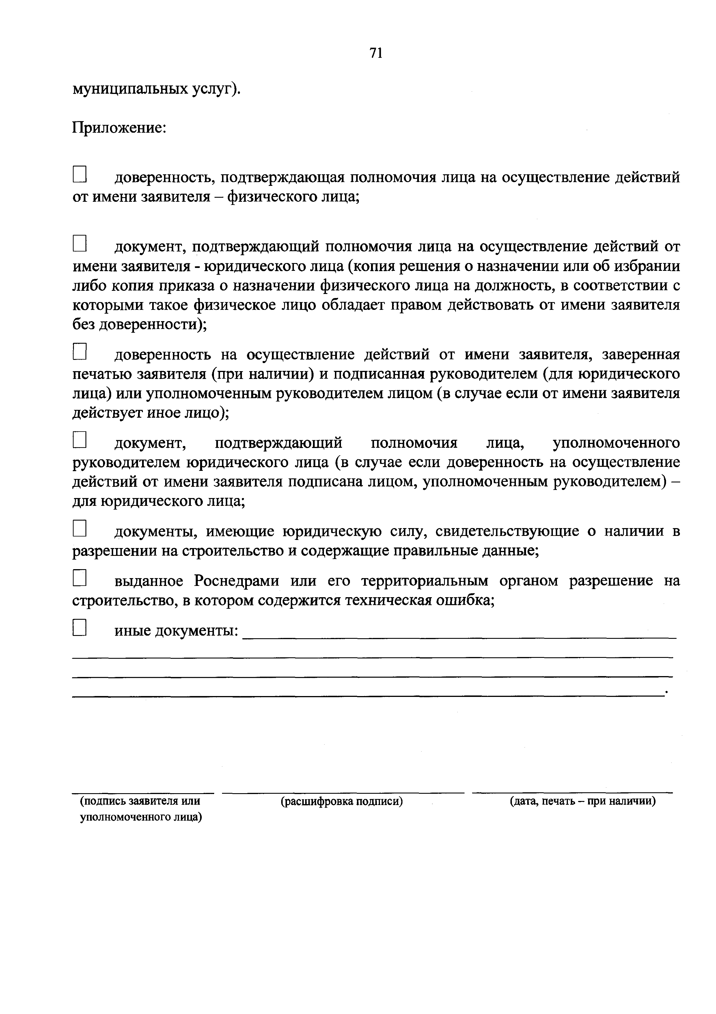 | Оглавление: | I. Общие положения II. Стандарт предоставления государственной услуги III. Состав, последовательность и сроки выполнения административных процедур (действий), требования к порядку их выполнения, в том числе особенности выполнения административных процедур (действий) в электронной форме IV. Формы контроля за предоставлением государственной услуги V. Досудебный (внесудебный) порядок обжалования решений и действий (бездействия) Роснедр и территориальных органов Роснедр, предоставляющих государственную услугу, а также их должностных лиц VI. Особенности выполнения административных процедур (действий) в многофункциональных центрах предоставления государственных и муниципальных услуг Приложение № 1. Образец заявления о выдаче разрешения на строительство объекта капитального строительства, строительство или реконструкция которого осуществляется на земельном участке, предоставленном пользователю недр и необходимом для ведения работ, связанных с пользованием недрами (за исключением работ, связанных с пользованием участками недр местного значения) Приложение № 2. Образец заявления о внесении изменений в разрешение на строительство объекта капитального строительства, строительство или реконструкция которого осуществляется на земельном участке, предоставленном пользователю недр и необходимом для ведения работ, связанных с пользованием недрами (за исключением работ, связанных с пользованием участками недр местного значения), в связи с изменением срока действия такого разрешения Приложение № 3. Образец заявления о выдаче разрешения на строительство объекта капитального строительства, строительство или реконструкция которого осуществляется на земельном участке, предоставленном пользователю недр и необходимом для ведения работ, связанных с пользованием недрами (за исключением работ, связанных с пользованием участками недр местного значения), кроме внесения изменений в разрешение на строительство исключительно в связи с продлением срока действия такого разрешения Приложение № 4. Образец заявления о выдаче дубликата разрешения на строительство объекта капитального строительства, строительство или реконструкция которого осуществляется на земельном участке, предоставленном пользователю недр и необходимом для ведения работ, связанных с пользованием недрами (за исключением работ, связанных с пользованием участками недр местного значения) Приложение № 5. Образец штампа дубликата разрешения на строительство Приложение № 6. Образец заявления об исправлении допущенных опечаток и ошибок в разрешении на строительство |