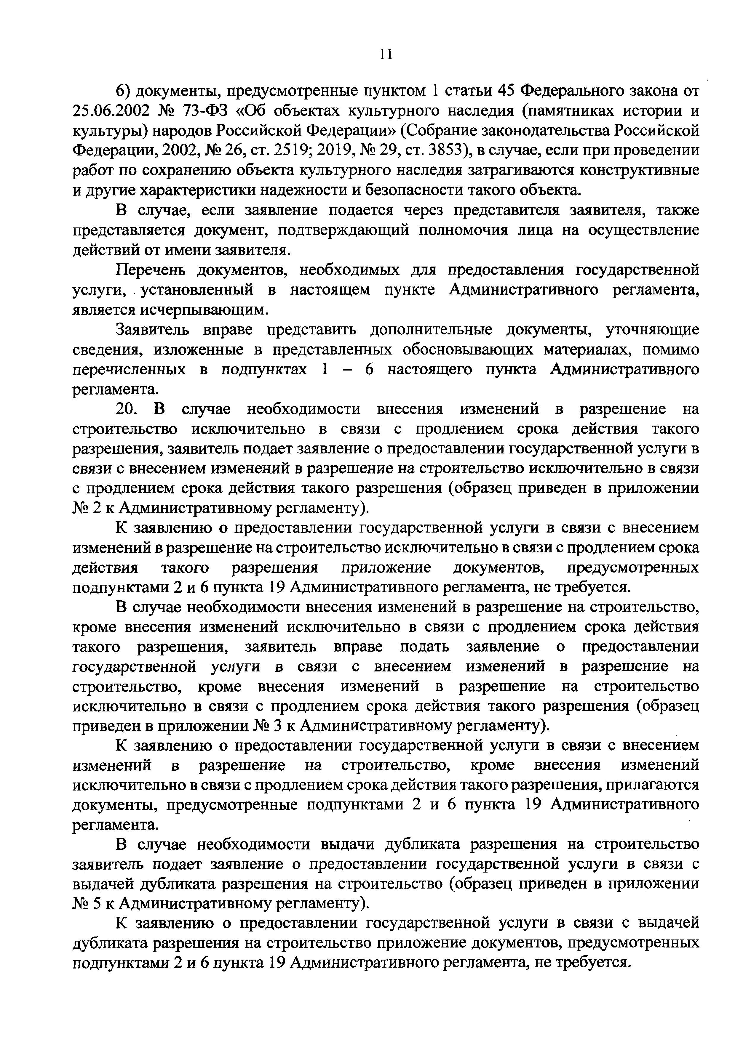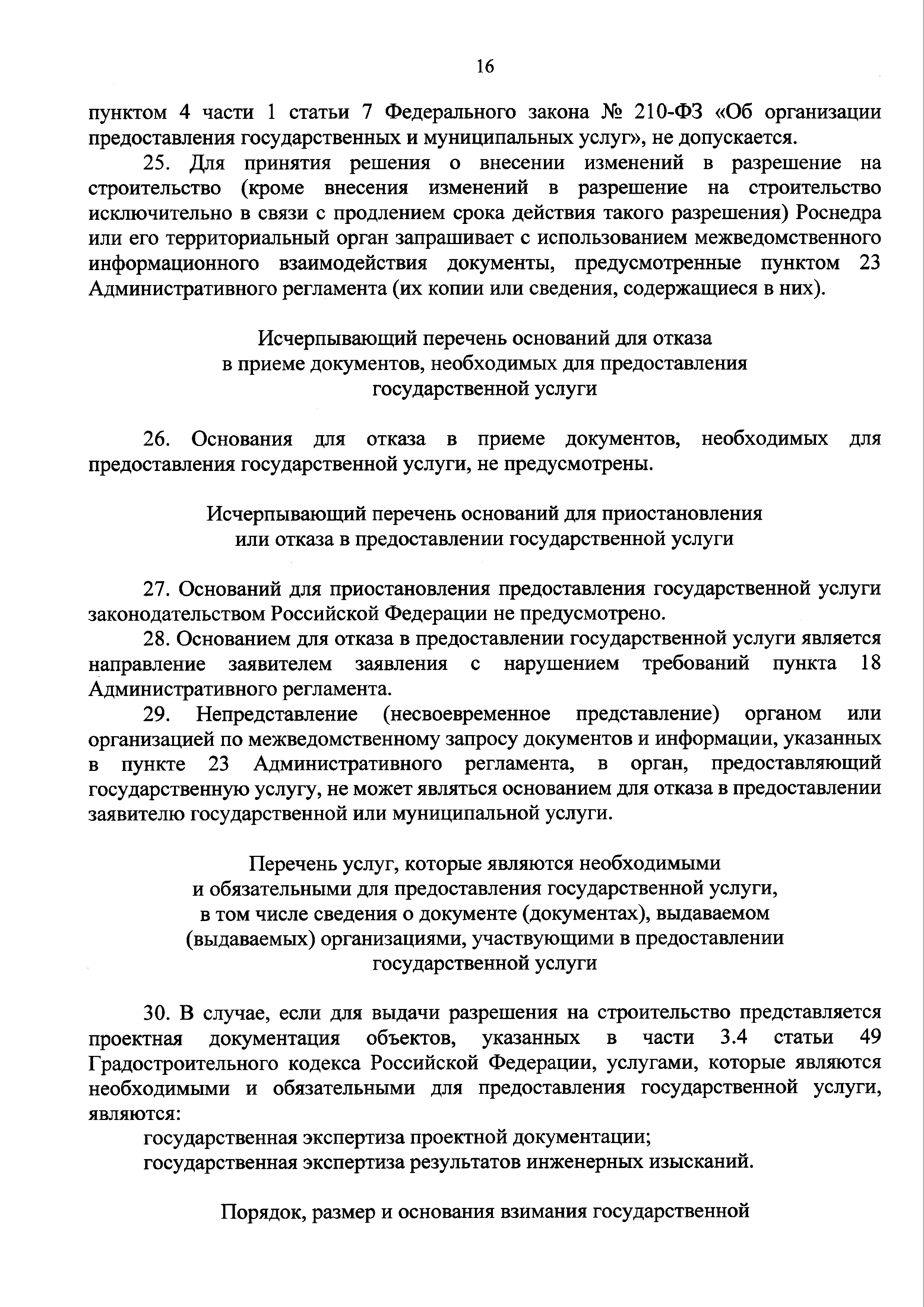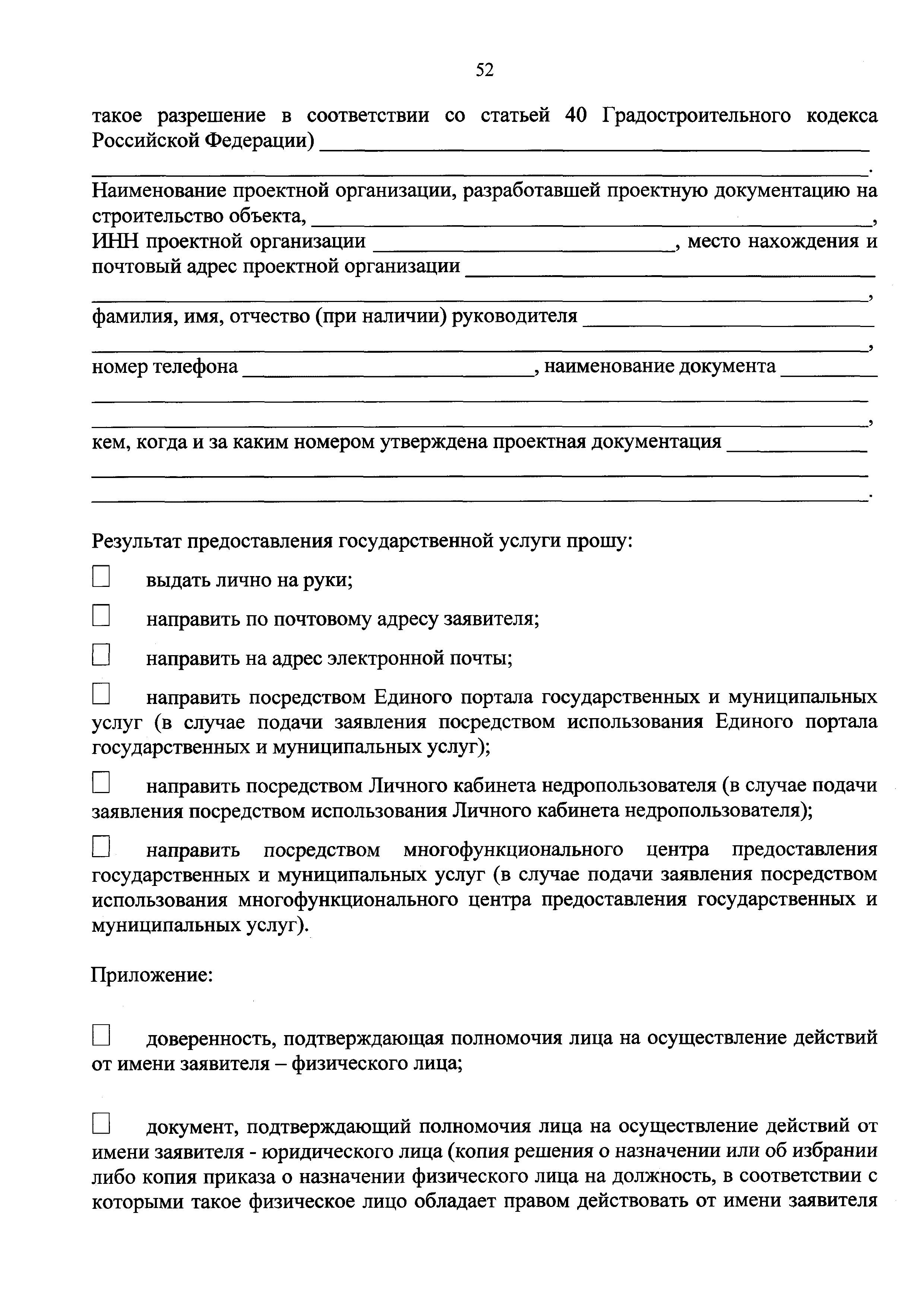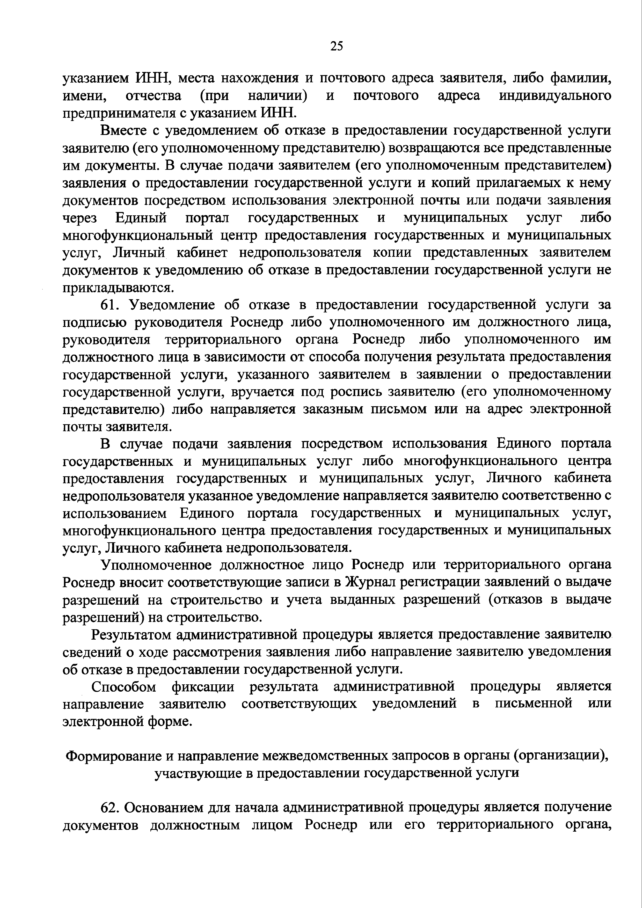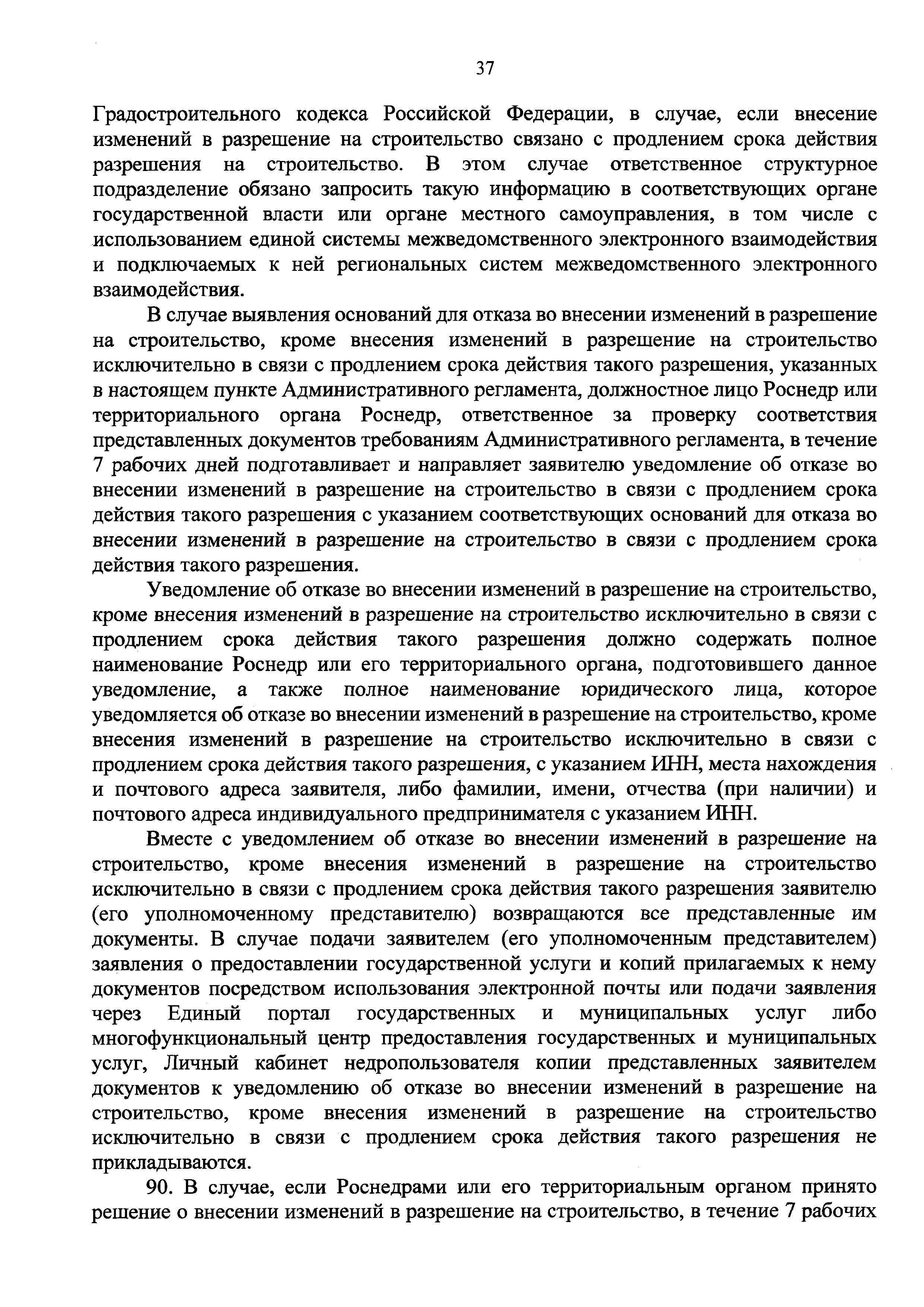| Оглавление: | I. Общие положения II. Стандарт предоставления государственной услуги III. Состав, последовательность и сроки выполнения административных процедур (действий), требования к порядку их выполнения, в том числе особенности выполнения административных процедур (действий) в электронной форме IV. Формы контроля за предоставлением государственной услуги V. Досудебный (внесудебный) порядок обжалования решений и действий (бездействия) Роснедр и территориальных органов Роснедр, предоставляющих государственную услугу, а также их должностных лиц VI. Особенности выполнения административных процедур (действий) в многофункциональных центрах предоставления государственных и муниципальных услуг Приложение № 1. Образец заявления о выдаче разрешения на строительство объекта капитального строительства, строительство или реконструкция которого осуществляется на земельном участке, предоставленном пользователю недр и необходимом для ведения работ, связанных с пользованием недрами (за исключением работ, связанных с пользованием участками недр местного значения) Приложение № 2. Образец заявления о внесении изменений в разрешение на строительство объекта капитального строительства, строительство или реконструкция которого осуществляется на земельном участке, предоставленном пользователю недр и необходимом для ведения работ, связанных с пользованием недрами (за исключением работ, связанных с пользованием участками недр местного значения), в связи с изменением срока действия такого разрешения Приложение № 3. Образец заявления о выдаче разрешения на строительство объекта капитального строительства, строительство или реконструкция которого осуществляется на земельном участке, предоставленном пользователю недр и необходимом для ведения работ, связанных с пользованием недрами (за исключением работ, связанных с пользованием участками недр местного значения), кроме внесения изменений в разрешение на строительство исключительно в связи с продлением срока действия такого разрешения Приложение № 4. Образец заявления о выдаче дубликата разрешения на строительство объекта капитального строительства, строительство или реконструкция которого осуществляется на земельном участке, предоставленном пользователю недр и необходимом для ведения работ, связанных с пользованием недрами (за исключением работ, связанных с пользованием участками недр местного значения) Приложение № 5. Образец штампа дубликата разрешения на строительство Приложение № 6. Образец заявления об исправлении допущенных опечаток и ошибок в разрешении на строительство |
