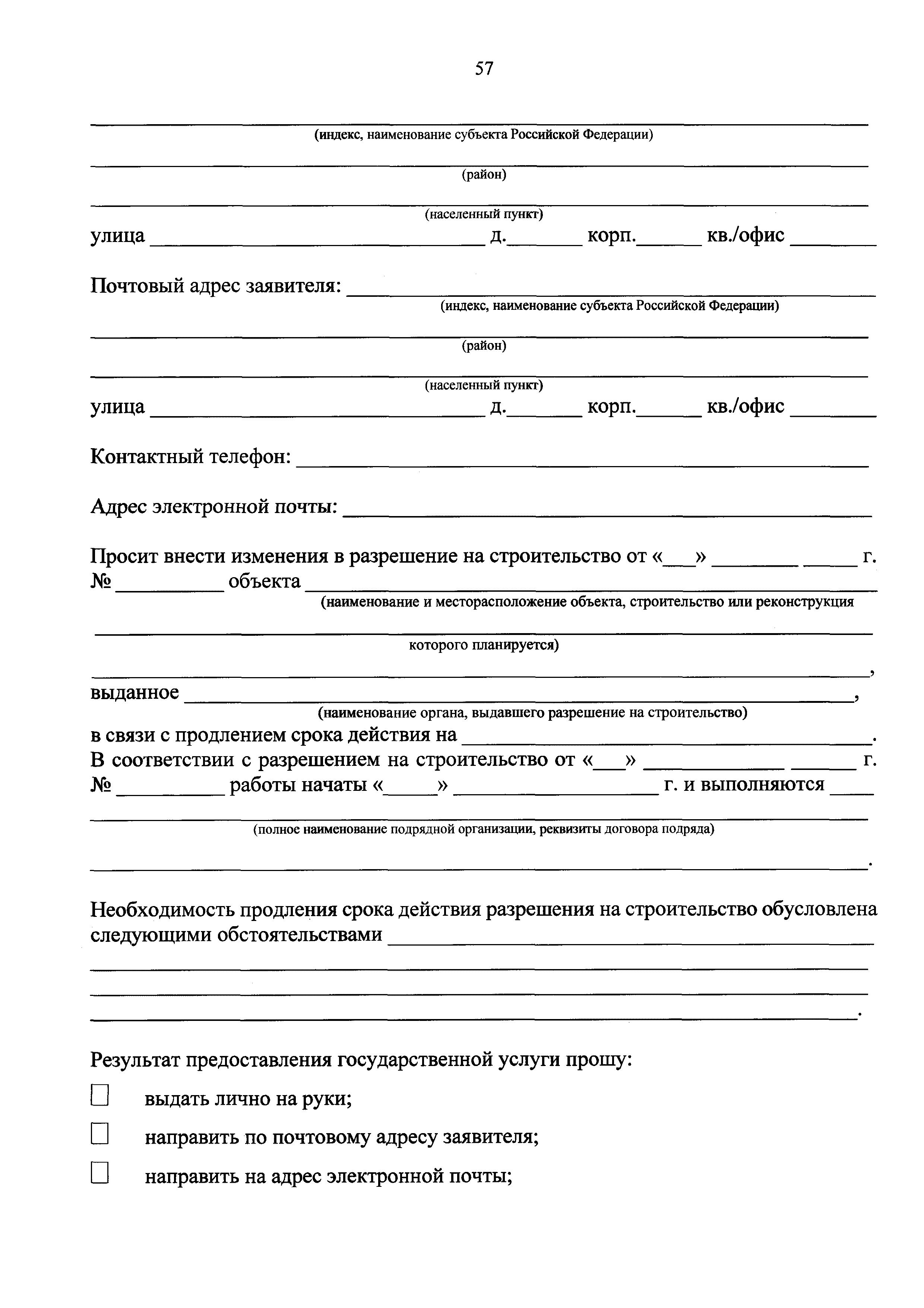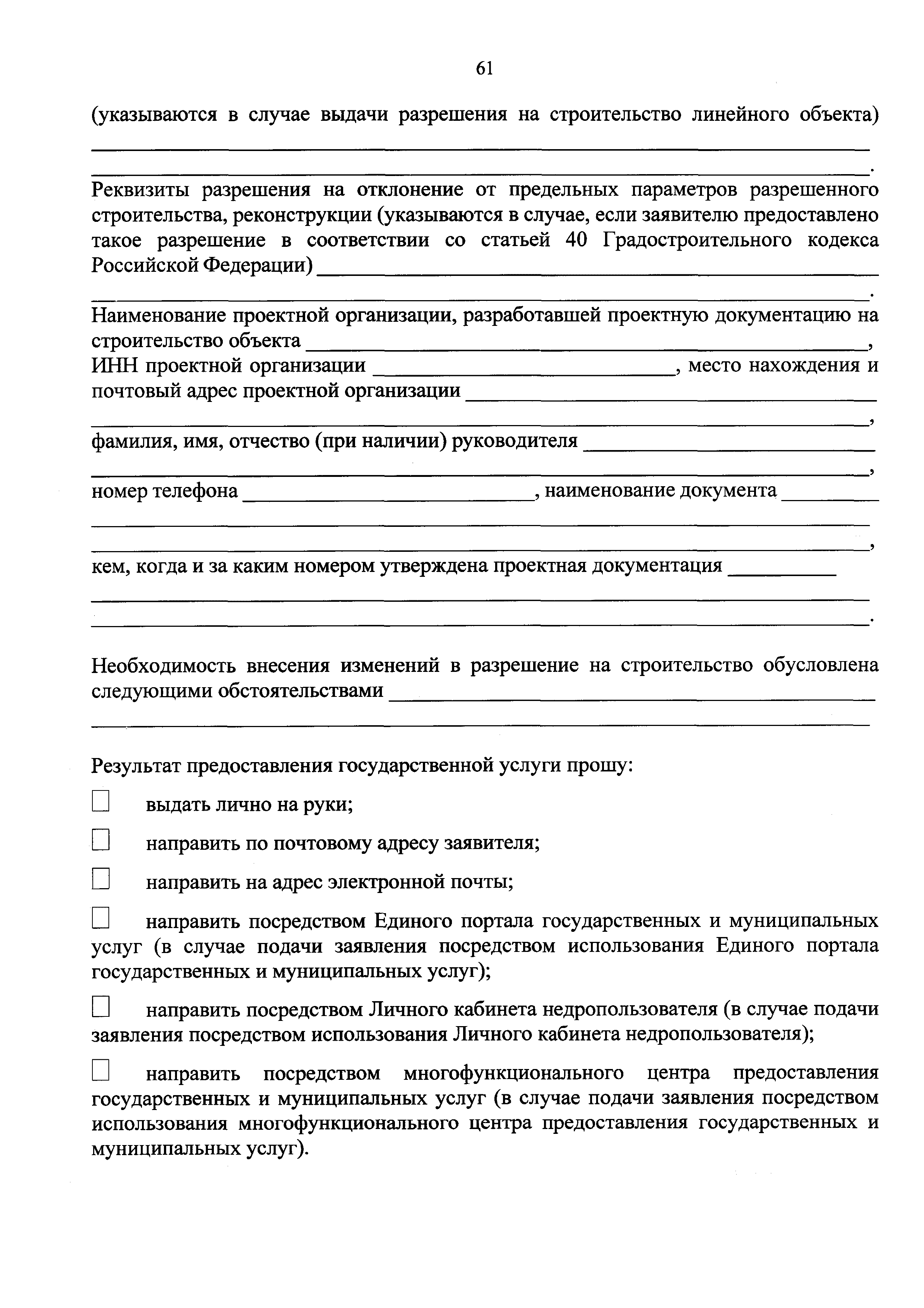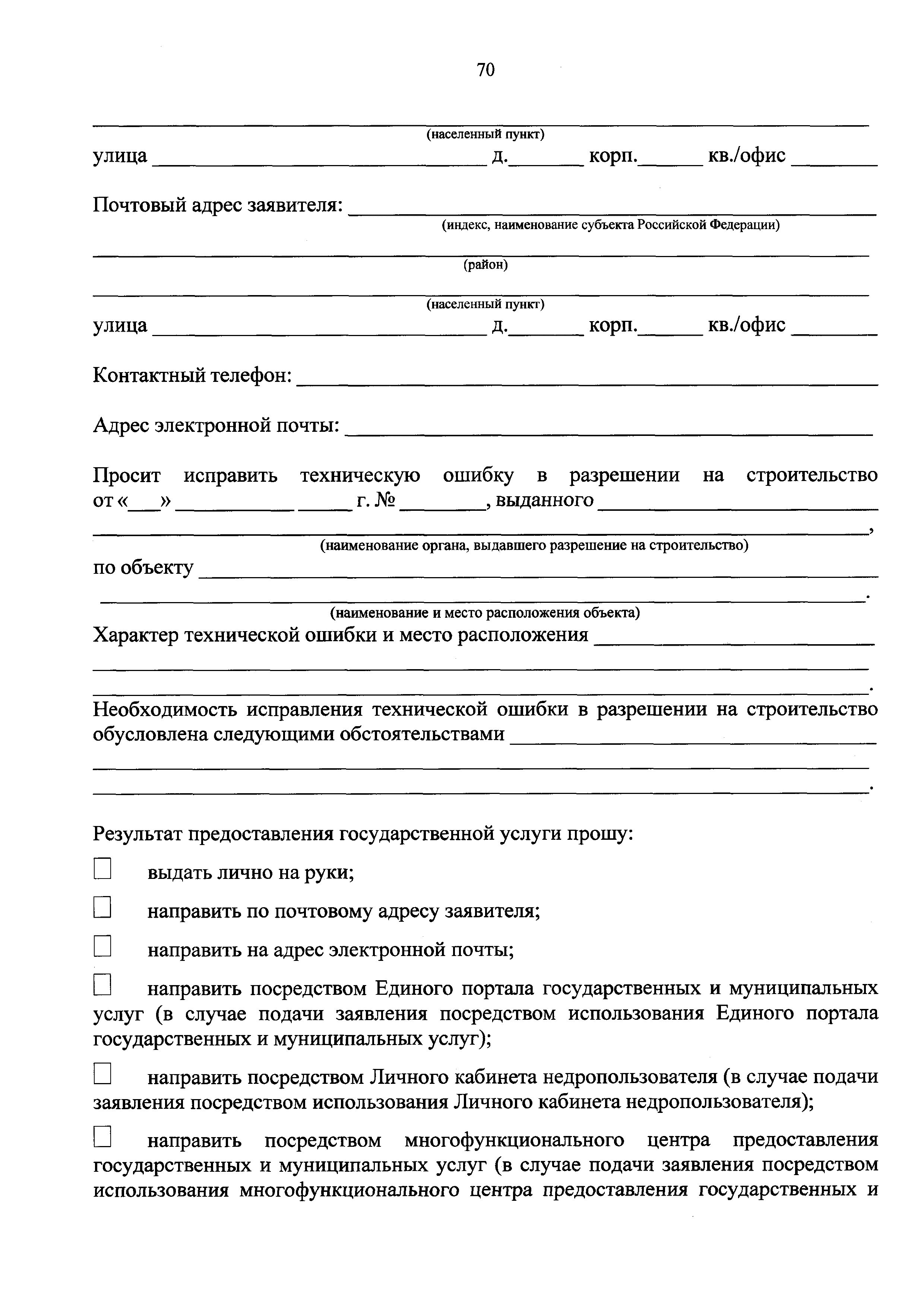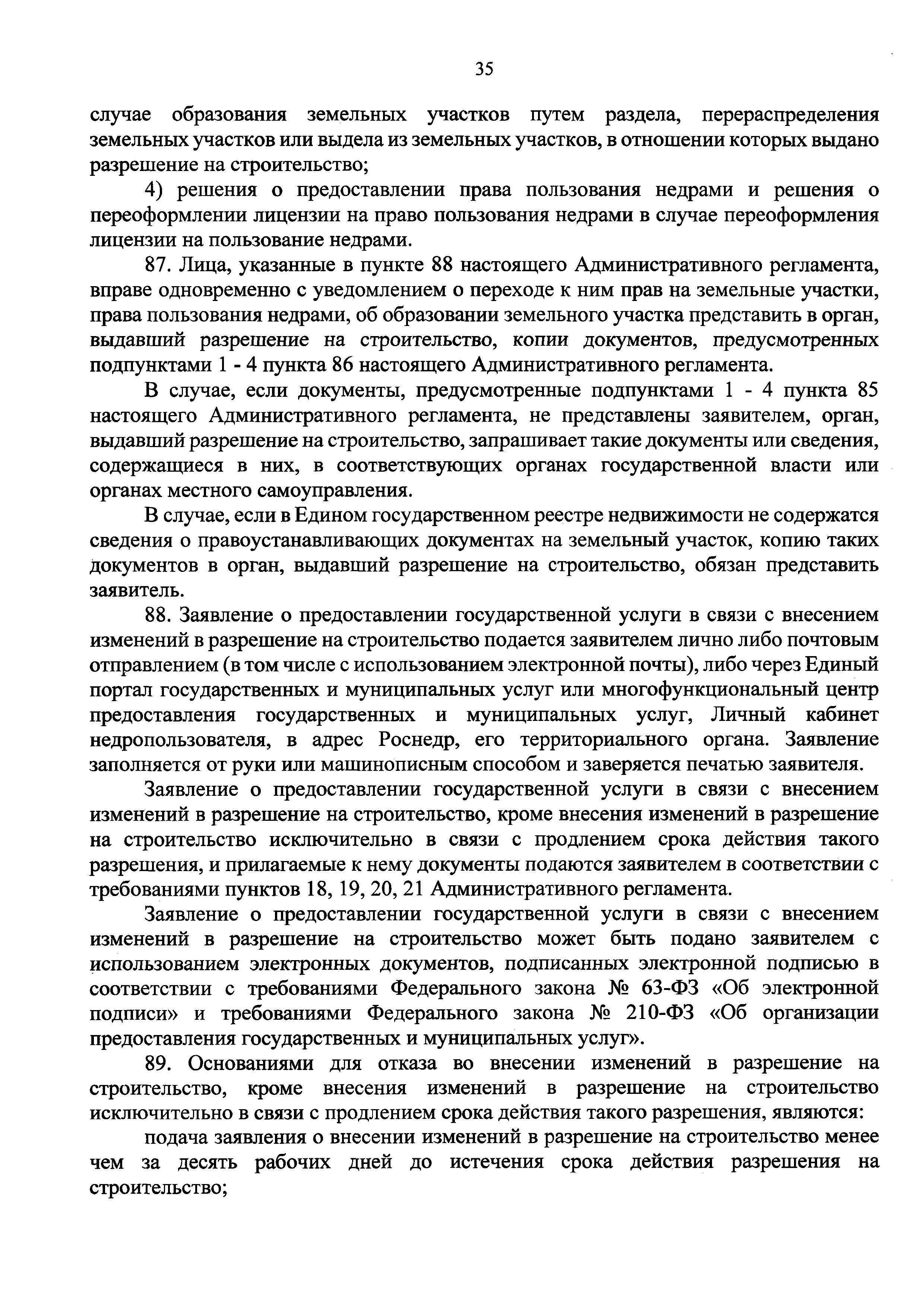 | Оглавление: | I. Общие положения II. Стандарт предоставления государственной услуги III. Состав, последовательность и сроки выполнения административных процедур (действий), требования к порядку их выполнения, в том числе особенности выполнения административных процедур (действий) в электронной форме IV. Формы контроля за предоставлением государственной услуги V. Досудебный (внесудебный) порядок обжалования решений и действий (бездействия) Роснедр и территориальных органов Роснедр, предоставляющих государственную услугу, а также их должностных лиц VI. Особенности выполнения административных процедур (действий) в многофункциональных центрах предоставления государственных и муниципальных услуг Приложение № 1. Образец заявления о выдаче разрешения на строительство объекта капитального строительства, строительство или реконструкция которого осуществляется на земельном участке, предоставленном пользователю недр и необходимом для ведения работ, связанных с пользованием недрами (за исключением работ, связанных с пользованием участками недр местного значения) Приложение № 2. Образец заявления о внесении изменений в разрешение на строительство объекта капитального строительства, строительство или реконструкция которого осуществляется на земельном участке, предоставленном пользователю недр и необходимом для ведения работ, связанных с пользованием недрами (за исключением работ, связанных с пользованием участками недр местного значения), в связи с изменением срока действия такого разрешения Приложение № 3. Образец заявления о выдаче разрешения на строительство объекта капитального строительства, строительство или реконструкция которого осуществляется на земельном участке, предоставленном пользователю недр и необходимом для ведения работ, связанных с пользованием недрами (за исключением работ, связанных с пользованием участками недр местного значения), кроме внесения изменений в разрешение на строительство исключительно в связи с продлением срока действия такого разрешения Приложение № 4. Образец заявления о выдаче дубликата разрешения на строительство объекта капитального строительства, строительство или реконструкция которого осуществляется на земельном участке, предоставленном пользователю недр и необходимом для ведения работ, связанных с пользованием недрами (за исключением работ, связанных с пользованием участками недр местного значения) Приложение № 5. Образец штампа дубликата разрешения на строительство Приложение № 6. Образец заявления об исправлении допущенных опечаток и ошибок в разрешении на строительство |