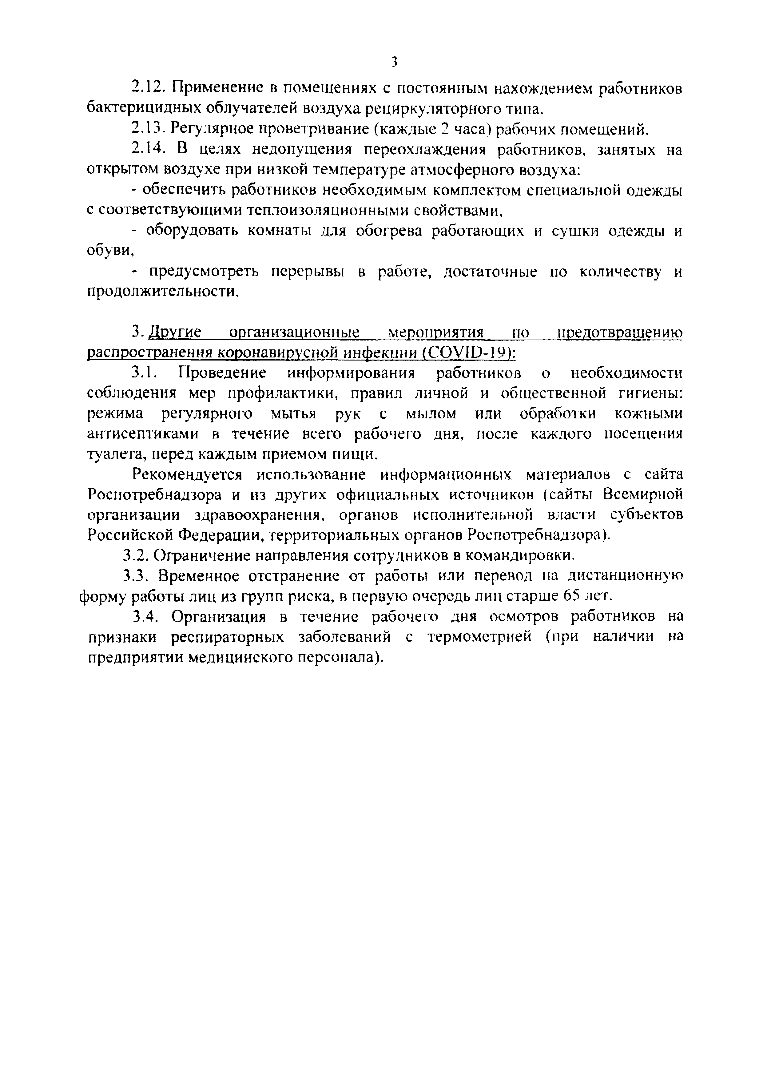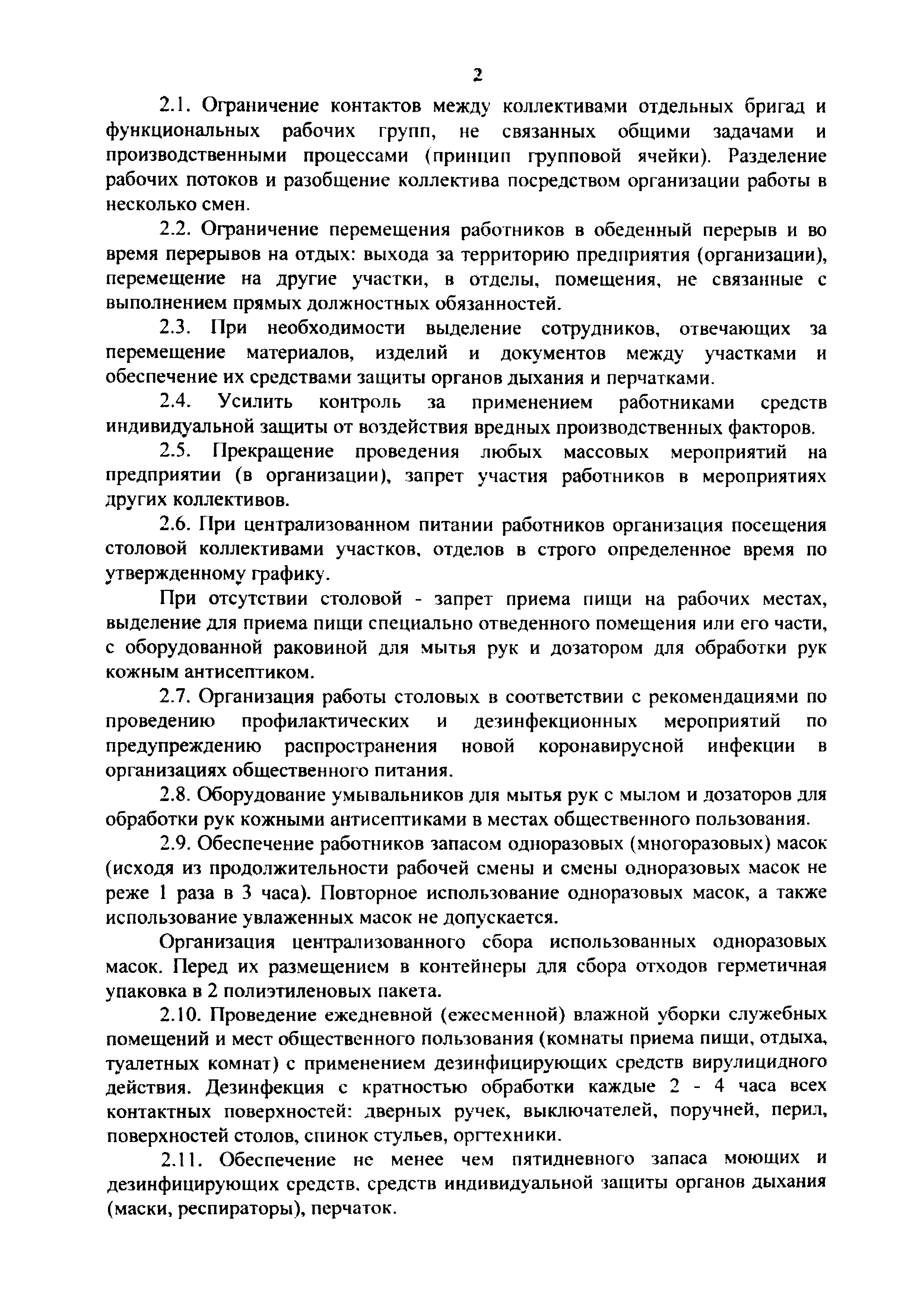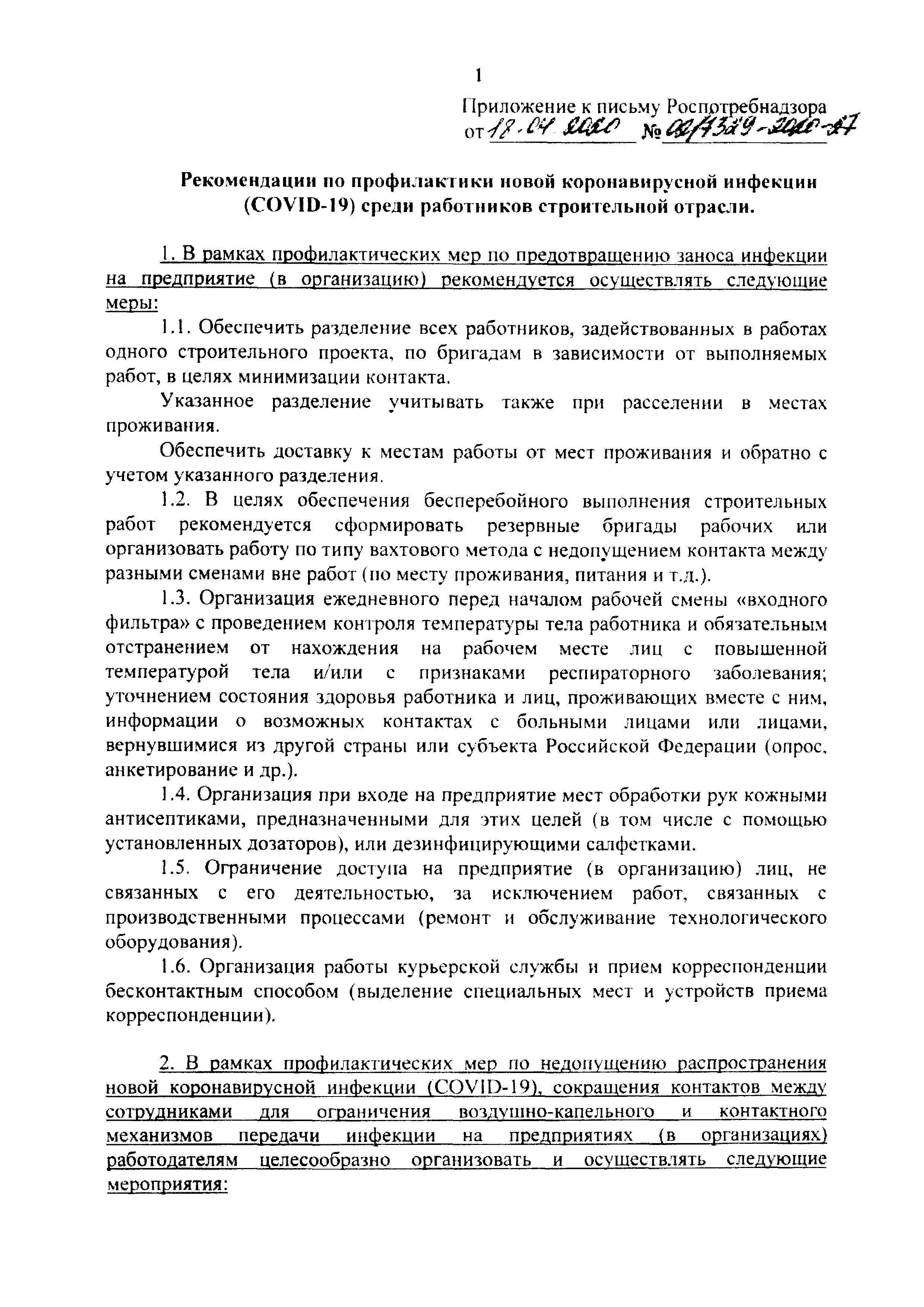 Рекомендации по профилактике новой коронавирусной инфекции (COVID-19) среди работников строительной отрасли| Статус: | действует | | Название рус.: | Рекомендации по профилактике новой коронавирусной инфекции (COVID-19) среди работников строительной отрасли | | Дата добавления в базу: | 01.01.2021 | | Дата актуализации: | 01.01.2021 | | Оглавление: | 1 В рамках профилактических мер по предотвращению заноса инфекции на предприятие (в организацию) рекомендуется осуществлять следующие меры 2 В рамках профилактических мер по недопущению распространения новой коронавирусной инфекции (COVID-19), сокращения контактов между сотрудниками для ограничения воздушно-капельного и контактного механизмов передачи инфекции на предприятиях (в организациях) работодателям целесообразно организовать и осуществлять следующие мероприятия: 3 Другие организационные мероприятия по предотвращению распространения коронавирусной инфекцяп (COVID-19) | | Издан: | С сайта: (2020 г. )
