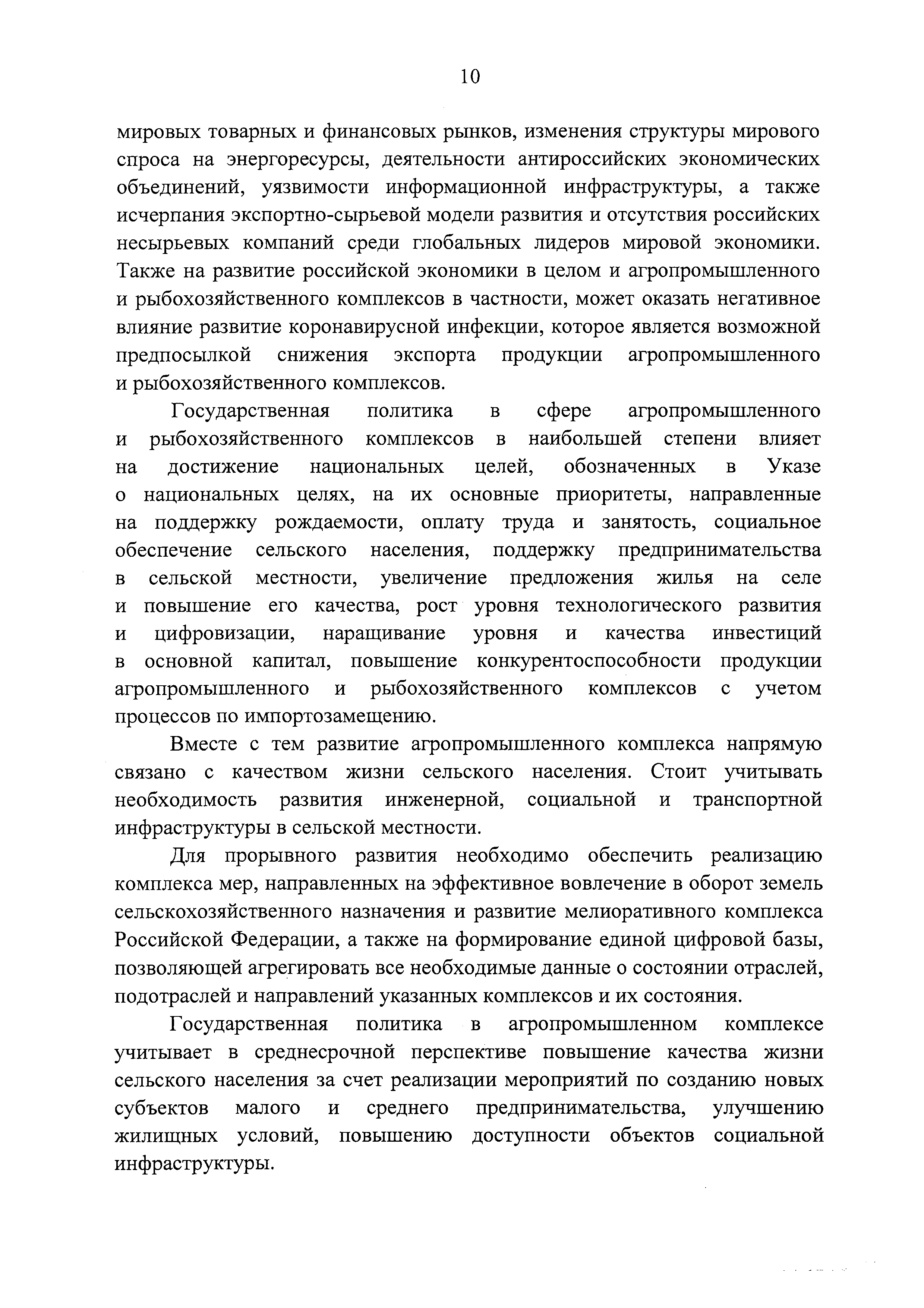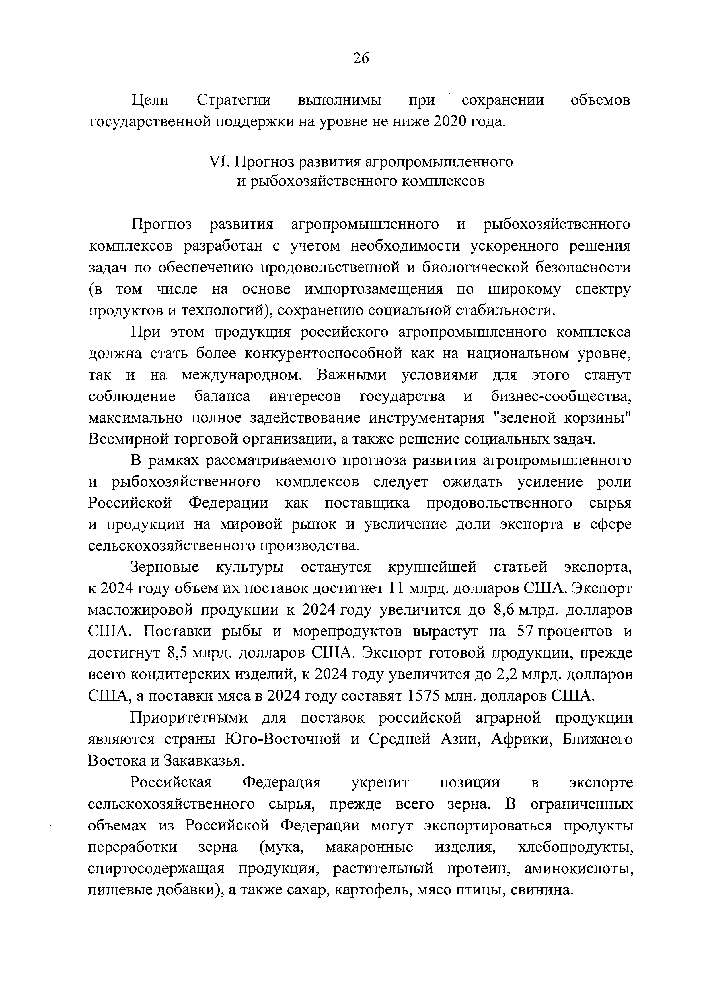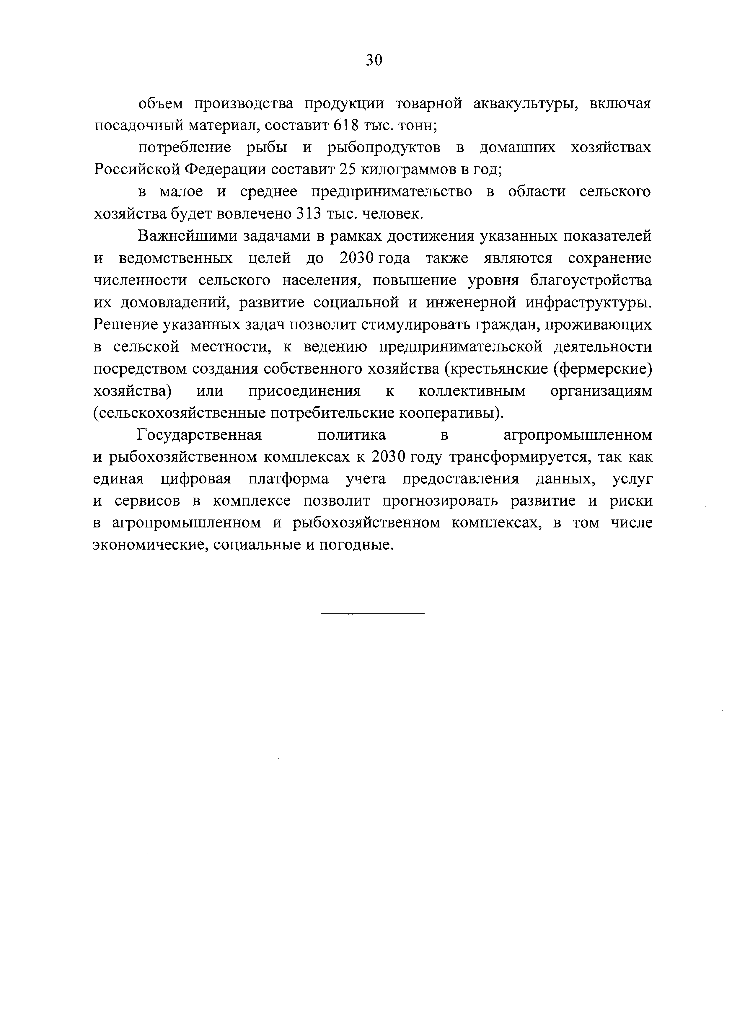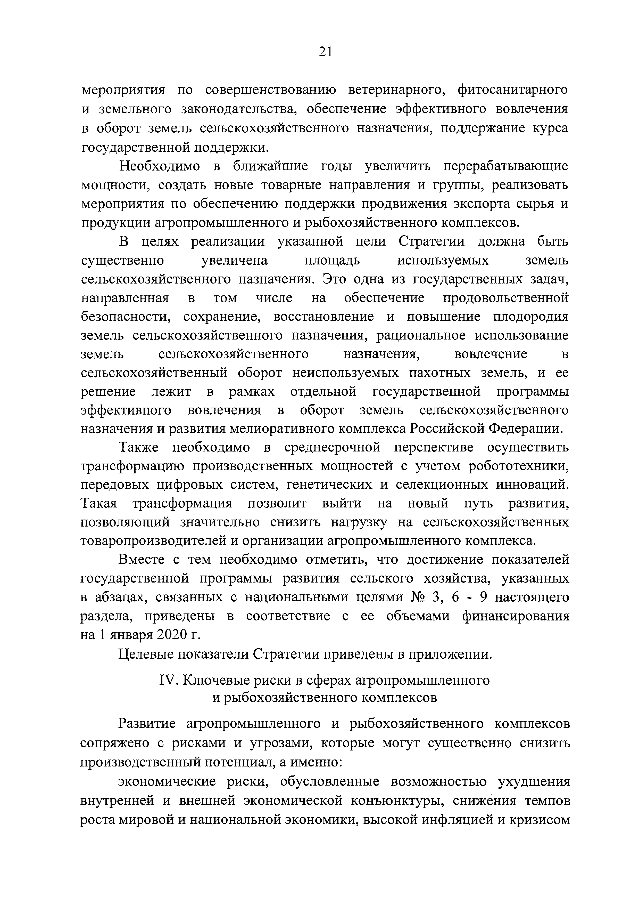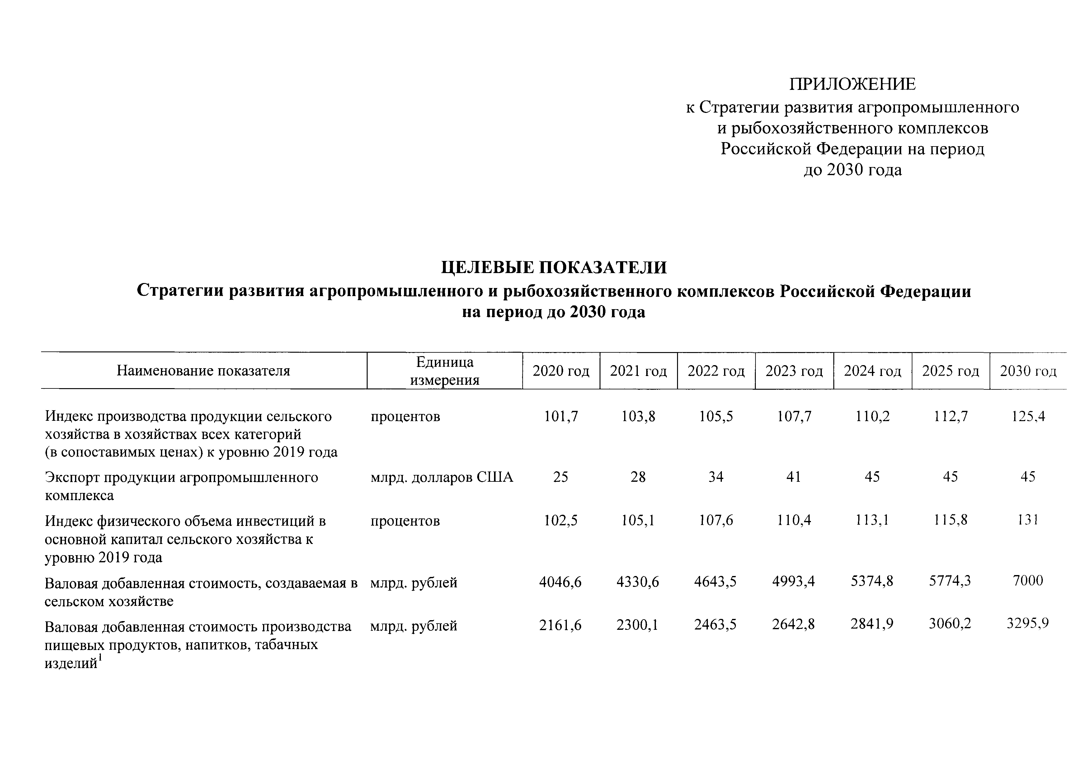 | Оглавление: | I. Общие положения II. Текущее состояние агропромышленного и рыбохозяйственного комплексов III. Цели, задачи, мероприятия и показатели (индикаторы) государственной политики в сферах агропромышленного и рыбохозяйственного комплексов IV. Ключевые риски в сферах агропромышленного и рыбохозяйственного комплексов V. Вызовы, угрозы и факторы, влияющие на развитие агропромышленного и рыбохозяйственного комплексов VI. Прогноз развития агропромышленного и рыбохозяйственного комплексов Приложение. Целевые показатели Стратегии развития агропромышленного и рыбохозяйственного комплексов Российской Федерации на период до 2030 года |