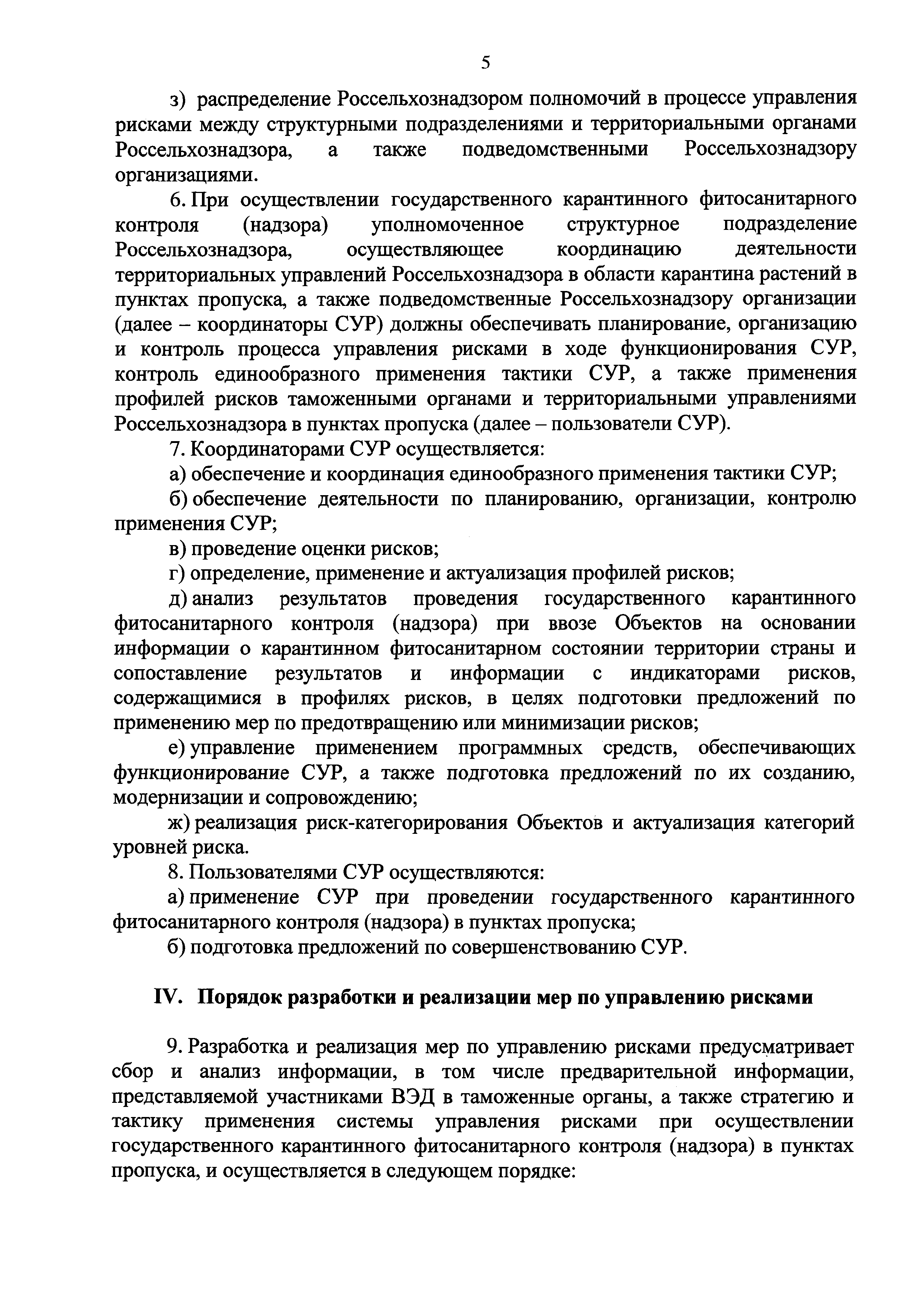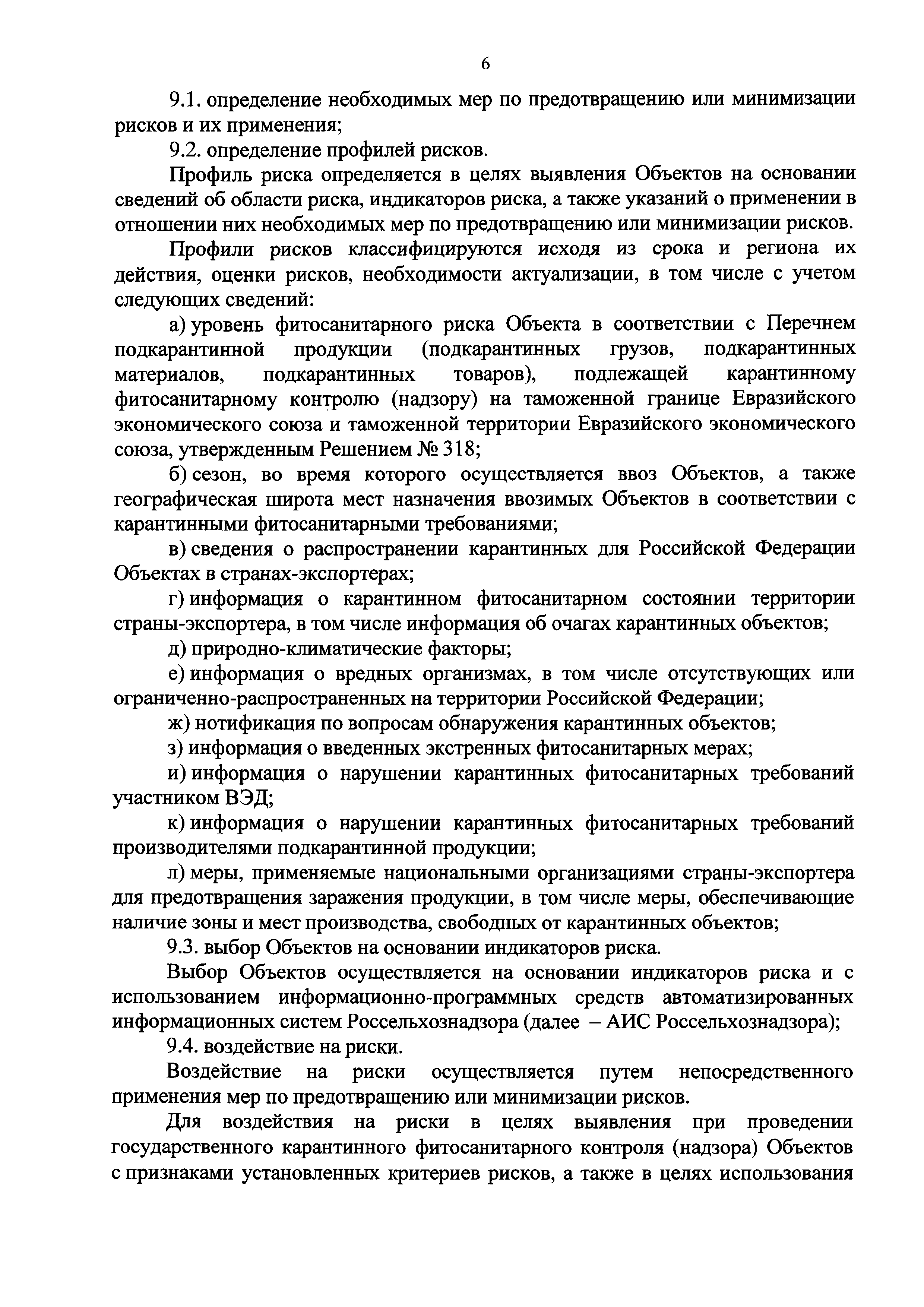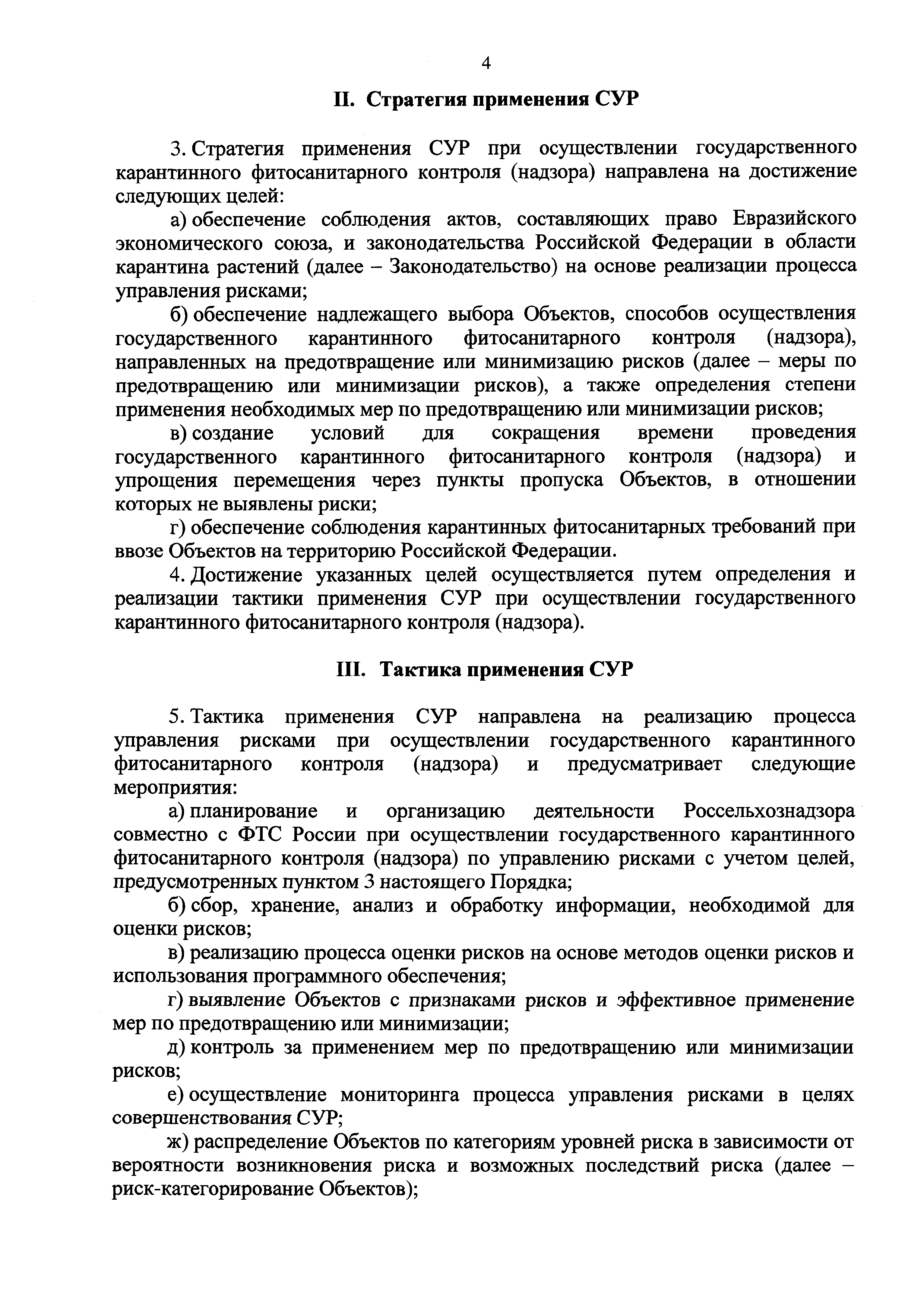 Порядок разработки и реализации мер по управлению рисками, включающий в себя порядок сбора и анализа информации, в том числе предварительной информации, представляемой участниками внешнеэкономической деятельности в таможенные органы, а также стратегия и тактика применения системы управления рисками при осуществлении государственного карантинного фитосанитарного контроля (надзора) в пунктах пропуска через Государственную границу Российской Федерации| Статус: | действует | | Название рус.: | Порядок разработки и реализации мер по управлению рисками, включающий в себя порядок сбора и анализа информации, в том числе предварительной информации, представляемой участниками внешнеэкономической деятельности в таможенные органы, а также стратегия и тактика применения системы управления рисками при осуществлении государственного карантинного фитосанитарного контроля (надзора) в пунктах пропуска через Государственную границу Российской Федерации | | Дата добавления в базу: | 01.01.2021 | | Дата актуализации: | 01.01.2021 | | Дата введения: | 09.01.2018 | | Область применения: | Порядок разработан в целях установления единых подходов к управлению, реализации и совершенствованию системы управления рисками при осуществлении государственного карантинного фитосанитарного контроля (надзора) в пунктах пропуска через Государственную границу Российской Федерации при ввозе в Российскую Федерацию подкарантинной продукции и (или) подкарантинных объектов, подлежащих государственному карантинному фитосанитарному контролю (надзору) | | Оглавление: | I. Общие положения II. Стратегия применения СУР III. Тактика применения СУР IV. Порядок разработки и реализации мер по управлению рисками | | Утверждён: | 28.08.2017 Минфин России (Russian Federation Minfin 136н) 28.08.2017 Министерство сельского хозяйства РФ (Russian Federation Ministry of Agriculture 322)