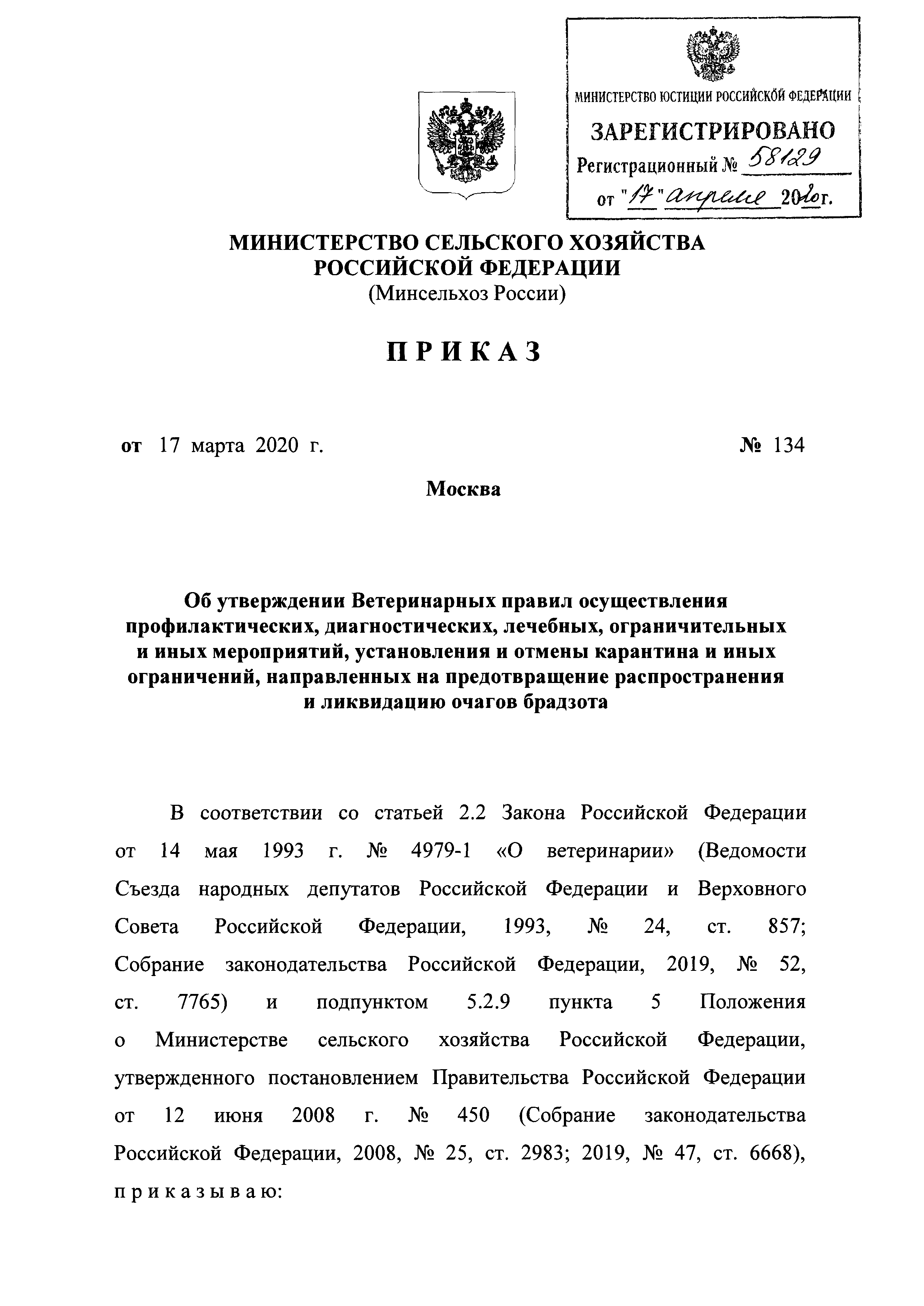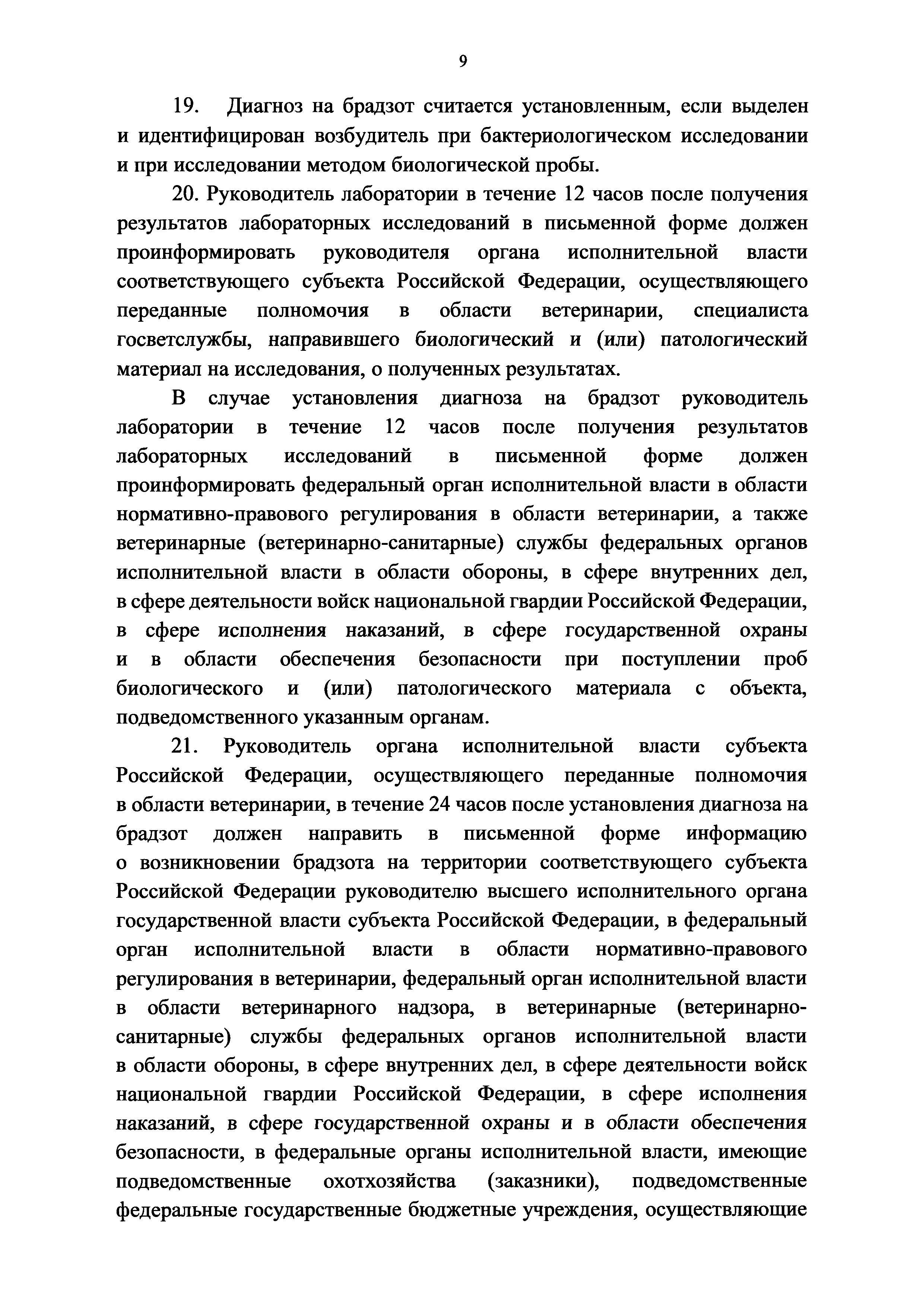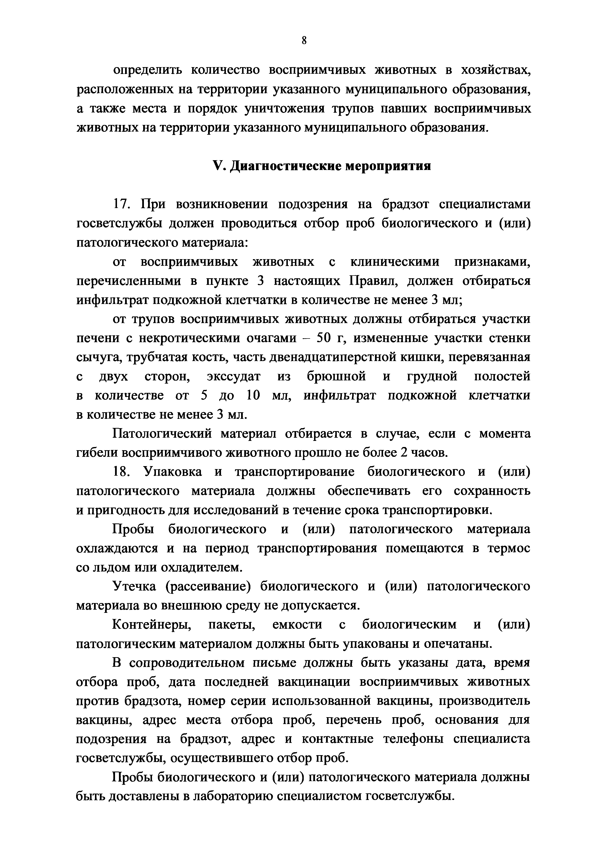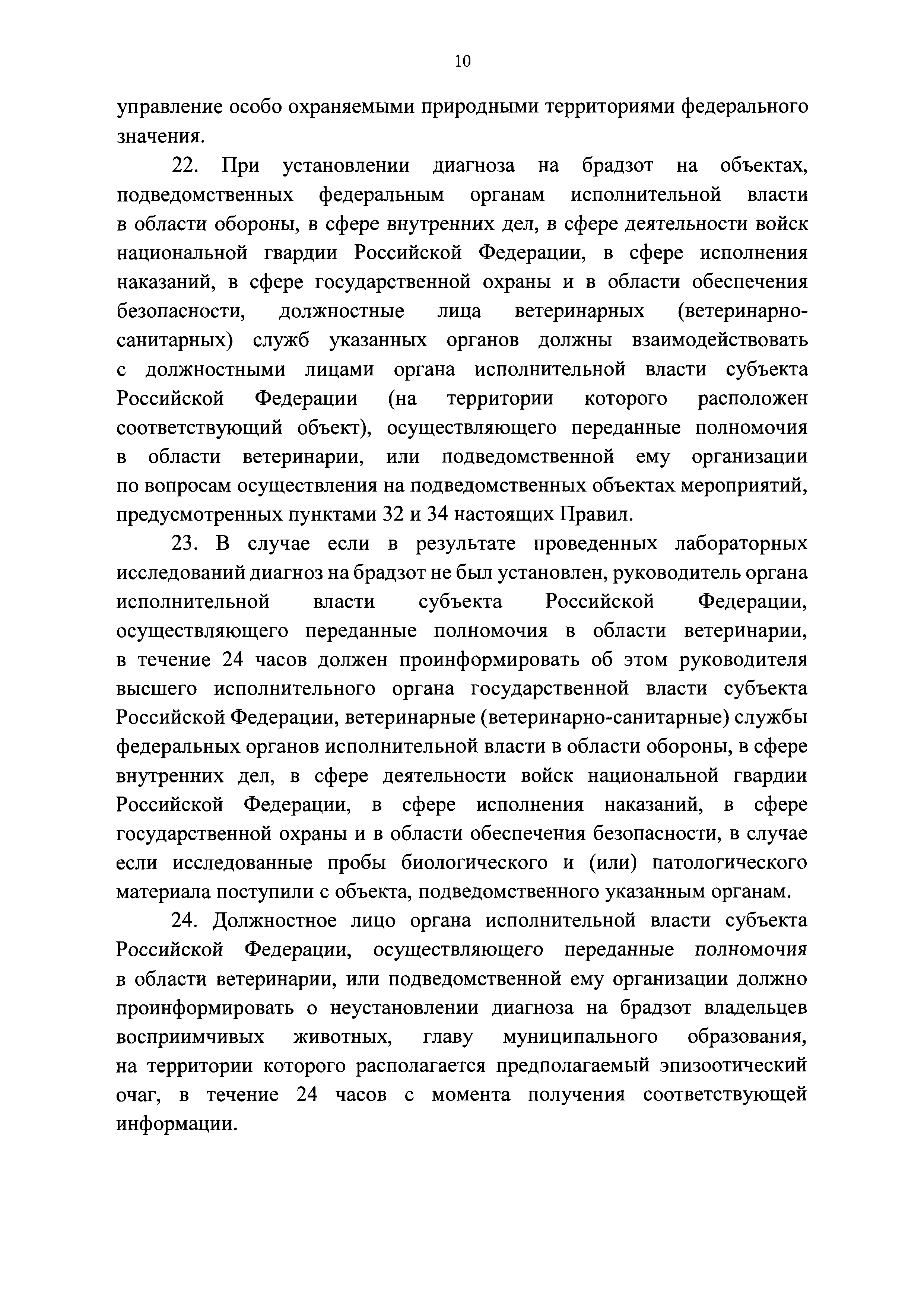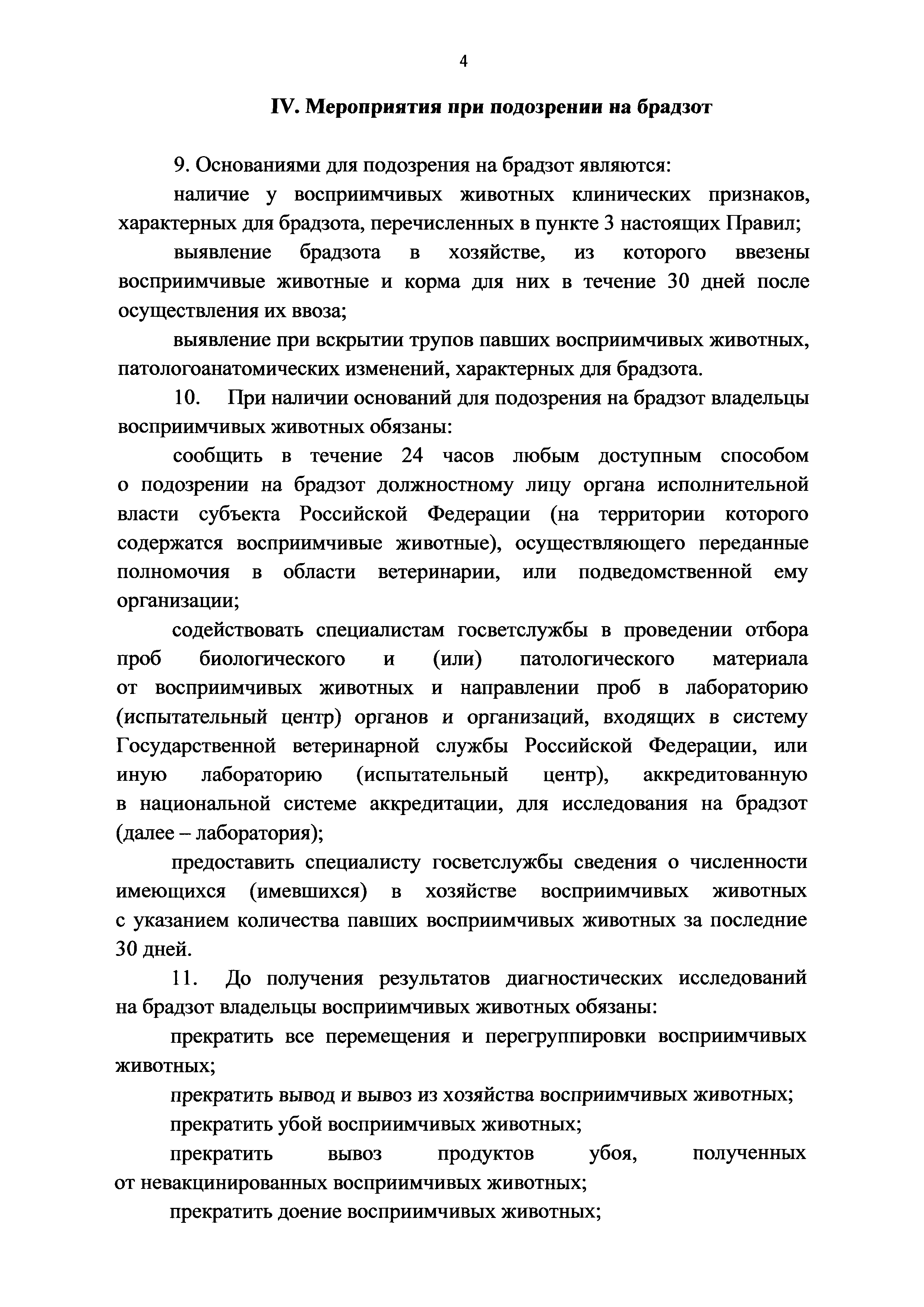 Ветеринарные правила осуществления профилактических, диагностических, лечебных, ограничительных и иных мероприятий, установления и отмены карантина и иных ограничений, направленных на предотвращение распространения и ликвидацию очагов брадзота| Статус: | действует | | Название рус.: | Ветеринарные правила осуществления профилактических, диагностических, лечебных, ограничительных и иных мероприятий, установления и отмены карантина и иных ограничений, направленных на предотвращение распространения и ликвидацию очагов брадзота | | Дата добавления в базу: | 01.01.2021 | | Дата актуализации: | 01.01.2021 | | Дата введения: | 28.04.2020 | | Оглавление: | I. Область применения II. Общая характеристика брадзота III. Профилактические мероприятия IV. Мероприятия при подозрении на брадзот V. Диагностические мероприятия VI. Установление карантина, ограничительные, лечебные и иные мероприятия, направленные на ликвидацию очагов брадзота, а также на предотвращение его распространения VII. Отмена карантина | | Утверждён: | 17.03.2020 Министерство сельского хозяйства Российской Федерации (134)