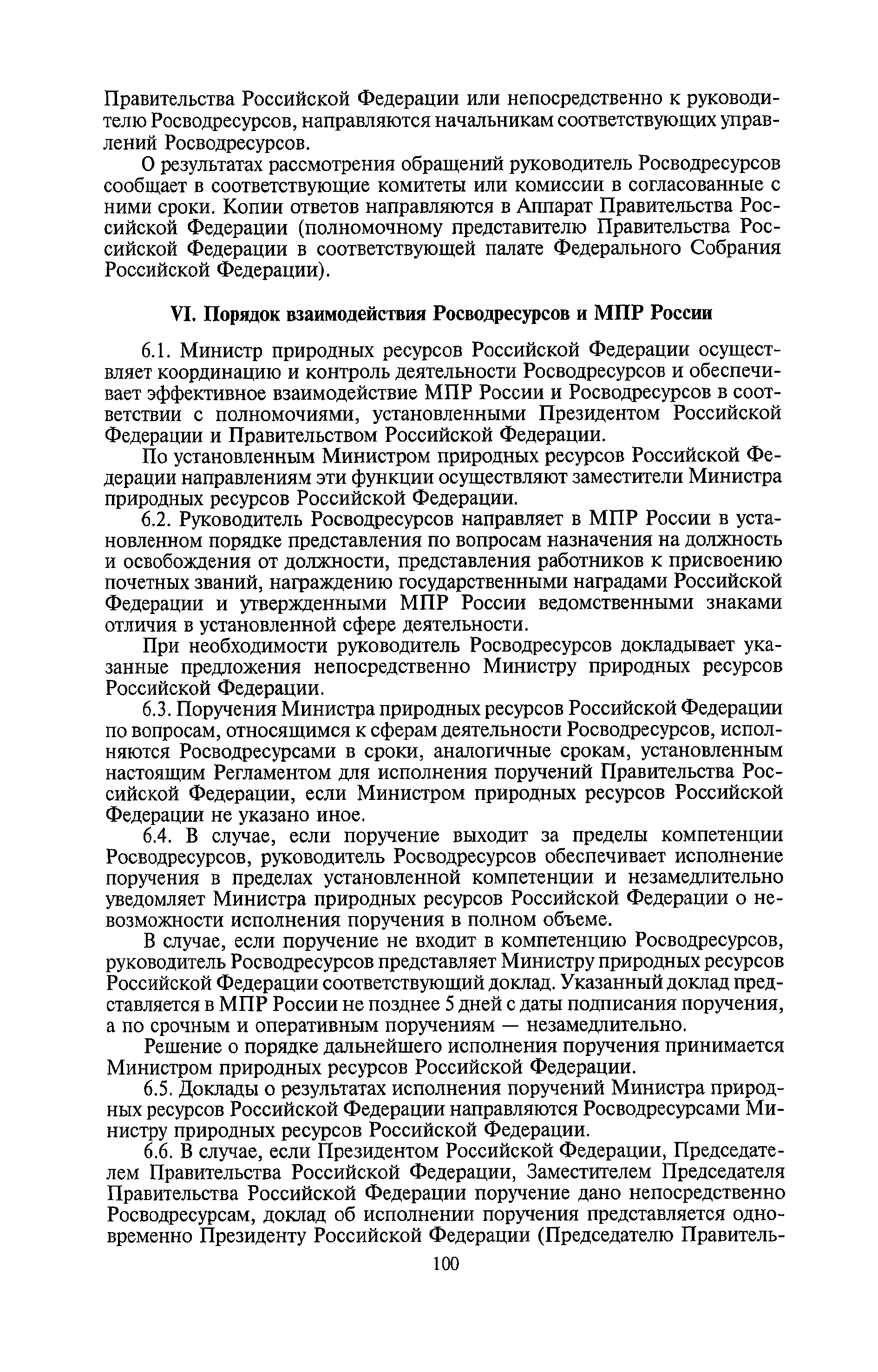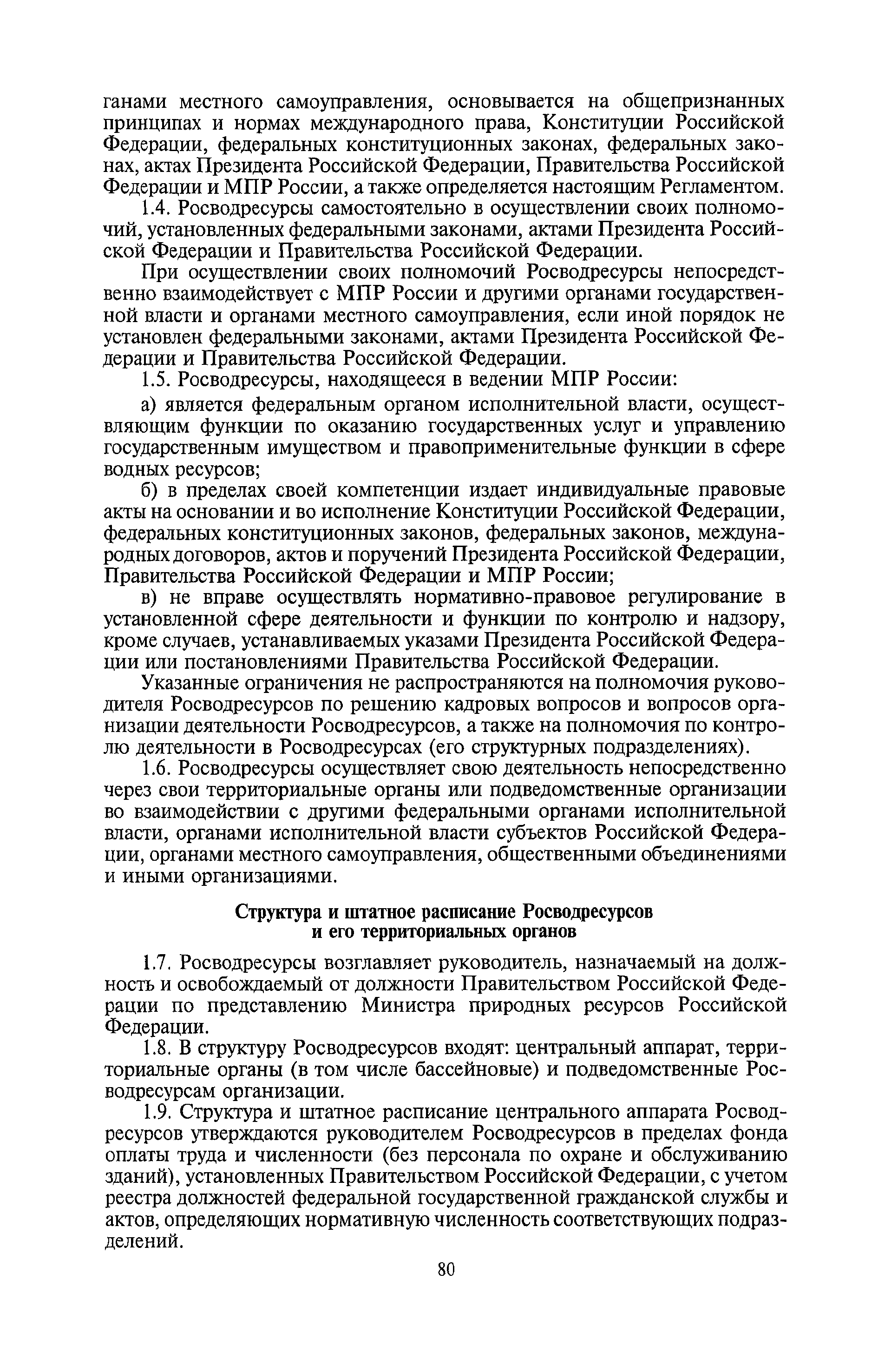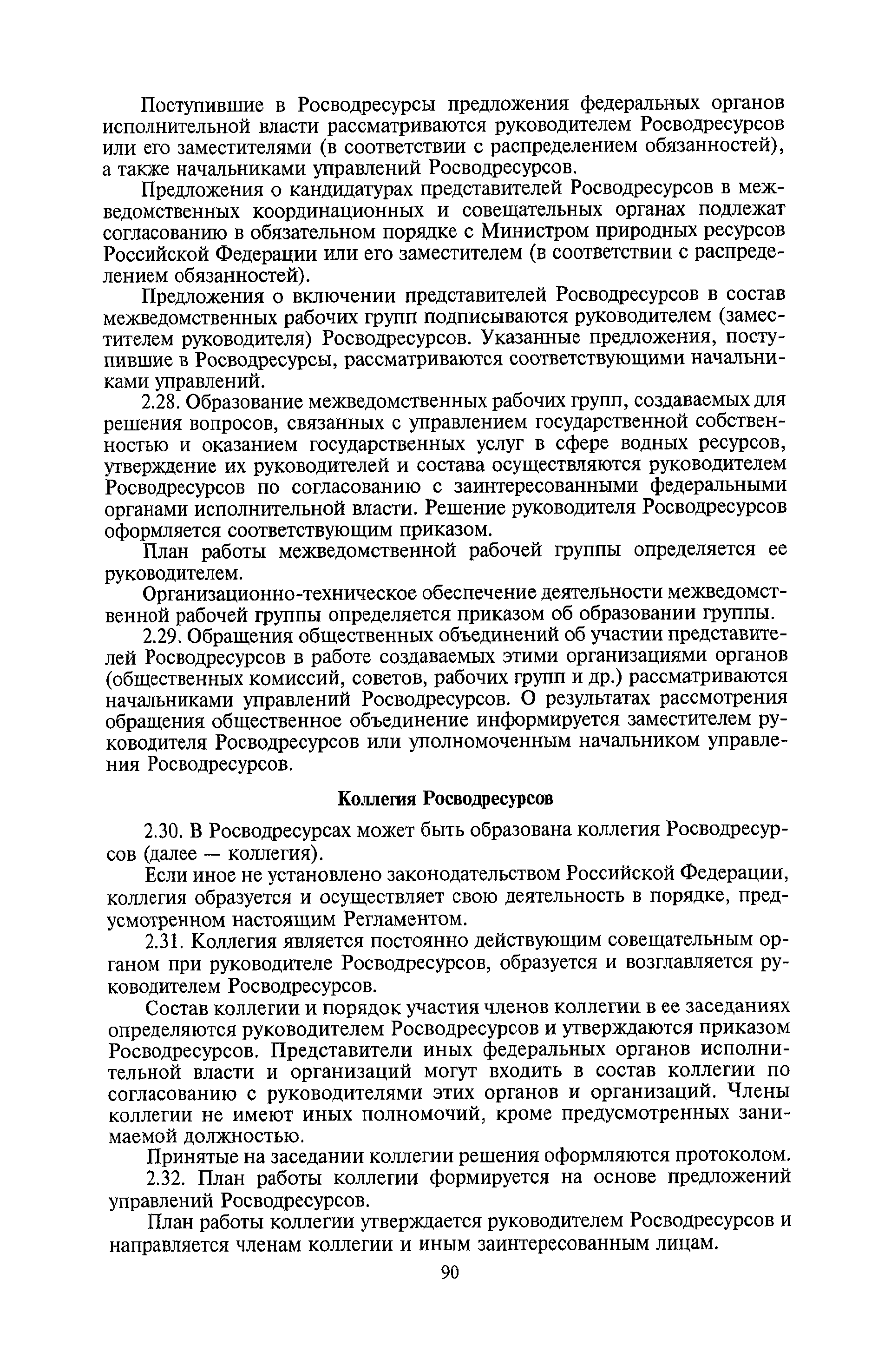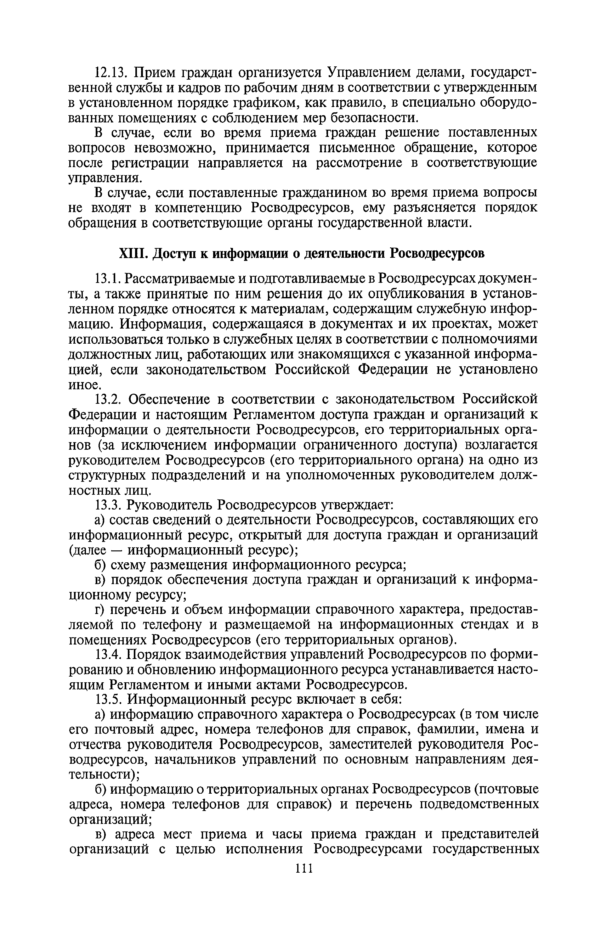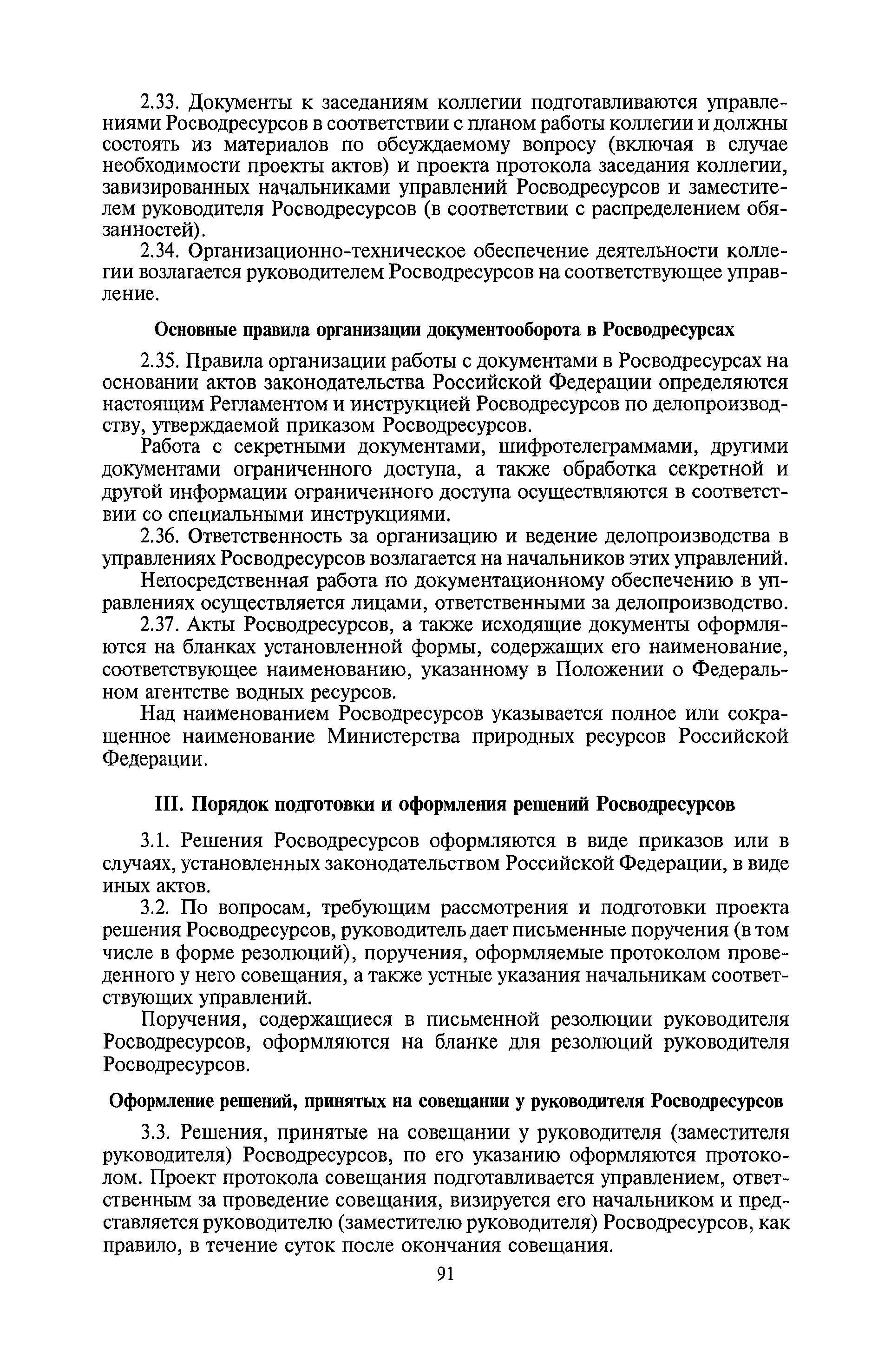 | Оглавление: | I. Общие положения II. Порядок планирования и организации работы III. Порядок подготовки и оформления решений Росводресурсов IV. Порядок исполнения поручений в Росводресурсах V. Порядок участия в деятельности ФС РФ VI. Порядок взаимодействия Росводресурсов и Минприроды России VII. Правила организации деятельности территориальных органов Росводресурсов VIII. Порядок деятельности и взаимодействия управлений центрального аппарата Росводресурсов при осуществлении возложенных на него функций IX. Правила организации взаимодействия Росводресурсов и подведомственных ему организаций X. Порядок взаимоотношений с органами судебной власти XI. Порядок рассмотрения отдельных видов обращений ХII. Порядок работы с обращениями граждан и организаций, прием граждан XIII. Доступ к информации о деятельности Росводресурсов |