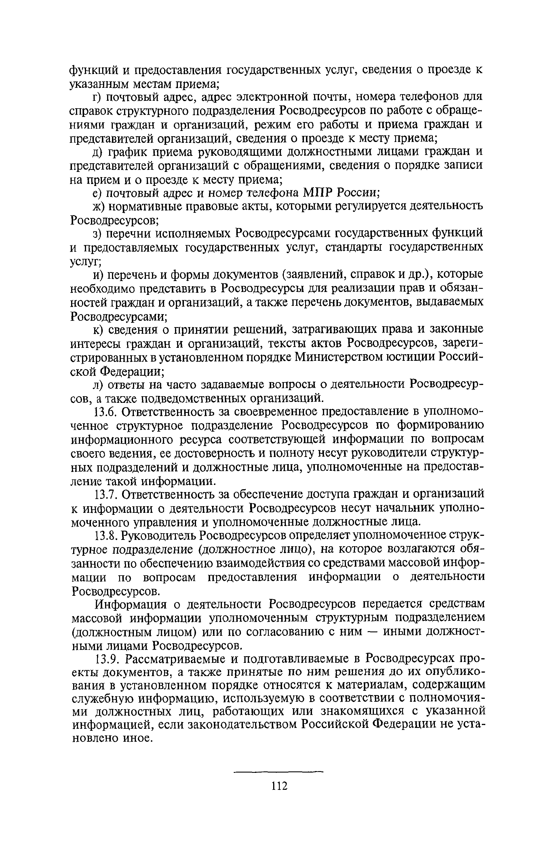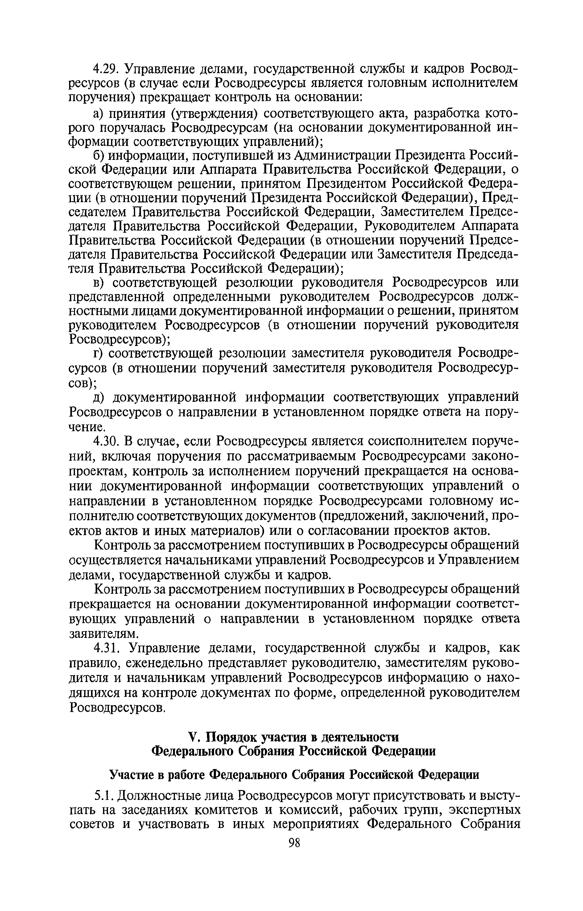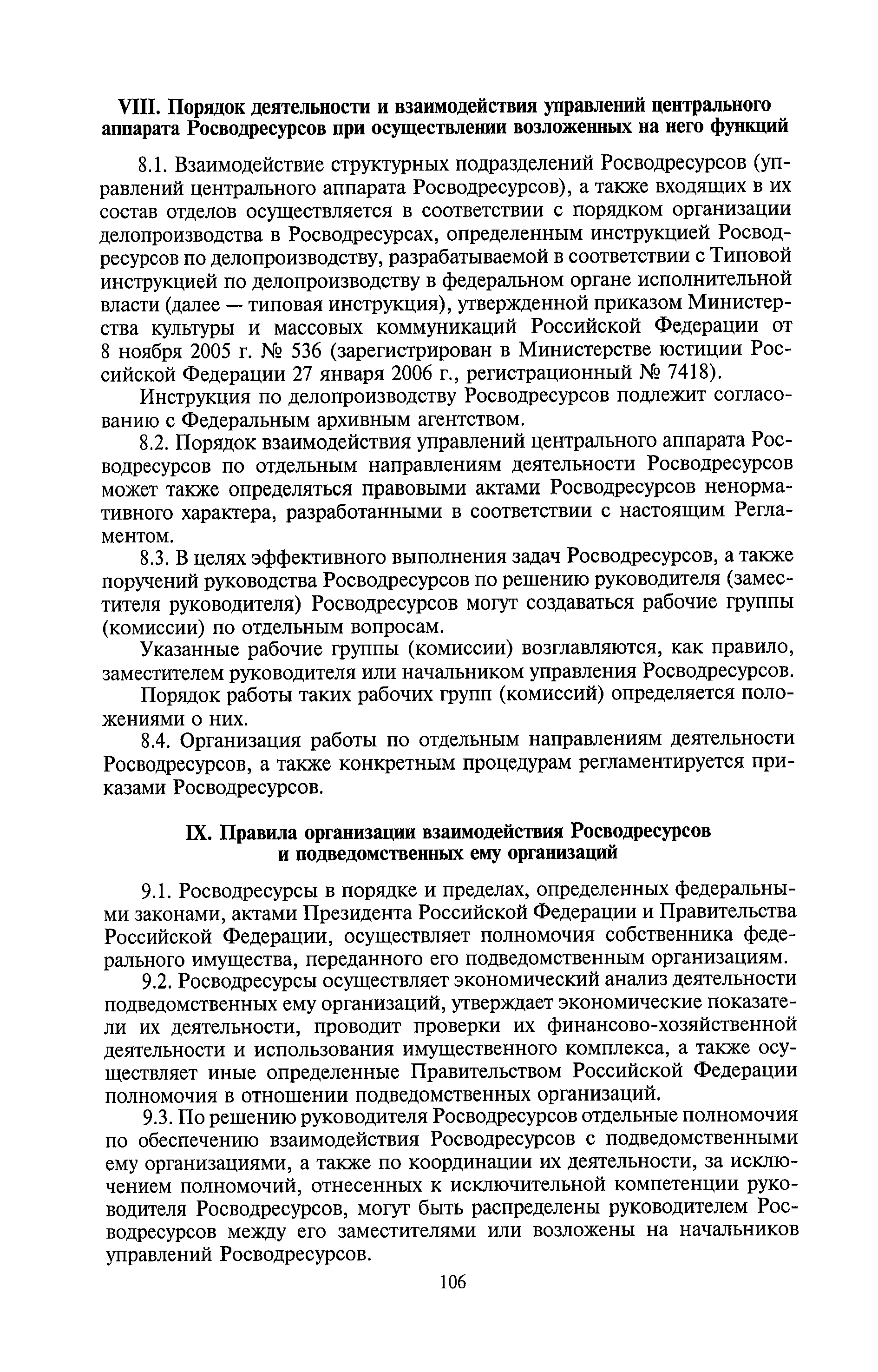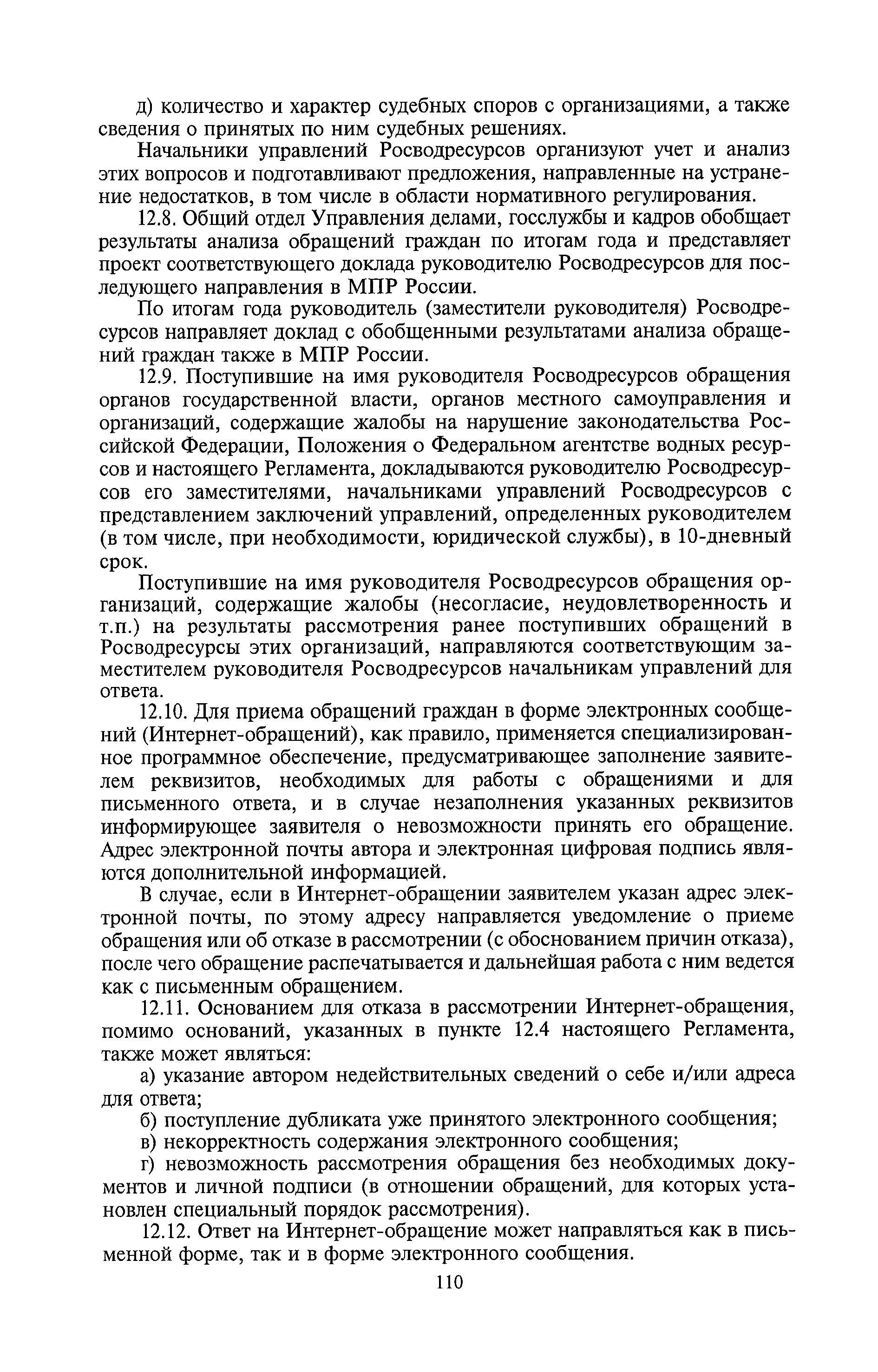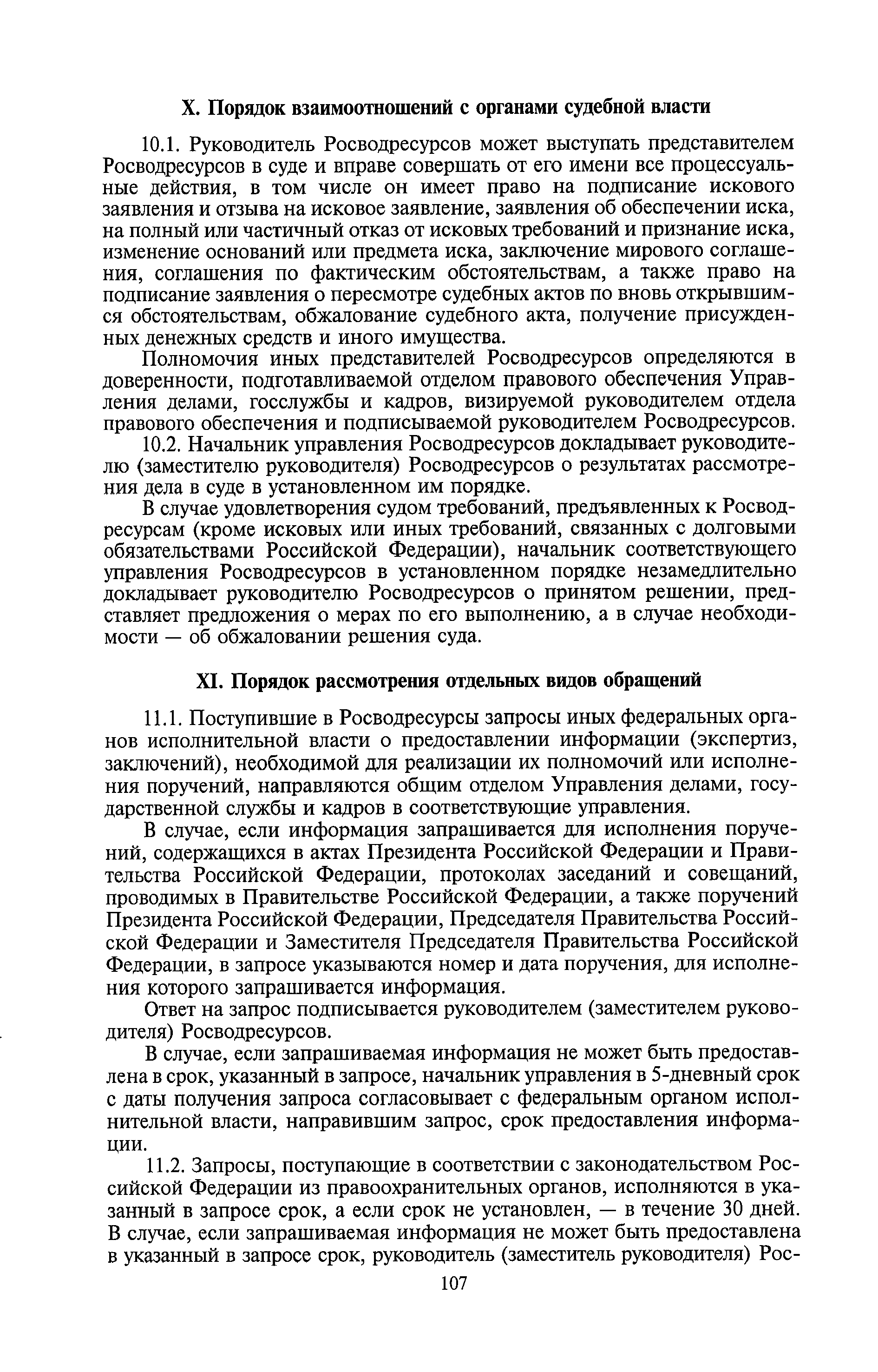 | Оглавление: | I. Общие положения II. Порядок планирования и организации работы III. Порядок подготовки и оформления решений Росводресурсов IV. Порядок исполнения поручений в Росводресурсах V. Порядок участия в деятельности ФС РФ VI. Порядок взаимодействия Росводресурсов и Минприроды России VII. Правила организации деятельности территориальных органов Росводресурсов VIII. Порядок деятельности и взаимодействия управлений центрального аппарата Росводресурсов при осуществлении возложенных на него функций IX. Правила организации взаимодействия Росводресурсов и подведомственных ему организаций X. Порядок взаимоотношений с органами судебной власти XI. Порядок рассмотрения отдельных видов обращений ХII. Порядок работы с обращениями граждан и организаций, прием граждан XIII. Доступ к информации о деятельности Росводресурсов |