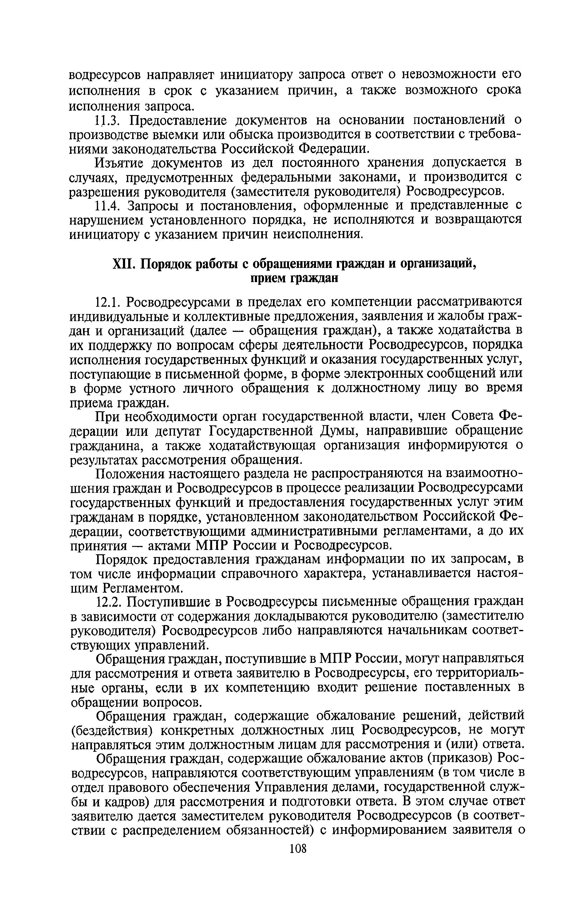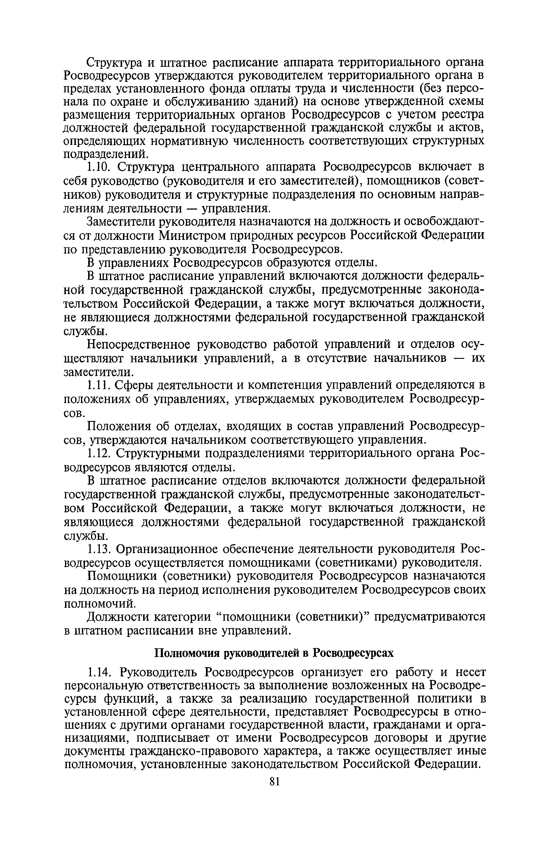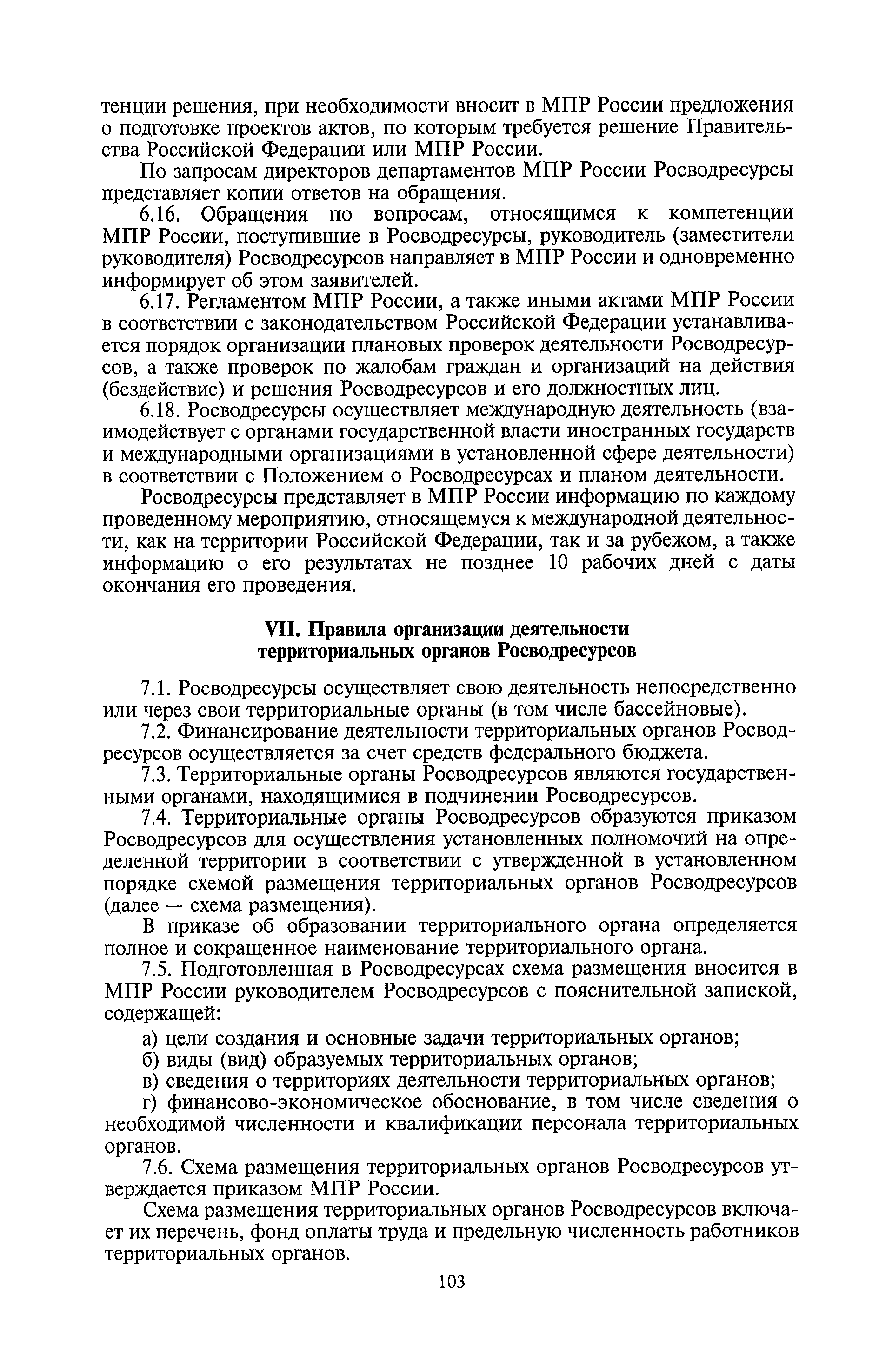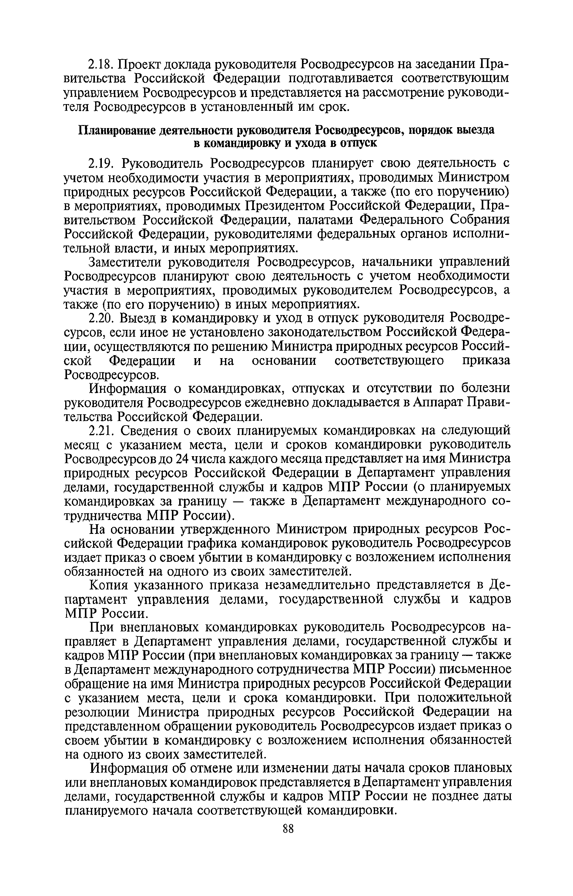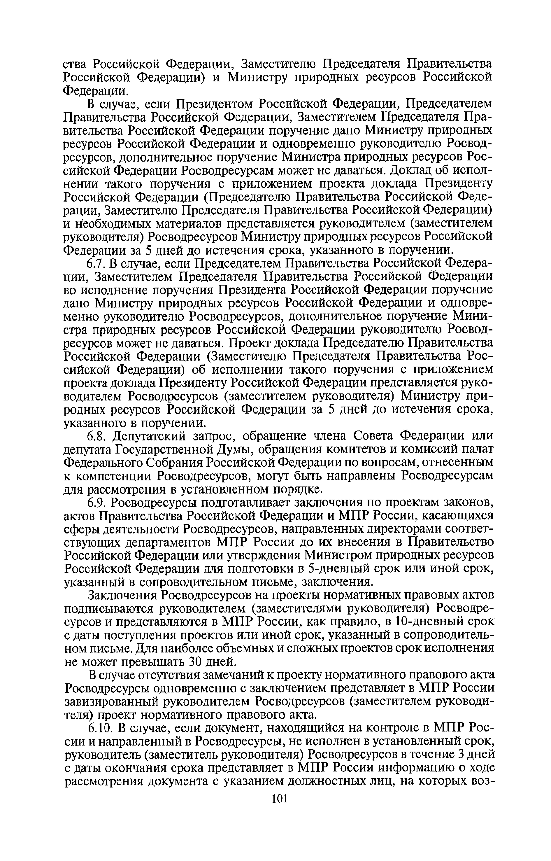 | Оглавление: | I. Общие положения II. Порядок планирования и организации работы III. Порядок подготовки и оформления решений Росводресурсов IV. Порядок исполнения поручений в Росводресурсах V. Порядок участия в деятельности ФС РФ VI. Порядок взаимодействия Росводресурсов и Минприроды России VII. Правила организации деятельности территориальных органов Росводресурсов VIII. Порядок деятельности и взаимодействия управлений центрального аппарата Росводресурсов при осуществлении возложенных на него функций IX. Правила организации взаимодействия Росводресурсов и подведомственных ему организаций X. Порядок взаимоотношений с органами судебной власти XI. Порядок рассмотрения отдельных видов обращений ХII. Порядок работы с обращениями граждан и организаций, прием граждан XIII. Доступ к информации о деятельности Росводресурсов |