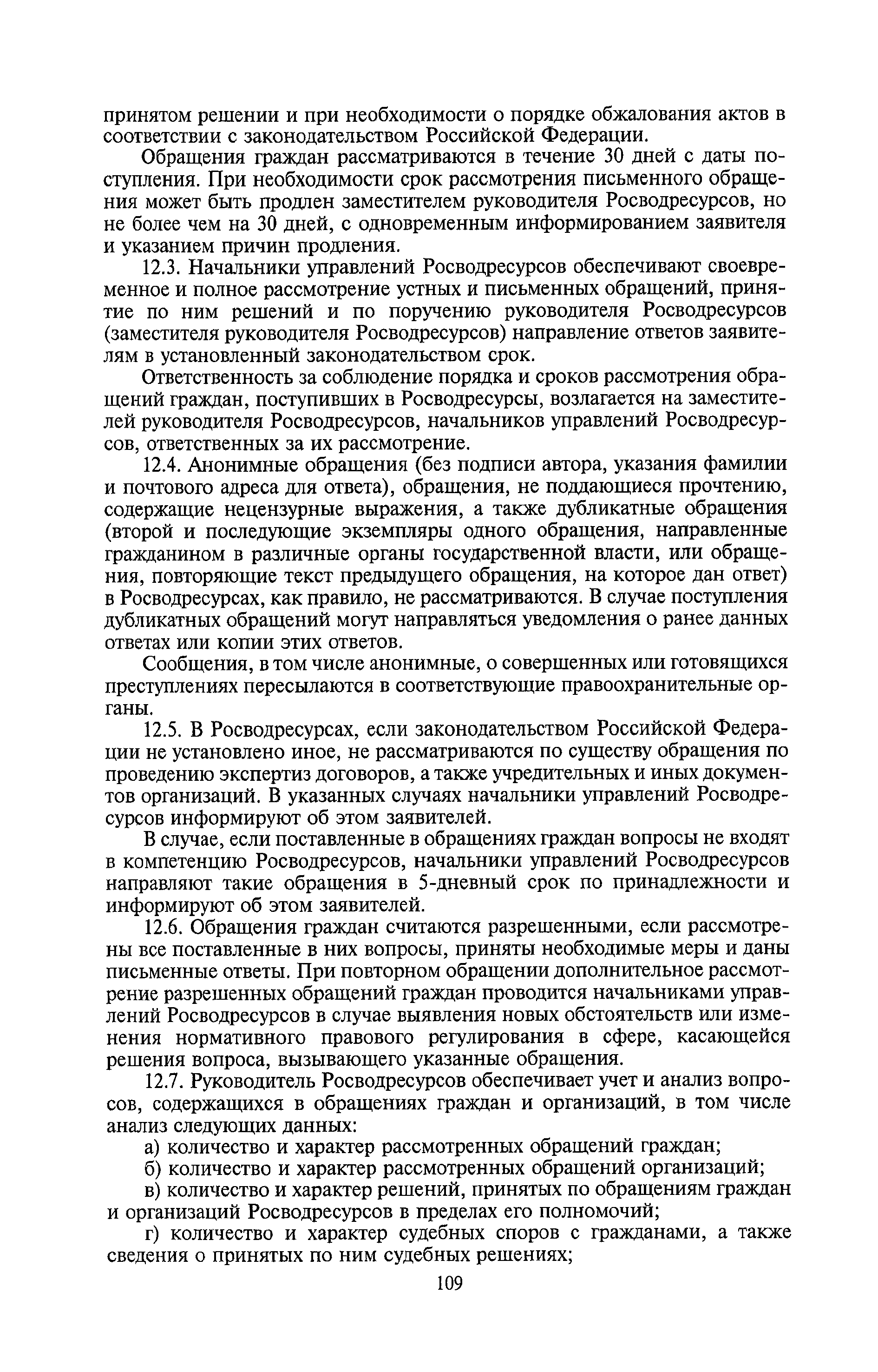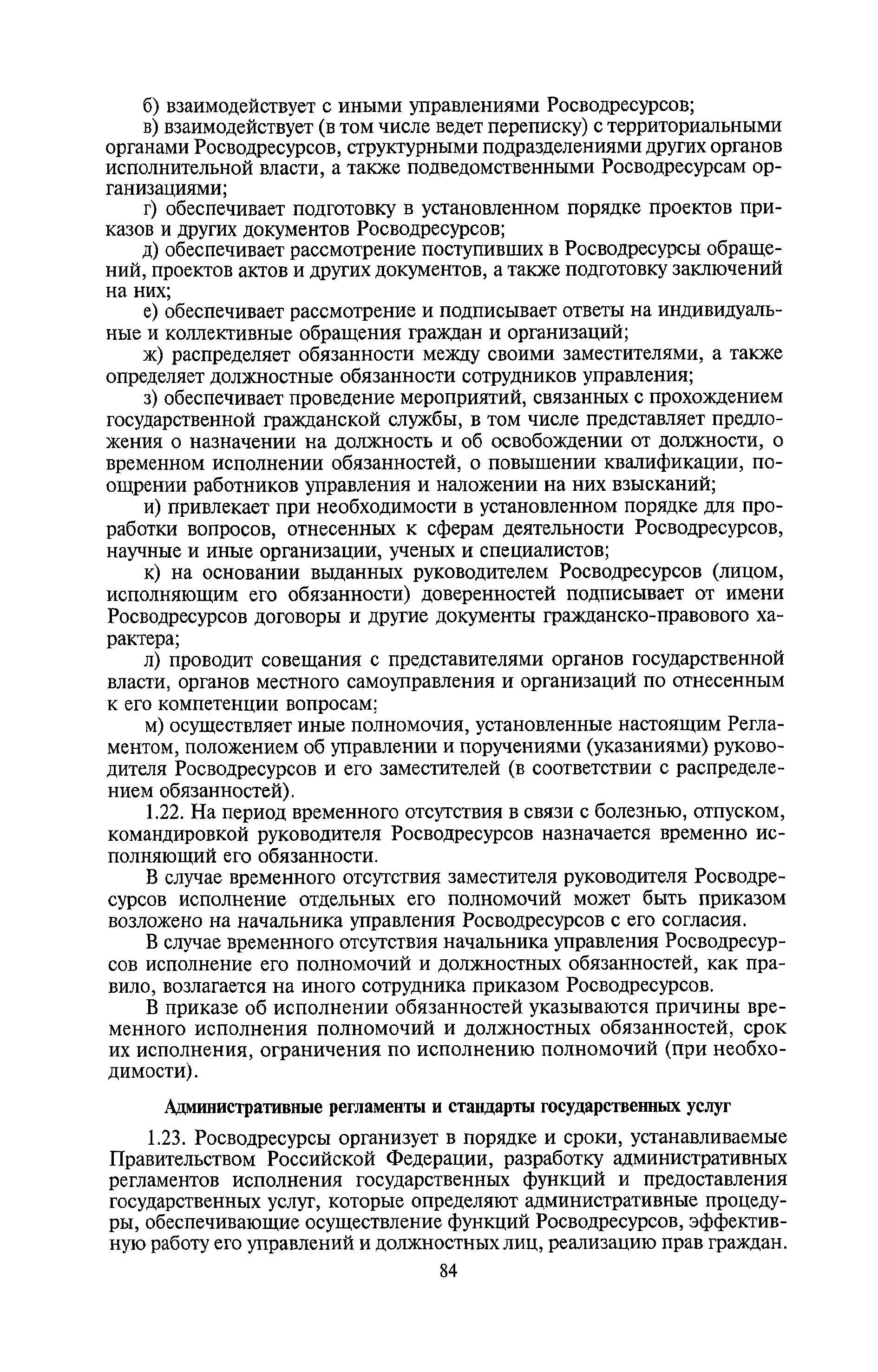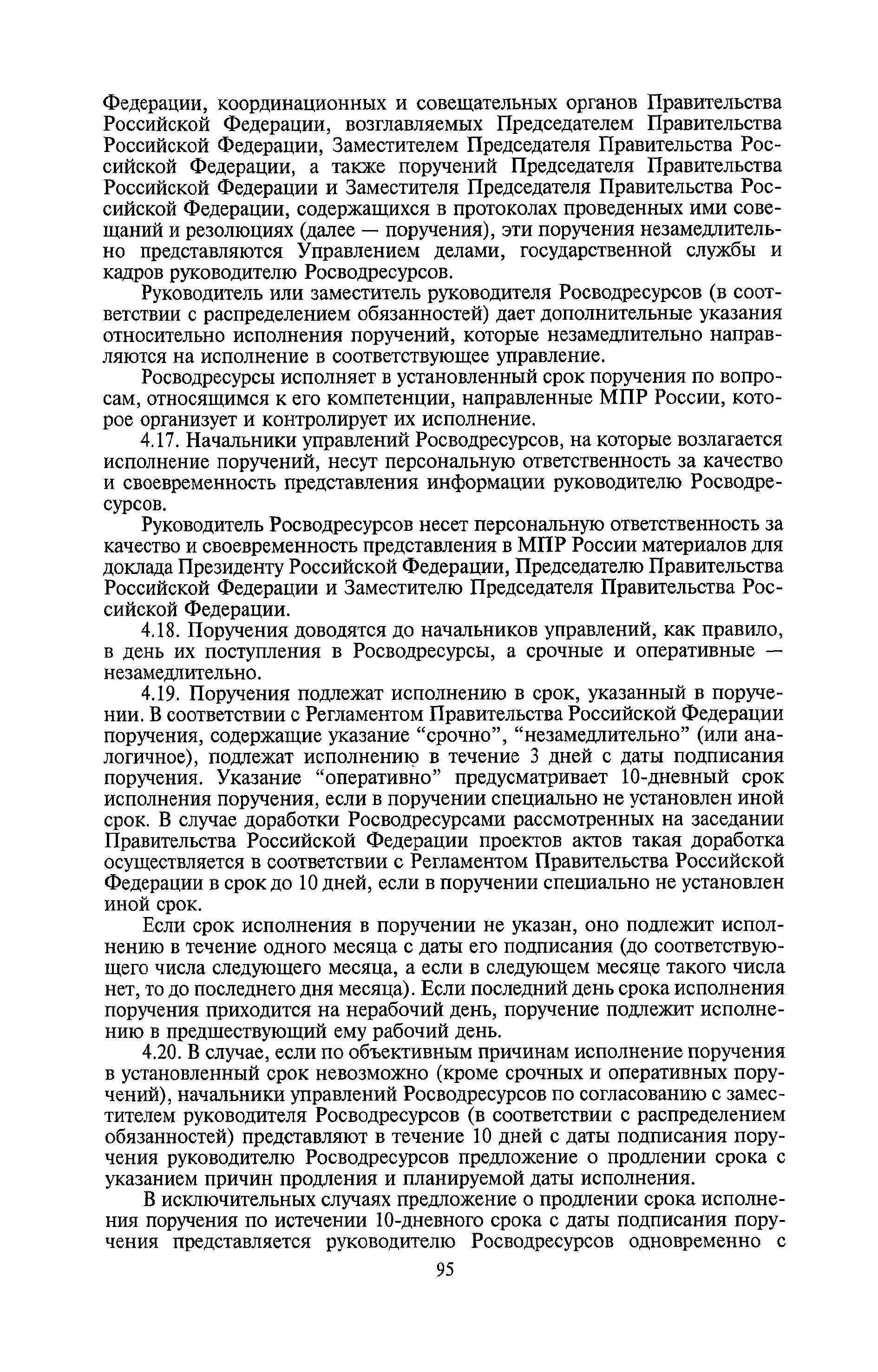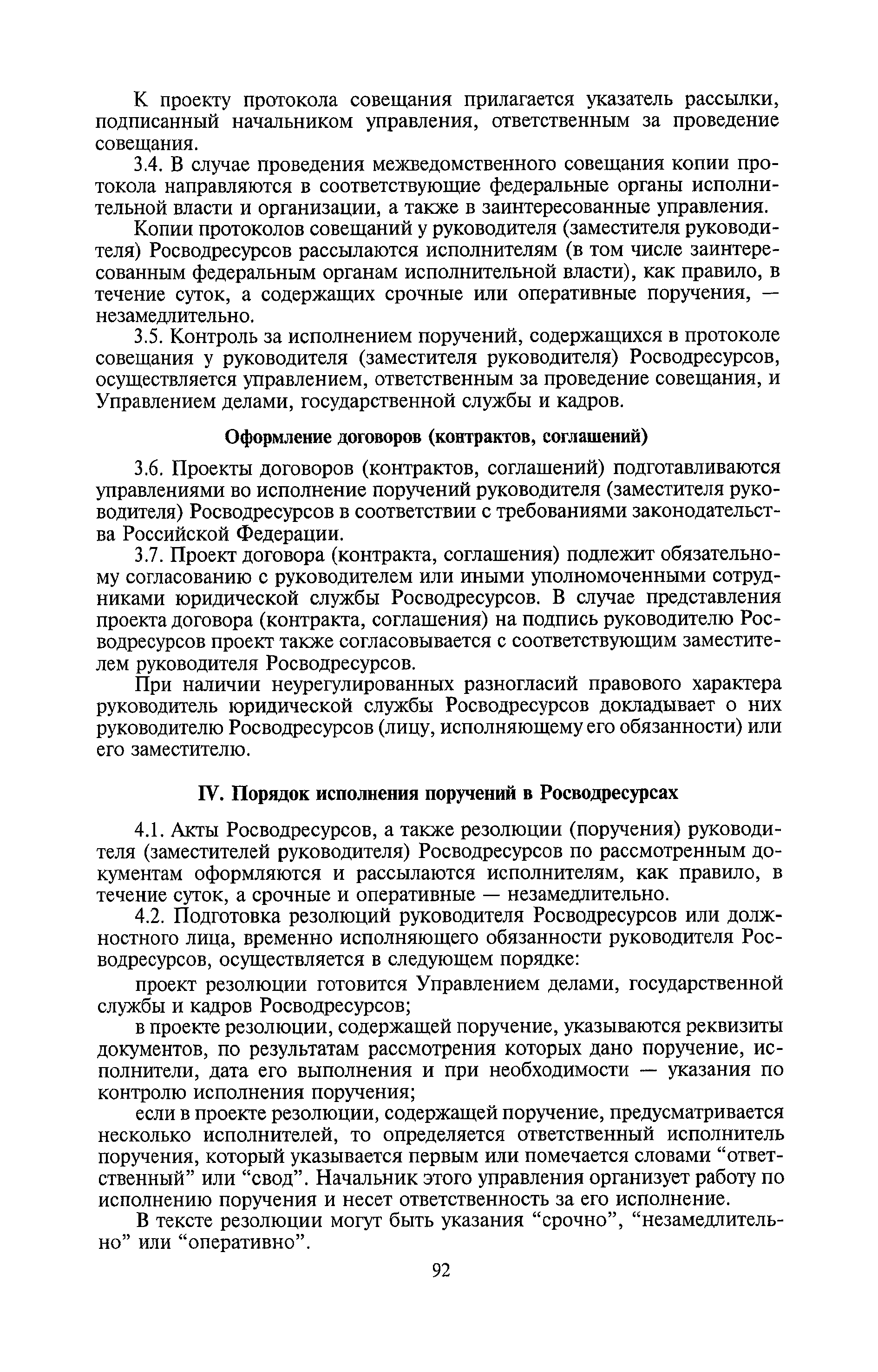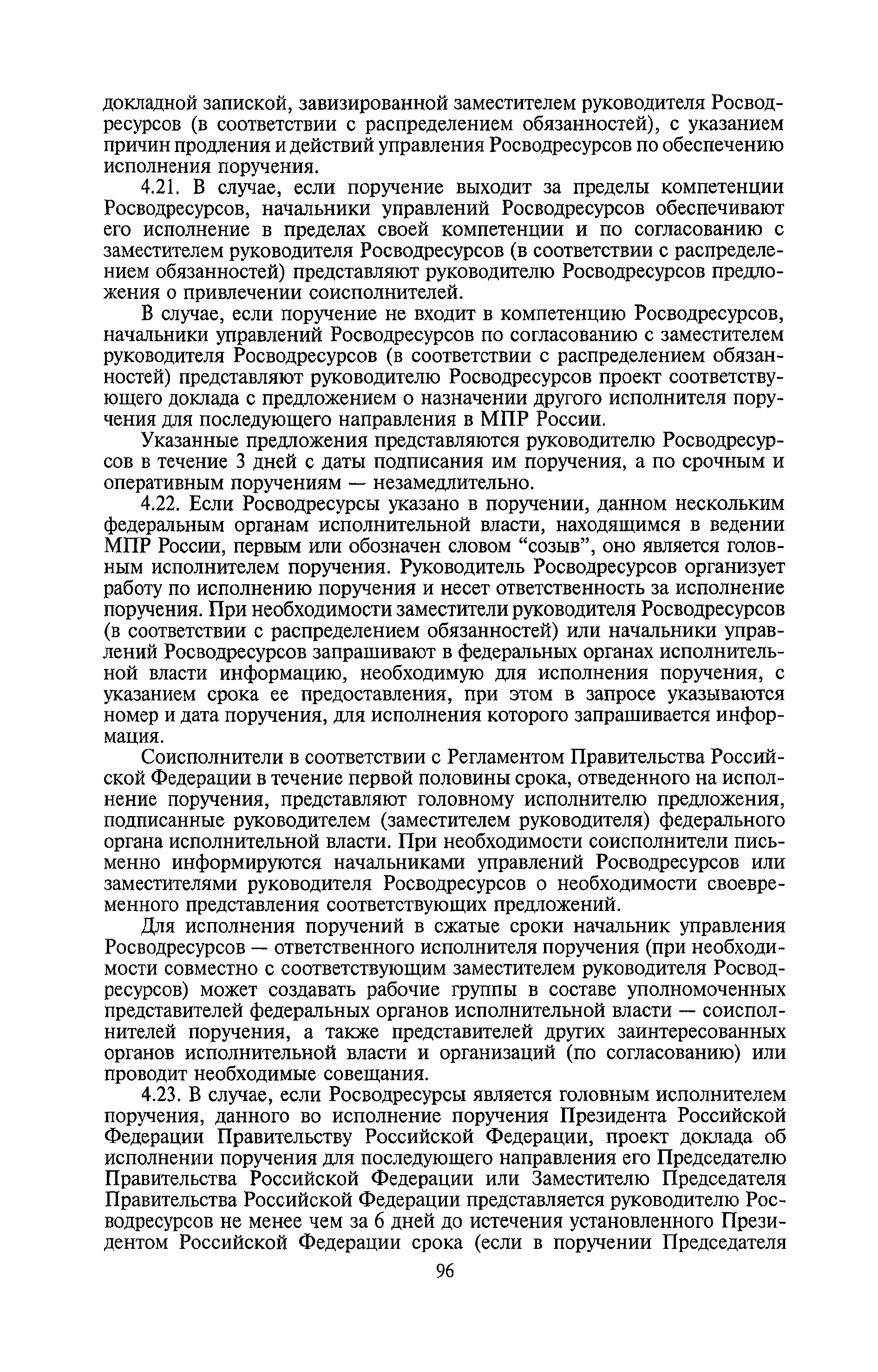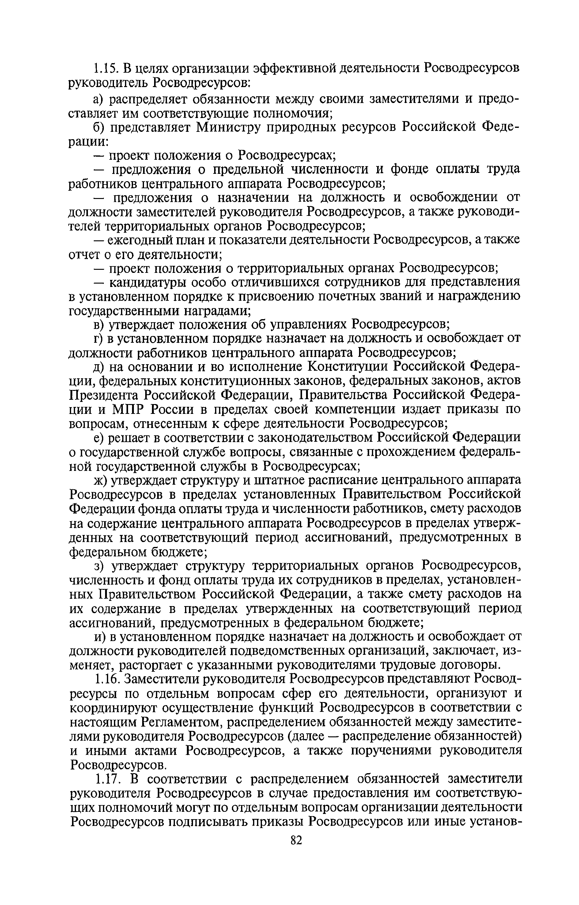 | Оглавление: | I. Общие положения II. Порядок планирования и организации работы III. Порядок подготовки и оформления решений Росводресурсов IV. Порядок исполнения поручений в Росводресурсах V. Порядок участия в деятельности ФС РФ VI. Порядок взаимодействия Росводресурсов и Минприроды России VII. Правила организации деятельности территориальных органов Росводресурсов VIII. Порядок деятельности и взаимодействия управлений центрального аппарата Росводресурсов при осуществлении возложенных на него функций IX. Правила организации взаимодействия Росводресурсов и подведомственных ему организаций X. Порядок взаимоотношений с органами судебной власти XI. Порядок рассмотрения отдельных видов обращений ХII. Порядок работы с обращениями граждан и организаций, прием граждан XIII. Доступ к информации о деятельности Росводресурсов |