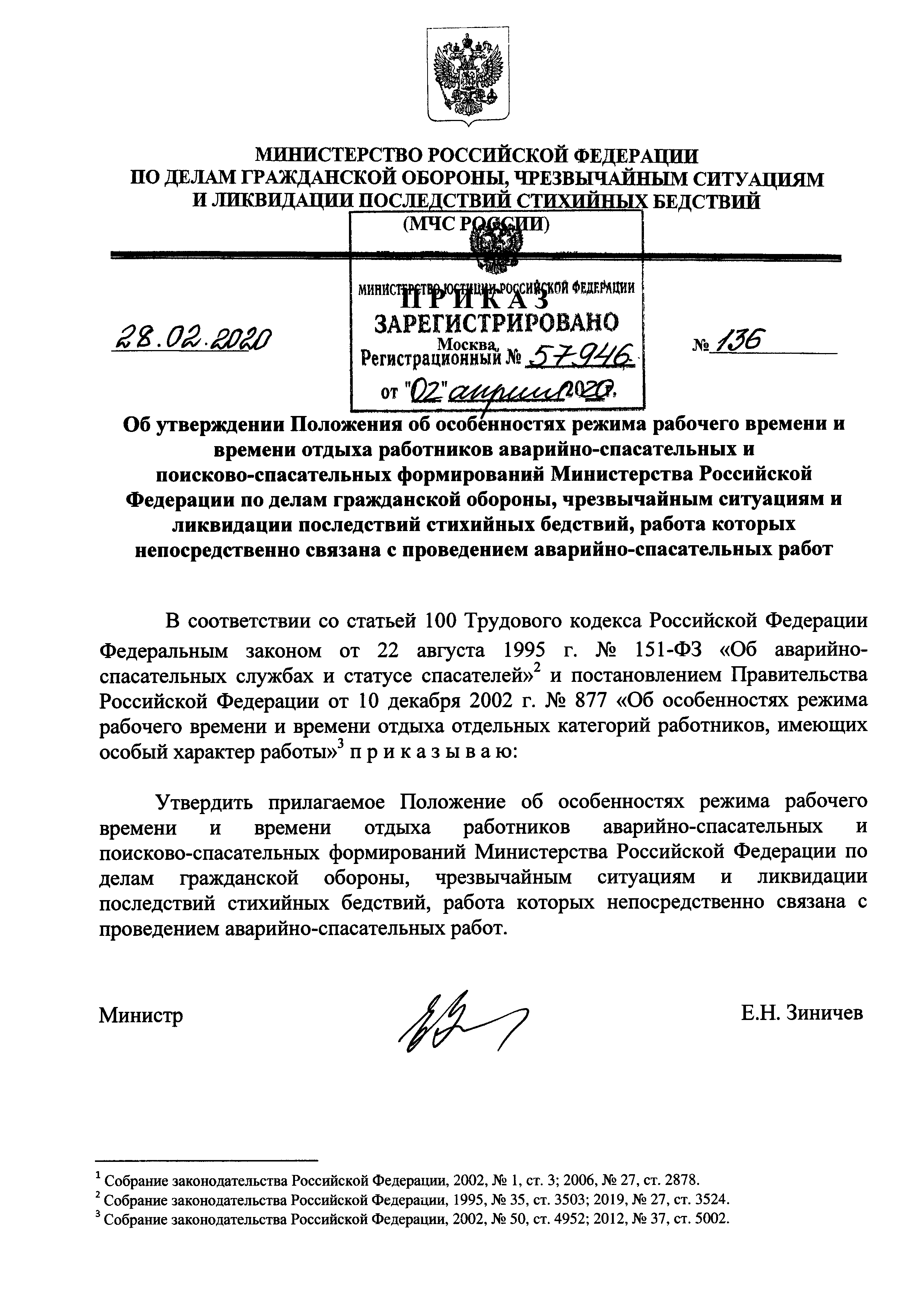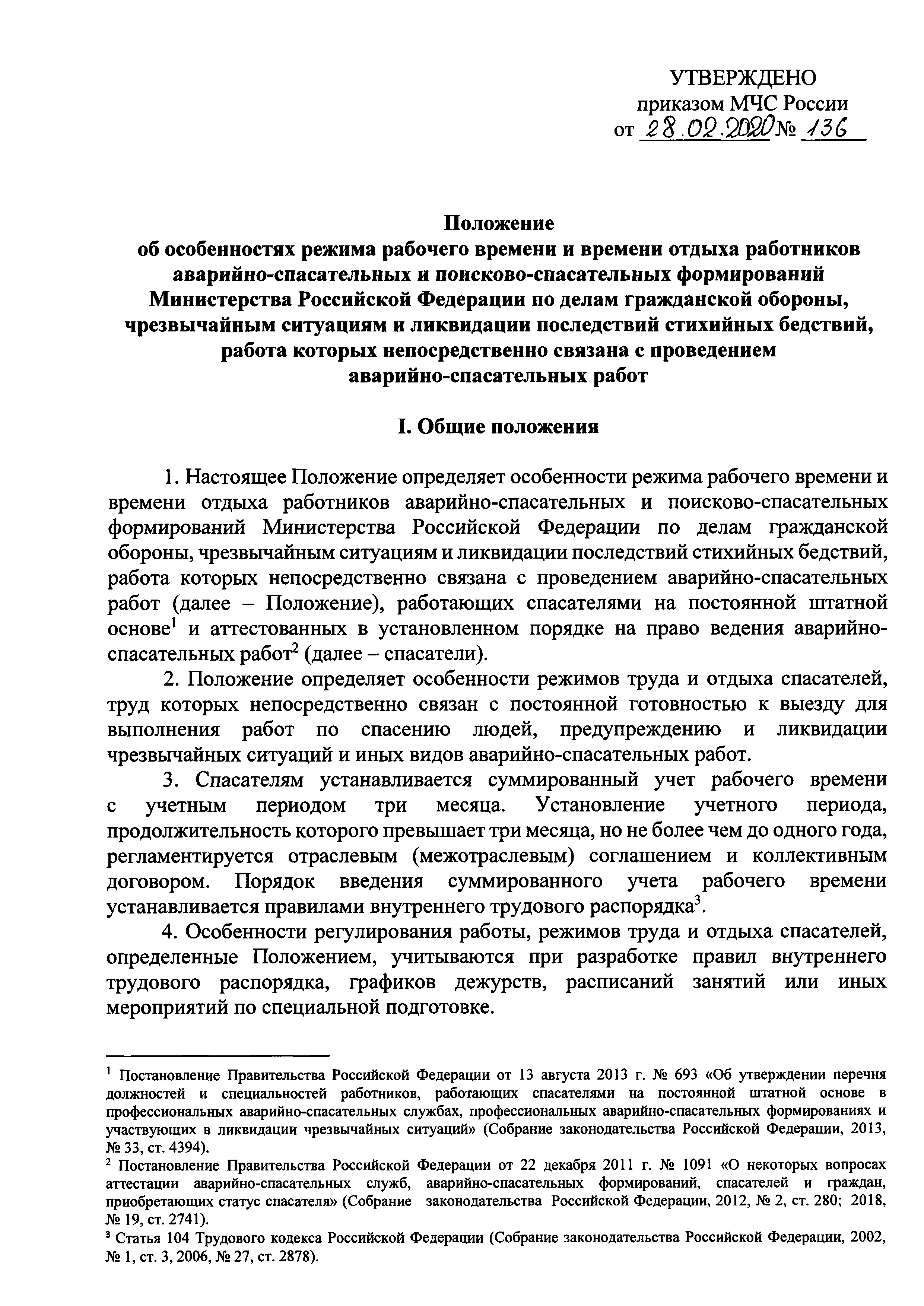 Положение об особенностях режима рабочего времени и времени отдыха работников аварийно-спасательных и поисково-спасательных формирований Министерства Российской Федерации по делам гражданской обороны, чрезвычайным ситуациям и ликвидации последствий стихийных бедствий, работа которых непосредственно связана с проведением аварийно-спасательных работ| Статус: | действует | | Название рус.: | Положение об особенностях режима рабочего времени и времени отдыха работников аварийно-спасательных и поисково-спасательных формирований Министерства Российской Федерации по делам гражданской обороны, чрезвычайным ситуациям и ликвидации последствий стихийных бедствий, работа которых непосредственно связана с проведением аварийно-спасательных работ | | Дата добавления в базу: | 01.01.2021 | | Дата актуализации: | 01.01.2021 | | Дата введения: | 14.04.2020 | | Область применения: | Положение определяет особенности режима рабочего времени и времени отдыха работников аварийно-спасательных и поисково-спасательных формирований Министерства Российской Федерации по делам гражданской обороны, чрезвычайным ситуациям и ликвидации последствий стихийных бедствий, работа которых непосредственно связана с проведением аварийно-спасательных работ, работающих спасателями на постоянной штатной основе и аттестованных в установленном порядке на право ведения аварийно-спасательных работ | | Оглавление: | I. Общие положения II. Режим труда и отдыха в повседневной деятельности III. Режим труда и отдыха при ликвидации чрезвычайных ситуаций и иных видов аварийно-спасательных работ | | Утверждён: | 28.02.2020 Министерство Российской Федерации по делам гражданской обороны, чрезвычайным ситуациям и ликвидации последствий стихийных бедствий (136)
