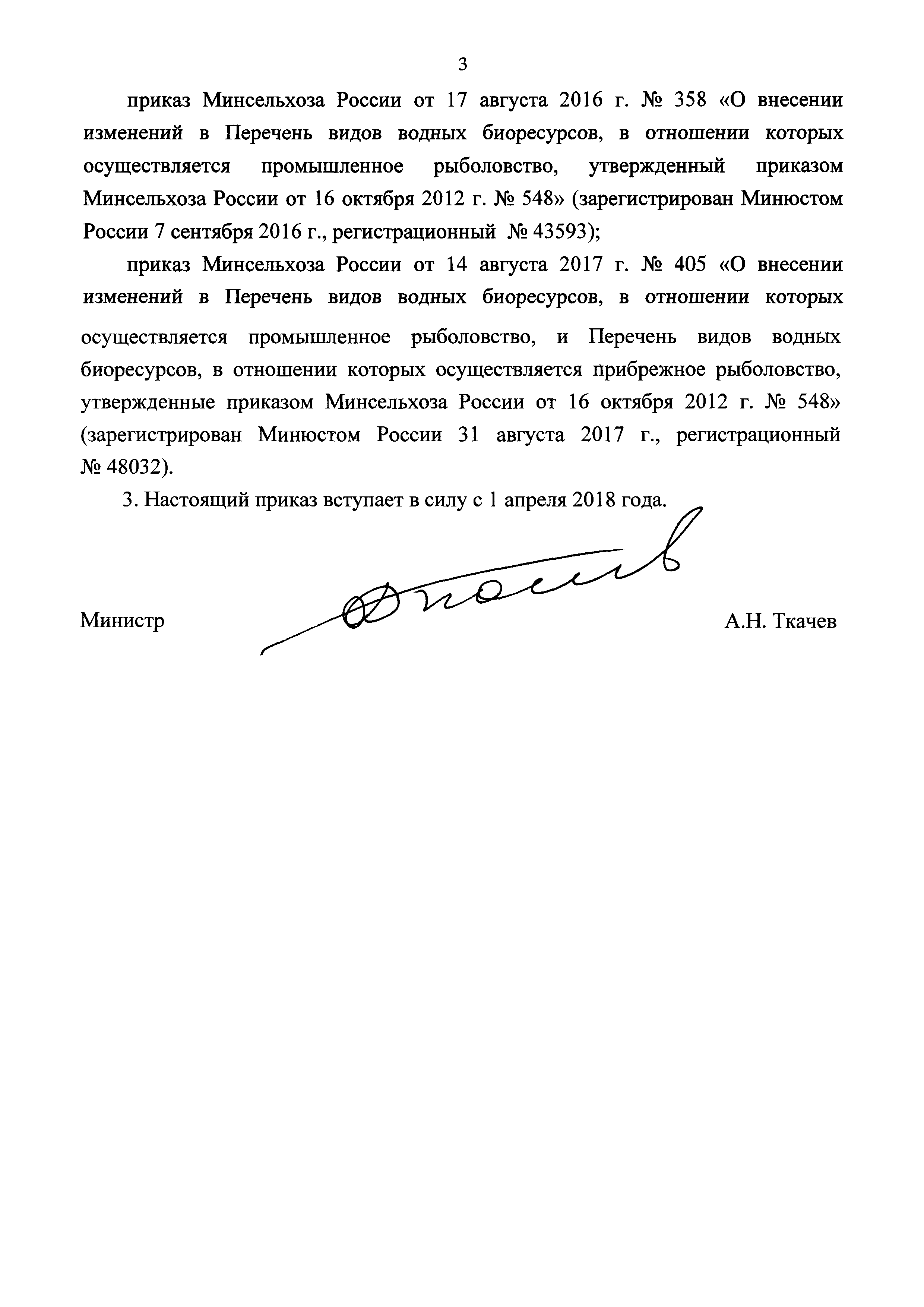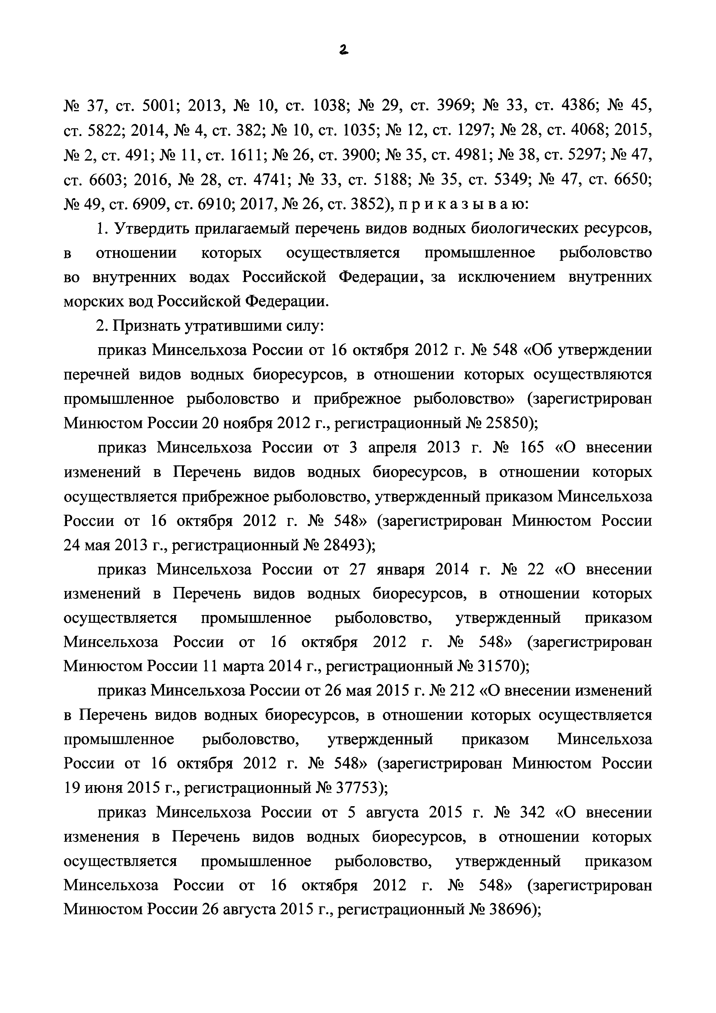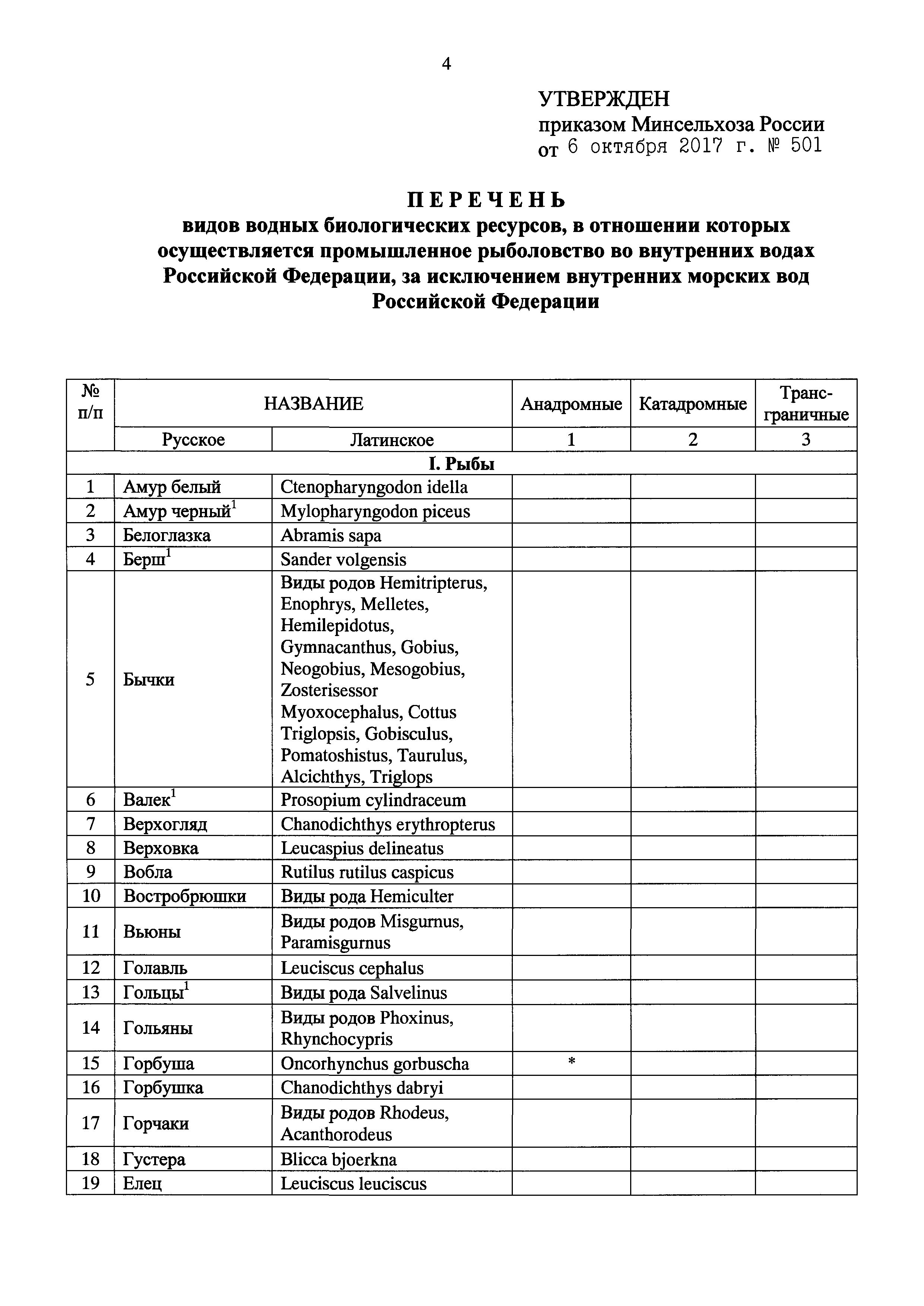 Перечень видов водных биологических ресурсов, в отношении которых осуществляется промышленное рыболовство во внутренних водах Российской Федерации, за исключением внутренних морских вод Российской Федерации| Статус: | действует | | Название рус.: | Перечень видов водных биологических ресурсов, в отношении которых осуществляется промышленное рыболовство во внутренних водах Российской Федерации, за исключением внутренних морских вод Российской Федерации | | Дата добавления в базу: | 01.01.2021 | | Дата актуализации: | 01.01.2021 | | Дата введения: | 01.04.2018 | | Область применения: | Документом определен перечень видов водных биоресурсов, в отношении которых осуществляется промышленное рыболовство во внутренних водах России (кроме внутренних морских вод) | | Утверждён: | 06.10.2017 Министерство сельского хозяйства Российской Федерации (501)