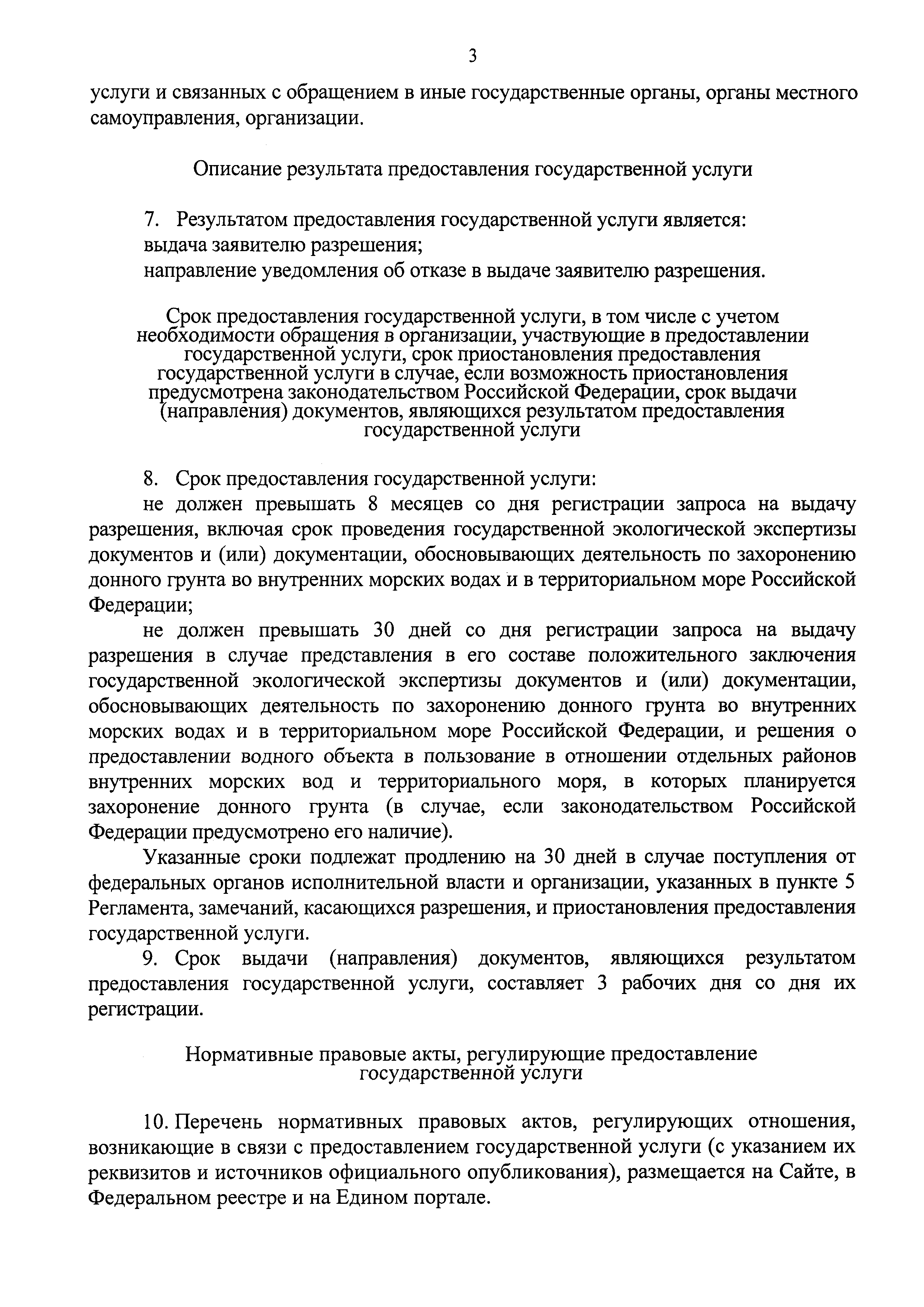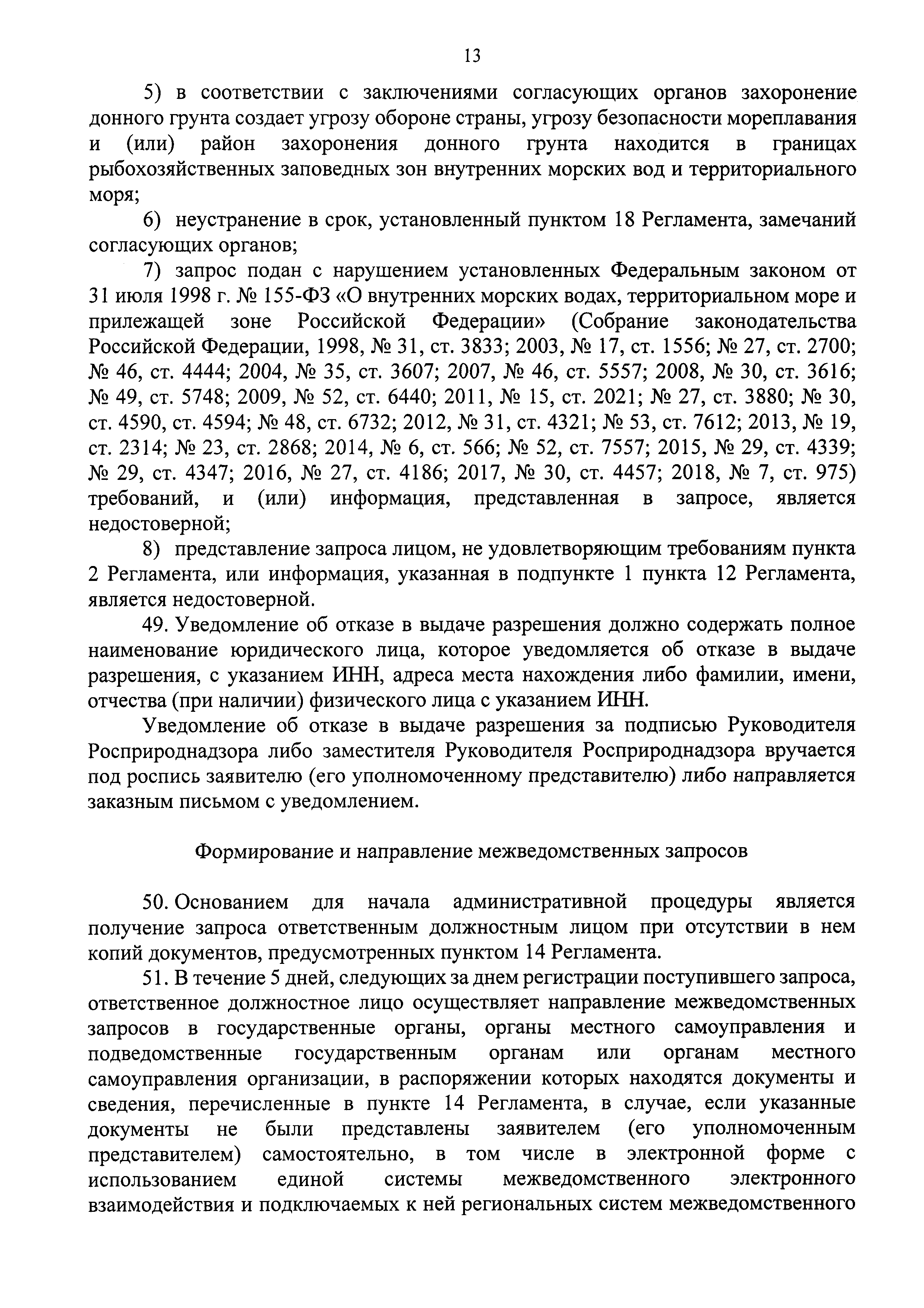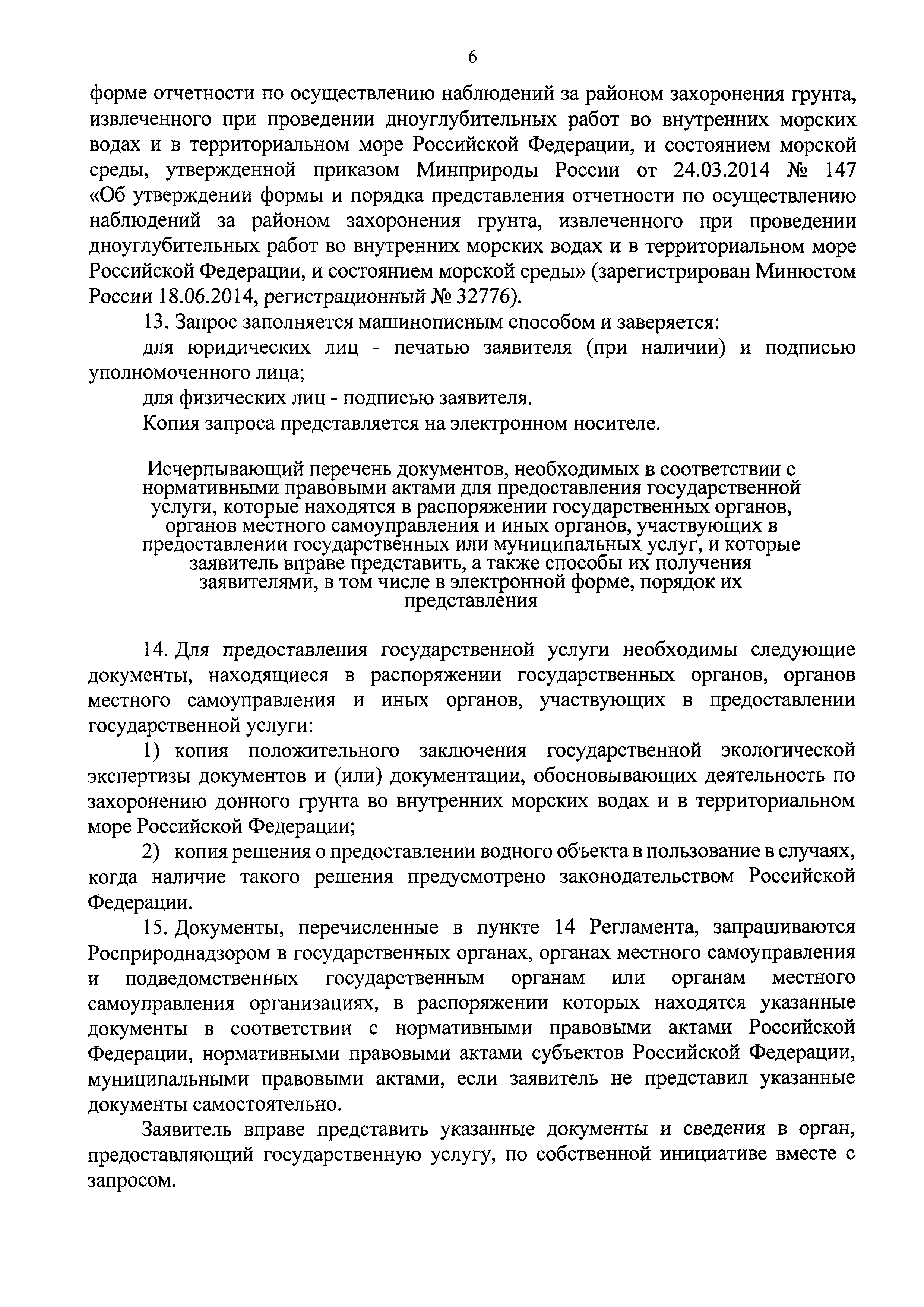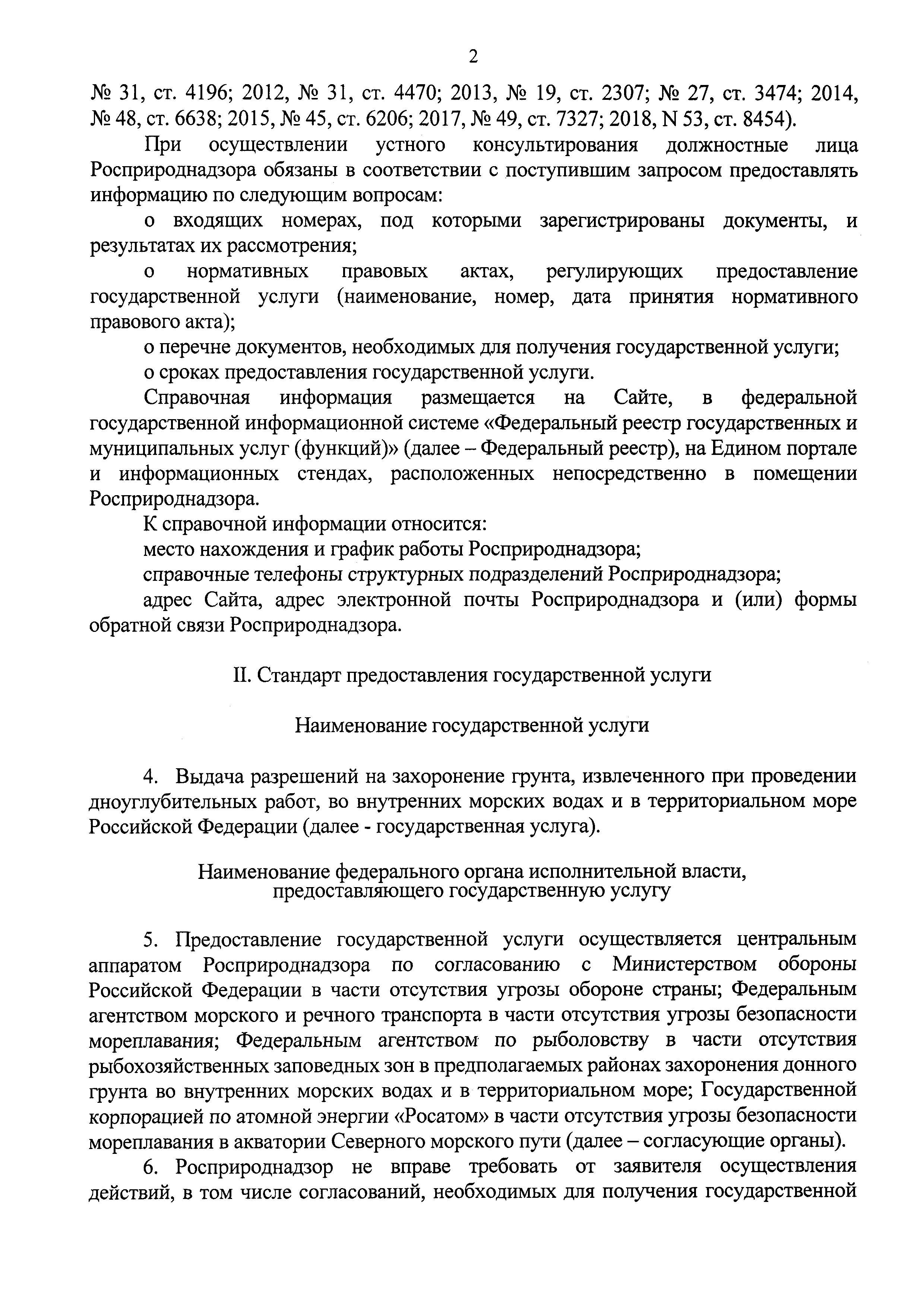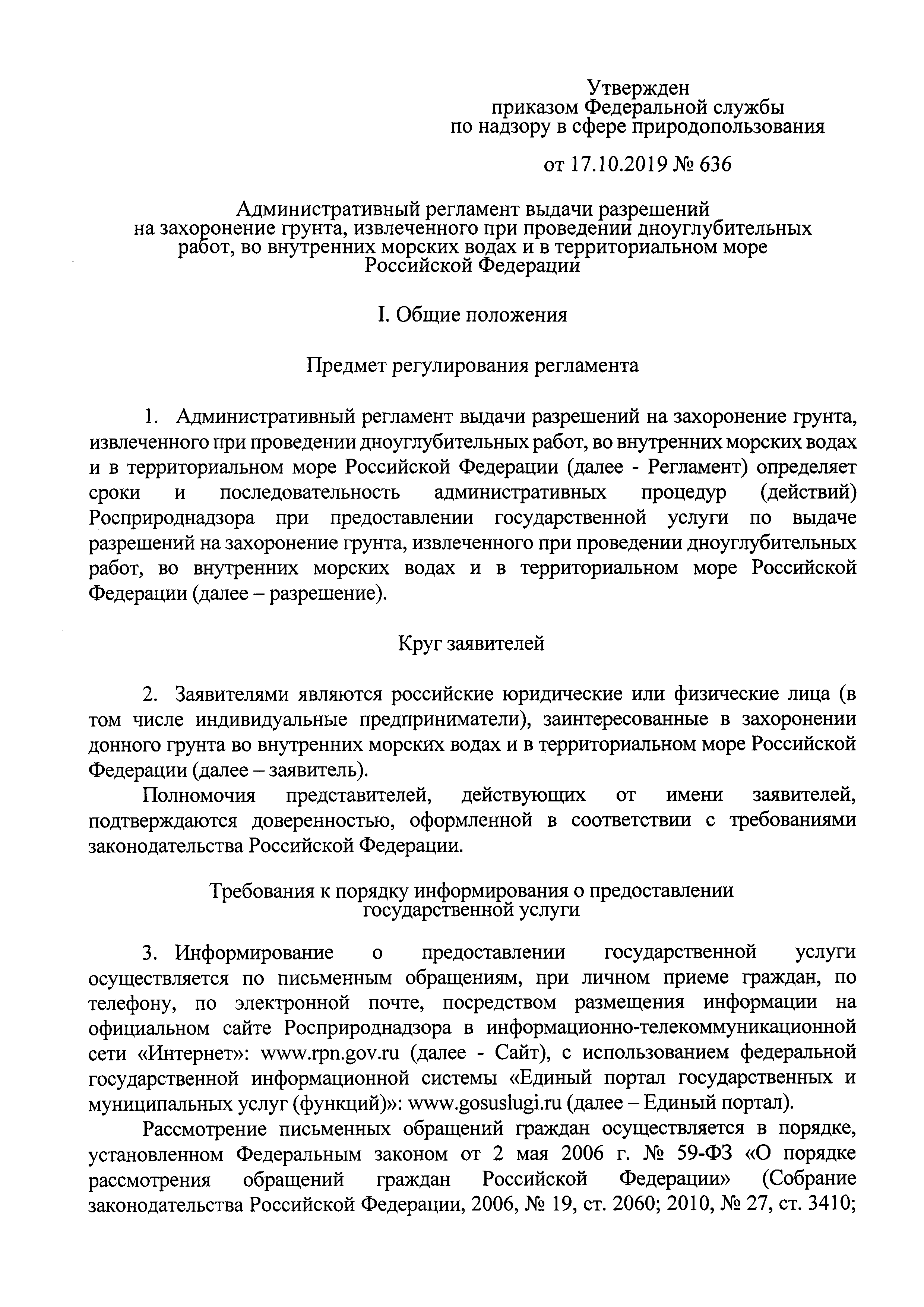| | Нормативные ссылки: |   Федеральный закон 155-ФЗ «О внутренних морских водах, территориальном море и прилежащей зоне Российской Федерации»  Федеральный закон 59-ФЗ «О порядке рассмотрения обращений граждан Российской Федерации» Постановление 373 «О разработке и утверждении административных регламентов осуществления государственного контроля (надзора) и административных регламентов предоставления государственных услуг»  Федеральный закон 210-ФЗ «Об организации предоставления государственных и муниципальных услуг»  Распоряжение 2753-р «Об утверждении перечня загрязняющих веществ, при содержании которых в грунте, извлеченном при проведении дноуглубительных работ, в концентрациях, превышающих химические характеристики грунта в районе его захоронения до воздействия, вызванного захоронением этого грунта, захоронение его во внутренних морских водах и в территориальном море РФ запрещается» «Правила подачи и рассмотрения жалоб на решения и действия (бездействие) федеральных органов исполнительной власти и их должностных лиц, федеральных государственных служащих, должностных лиц государственных внебюджетных фондов Российской Федерации, государственных корпораций, наделенных в соответствии с федеральными законами полномочиями по предоставлению государственных услуг в установленной сфере деятельности, и их должностных лиц, организаций, предусмотренных частью 1.1 статьи 16 Федерального закона "Об организации предоставления государственных и муниципальных услуг", и их работников, а также многофункциональных центров предоставления государственных и муниципальных услуг и их работников» Приказ 147 «Об утверждении формы и порядка представления отчетности по осуществлению наблюдений за районом захоронения грунта, извлеченного при проведении дноуглубительных работ во внутренних морских водах и в территориальном море Российской Федерации, и состоянием морской среды»