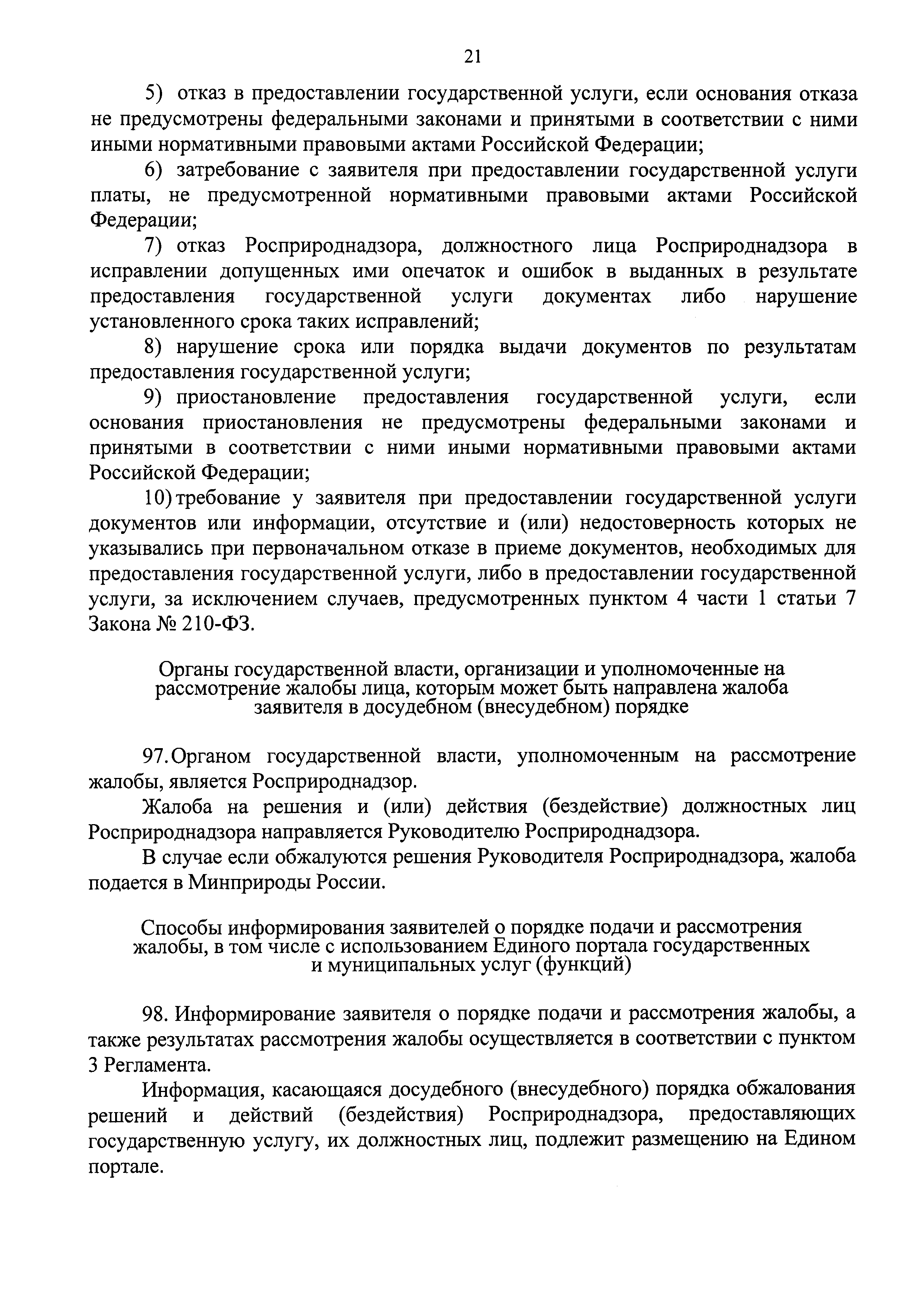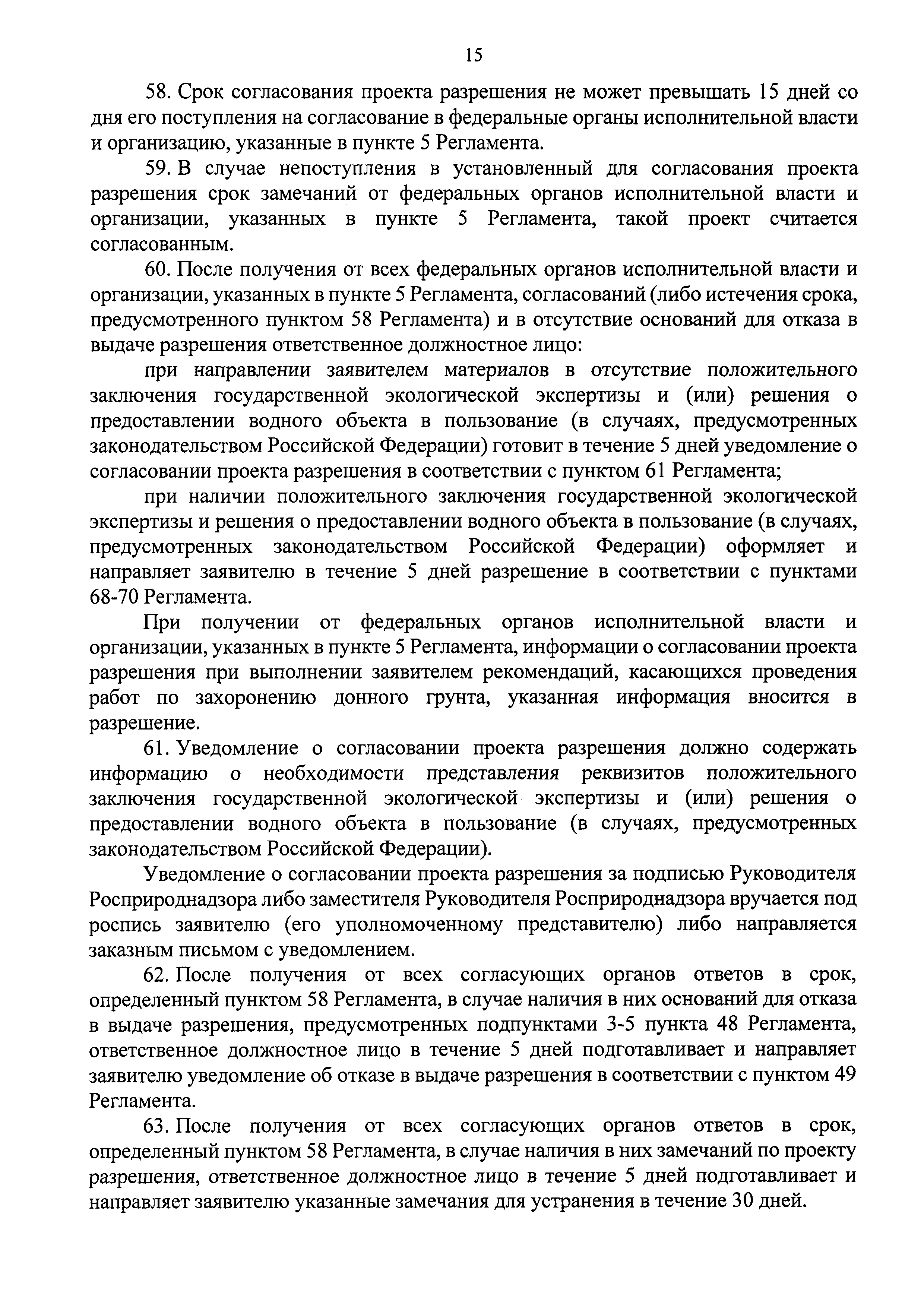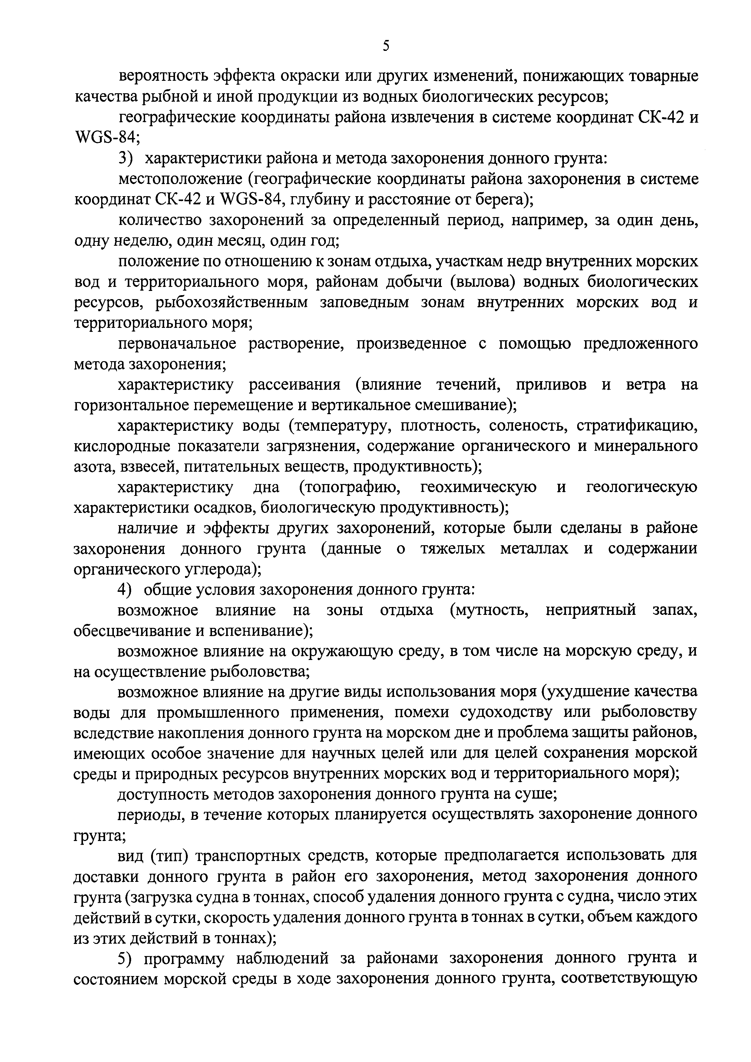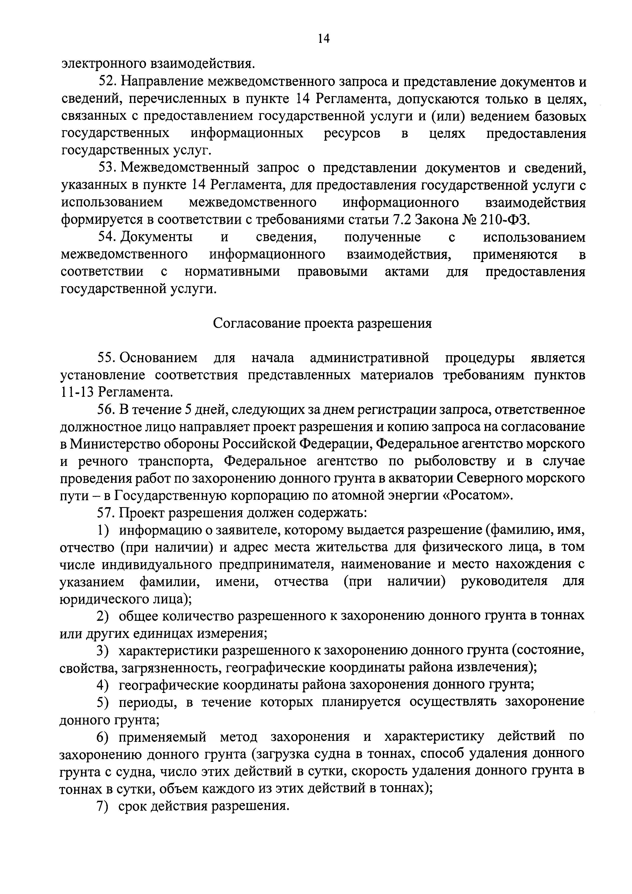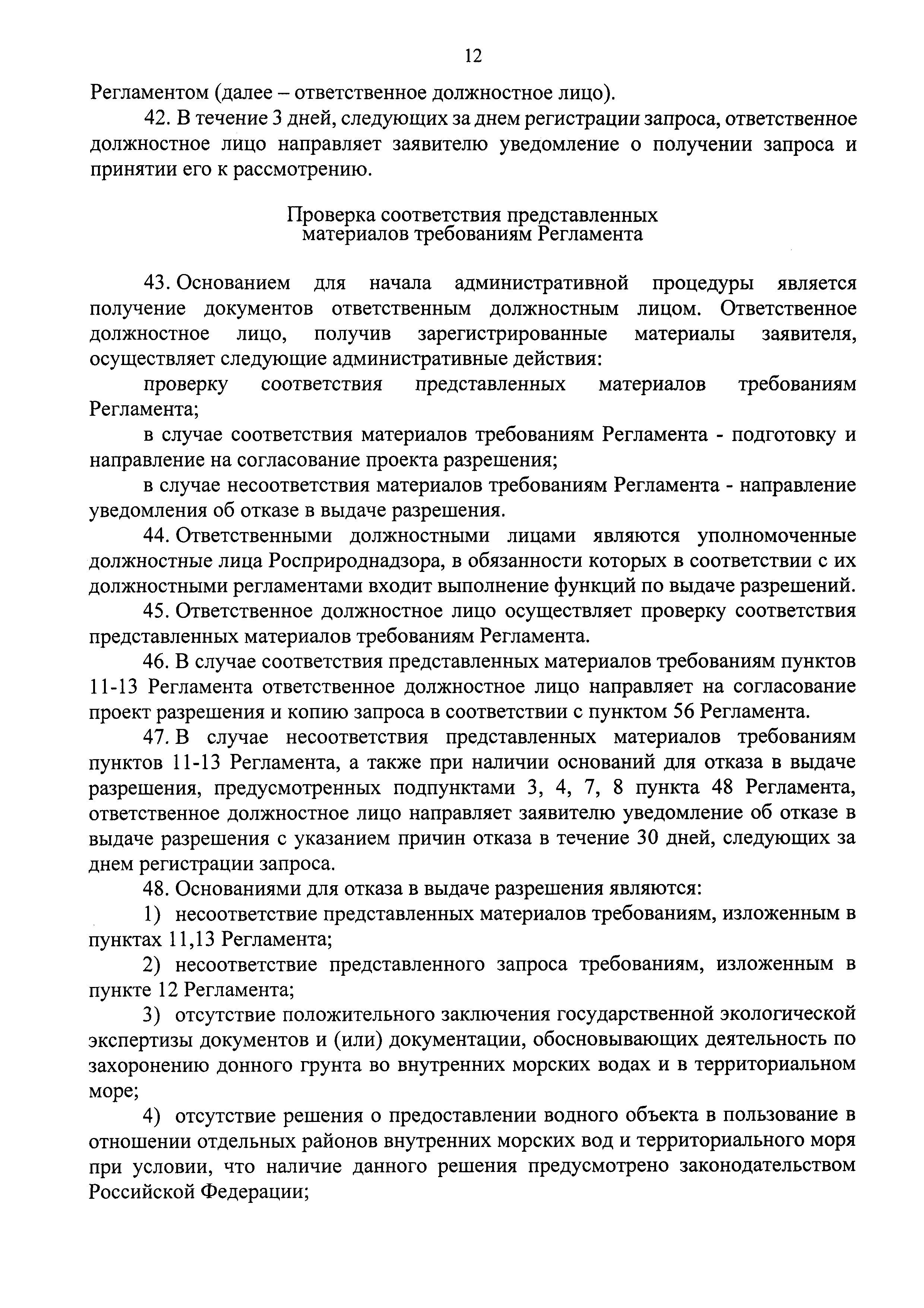 | | Нормативные ссылки: |   Федеральный закон 155-ФЗ «О внутренних морских водах, территориальном море и прилежащей зоне Российской Федерации»  Федеральный закон 59-ФЗ «О порядке рассмотрения обращений граждан Российской Федерации» Постановление 373 «О разработке и утверждении административных регламентов осуществления государственного контроля (надзора) и административных регламентов предоставления государственных услуг»  Федеральный закон 210-ФЗ «Об организации предоставления государственных и муниципальных услуг»  Распоряжение 2753-р «Об утверждении перечня загрязняющих веществ, при содержании которых в грунте, извлеченном при проведении дноуглубительных работ, в концентрациях, превышающих химические характеристики грунта в районе его захоронения до воздействия, вызванного захоронением этого грунта, захоронение его во внутренних морских водах и в территориальном море РФ запрещается» «Правила подачи и рассмотрения жалоб на решения и действия (бездействие) федеральных органов исполнительной власти и их должностных лиц, федеральных государственных служащих, должностных лиц государственных внебюджетных фондов Российской Федерации, государственных корпораций, наделенных в соответствии с федеральными законами полномочиями по предоставлению государственных услуг в установленной сфере деятельности, и их должностных лиц, организаций, предусмотренных частью 1.1 статьи 16 Федерального закона "Об организации предоставления государственных и муниципальных услуг", и их работников, а также многофункциональных центров предоставления государственных и муниципальных услуг и их работников» Приказ 147 «Об утверждении формы и порядка представления отчетности по осуществлению наблюдений за районом захоронения грунта, извлеченного при проведении дноуглубительных работ во внутренних морских водах и в территориальном море Российской Федерации, и состоянием морской среды»