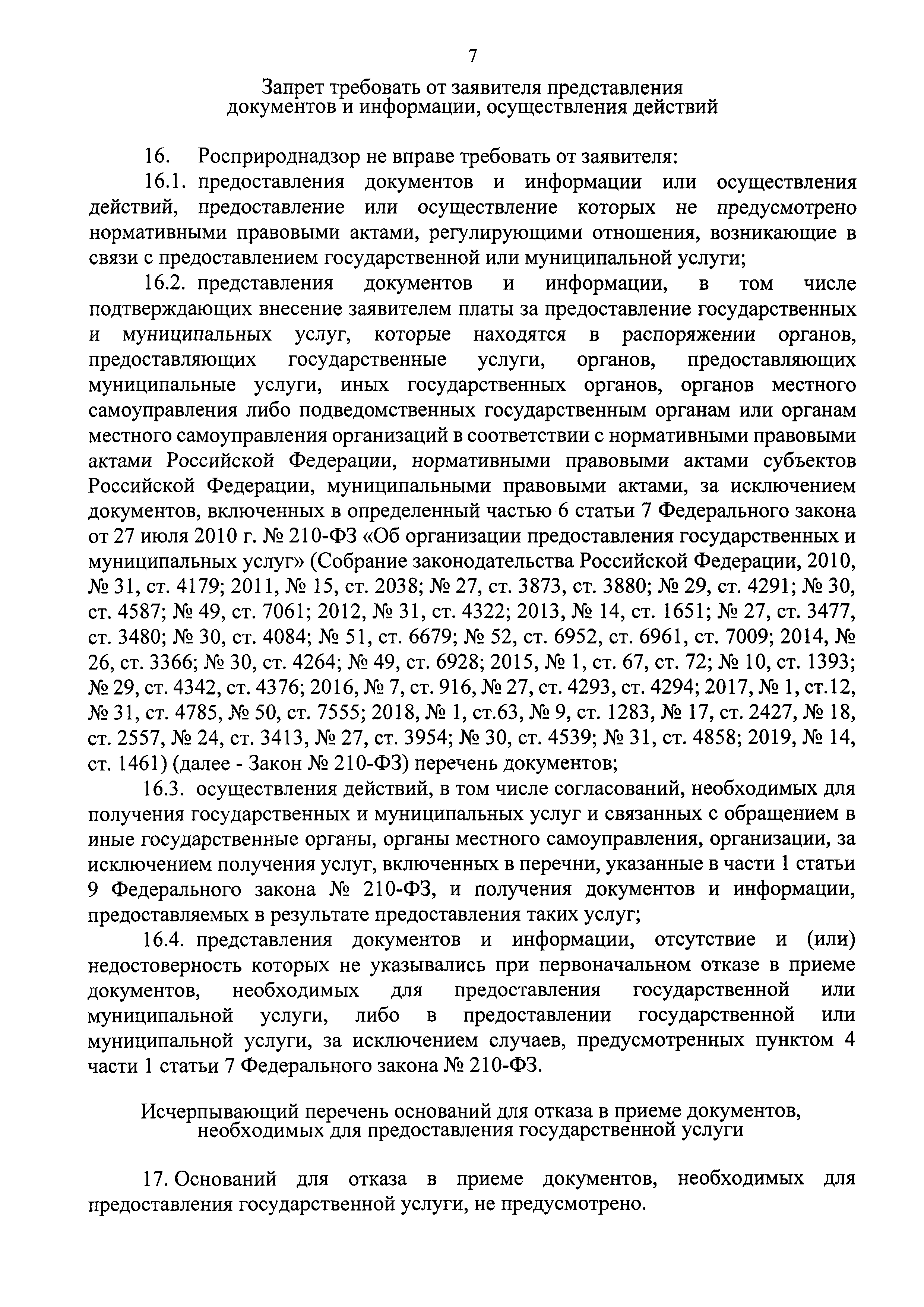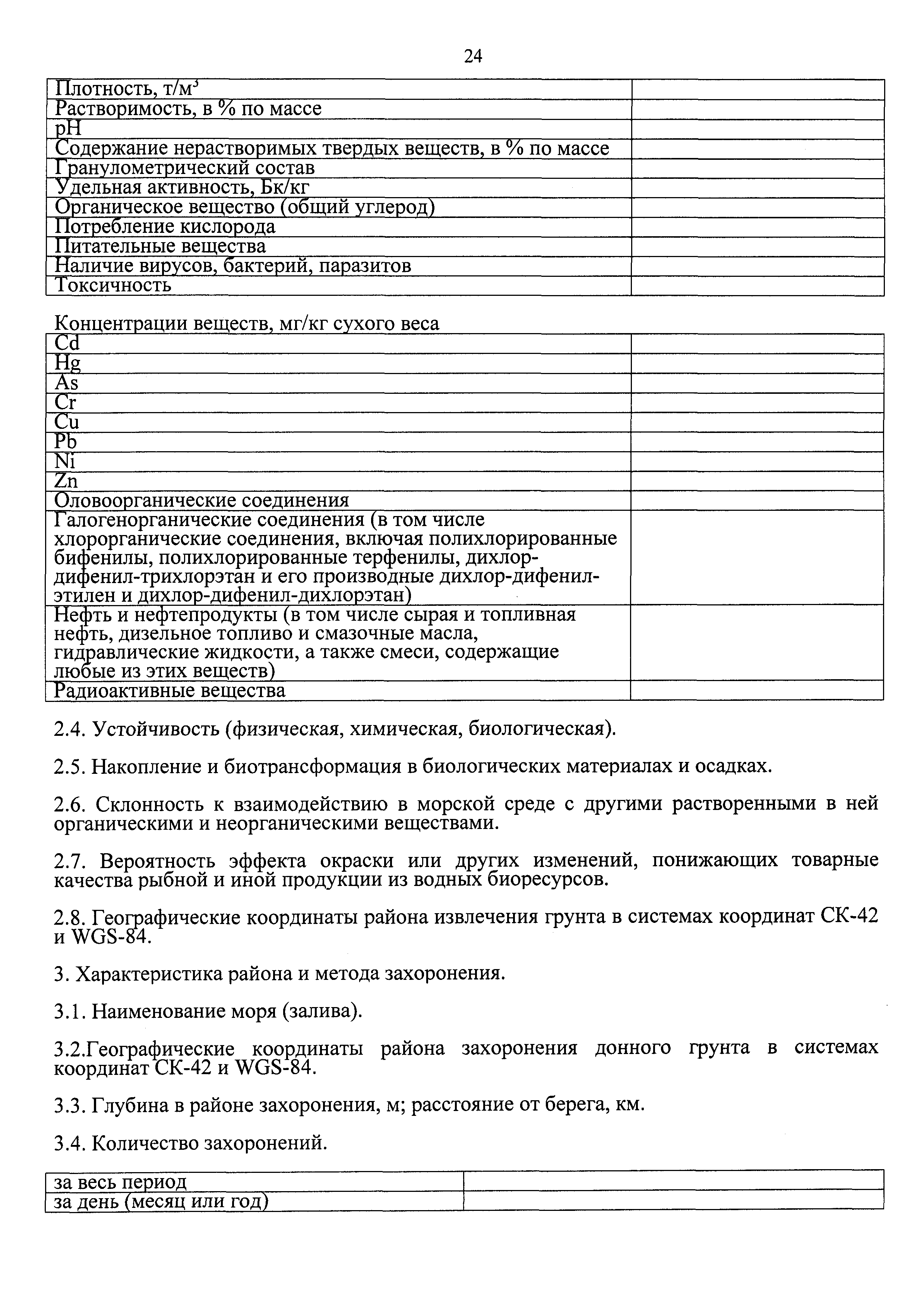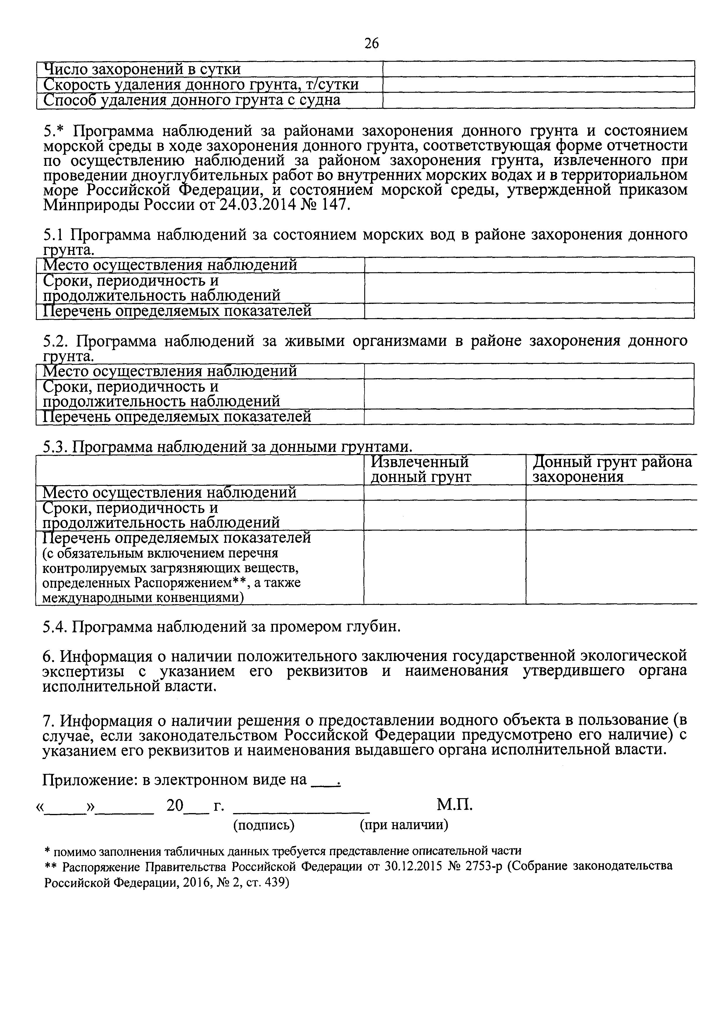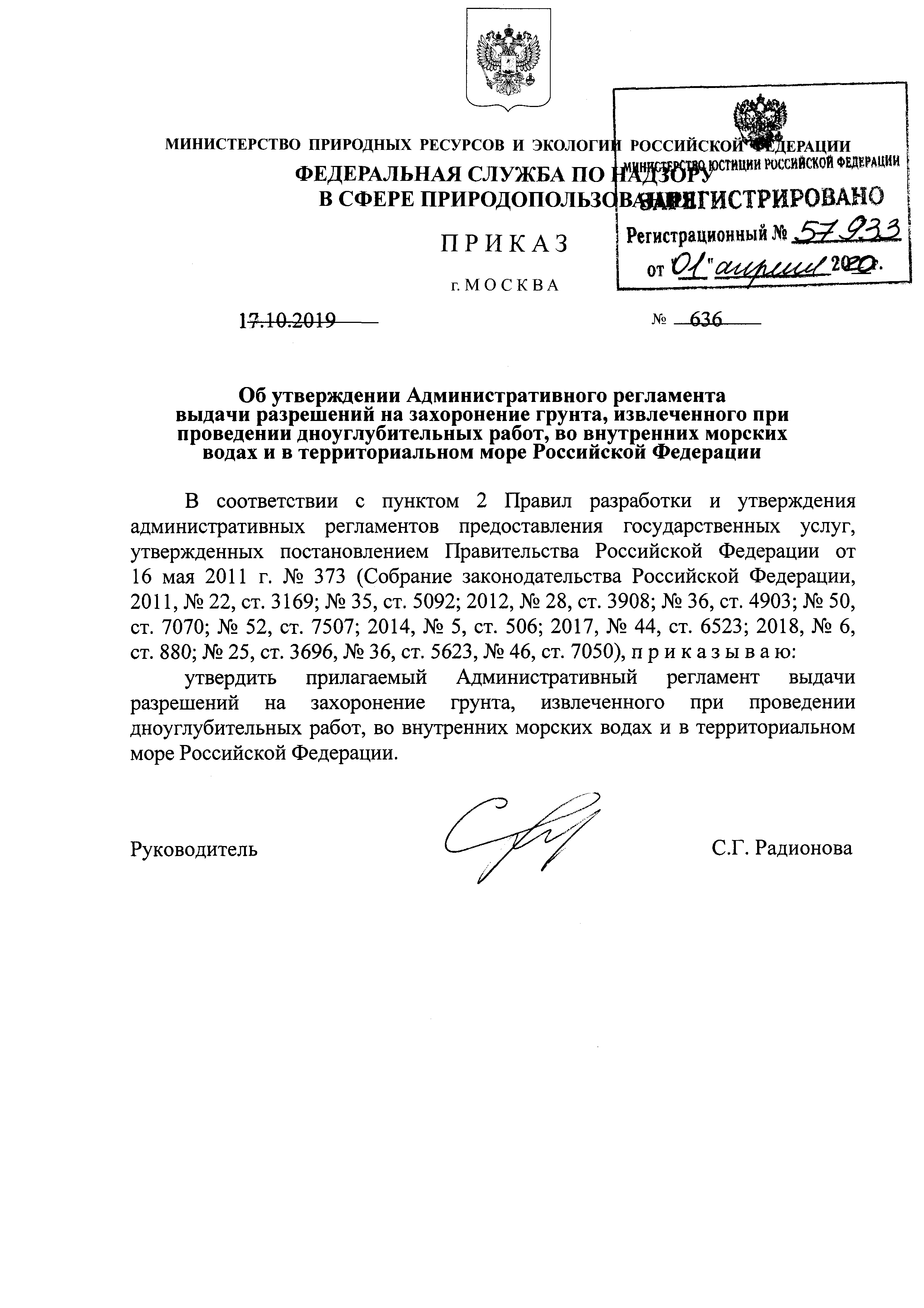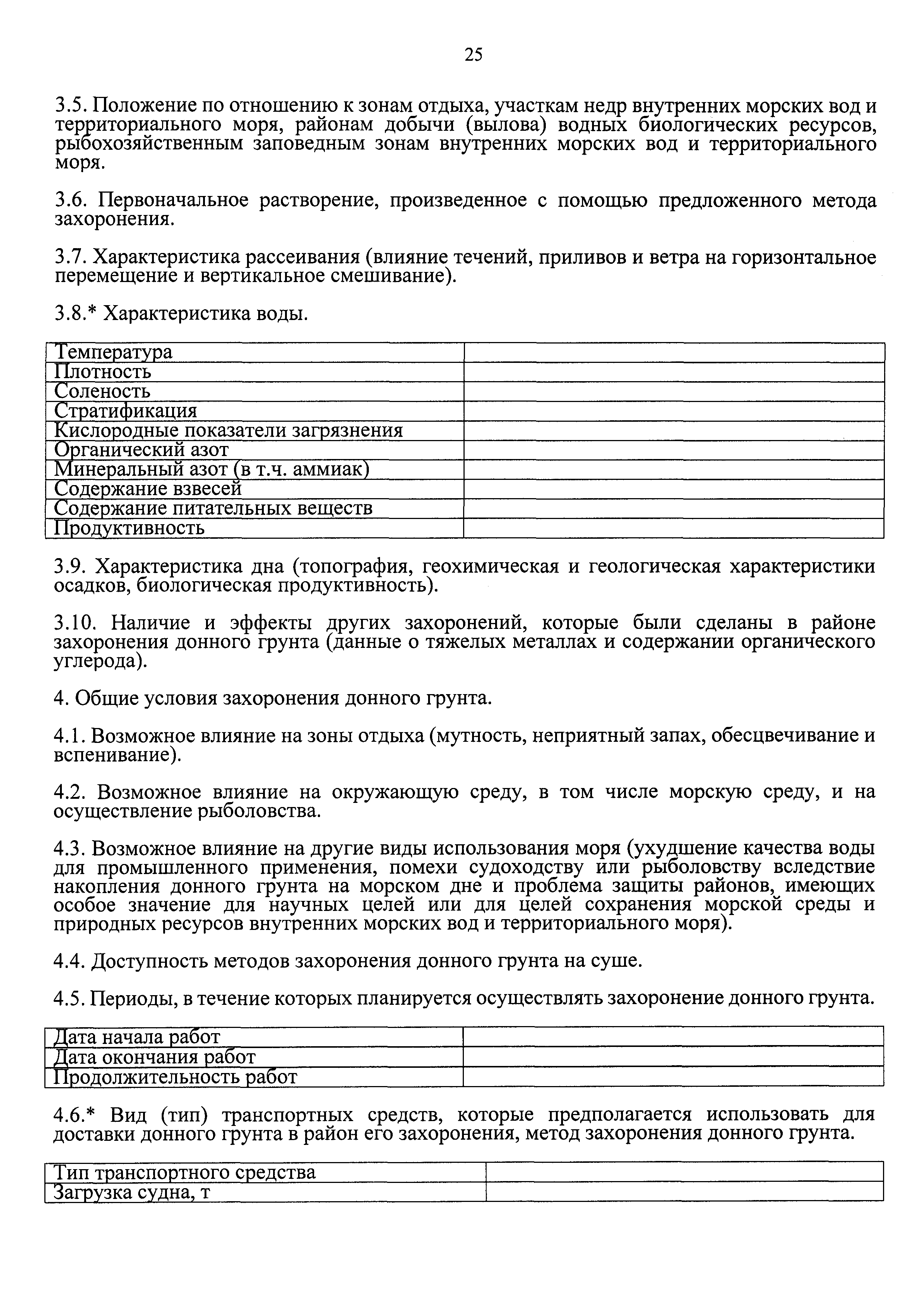 | | Нормативные ссылки: |   Федеральный закон 155-ФЗ «О внутренних морских водах, территориальном море и прилежащей зоне Российской Федерации»  Федеральный закон 59-ФЗ «О порядке рассмотрения обращений граждан Российской Федерации» Постановление 373 «О разработке и утверждении административных регламентов осуществления государственного контроля (надзора) и административных регламентов предоставления государственных услуг»  Федеральный закон 210-ФЗ «Об организации предоставления государственных и муниципальных услуг»  Распоряжение 2753-р «Об утверждении перечня загрязняющих веществ, при содержании которых в грунте, извлеченном при проведении дноуглубительных работ, в концентрациях, превышающих химические характеристики грунта в районе его захоронения до воздействия, вызванного захоронением этого грунта, захоронение его во внутренних морских водах и в территориальном море РФ запрещается» «Правила подачи и рассмотрения жалоб на решения и действия (бездействие) федеральных органов исполнительной власти и их должностных лиц, федеральных государственных служащих, должностных лиц государственных внебюджетных фондов Российской Федерации, государственных корпораций, наделенных в соответствии с федеральными законами полномочиями по предоставлению государственных услуг в установленной сфере деятельности, и их должностных лиц, организаций, предусмотренных частью 1.1 статьи 16 Федерального закона "Об организации предоставления государственных и муниципальных услуг", и их работников, а также многофункциональных центров предоставления государственных и муниципальных услуг и их работников» Приказ 147 «Об утверждении формы и порядка представления отчетности по осуществлению наблюдений за районом захоронения грунта, извлеченного при проведении дноуглубительных работ во внутренних морских водах и в территориальном море Российской Федерации, и состоянием морской среды»