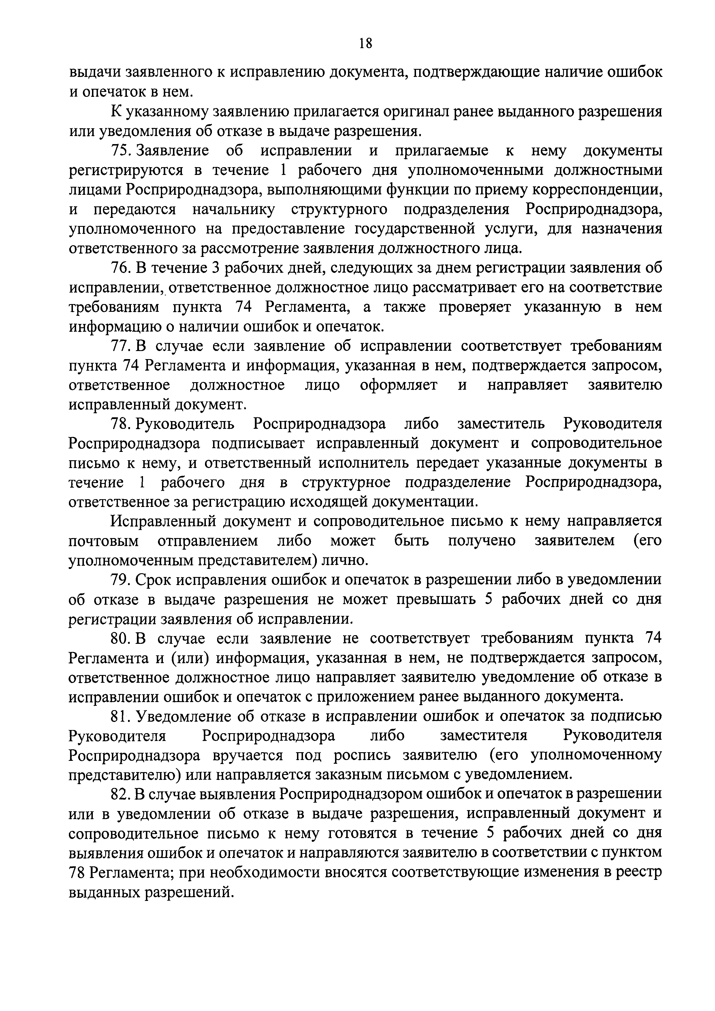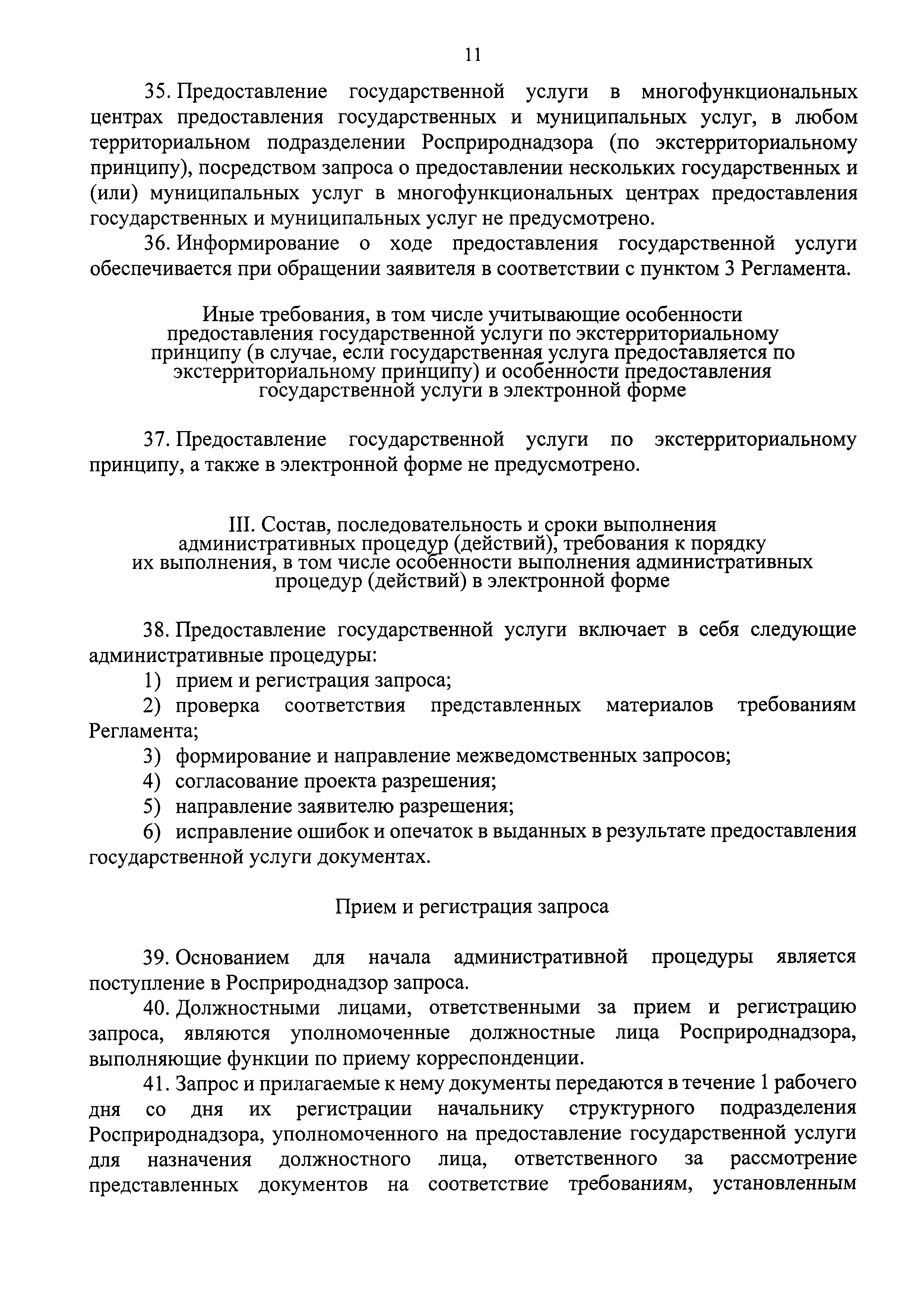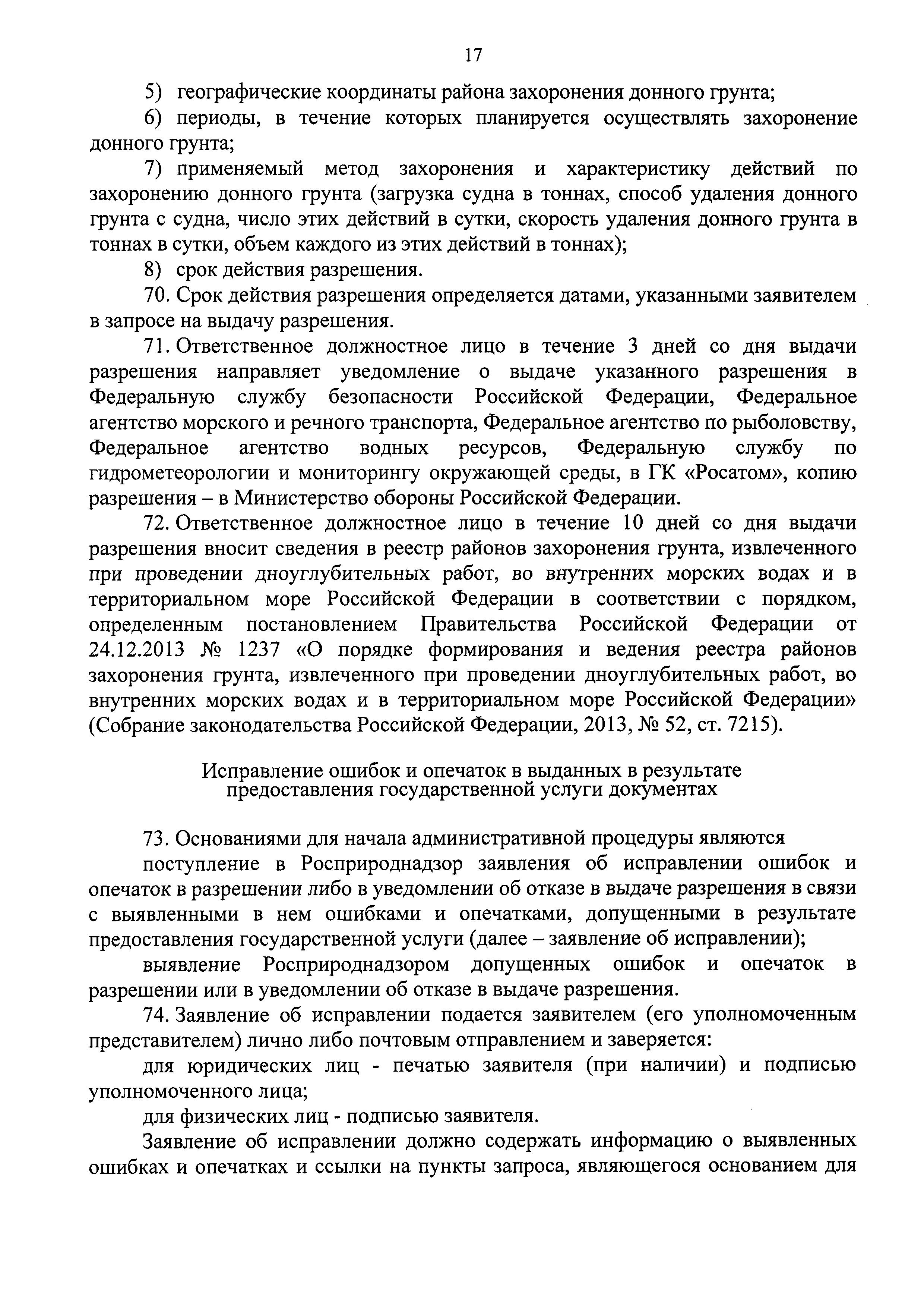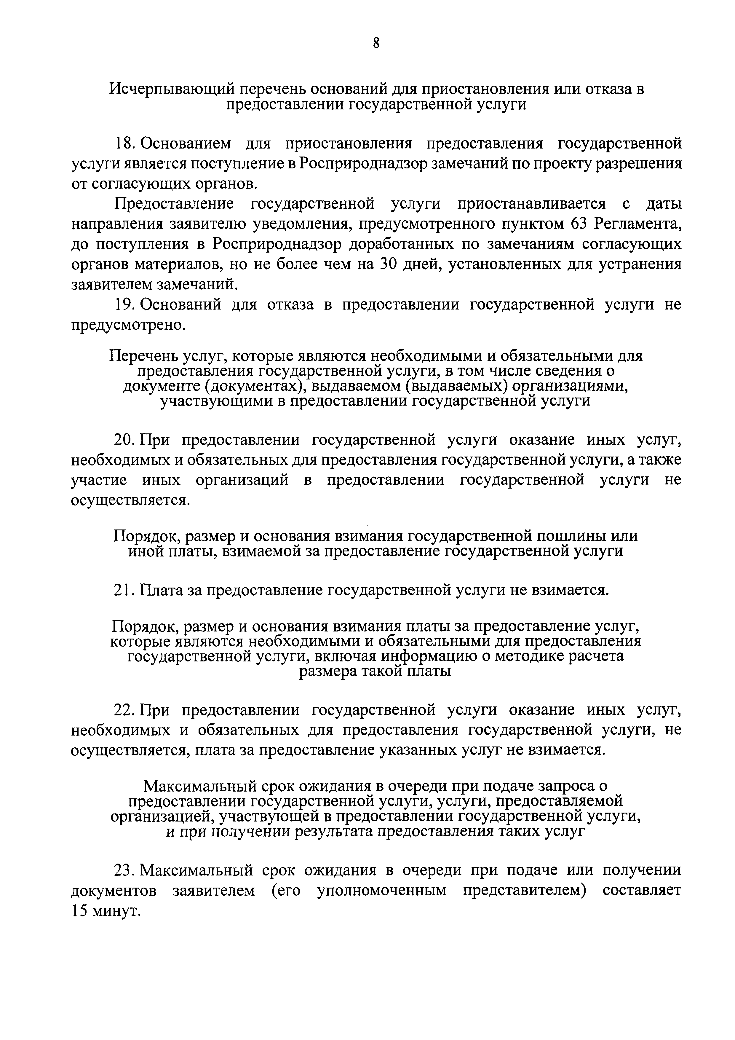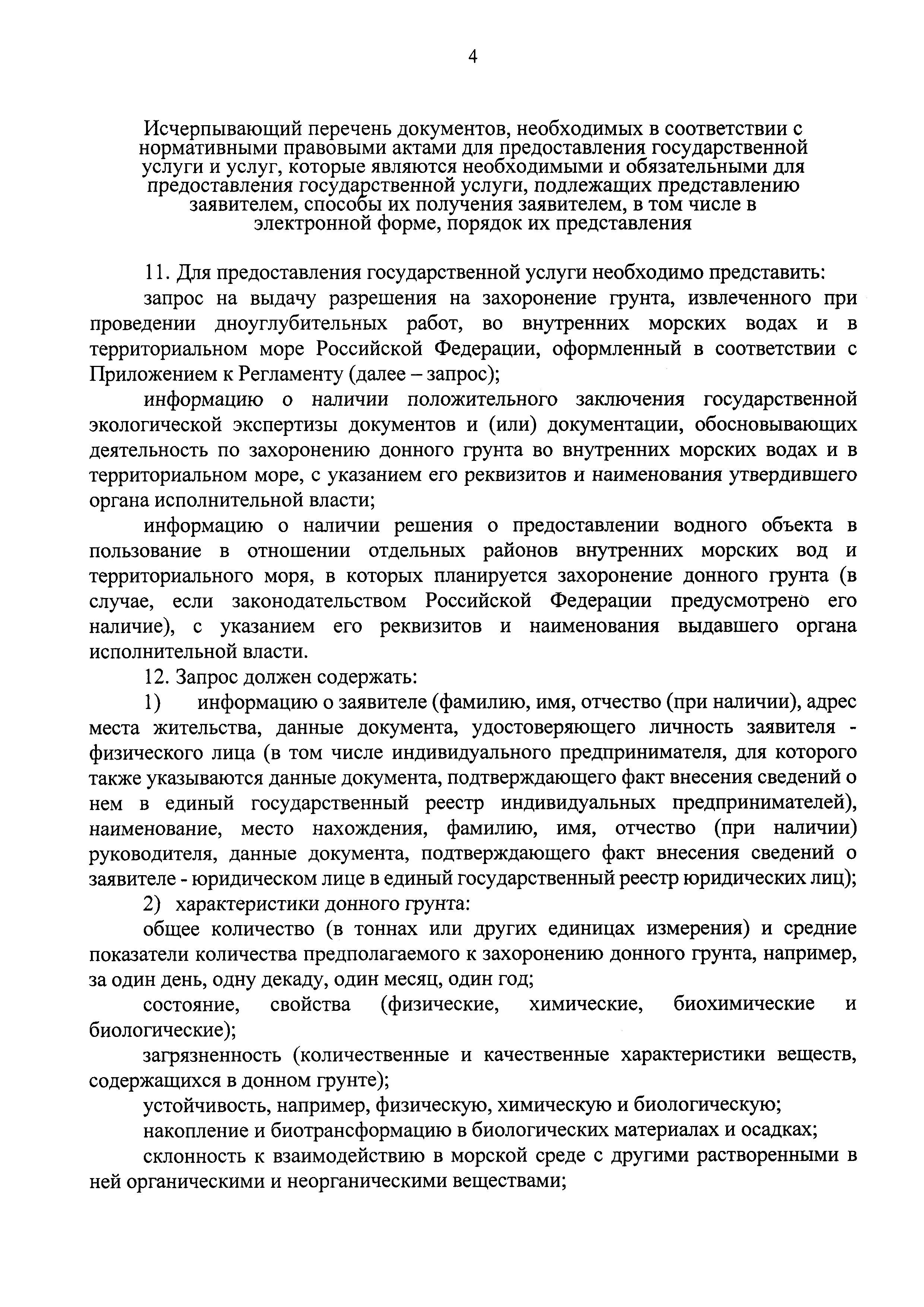 Административный регламент выдачи разрешений на захоронение грунта, извлеченного при проведении дноуглубительных работ, во внутренних морских водах и в территориальном море Российской Федерации| Статус: | действует | | Название рус.: | Административный регламент выдачи разрешений на захоронение грунта, извлеченного при проведении дноуглубительных работ, во внутренних морских водах и в территориальном море Российской Федерации | | Дата добавления в базу: | 01.01.2021 | | Дата актуализации: | 01.01.2021 | | Дата введения: | 12.04.2020 | | Область применения: | Административный регламент выдачи разрешений на захоронение грунта, извлеченного при проведении дноуглубительных работ, во внутренних морских водах и в территориальном море Российской Федерации определяет сроки и последовательность административных процедур (действий) Росприроднадзора при предоставлении государственной услуги по выдаче разрешений на захоронение грунта, извлеченного при проведении дноуглубительных работ, во внутренних морских водах и в территориальном море Российской Федерации | | Оглавление: | I. Общие положения II. Стандарт предоставления государственной услуги III. Состав, последовательность и сроки выполнения административных процедур (действий), требования к порядку их выполнения, в том числе особенности выполнения административных процедур (действий) в электронной форме IV. Формы контроля за предоставлением государственной услуги V. Досудебный (внесудебный) порядок обжалования решений и действий (бездействия) органа, предоставляющего государственную услугу, а также его должностных лиц Приложение. Форма запроса на выдачу разрешения на захоронение грунта, извлеченного при проведении дноуглубительных работ, во внутренних морских водах и в территориальном море Российской Федерации | | Утверждён: | 17.10.2019 Федеральная служба по надзору в сфере природопользования (636)