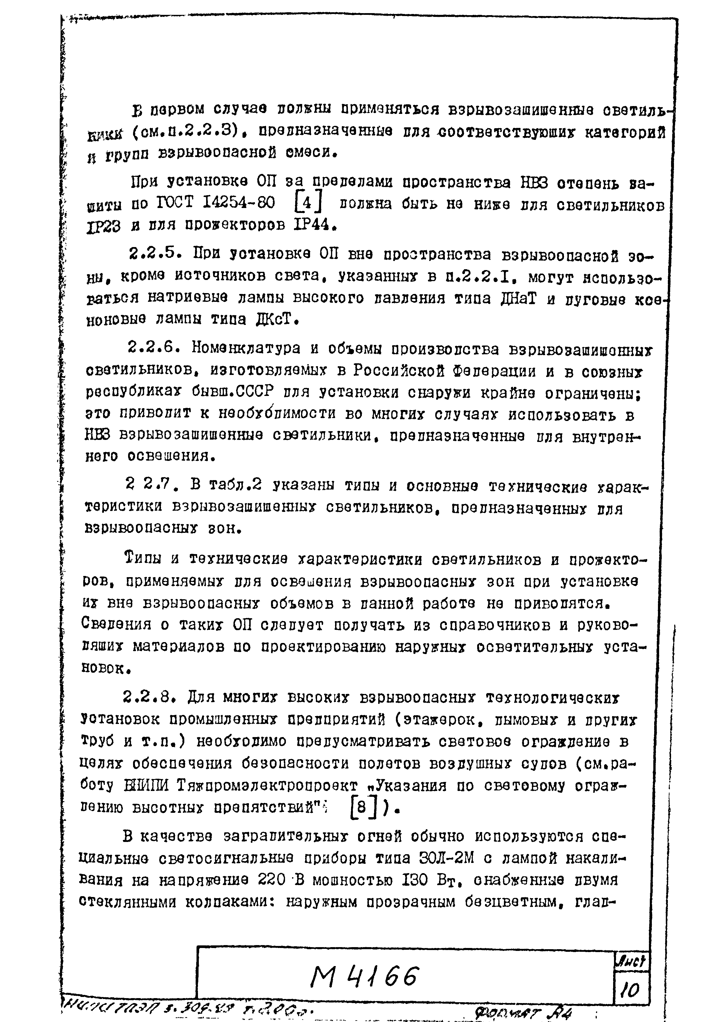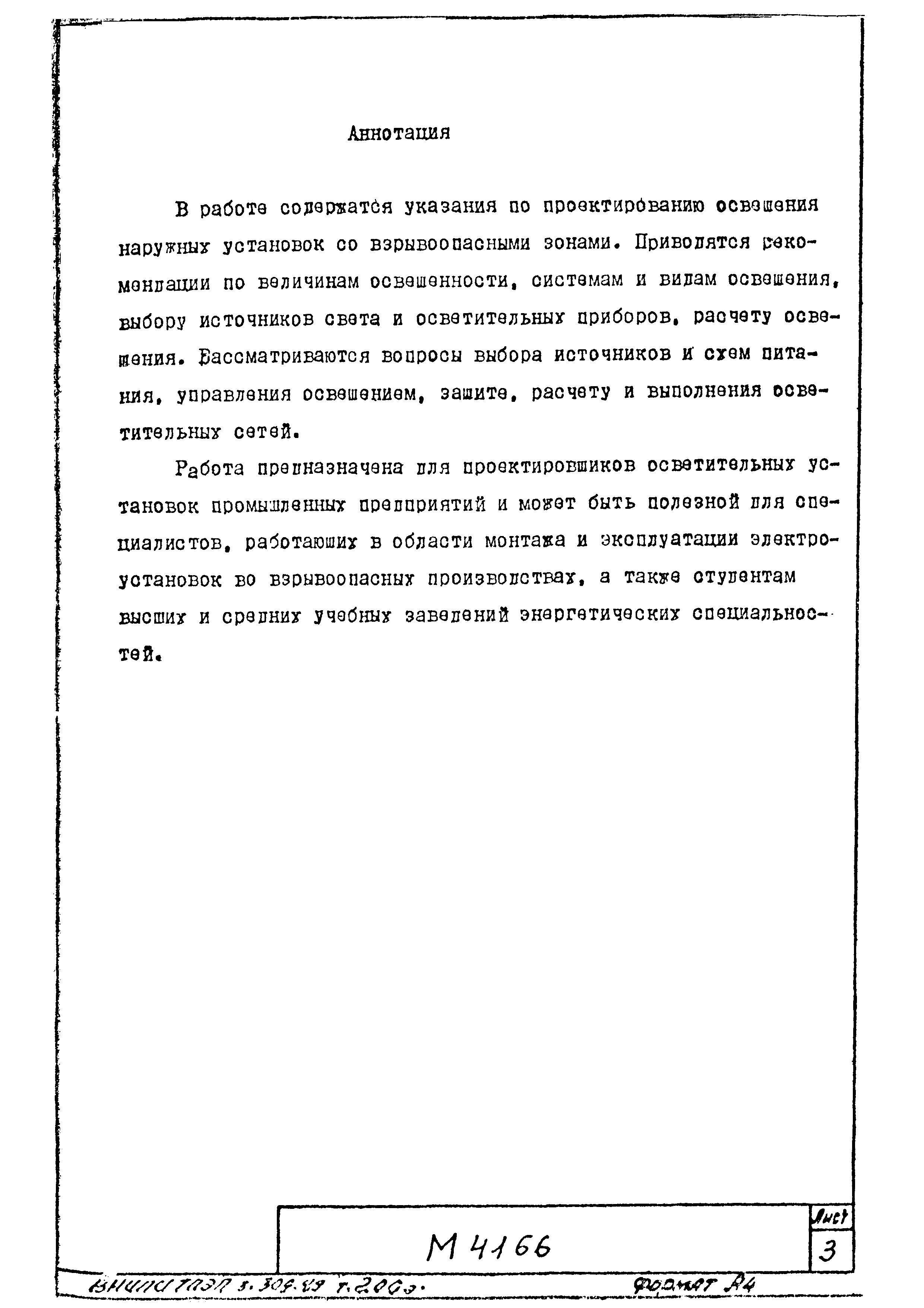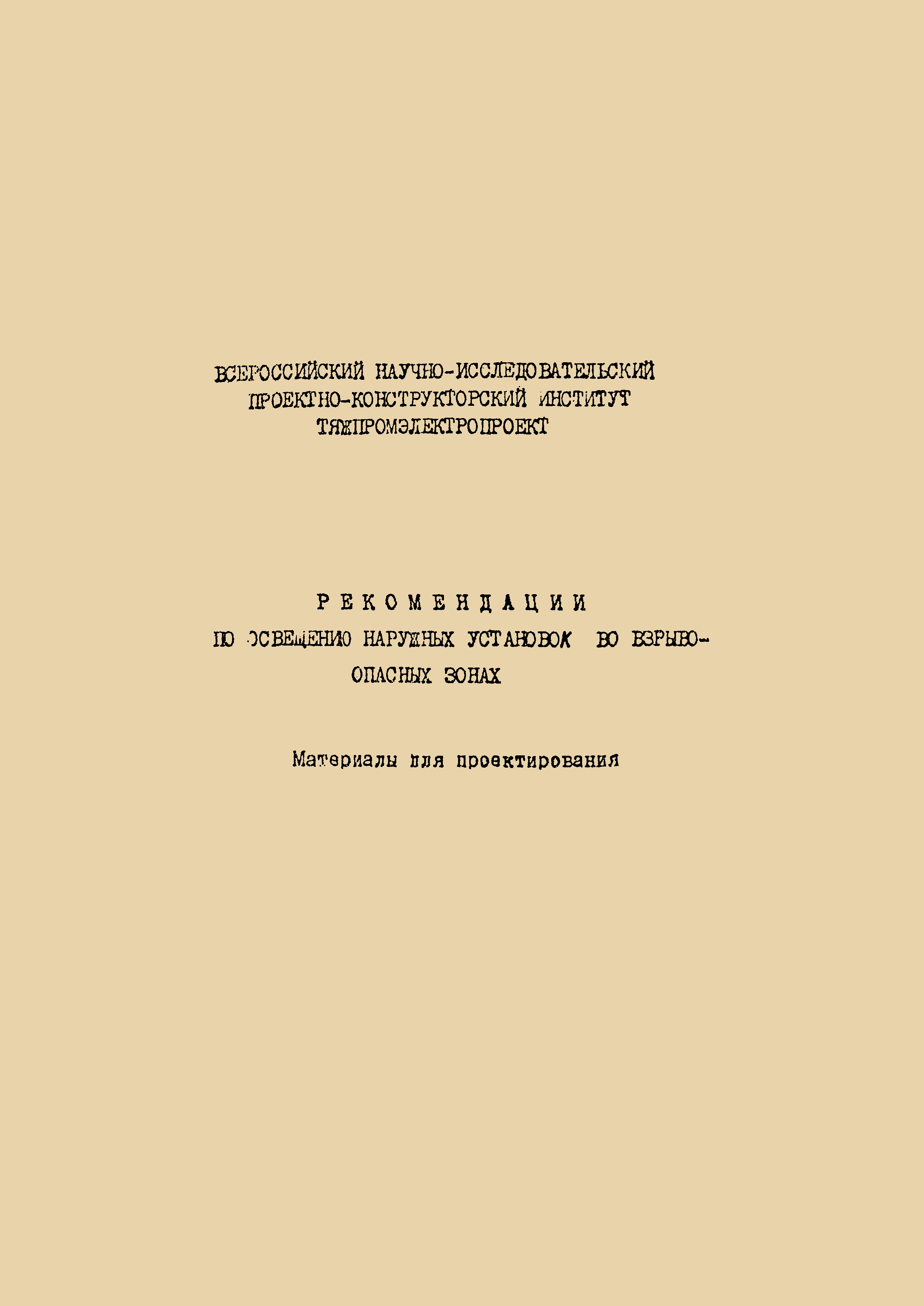Рекомендации по освещению наружных установок во взрывоопасных зонах. Материалы для проектирования| Статус: | справочные материалы, мп, тпр | | Название рус.: | Рекомендации по освещению наружных установок во взрывоопасных зонах. Материалы для проектирования | | Дата добавления в базу: | 01.01.2021 | | Дата актуализации: | 01.01.2021 | | Область применения: | В работе содержатся указания по проектированию освещения наружных установок со взрывоопасными зонами. Приводятся рекомендации по величинам освещенности, системам и видам освещения, выбору источников света и осветительных приборов, расчету освещения. Рассматриваются вопросы выбора источников и схем питания, управления освещением, защите, расчету и выполнения осветительных сетей. Работа предназначена для проектировщиков осветительных установок промышленных предприятий и может быть полезной для специалистов, работающих в области монтажа и эксплуатации электроустановок во взрывоопасных производствах, а также студентам высших и средних учебных заведений энергетических специальностей | | Оглавление: | Титульный лист Заглавный лист Аннотация Раздел 1. Общие положения 1.1 Область применения 1.2 Характеристике наружных взрывоопасных зон Раздел 2. Светотехническая часть 2.1 Нормы освещенности, системы, виды освещения 2.2 Источники света. Осветительные приборы 2.3 Размещение осветительных приборов, рсчет освещения Раздел 3. Электротехническая часть 3.1 Источники, схемы питания 3.2 Защита сетей 3.3 Управление освещением 3.4 Расчеты сетей 3.5 Выполнение сетей 3.6 Зануление и заземление Принятые сокращения Список литерауры | | Разработан: | ПКИ Тяжпромэлектропроект