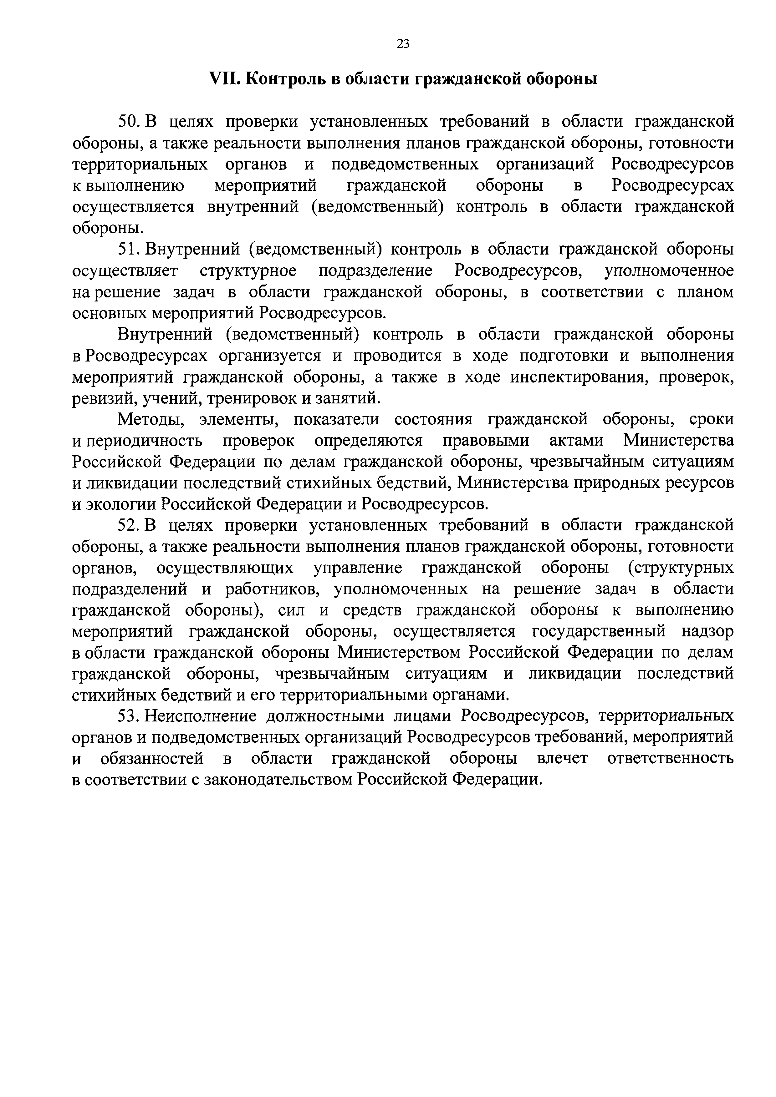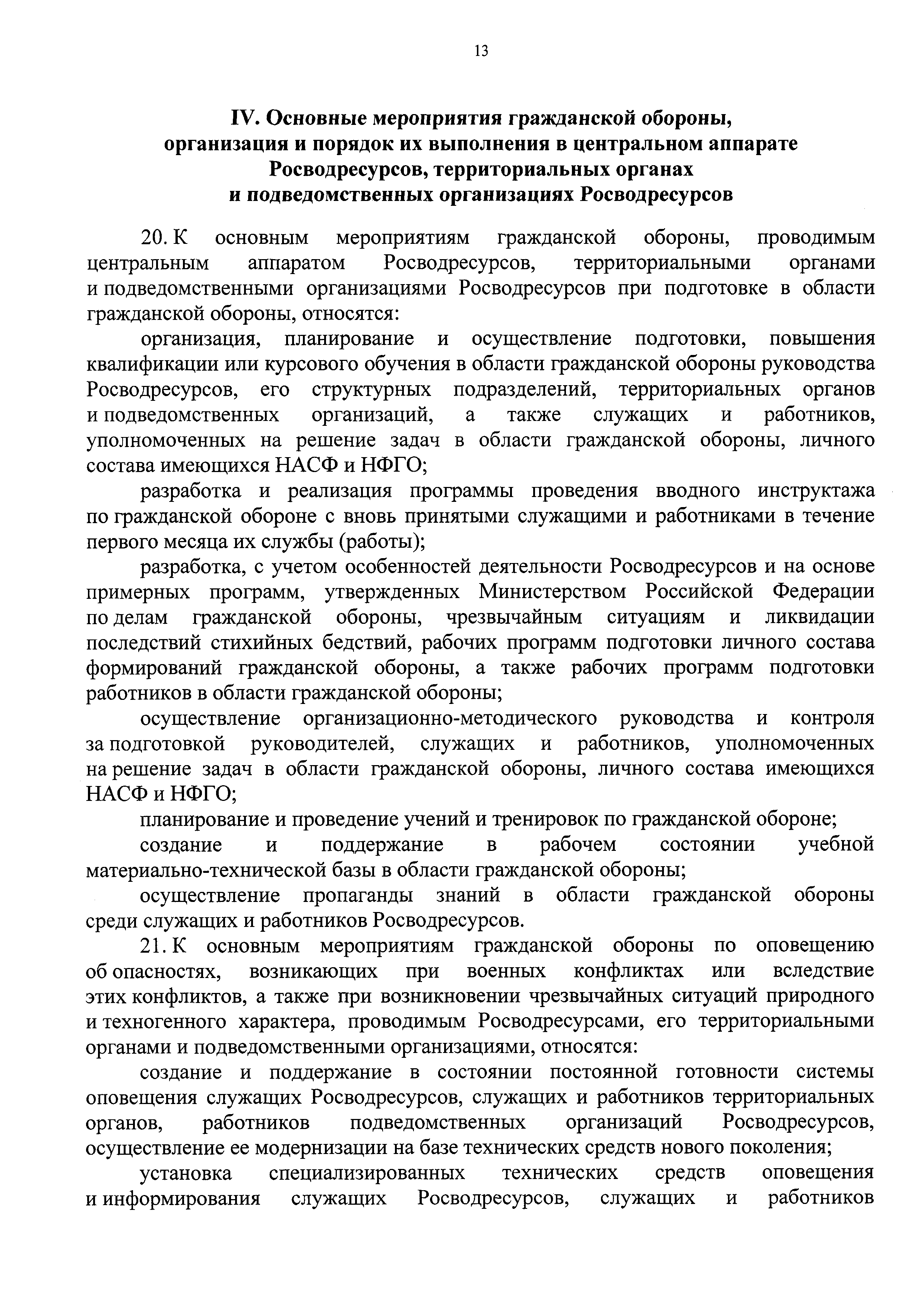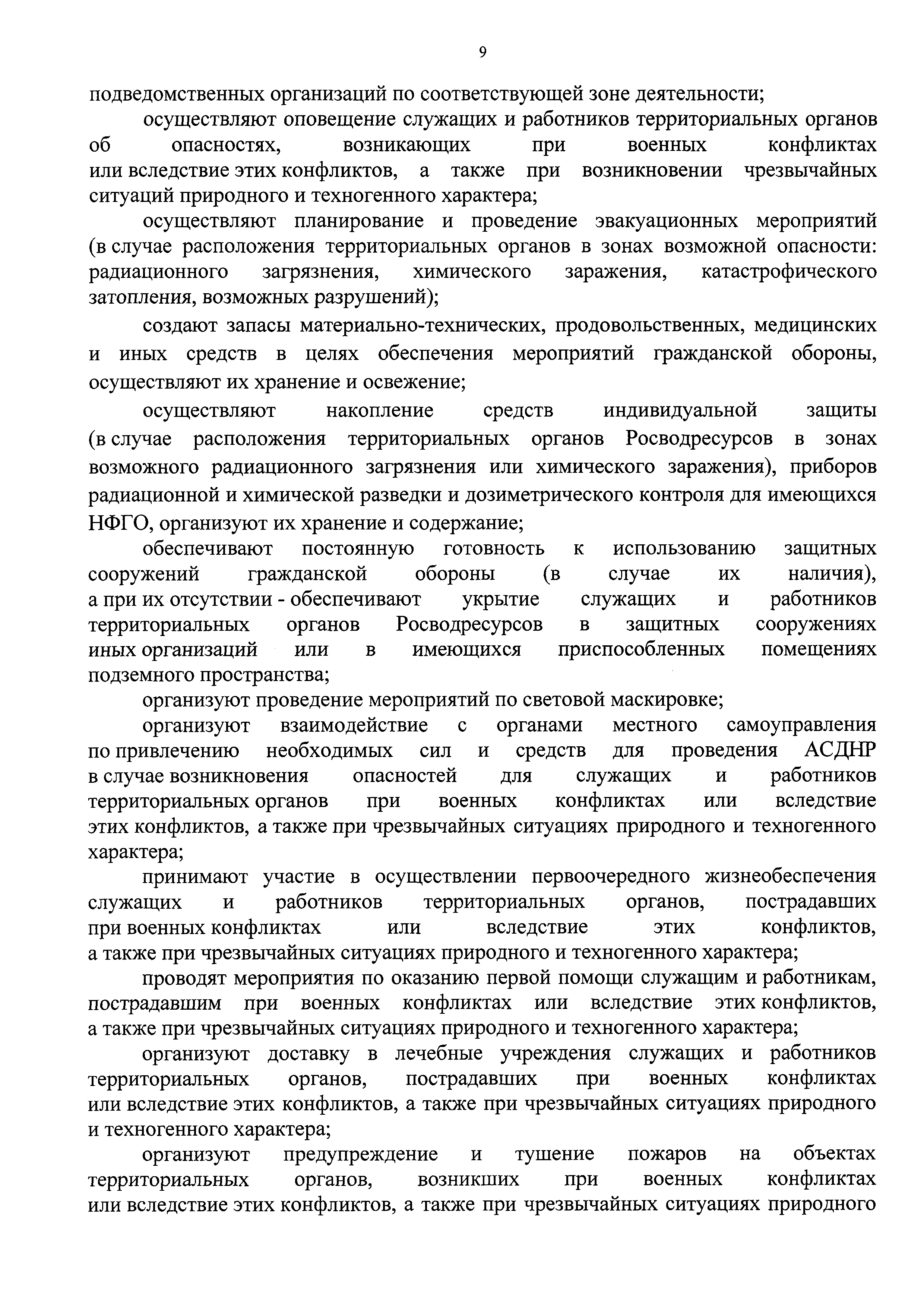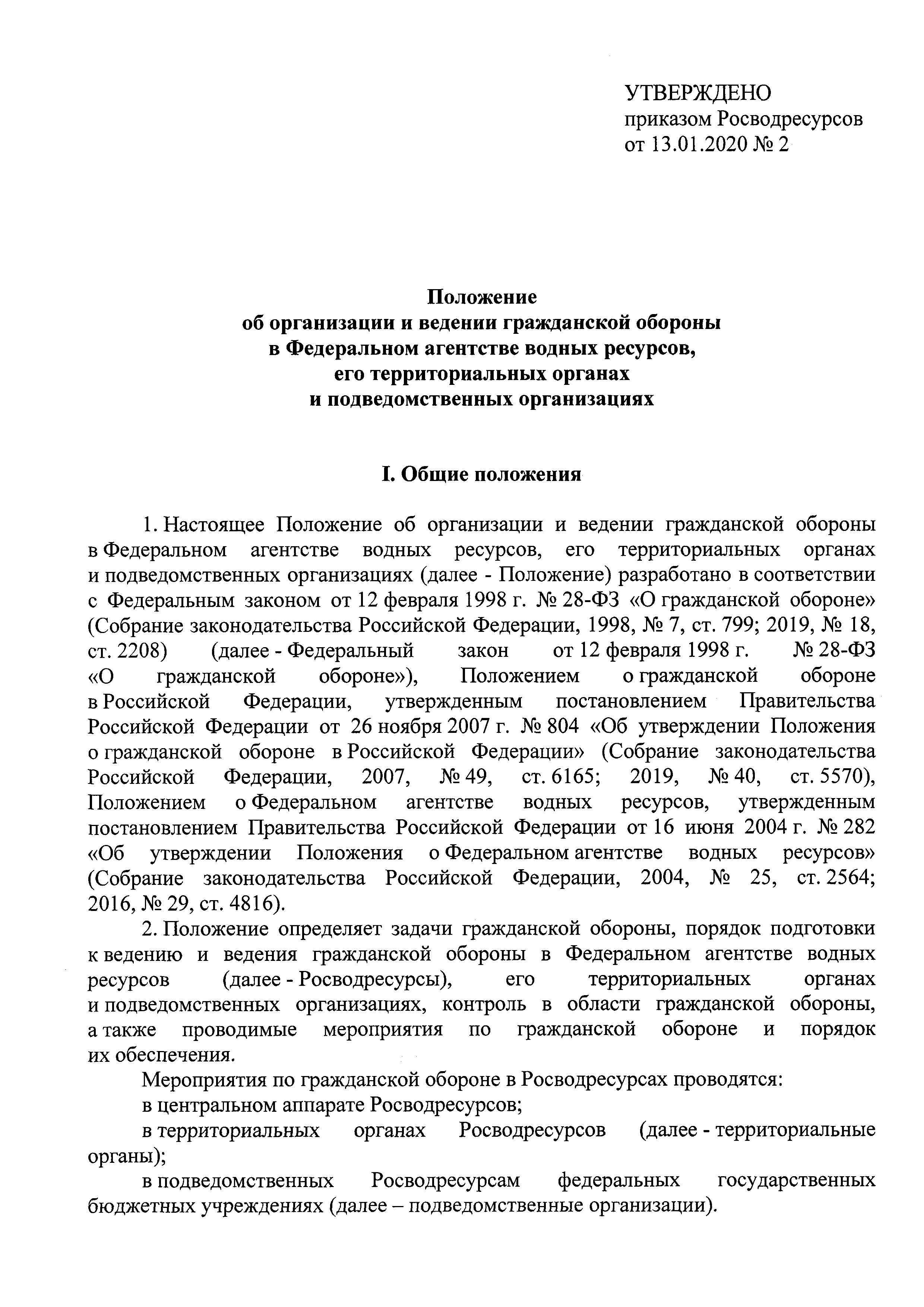 Положение об организации и ведении гражданской обороны в Федеральном агентстве водных ресурсов, его территориальных органах и подведомственных организациях| Статус: | действует | | Название рус.: | Положение об организации и ведении гражданской обороны в Федеральном агентстве водных ресурсов, его территориальных органах и подведомственных организациях | | Дата добавления в базу: | 01.01.2021 | | Дата актуализации: | 01.01.2021 | | Дата введения: | 12.04.2020 | | Область применения: | Положение определяет задачи гражданской обороны, порядок подготовки к ведению и ведения гражданской обороны в Федеральном агентстве водных ресурсов, его территориальных органах и подведомственных организациях, контроль в области гражданской обороны, а также проводимые мероприятия по гражданской обороне и порядок их обеспечения | | Оглавление: | I. Общие положения II. Организация управления гражданской обороной III. Основные задачи и функции в области гражданской обороны, а также при чрезвычайных ситуациях природного и техногенного характера IV. Основные мероприятия гражданской обороны, организация и порядок их выполнения в центральном аппарате Росводресурсов, территориальных органах и подведомственных организациях Росводресурсов V. Осуществление взаимодействия при организации и ведении гражданской обороны в Росводресурсах, территориальных органах и подведомственных организациях Росводресурсов VI. Обеспечение выполнения мероприятий по гражданской обороне VII. Контроль в области гражданской обороны | | Утверждён: | 13.01.2020 Федеральное агентство водных ресурсов (Росводресурсы) (2)