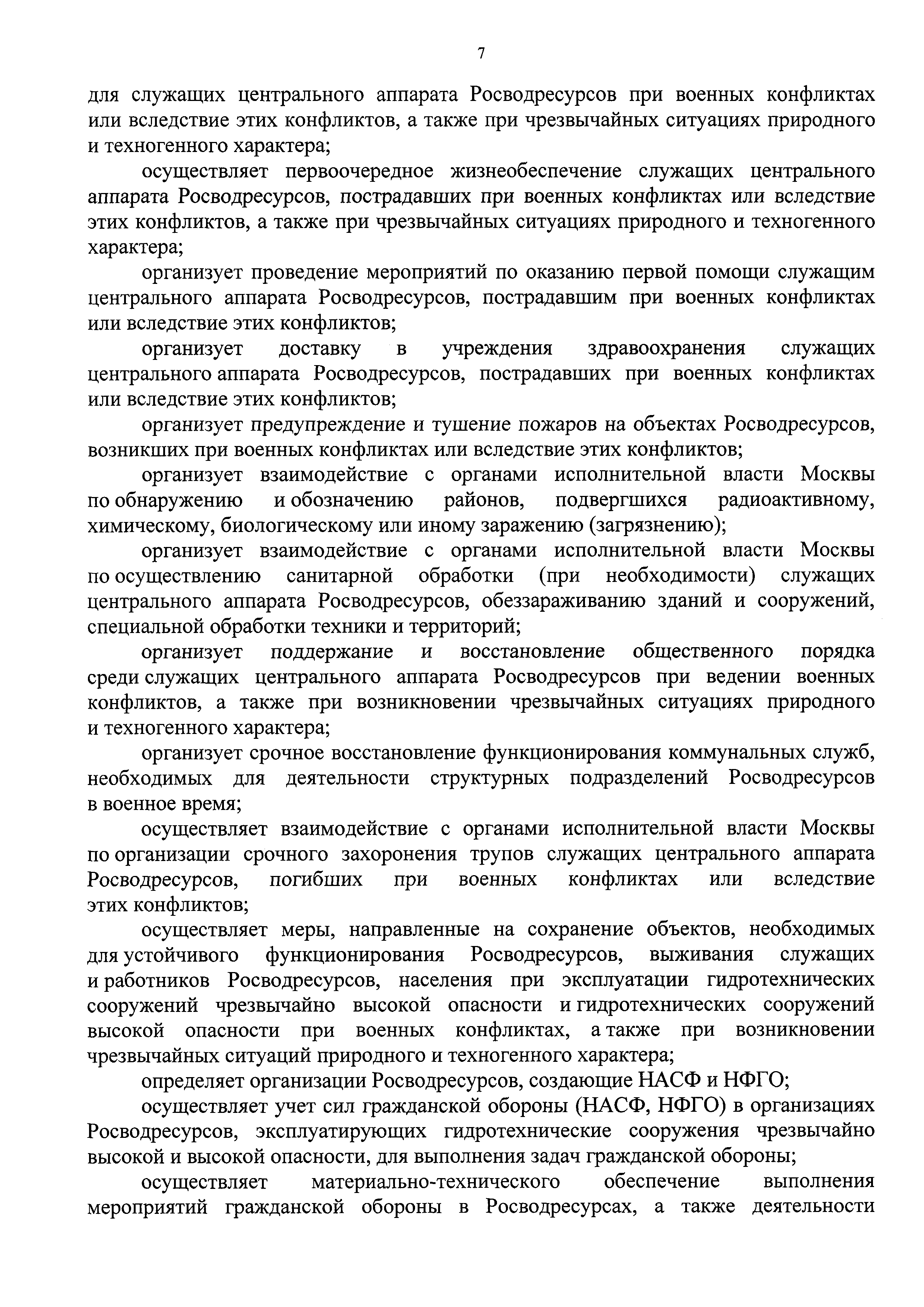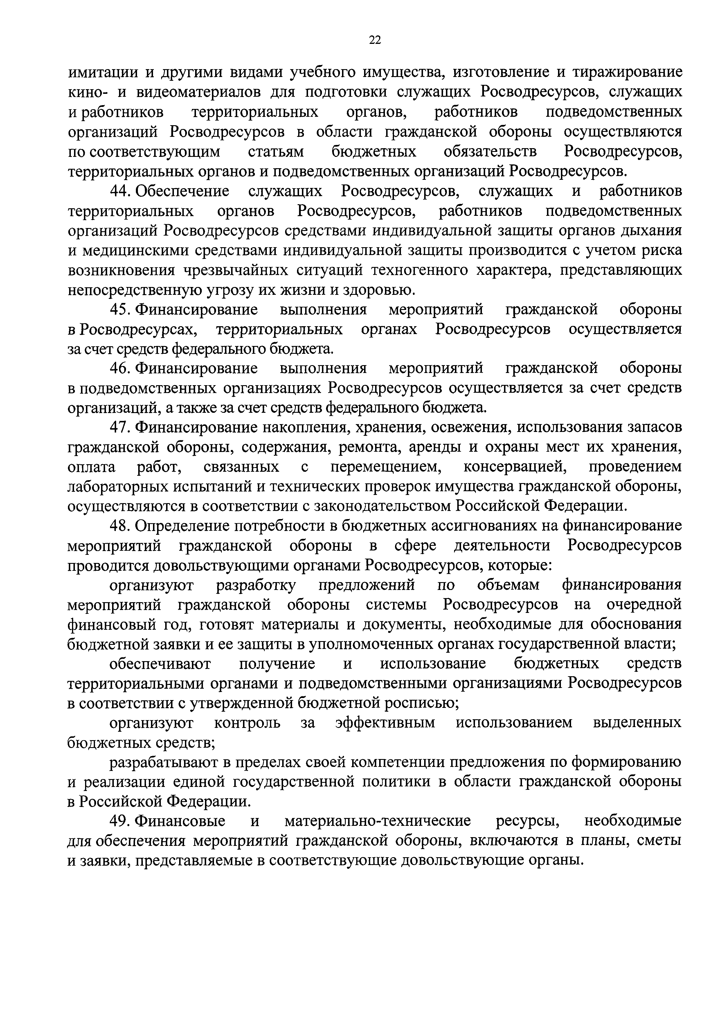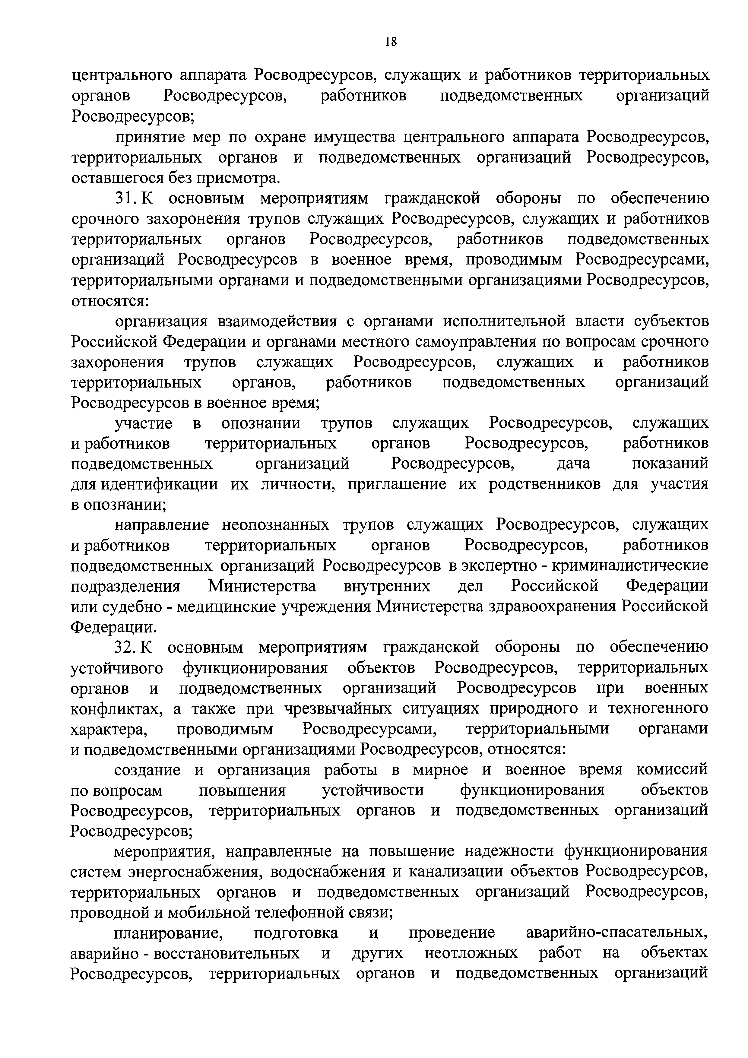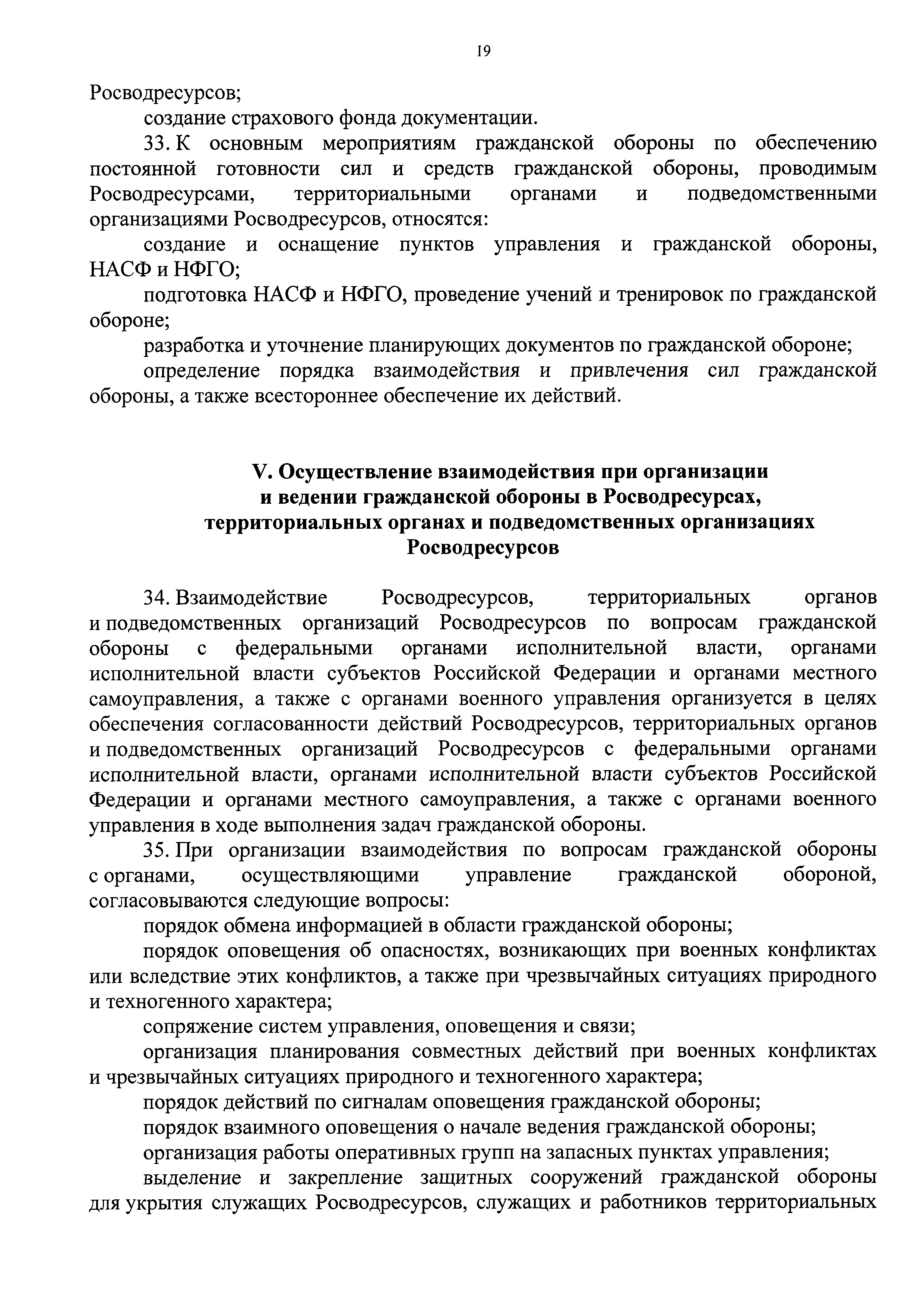 Положение об организации и ведении гражданской обороны в Федеральном агентстве водных ресурсов, его территориальных органах и подведомственных организациях| Статус: | действует | | Название рус.: | Положение об организации и ведении гражданской обороны в Федеральном агентстве водных ресурсов, его территориальных органах и подведомственных организациях | | Дата добавления в базу: | 01.01.2021 | | Дата актуализации: | 01.01.2021 | | Дата введения: | 12.04.2020 | | Область применения: | Положение определяет задачи гражданской обороны, порядок подготовки к ведению и ведения гражданской обороны в Федеральном агентстве водных ресурсов, его территориальных органах и подведомственных организациях, контроль в области гражданской обороны, а также проводимые мероприятия по гражданской обороне и порядок их обеспечения | | Оглавление: | I. Общие положения II. Организация управления гражданской обороной III. Основные задачи и функции в области гражданской обороны, а также при чрезвычайных ситуациях природного и техногенного характера IV. Основные мероприятия гражданской обороны, организация и порядок их выполнения в центральном аппарате Росводресурсов, территориальных органах и подведомственных организациях Росводресурсов V. Осуществление взаимодействия при организации и ведении гражданской обороны в Росводресурсах, территориальных органах и подведомственных организациях Росводресурсов VI. Обеспечение выполнения мероприятий по гражданской обороне VII. Контроль в области гражданской обороны | | Утверждён: | 13.01.2020 Федеральное агентство водных ресурсов (Росводресурсы) (2)