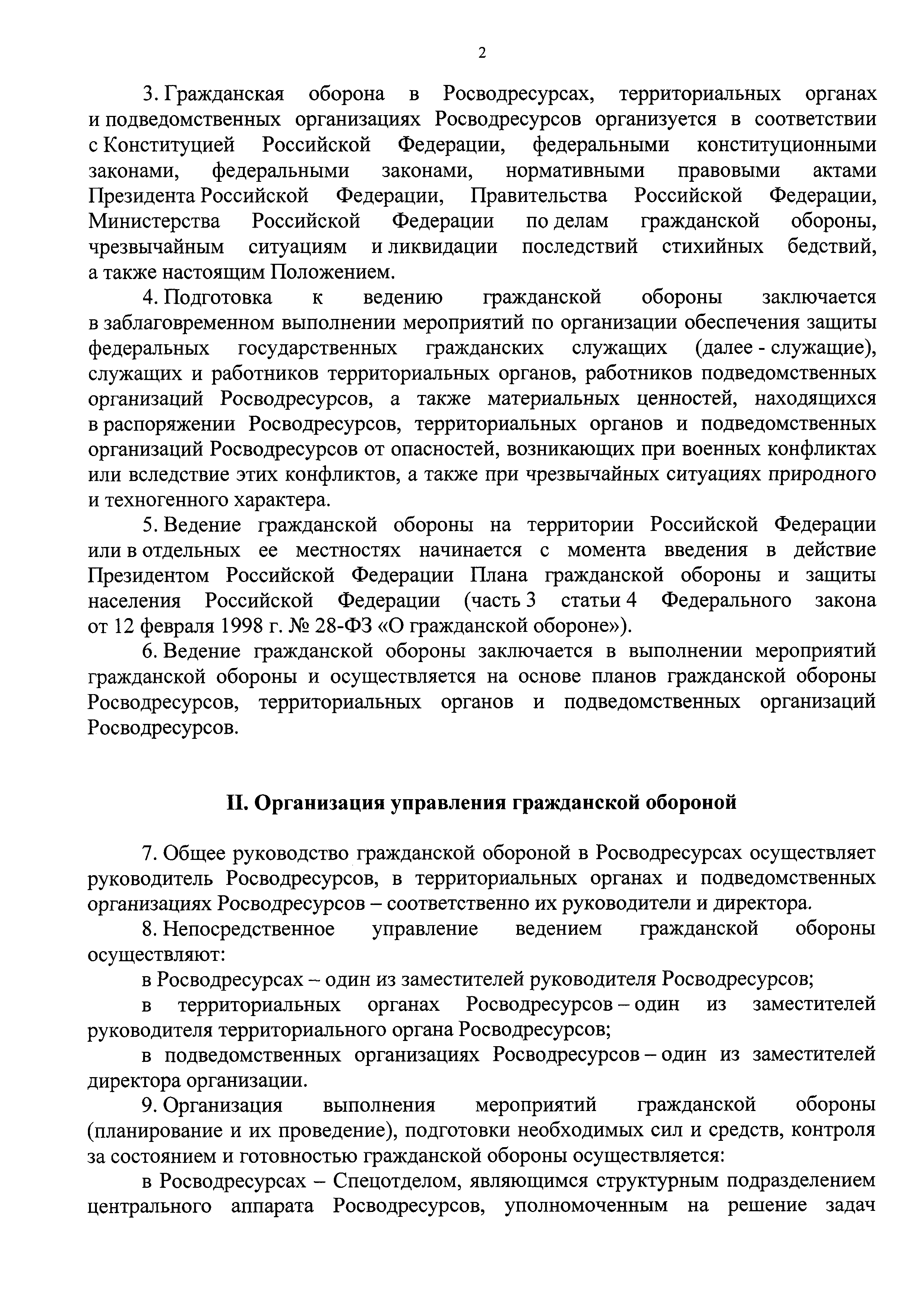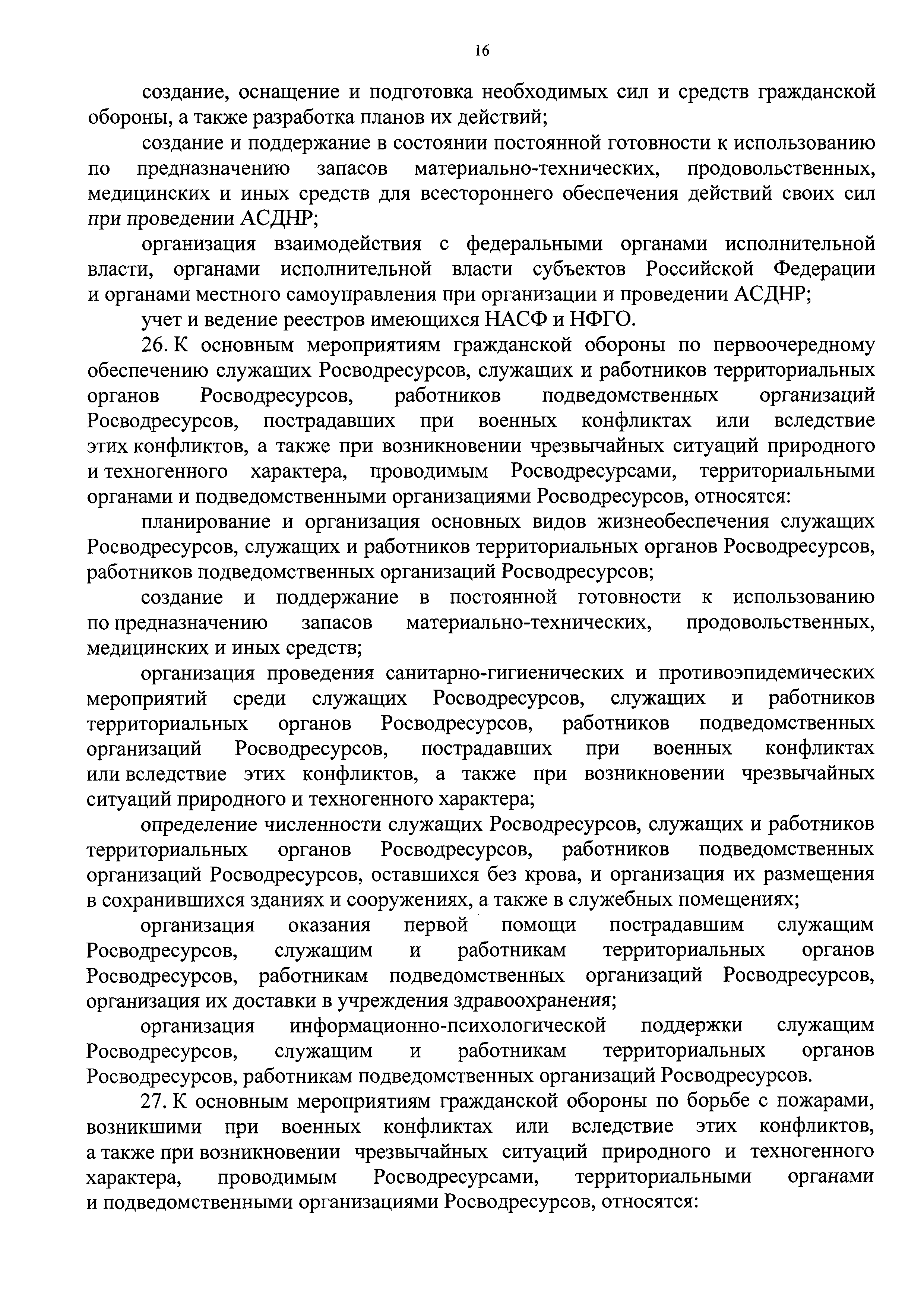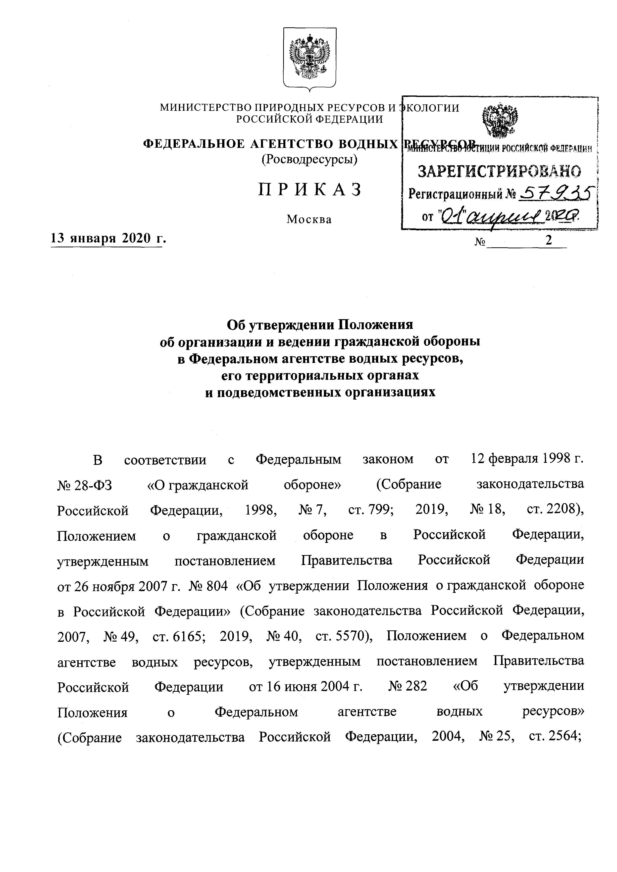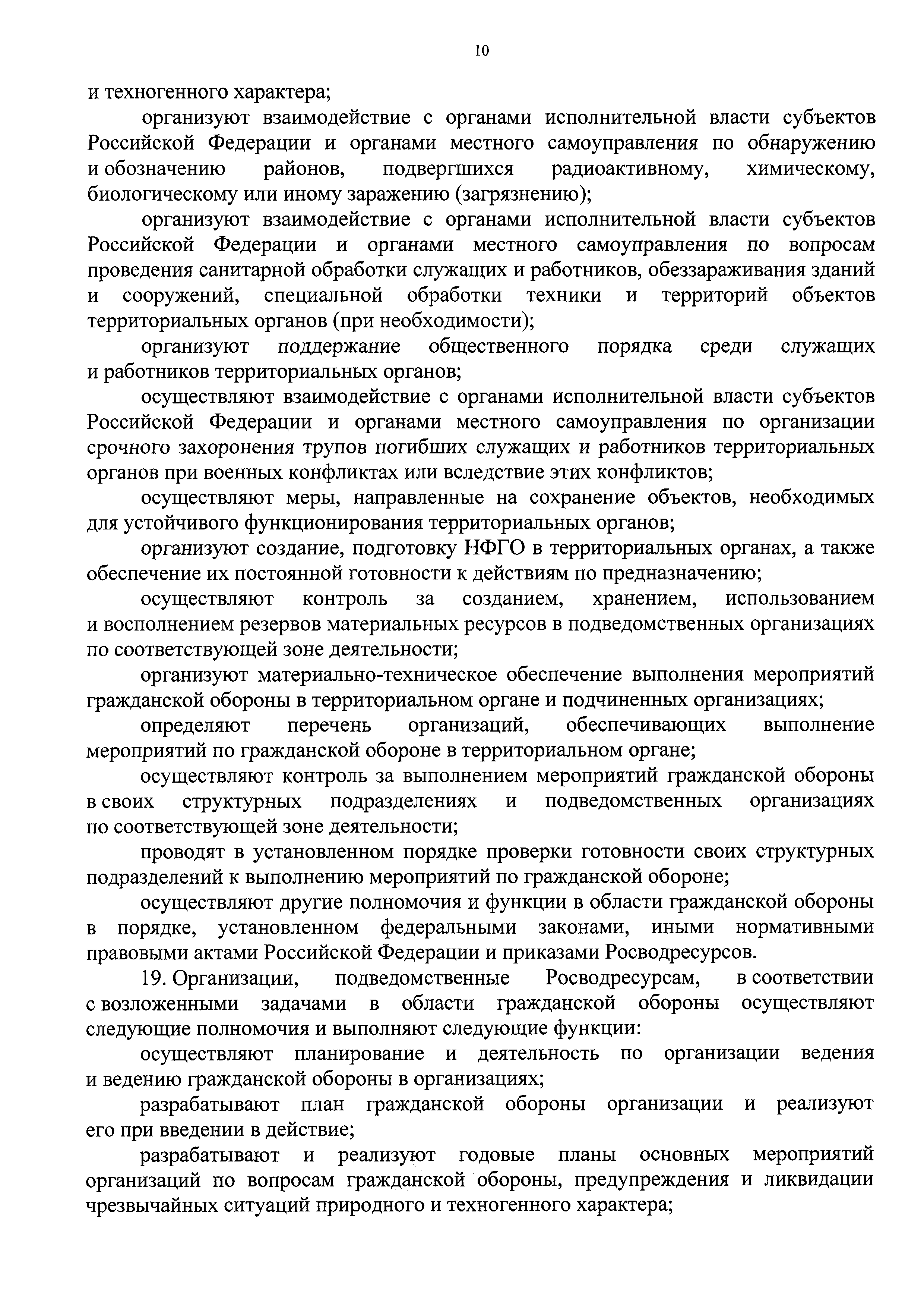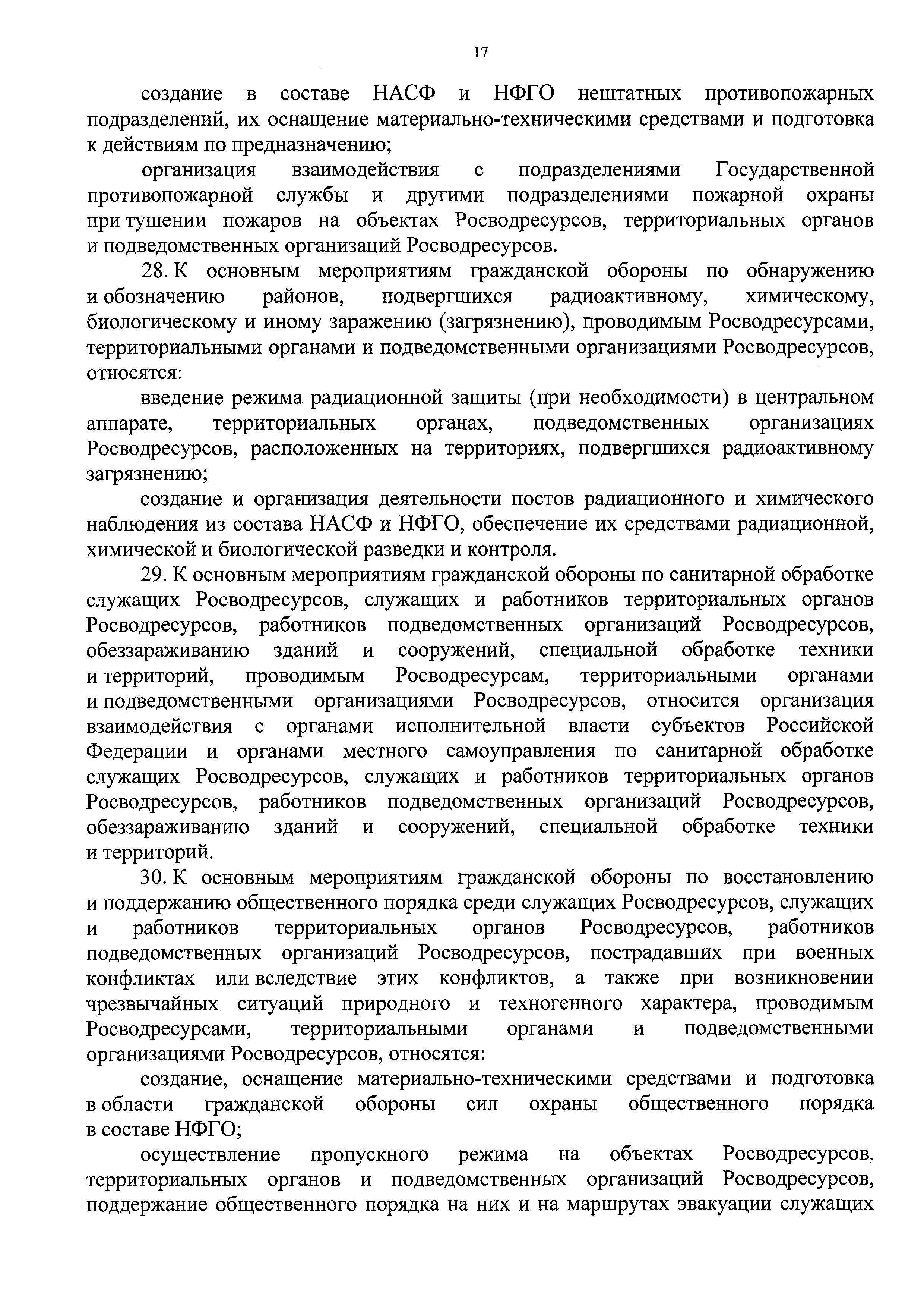 Положение об организации и ведении гражданской обороны в Федеральном агентстве водных ресурсов, его территориальных органах и подведомственных организациях| Статус: | действует | | Название рус.: | Положение об организации и ведении гражданской обороны в Федеральном агентстве водных ресурсов, его территориальных органах и подведомственных организациях | | Дата добавления в базу: | 01.01.2021 | | Дата актуализации: | 01.01.2021 | | Дата введения: | 12.04.2020 | | Область применения: | Положение определяет задачи гражданской обороны, порядок подготовки к ведению и ведения гражданской обороны в Федеральном агентстве водных ресурсов, его территориальных органах и подведомственных организациях, контроль в области гражданской обороны, а также проводимые мероприятия по гражданской обороне и порядок их обеспечения | | Оглавление: | I. Общие положения II. Организация управления гражданской обороной III. Основные задачи и функции в области гражданской обороны, а также при чрезвычайных ситуациях природного и техногенного характера IV. Основные мероприятия гражданской обороны, организация и порядок их выполнения в центральном аппарате Росводресурсов, территориальных органах и подведомственных организациях Росводресурсов V. Осуществление взаимодействия при организации и ведении гражданской обороны в Росводресурсах, территориальных органах и подведомственных организациях Росводресурсов VI. Обеспечение выполнения мероприятий по гражданской обороне VII. Контроль в области гражданской обороны | | Утверждён: | 13.01.2020 Федеральное агентство водных ресурсов (Росводресурсы) (2)