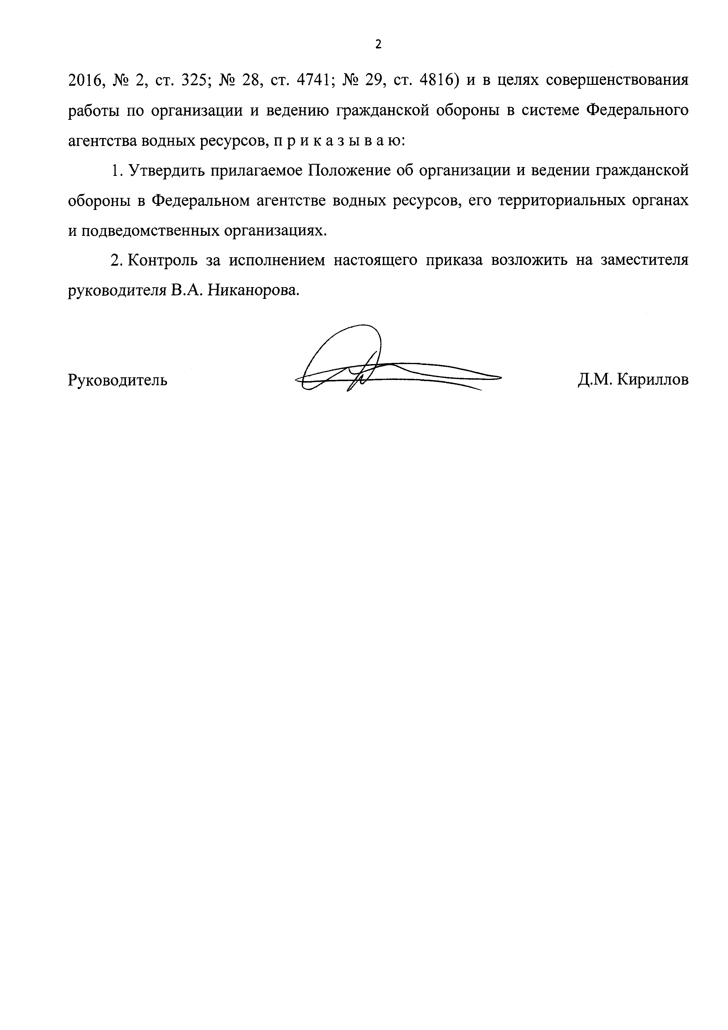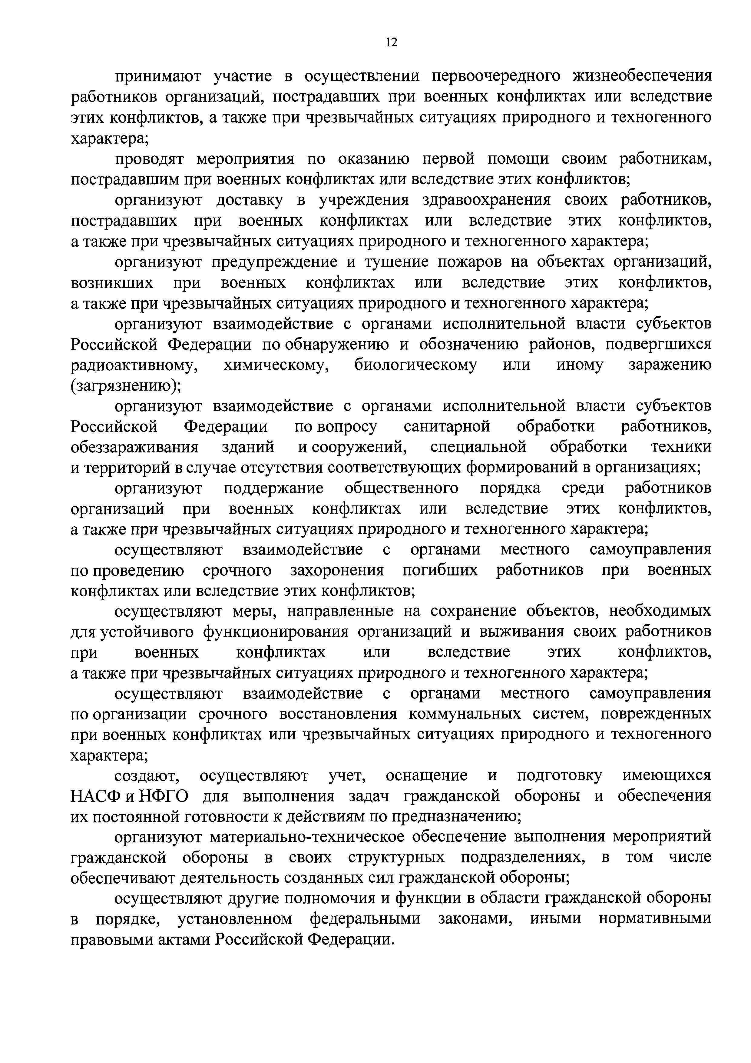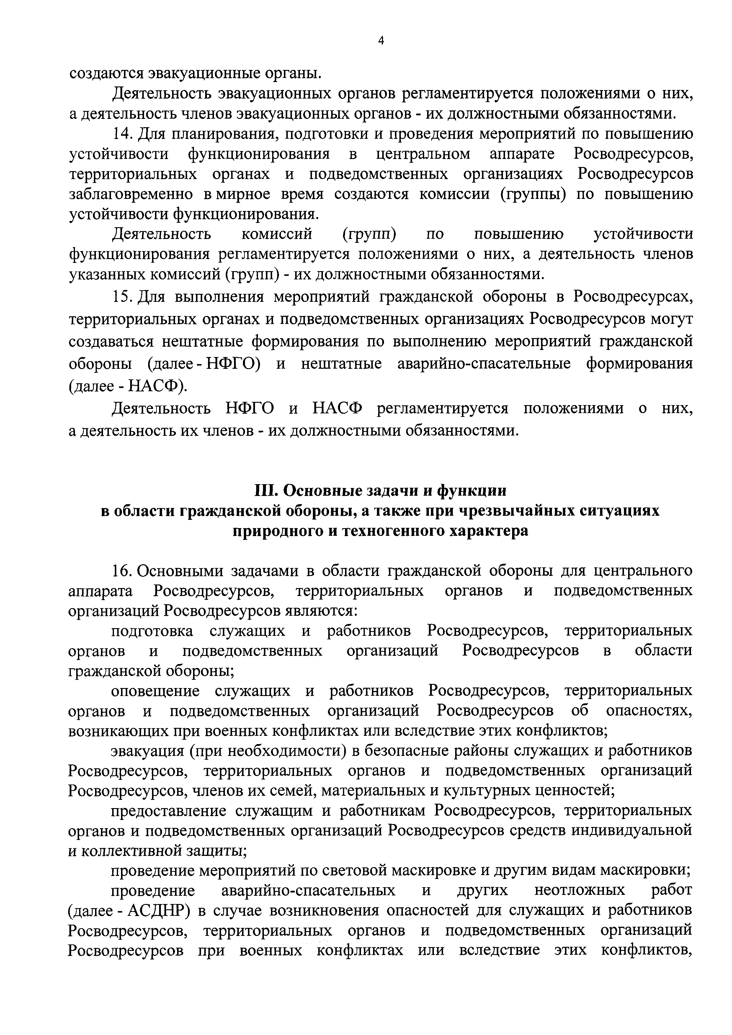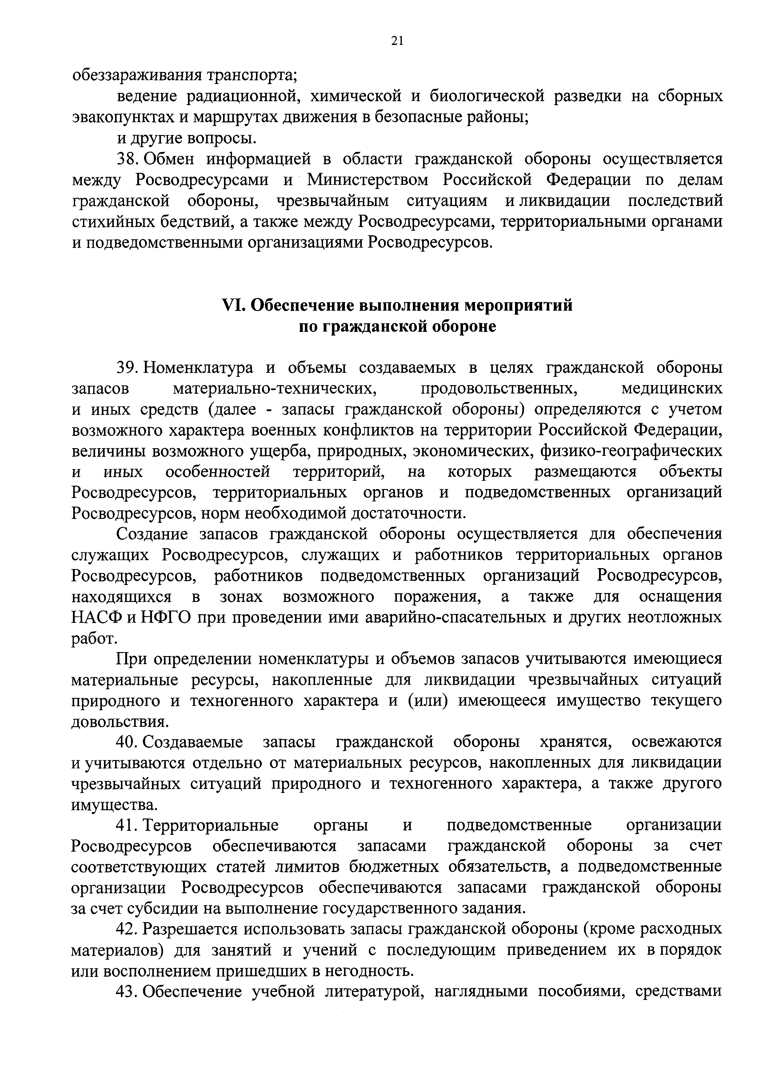 Положение об организации и ведении гражданской обороны в Федеральном агентстве водных ресурсов, его территориальных органах и подведомственных организациях| Статус: | действует | | Название рус.: | Положение об организации и ведении гражданской обороны в Федеральном агентстве водных ресурсов, его территориальных органах и подведомственных организациях | | Дата добавления в базу: | 01.01.2021 | | Дата актуализации: | 01.01.2021 | | Дата введения: | 12.04.2020 | | Область применения: | Положение определяет задачи гражданской обороны, порядок подготовки к ведению и ведения гражданской обороны в Федеральном агентстве водных ресурсов, его территориальных органах и подведомственных организациях, контроль в области гражданской обороны, а также проводимые мероприятия по гражданской обороне и порядок их обеспечения | | Оглавление: | I. Общие положения II. Организация управления гражданской обороной III. Основные задачи и функции в области гражданской обороны, а также при чрезвычайных ситуациях природного и техногенного характера IV. Основные мероприятия гражданской обороны, организация и порядок их выполнения в центральном аппарате Росводресурсов, территориальных органах и подведомственных организациях Росводресурсов V. Осуществление взаимодействия при организации и ведении гражданской обороны в Росводресурсах, территориальных органах и подведомственных организациях Росводресурсов VI. Обеспечение выполнения мероприятий по гражданской обороне VII. Контроль в области гражданской обороны | | Утверждён: | 13.01.2020 Федеральное агентство водных ресурсов (Росводресурсы) (2)