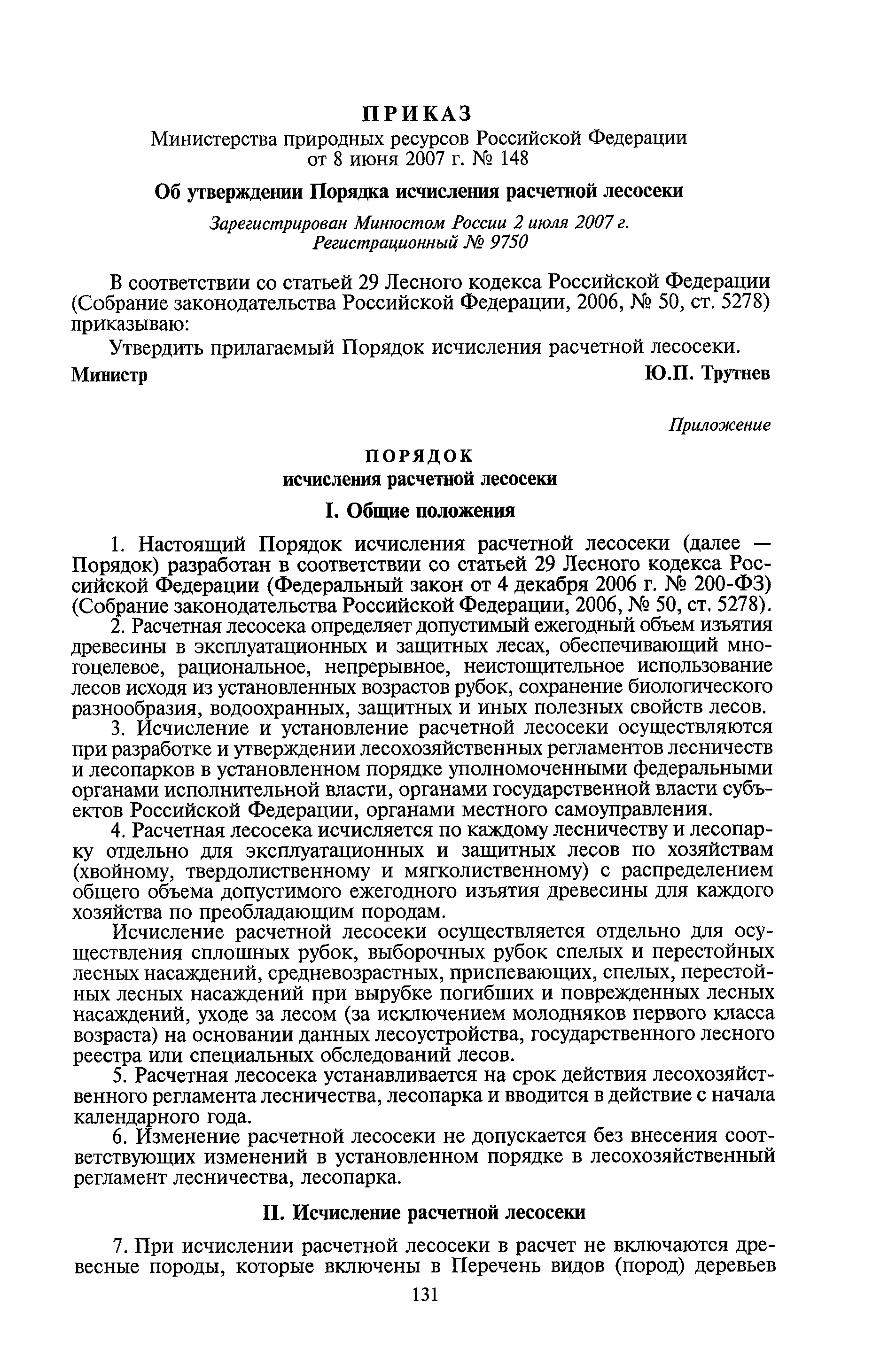 Порядок исчисления расчетной лесосеки| Статус: | утратил силу | | Название рус.: | Порядок исчисления расчетной лесосеки | | Дата добавления в базу: | 01.01.2021 | | Дата актуализации: | 01.01.2021 | | Дата введения: | 27.07.2007 | | Дата окончания срока действия: | 12.08.2011 | | Область применения: | Расчетная лесосека определяет допустимый ежегодный объем изъятия древесины в эксплуатационных и защитных лесах, обеспечивающий многоцелевое, рациональное, непрерывное, неистощительное использование лесов, исходя из установленных возрастов рубок, сохранение биологического разнообразия, водоохранных, защитных и иных полезных свойств лесов.