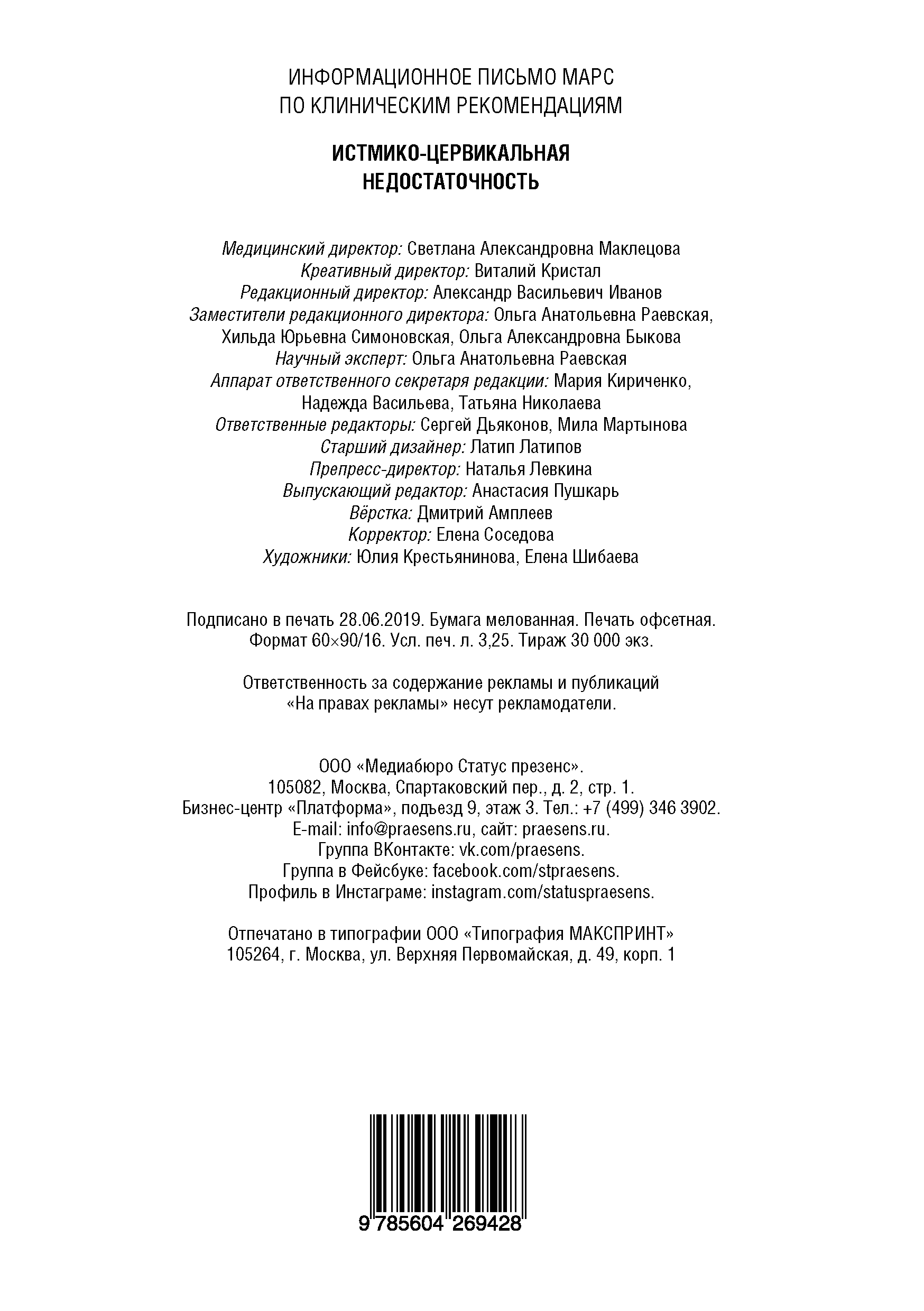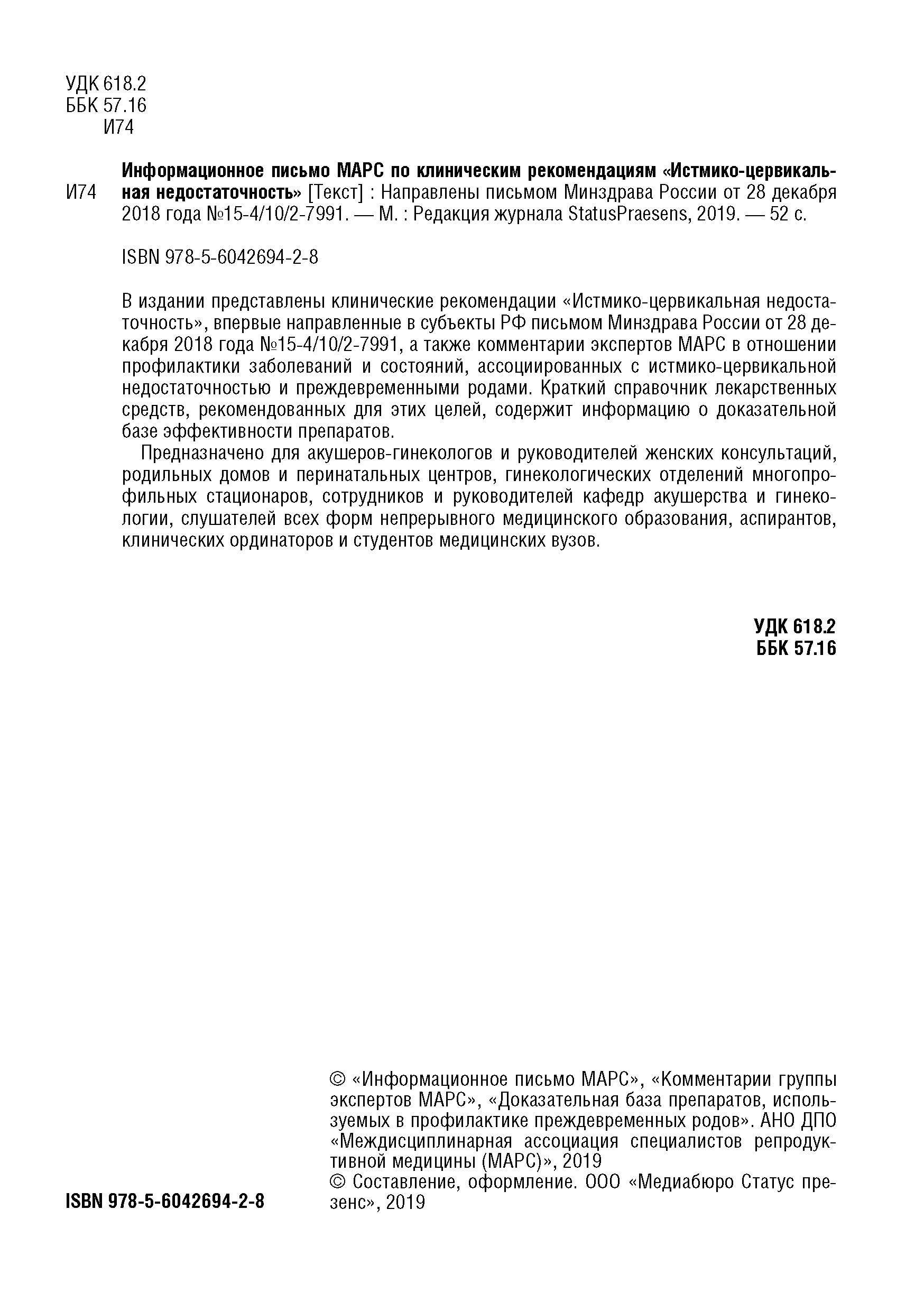 | Оглавление: | Аннотация Определение Классификация Эпидемиология и патогенез Факторы риска истмико-цервикальной недостаточности Диагностика Профилактика Тактика ведения женщин с истмико-цервикальной недостаточностью Лечение истмико-цервикальной недостаточности Состав рабочей группы Приложение 1. Стратегия врача при истмико-цервикальной недостаточности Приложение 2. Образец информированного добровольного согласия на медицинское вмешательство Приложение 3. Образец протокола операции "Цервикальный серкляж по Макдональду" Приложение 4. Образец протокола операции "Цервикальный серкляж по А. И. Любимовой в модификации Н.М. Мамедалиевой" Приложение 5. Образец протокола операции "Цервикальный серкляж по Широдкару" Литература Комментарии группы экспертов Марс Доказательная база ряда препаратов, используемых в профилактике истмико-цервикальной недостаточности и преждевременных родов |