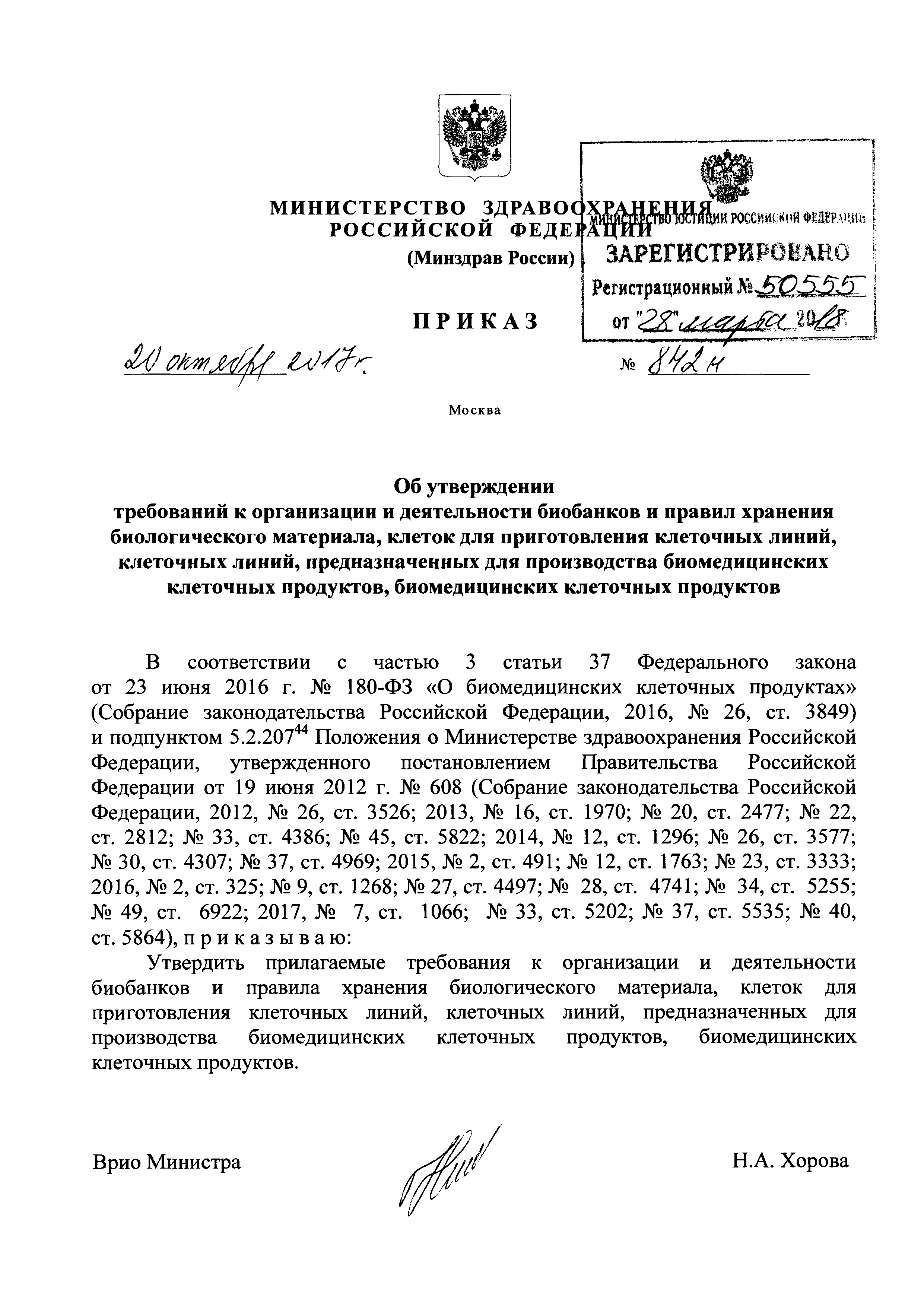 | Утверждён: | 20.10.2017 Министерство здравоохранения Российской Федерации (842н) |