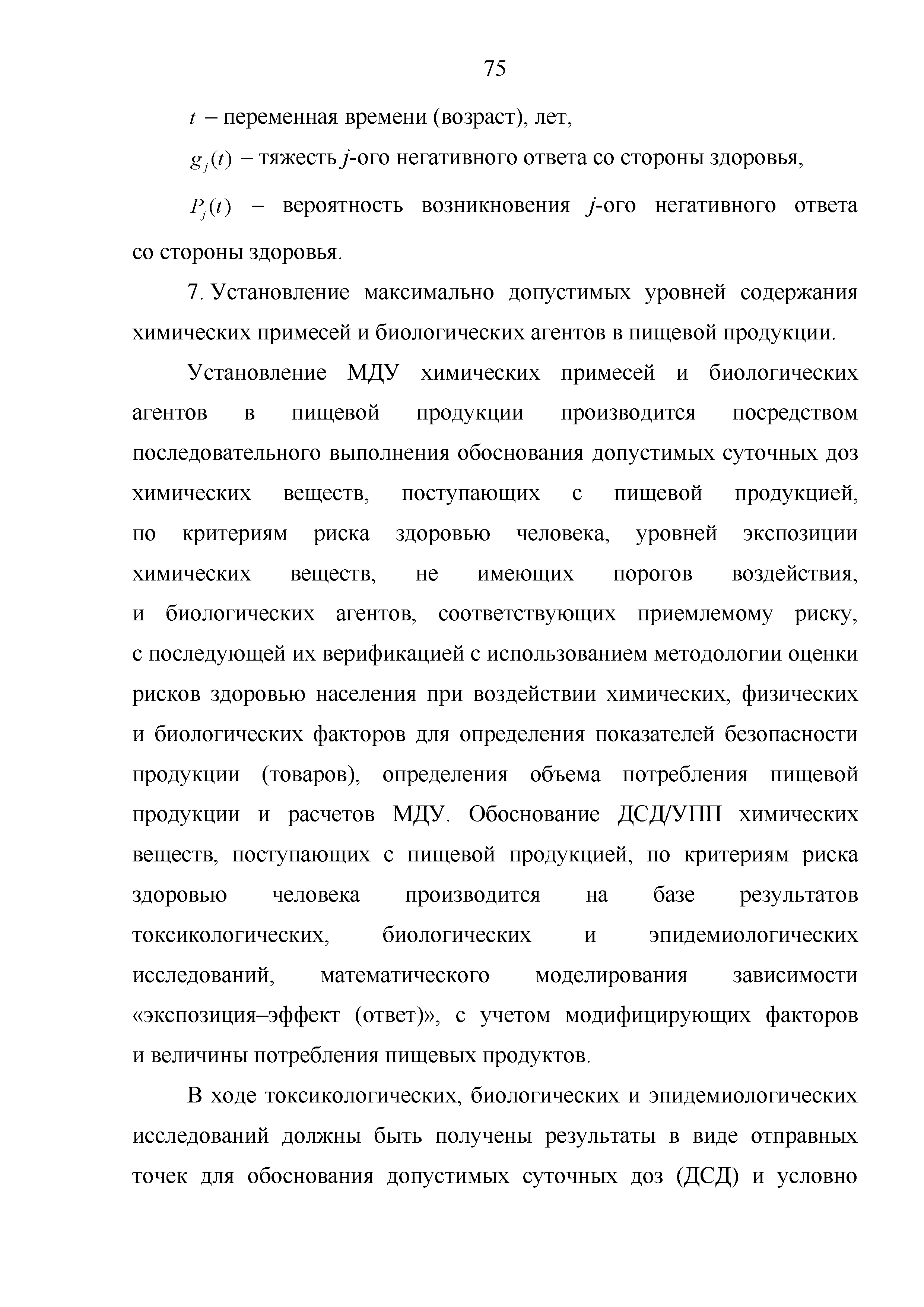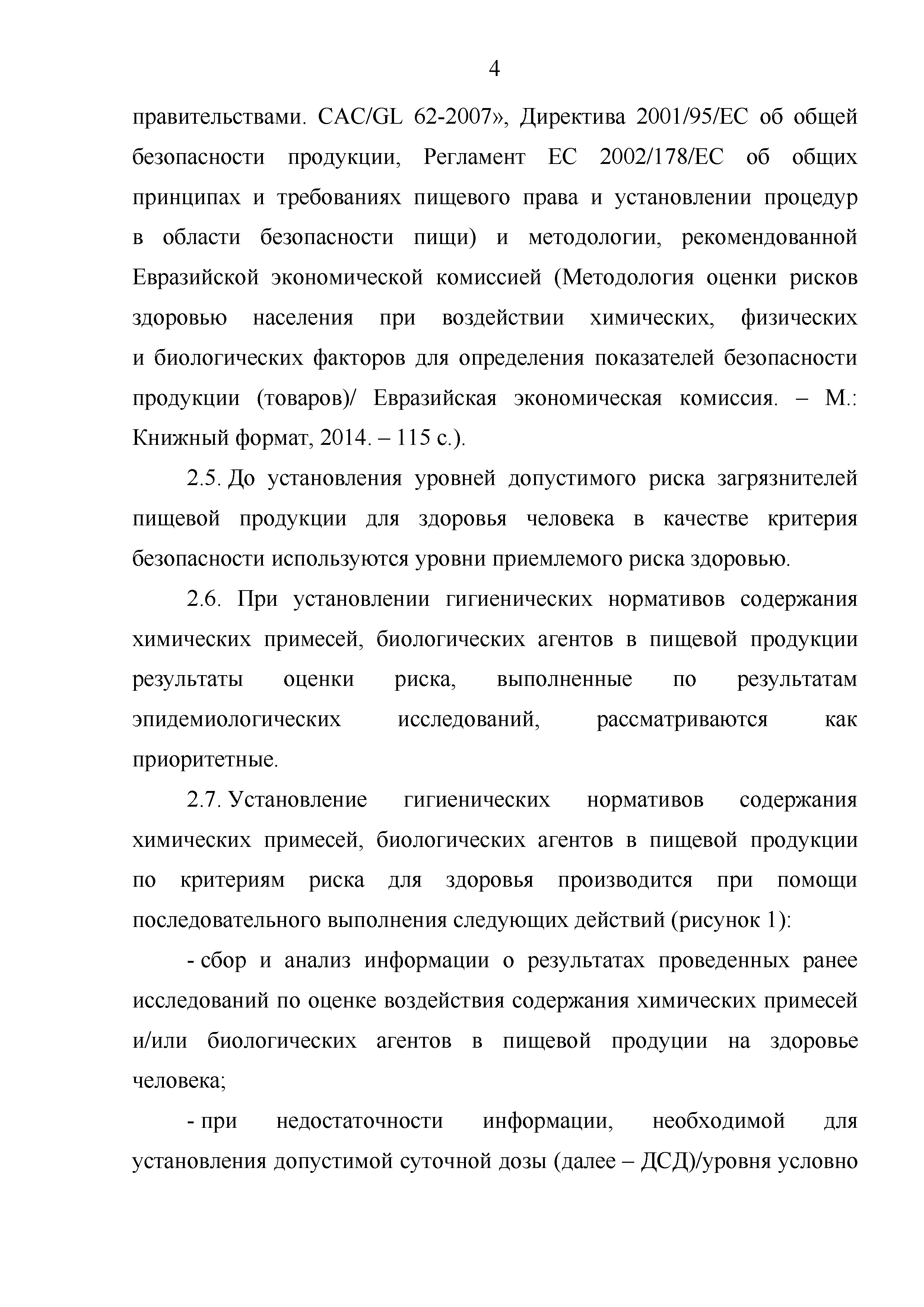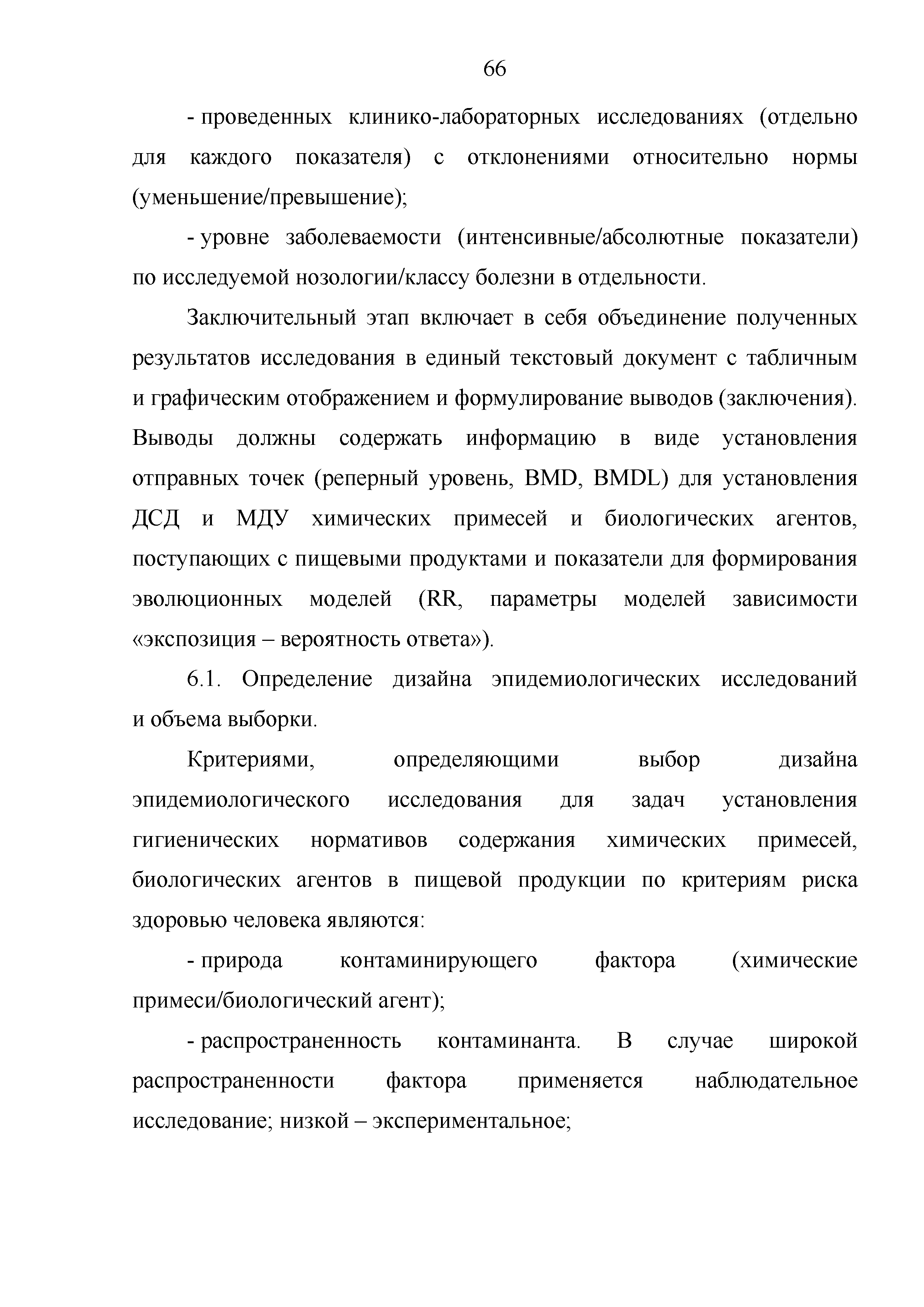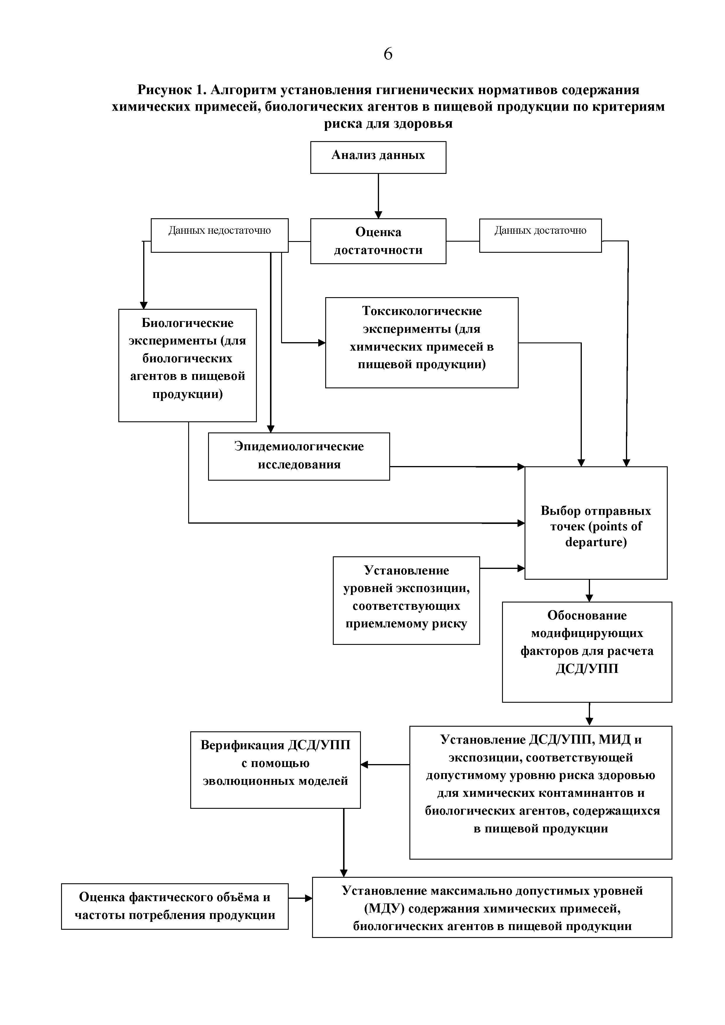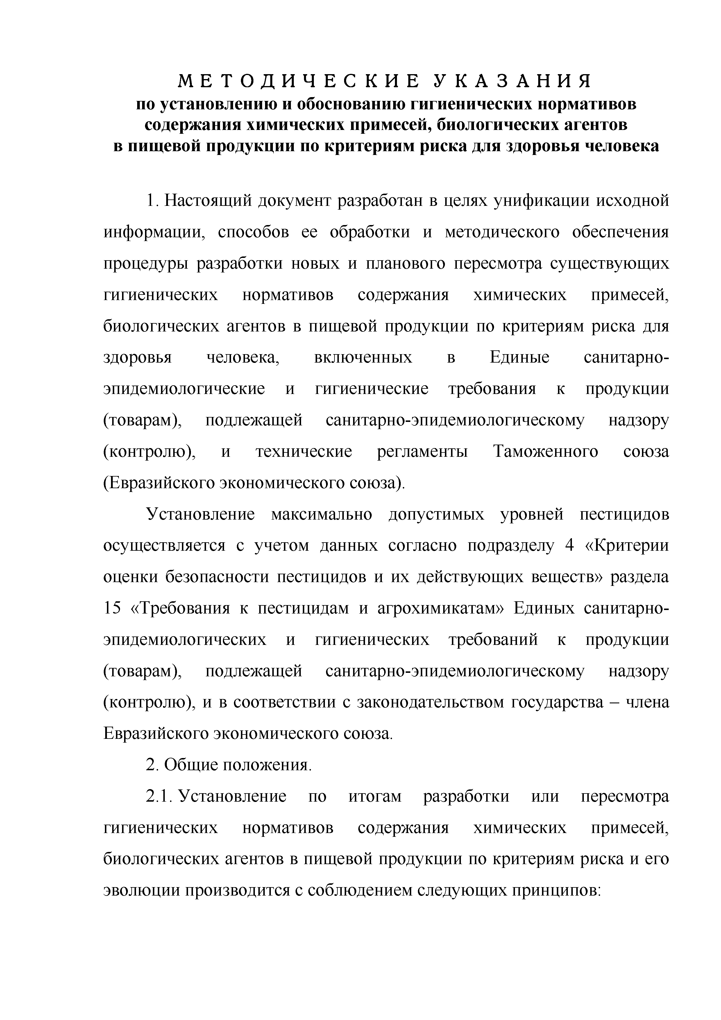 Методические указания по установлению и обоснованию гигиенических нормативов содержания химических примесей, биологических агентов в пищевой продукции по критериям риска для здоровья человека| Статус: | справочные материалы, мп, тпр | | Название рус.: | Методические указания по установлению и обоснованию гигиенических нормативов содержания химических примесей, биологических агентов в пищевой продукции по критериям риска для здоровья человека | | Дата добавления в базу: | 01.01.2021 | | Дата актуализации: | 01.01.2021 | | Область применения: | Документ разработан в целях унификации исходной информации, способов ее обработки и методического обеспечения процедуры разработки новых и планового пересмотра существующих гигиенических нормативов содержания химических примесей, биологических агентов в пищевой продукции по критериям риска для здоровья человека, включенных в Единые санитарно-эпидемиологические и гигиенические требования к продукции (товарам), подлежащей санитарно-эпидемиологическому надзору (контролю), и технические регламенты Таможенного союза (Евразийского экономического союза). | | Оглавление: | 2 Общие положения 3 Выбор релевантной информации для установления гигиенических нормативов содержания химических примесей, биологических агентов в пищевой продукции по критериям риска. 4 Требования к проведению токсикологических экспериментов и необходимого набора тестов и методик проведения токсикологических экспериментов для обоснования ДСД/УПП 5 Требования к проведению экспериментов и необходимого набора методик проведения экспериментов для обоснования гигиенических нормативов содержания биологических агентов в пищевой продукции по критериям риска здоровью человека 6 Требования к проведению эпидемиологических исследований для обоснования гигиенических нормативов содержания химических примесей биологических агентов в пищевой продукции по критериям риска здоровью человека и его эволюции 7 Установление максимально допустимых уровней содержания химических примесей и биологических агентов в пищевой продукции. 8 Верификация ДСД/УПП, химических веществ, поступающих с пищевой продукцией, и уровней экспозиции биологических агентов, соответствующих приемлемому риску, с использованием методологии оценки рисков здоровью населения при воздействии химических и биологических факторов для определения показателей безопасности продукции (товаров) 9 Определение объема потребления пищевой продукции для расчета МДУ 10 Определение максимально допустимых уровней (МДУ) химических примесей и биологических агентов в пищевой продукции. | | Утверждён: | 26.02.2020 Евразийская экономическая комиссия (4)
