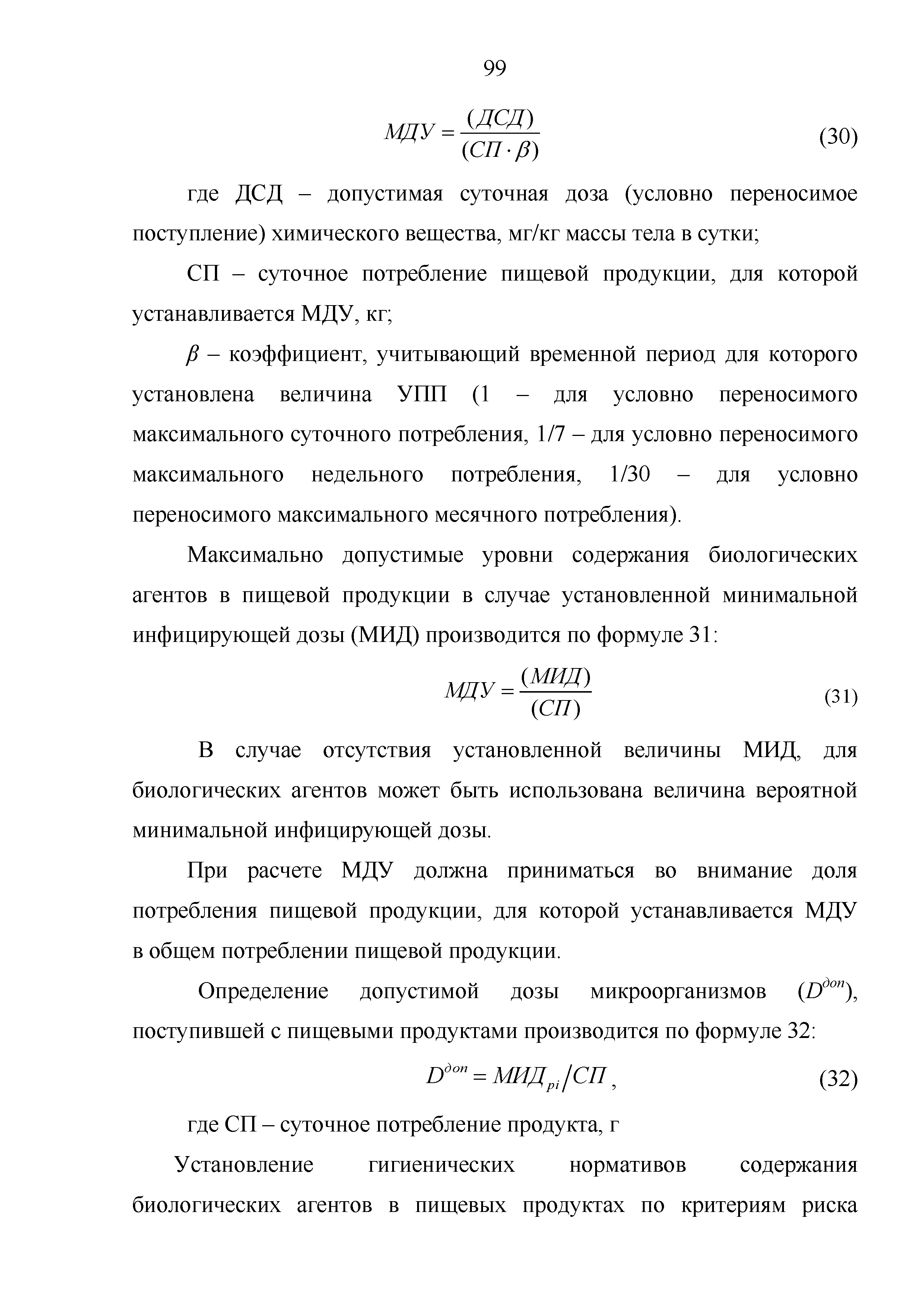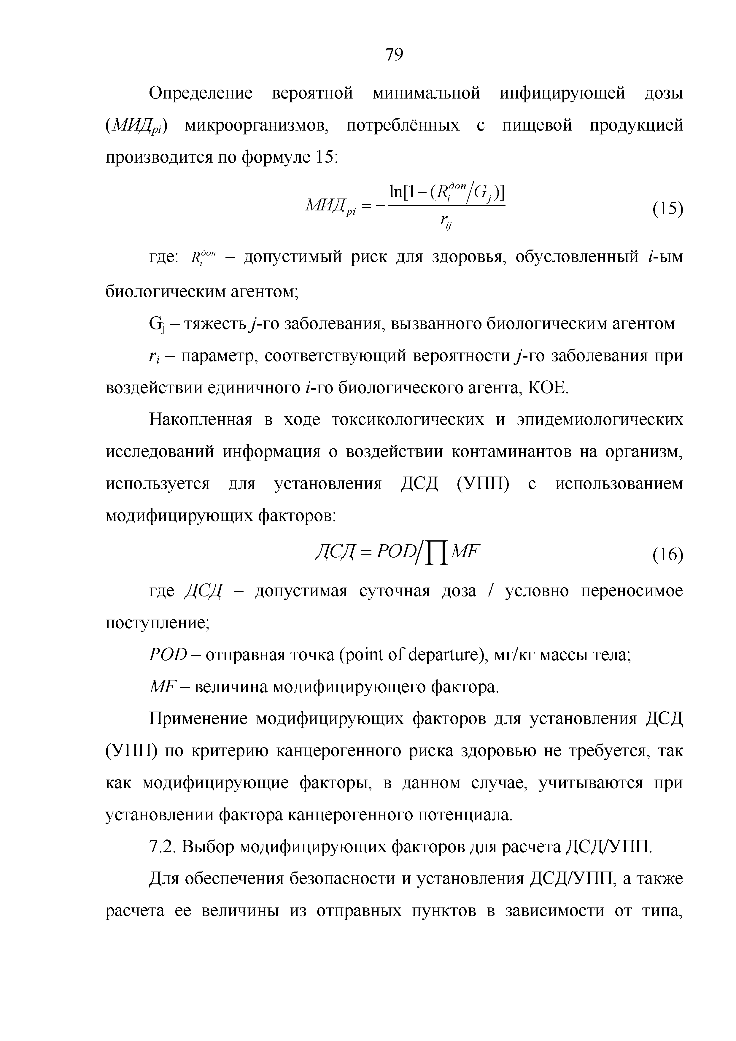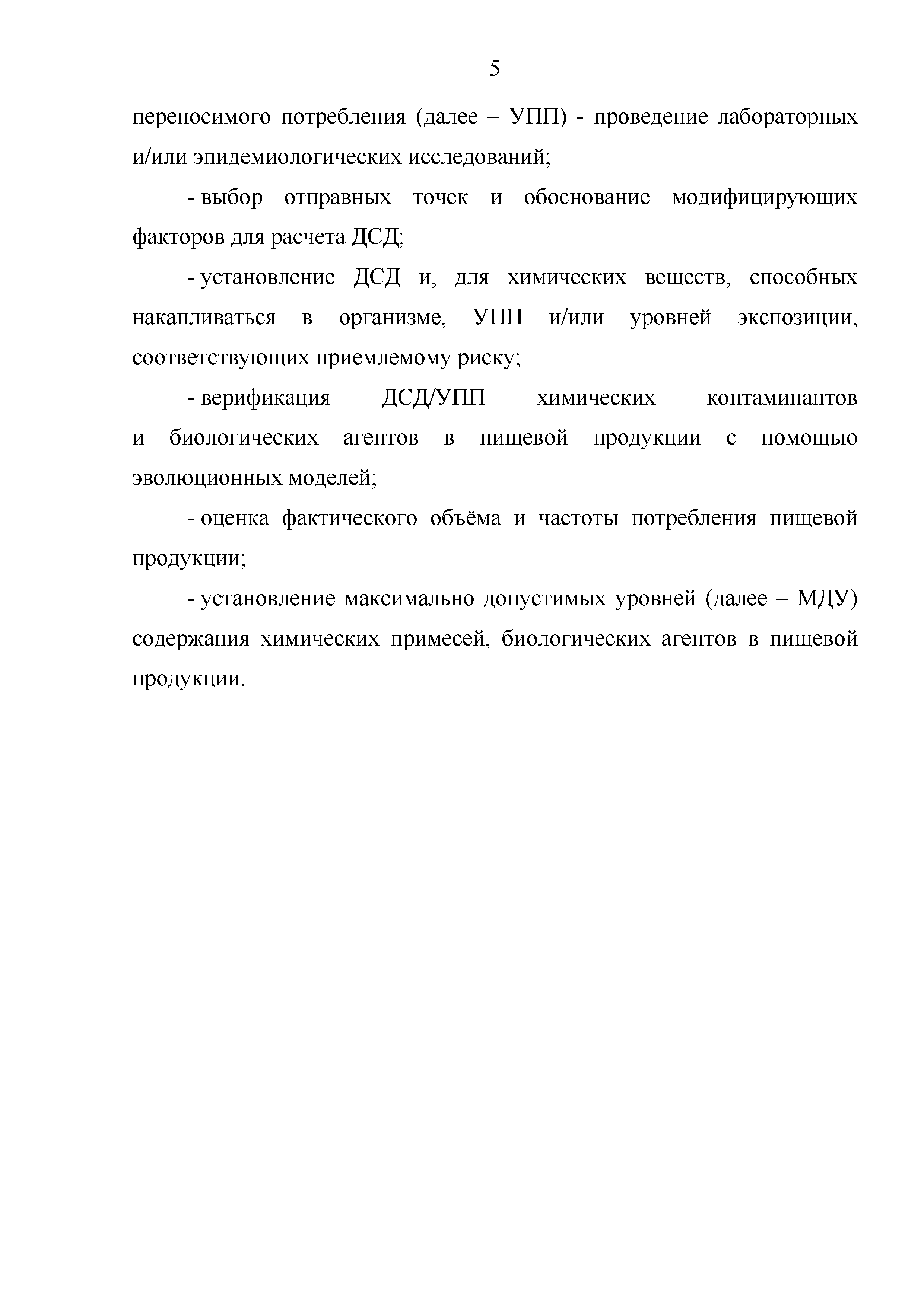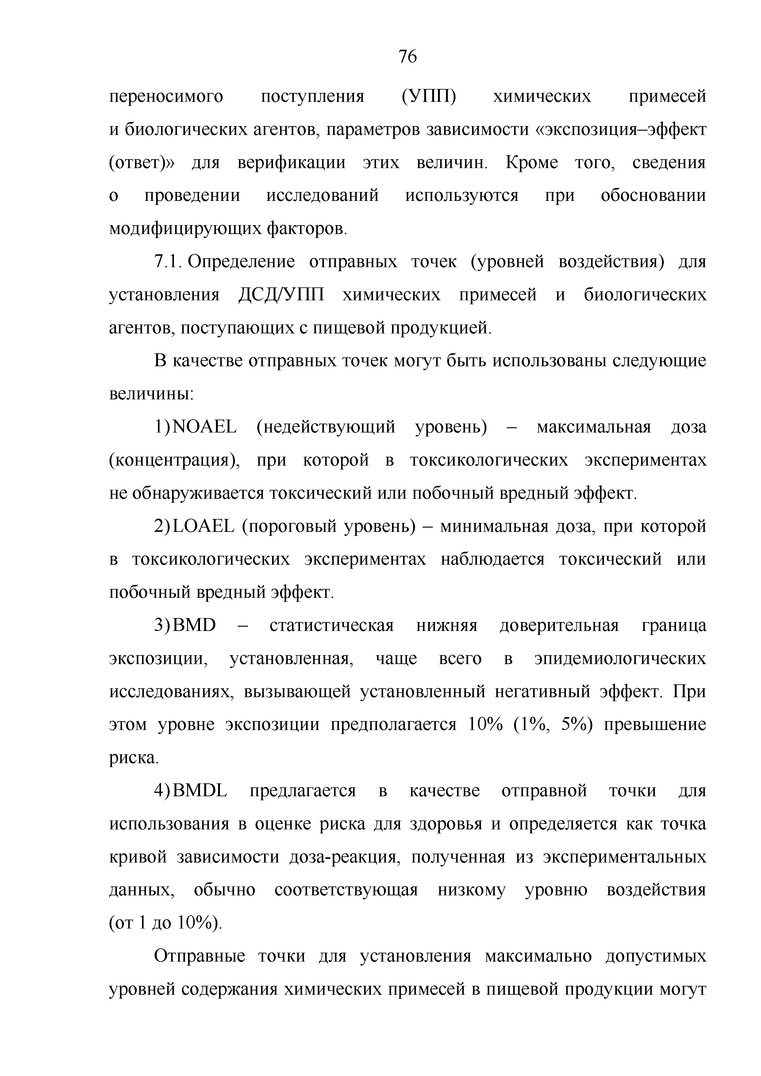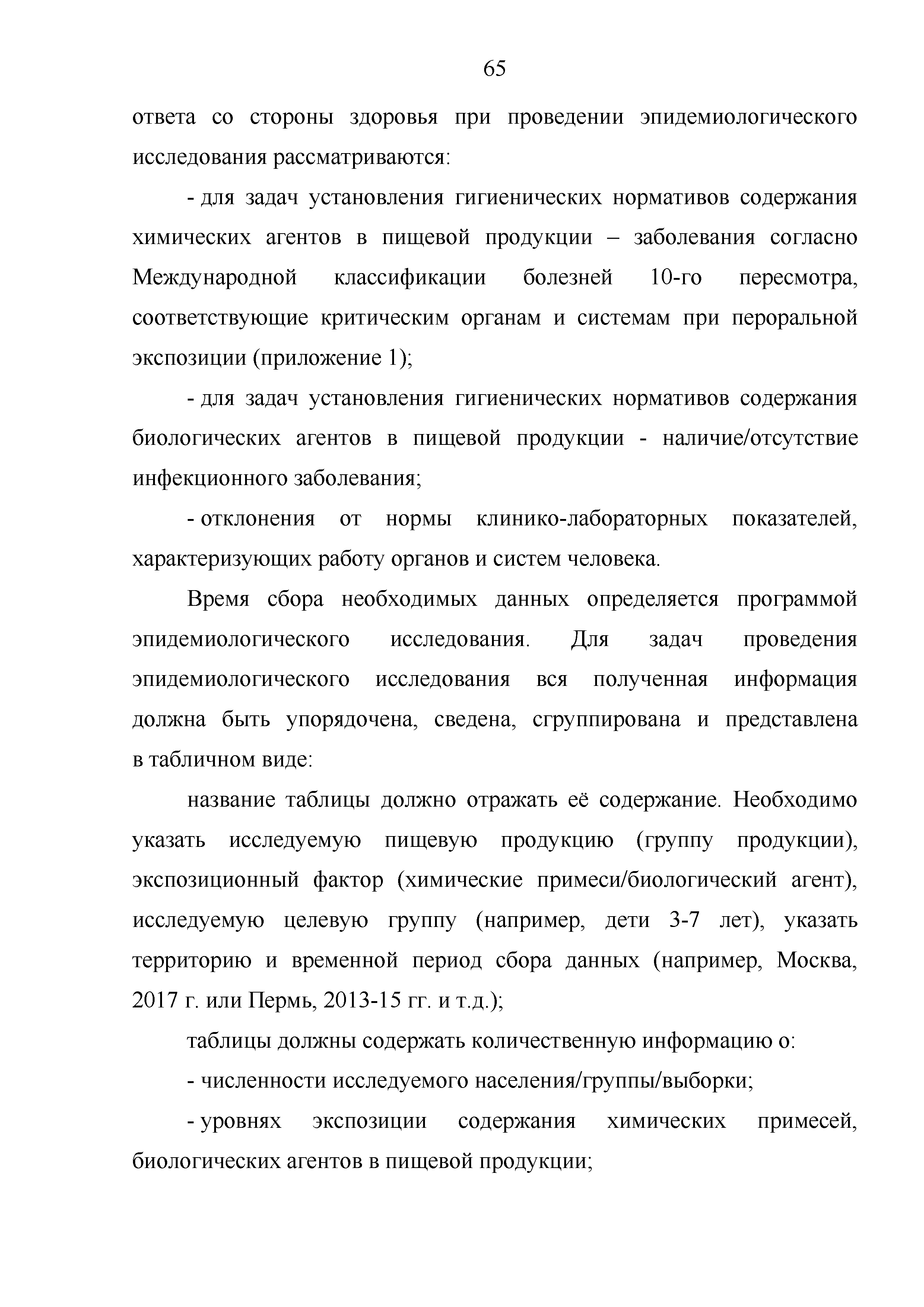 Методические указания по установлению и обоснованию гигиенических нормативов содержания химических примесей, биологических агентов в пищевой продукции по критериям риска для здоровья человека| Статус: | справочные материалы, мп, тпр | | Название рус.: | Методические указания по установлению и обоснованию гигиенических нормативов содержания химических примесей, биологических агентов в пищевой продукции по критериям риска для здоровья человека | | Дата добавления в базу: | 01.01.2021 | | Дата актуализации: | 01.01.2021 | | Область применения: | Документ разработан в целях унификации исходной информации, способов ее обработки и методического обеспечения процедуры разработки новых и планового пересмотра существующих гигиенических нормативов содержания химических примесей, биологических агентов в пищевой продукции по критериям риска для здоровья человека, включенных в Единые санитарно-эпидемиологические и гигиенические требования к продукции (товарам), подлежащей санитарно-эпидемиологическому надзору (контролю), и технические регламенты Таможенного союза (Евразийского экономического союза). | | Оглавление: | 2 Общие положения 3 Выбор релевантной информации для установления гигиенических нормативов содержания химических примесей, биологических агентов в пищевой продукции по критериям риска. 4 Требования к проведению токсикологических экспериментов и необходимого набора тестов и методик проведения токсикологических экспериментов для обоснования ДСД/УПП 5 Требования к проведению экспериментов и необходимого набора методик проведения экспериментов для обоснования гигиенических нормативов содержания биологических агентов в пищевой продукции по критериям риска здоровью человека 6 Требования к проведению эпидемиологических исследований для обоснования гигиенических нормативов содержания химических примесей биологических агентов в пищевой продукции по критериям риска здоровью человека и его эволюции 7 Установление максимально допустимых уровней содержания химических примесей и биологических агентов в пищевой продукции. 8 Верификация ДСД/УПП, химических веществ, поступающих с пищевой продукцией, и уровней экспозиции биологических агентов, соответствующих приемлемому риску, с использованием методологии оценки рисков здоровью населения при воздействии химических и биологических факторов для определения показателей безопасности продукции (товаров) 9 Определение объема потребления пищевой продукции для расчета МДУ 10 Определение максимально допустимых уровней (МДУ) химических примесей и биологических агентов в пищевой продукции. | | Утверждён: | 26.02.2020 Евразийская экономическая комиссия (4)