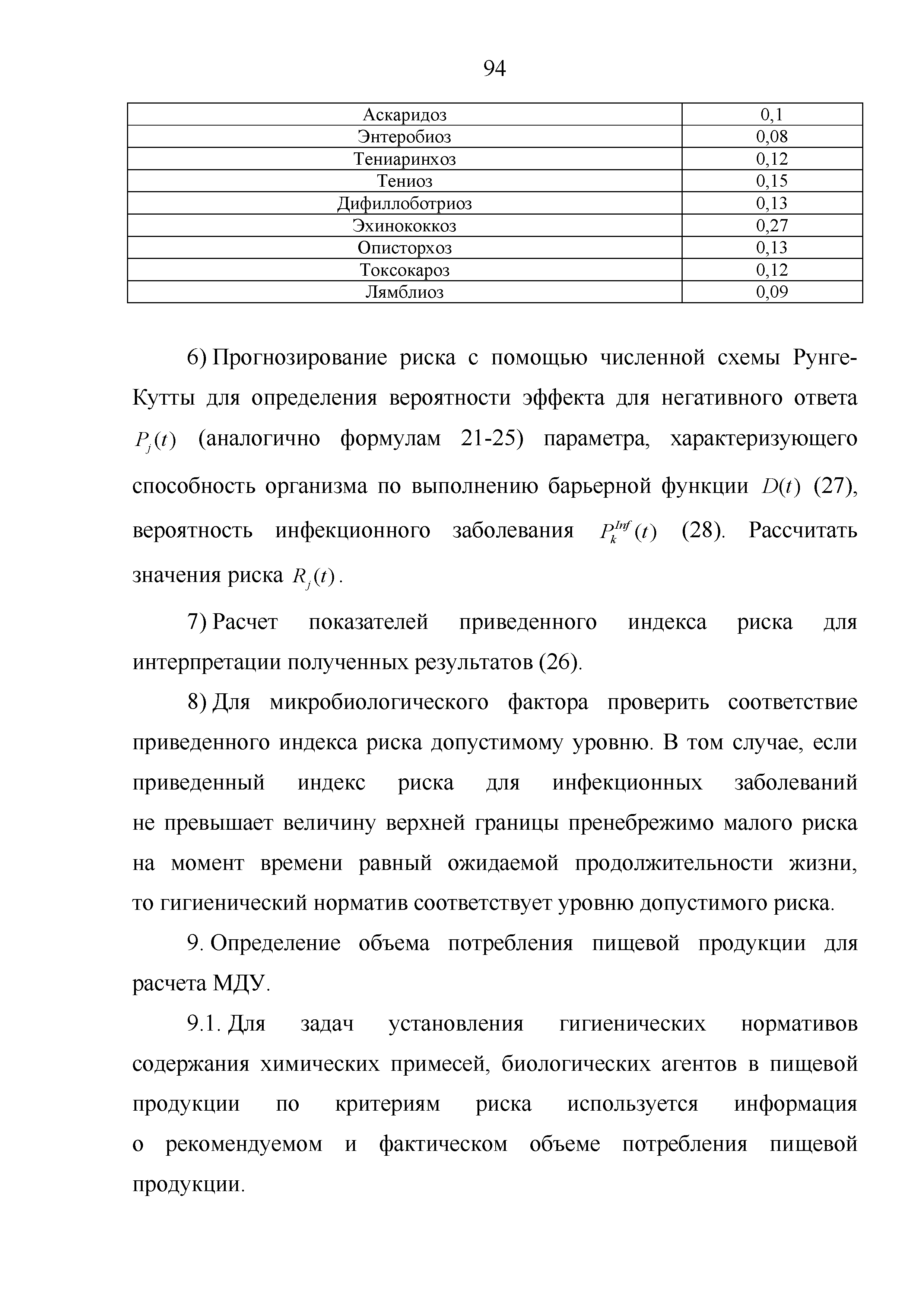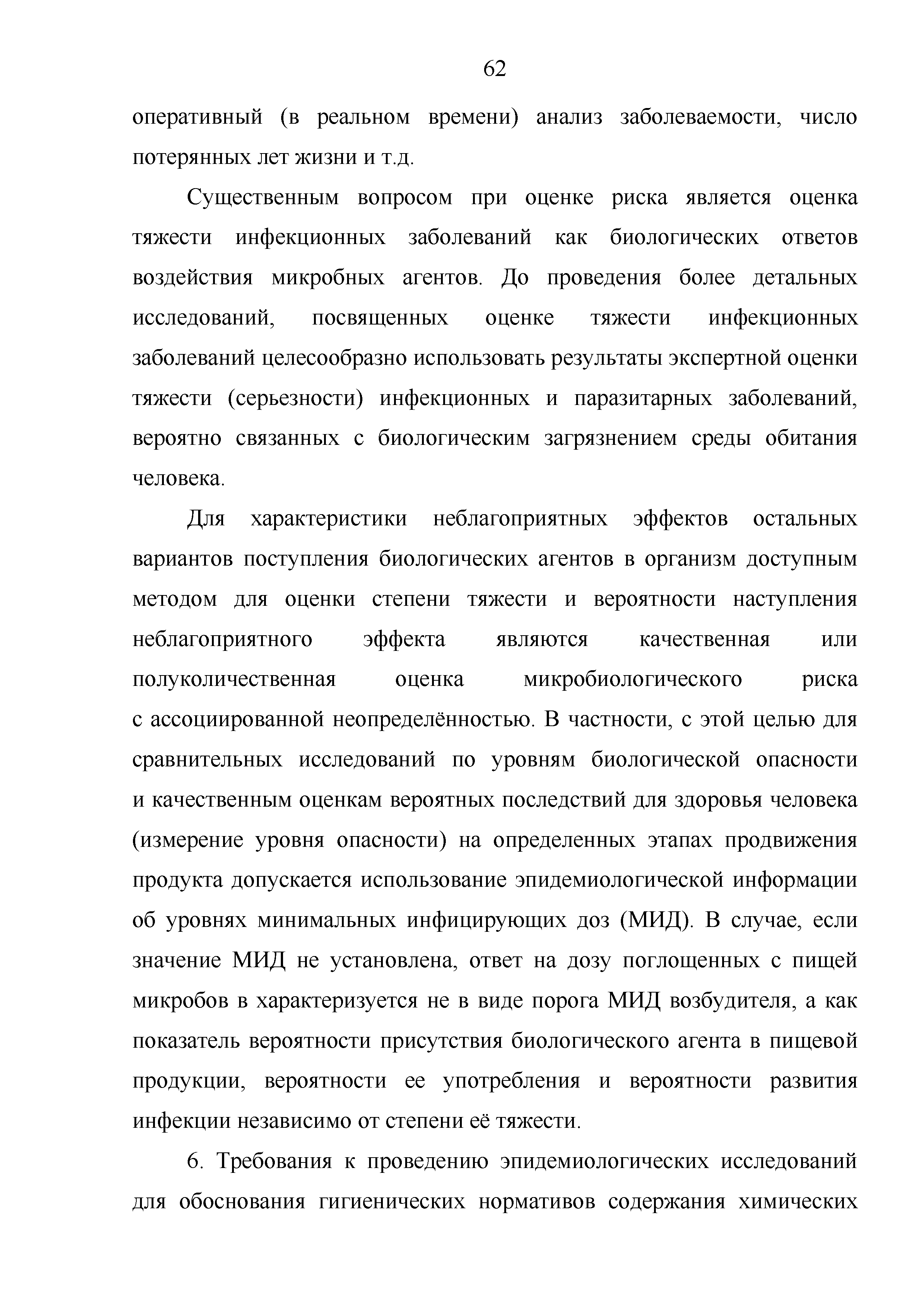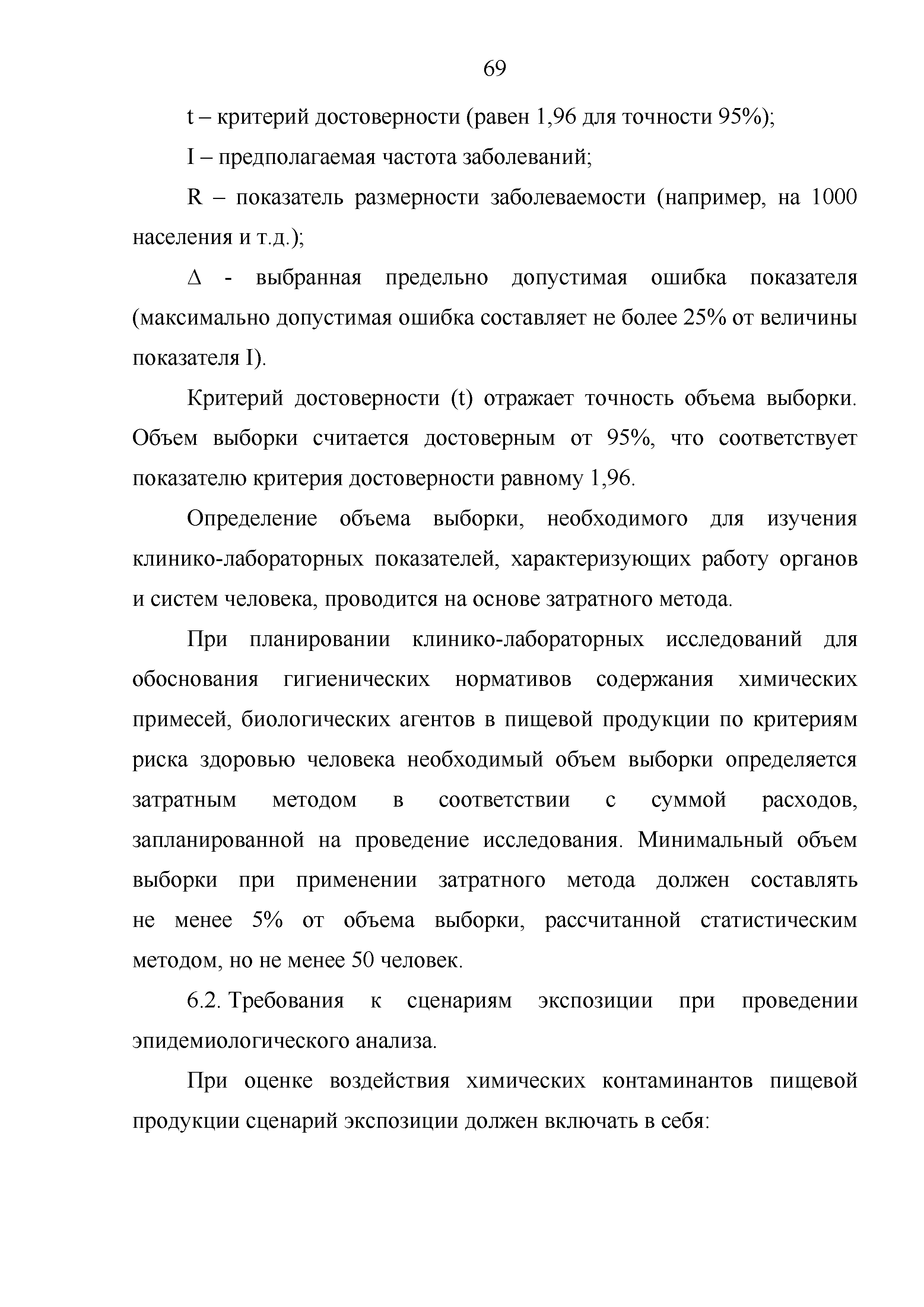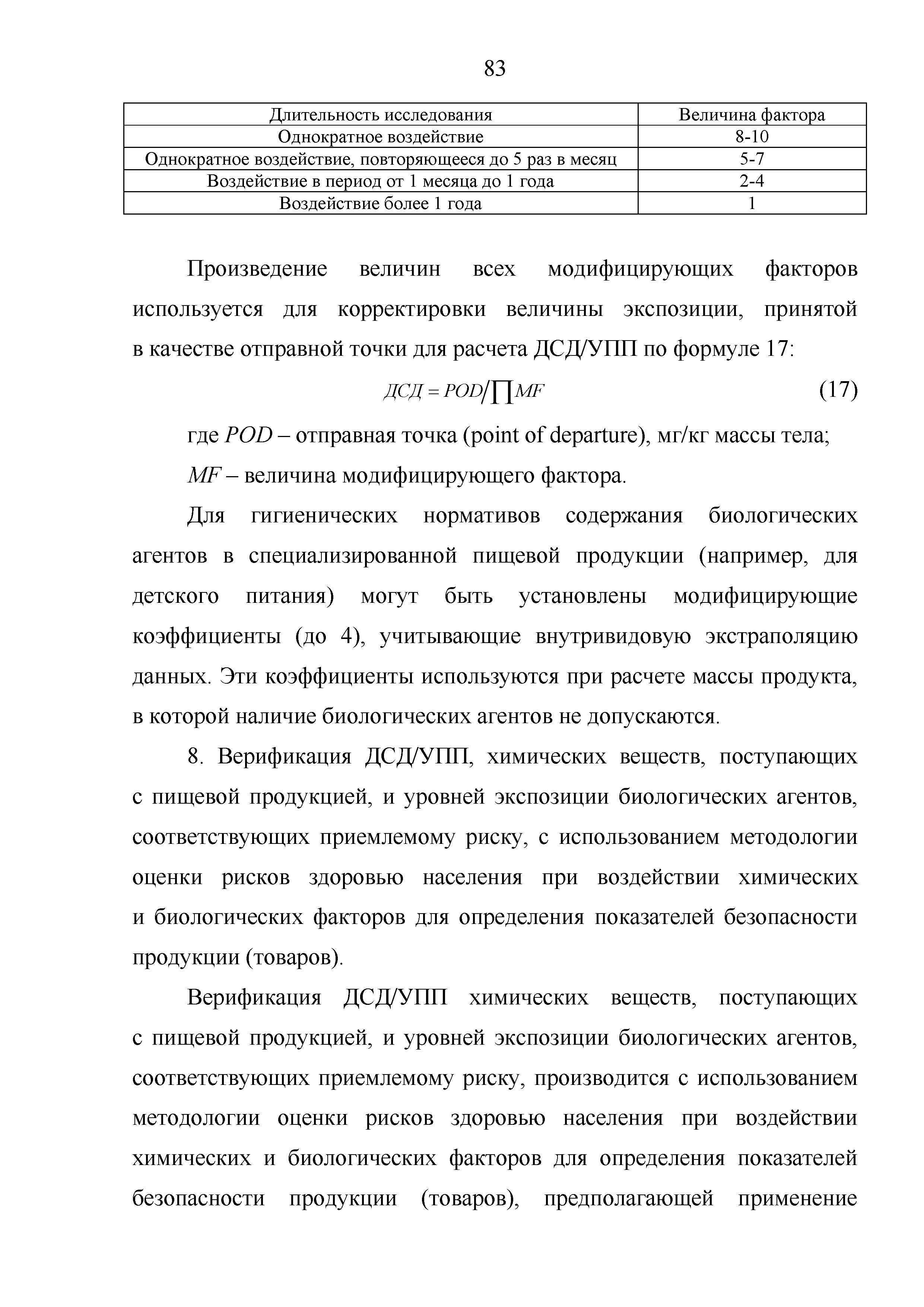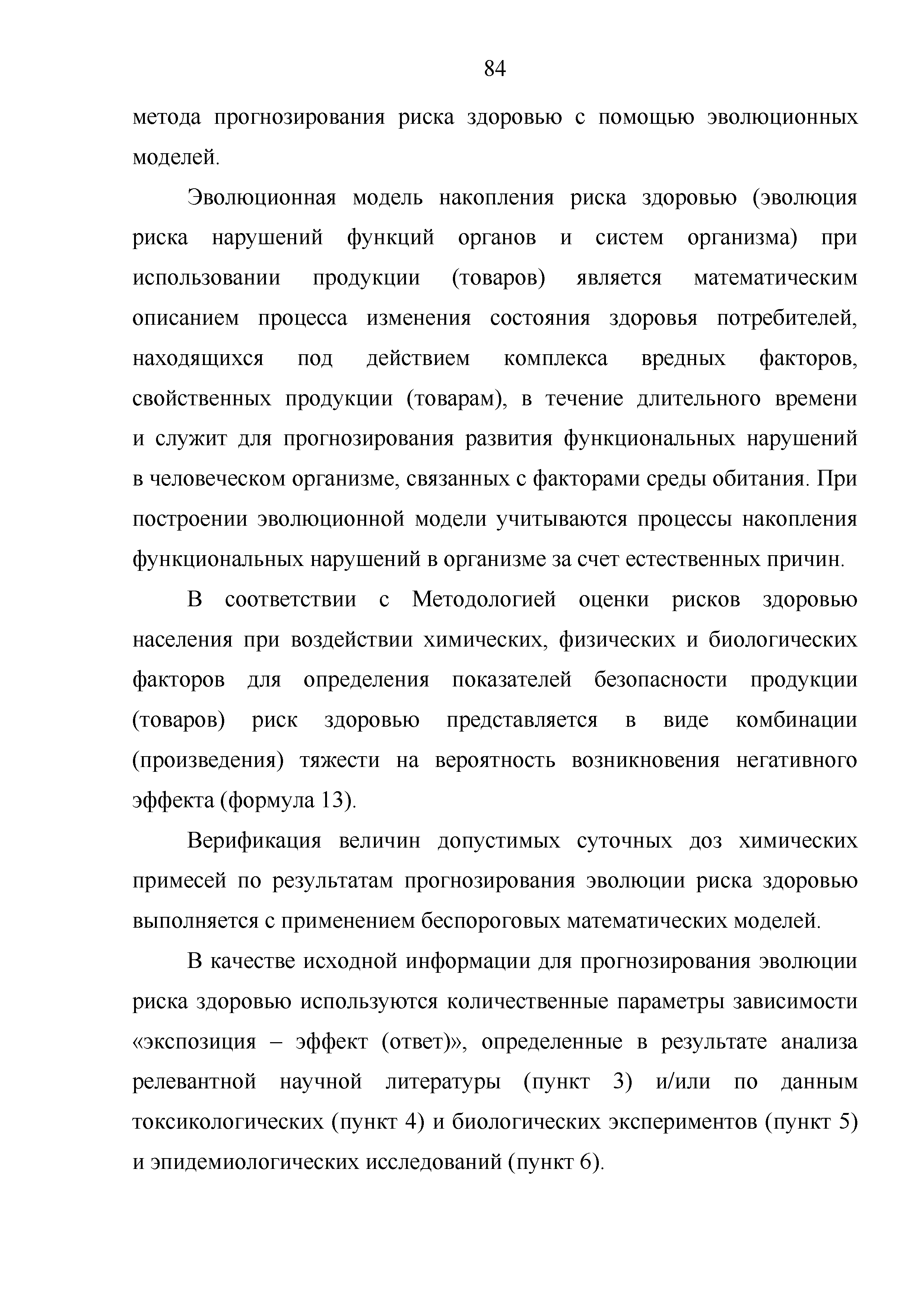 Методические указания по установлению и обоснованию гигиенических нормативов содержания химических примесей, биологических агентов в пищевой продукции по критериям риска для здоровья человека| Статус: | справочные материалы, мп, тпр | | Название рус.: | Методические указания по установлению и обоснованию гигиенических нормативов содержания химических примесей, биологических агентов в пищевой продукции по критериям риска для здоровья человека | | Дата добавления в базу: | 01.01.2021 | | Дата актуализации: | 01.01.2021 | | Область применения: | Документ разработан в целях унификации исходной информации, способов ее обработки и методического обеспечения процедуры разработки новых и планового пересмотра существующих гигиенических нормативов содержания химических примесей, биологических агентов в пищевой продукции по критериям риска для здоровья человека, включенных в Единые санитарно-эпидемиологические и гигиенические требования к продукции (товарам), подлежащей санитарно-эпидемиологическому надзору (контролю), и технические регламенты Таможенного союза (Евразийского экономического союза). | | Оглавление: | 2 Общие положения 3 Выбор релевантной информации для установления гигиенических нормативов содержания химических примесей, биологических агентов в пищевой продукции по критериям риска. 4 Требования к проведению токсикологических экспериментов и необходимого набора тестов и методик проведения токсикологических экспериментов для обоснования ДСД/УПП 5 Требования к проведению экспериментов и необходимого набора методик проведения экспериментов для обоснования гигиенических нормативов содержания биологических агентов в пищевой продукции по критериям риска здоровью человека 6 Требования к проведению эпидемиологических исследований для обоснования гигиенических нормативов содержания химических примесей биологических агентов в пищевой продукции по критериям риска здоровью человека и его эволюции 7 Установление максимально допустимых уровней содержания химических примесей и биологических агентов в пищевой продукции. 8 Верификация ДСД/УПП, химических веществ, поступающих с пищевой продукцией, и уровней экспозиции биологических агентов, соответствующих приемлемому риску, с использованием методологии оценки рисков здоровью населения при воздействии химических и биологических факторов для определения показателей безопасности продукции (товаров) 9 Определение объема потребления пищевой продукции для расчета МДУ 10 Определение максимально допустимых уровней (МДУ) химических примесей и биологических агентов в пищевой продукции. | | Утверждён: | 26.02.2020 Евразийская экономическая комиссия (4)