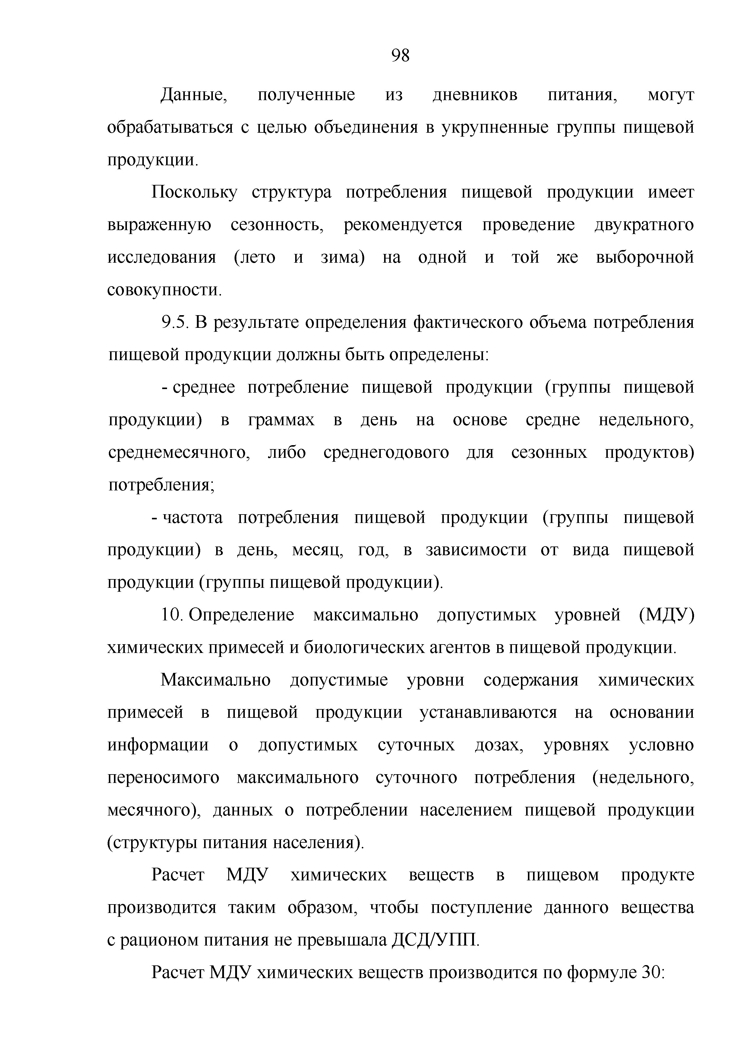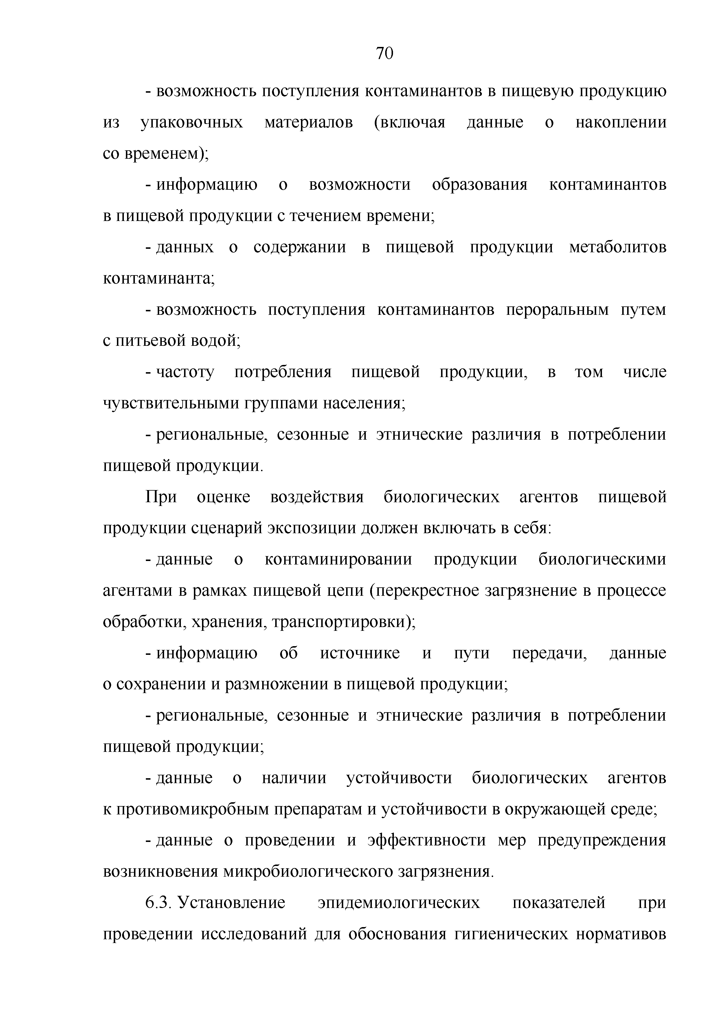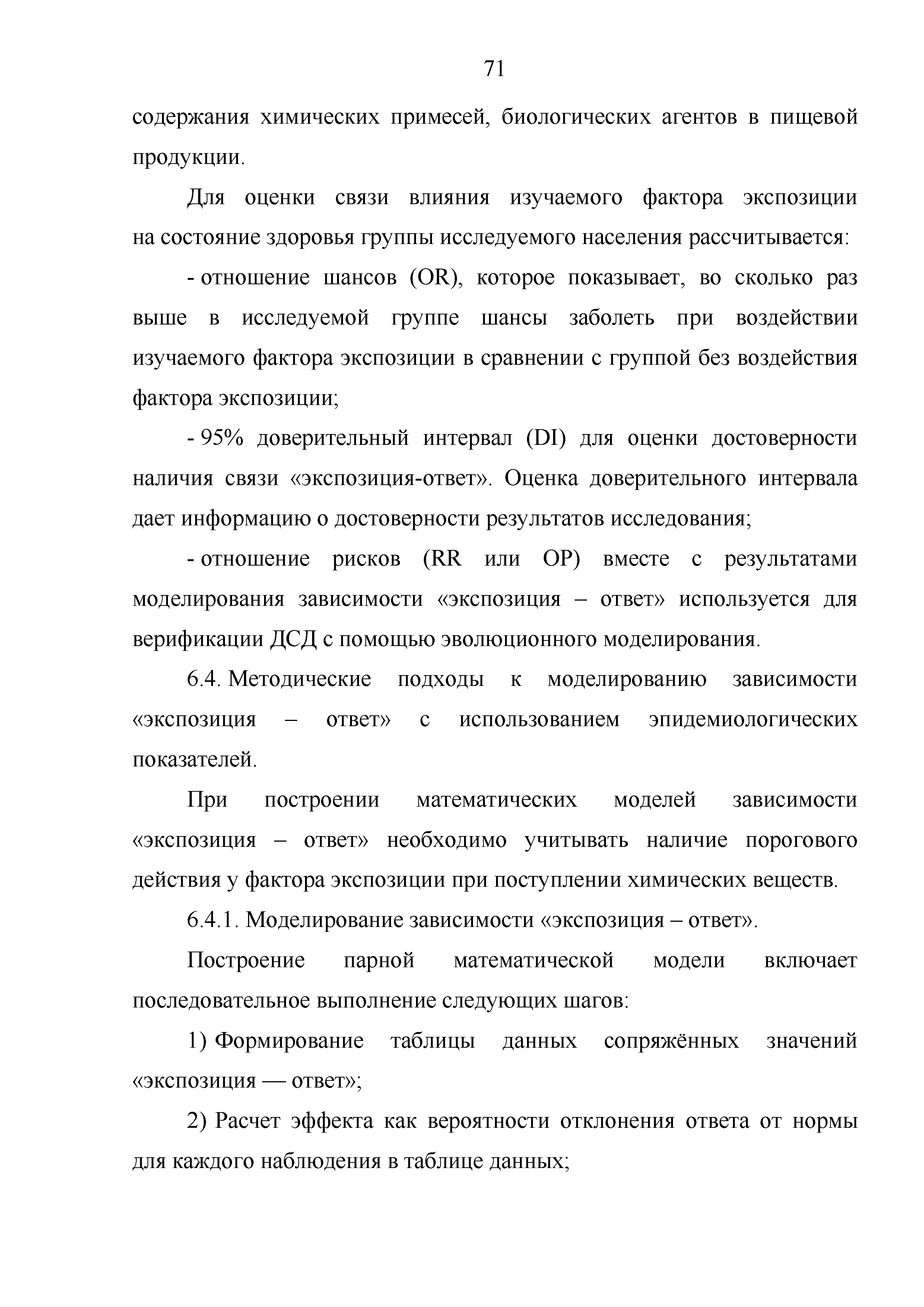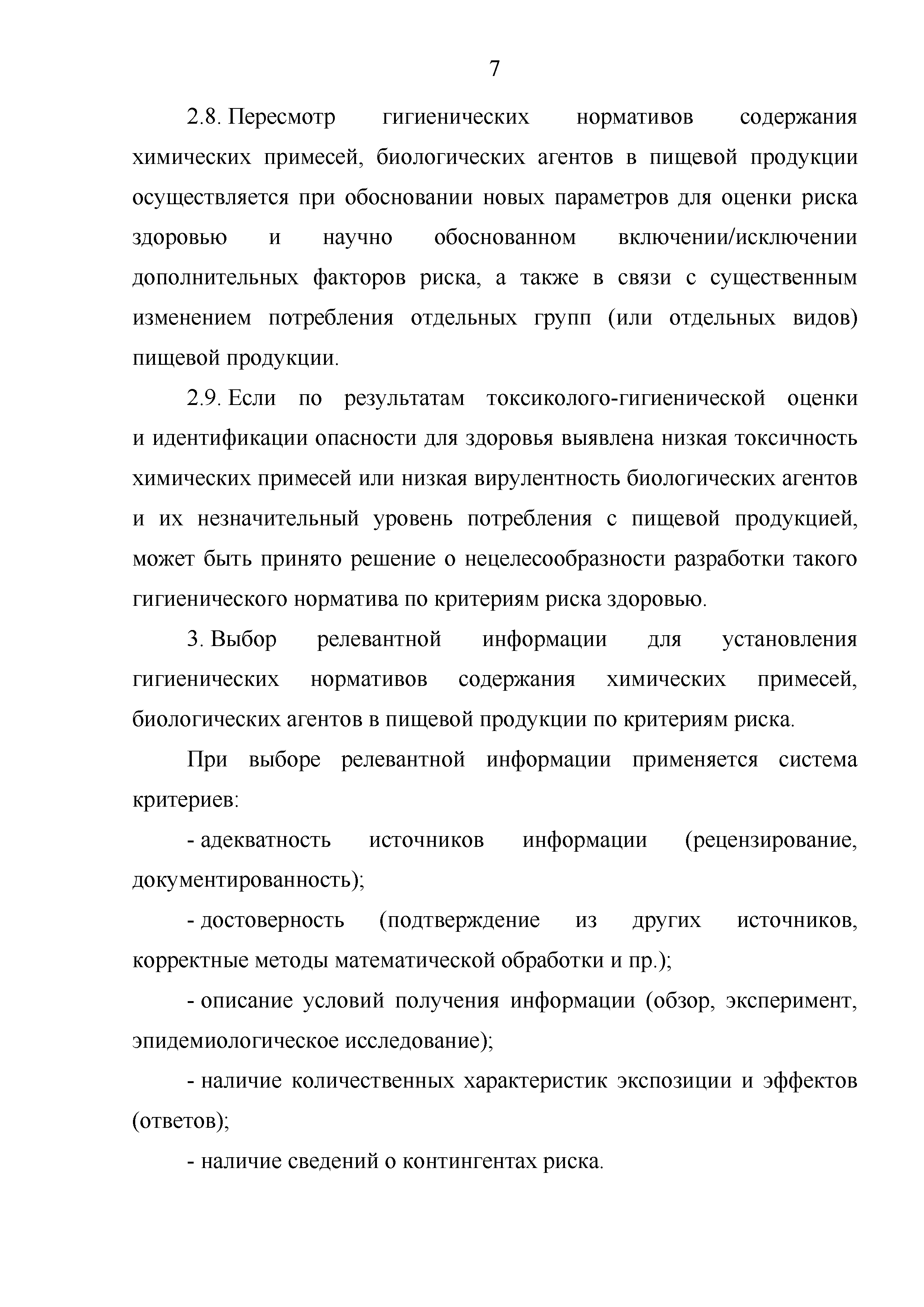 Методические указания по установлению и обоснованию гигиенических нормативов содержания химических примесей, биологических агентов в пищевой продукции по критериям риска для здоровья человека| Статус: | справочные материалы, мп, тпр | | Название рус.: | Методические указания по установлению и обоснованию гигиенических нормативов содержания химических примесей, биологических агентов в пищевой продукции по критериям риска для здоровья человека | | Дата добавления в базу: | 01.01.2021 | | Дата актуализации: | 01.01.2021 | | Область применения: | Документ разработан в целях унификации исходной информации, способов ее обработки и методического обеспечения процедуры разработки новых и планового пересмотра существующих гигиенических нормативов содержания химических примесей, биологических агентов в пищевой продукции по критериям риска для здоровья человека, включенных в Единые санитарно-эпидемиологические и гигиенические требования к продукции (товарам), подлежащей санитарно-эпидемиологическому надзору (контролю), и технические регламенты Таможенного союза (Евразийского экономического союза). | | Оглавление: | 2 Общие положения 3 Выбор релевантной информации для установления гигиенических нормативов содержания химических примесей, биологических агентов в пищевой продукции по критериям риска. 4 Требования к проведению токсикологических экспериментов и необходимого набора тестов и методик проведения токсикологических экспериментов для обоснования ДСД/УПП 5 Требования к проведению экспериментов и необходимого набора методик проведения экспериментов для обоснования гигиенических нормативов содержания биологических агентов в пищевой продукции по критериям риска здоровью человека 6 Требования к проведению эпидемиологических исследований для обоснования гигиенических нормативов содержания химических примесей биологических агентов в пищевой продукции по критериям риска здоровью человека и его эволюции 7 Установление максимально допустимых уровней содержания химических примесей и биологических агентов в пищевой продукции. 8 Верификация ДСД/УПП, химических веществ, поступающих с пищевой продукцией, и уровней экспозиции биологических агентов, соответствующих приемлемому риску, с использованием методологии оценки рисков здоровью населения при воздействии химических и биологических факторов для определения показателей безопасности продукции (товаров) 9 Определение объема потребления пищевой продукции для расчета МДУ 10 Определение максимально допустимых уровней (МДУ) химических примесей и биологических агентов в пищевой продукции. | | Утверждён: | 26.02.2020 Евразийская экономическая комиссия (4)