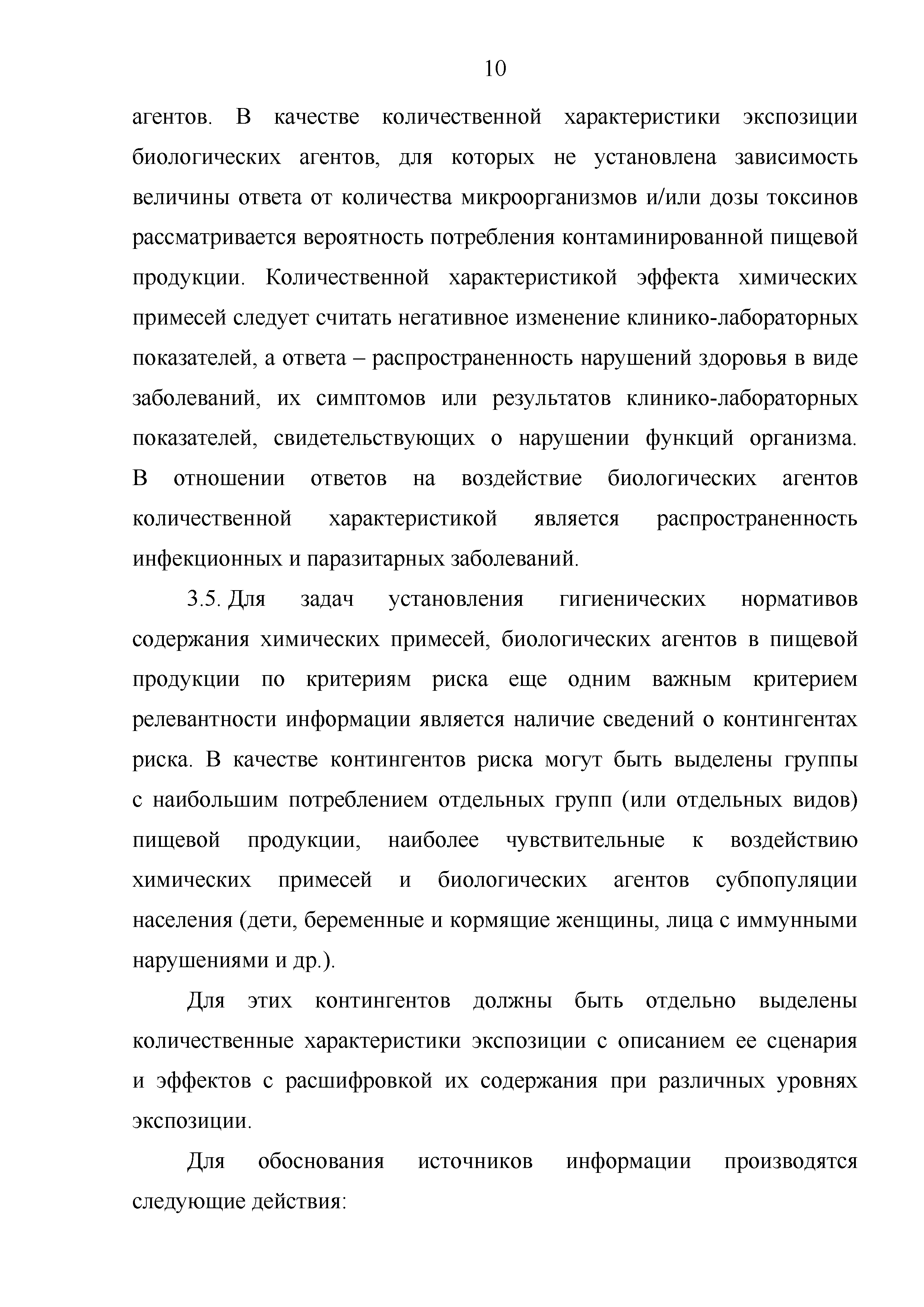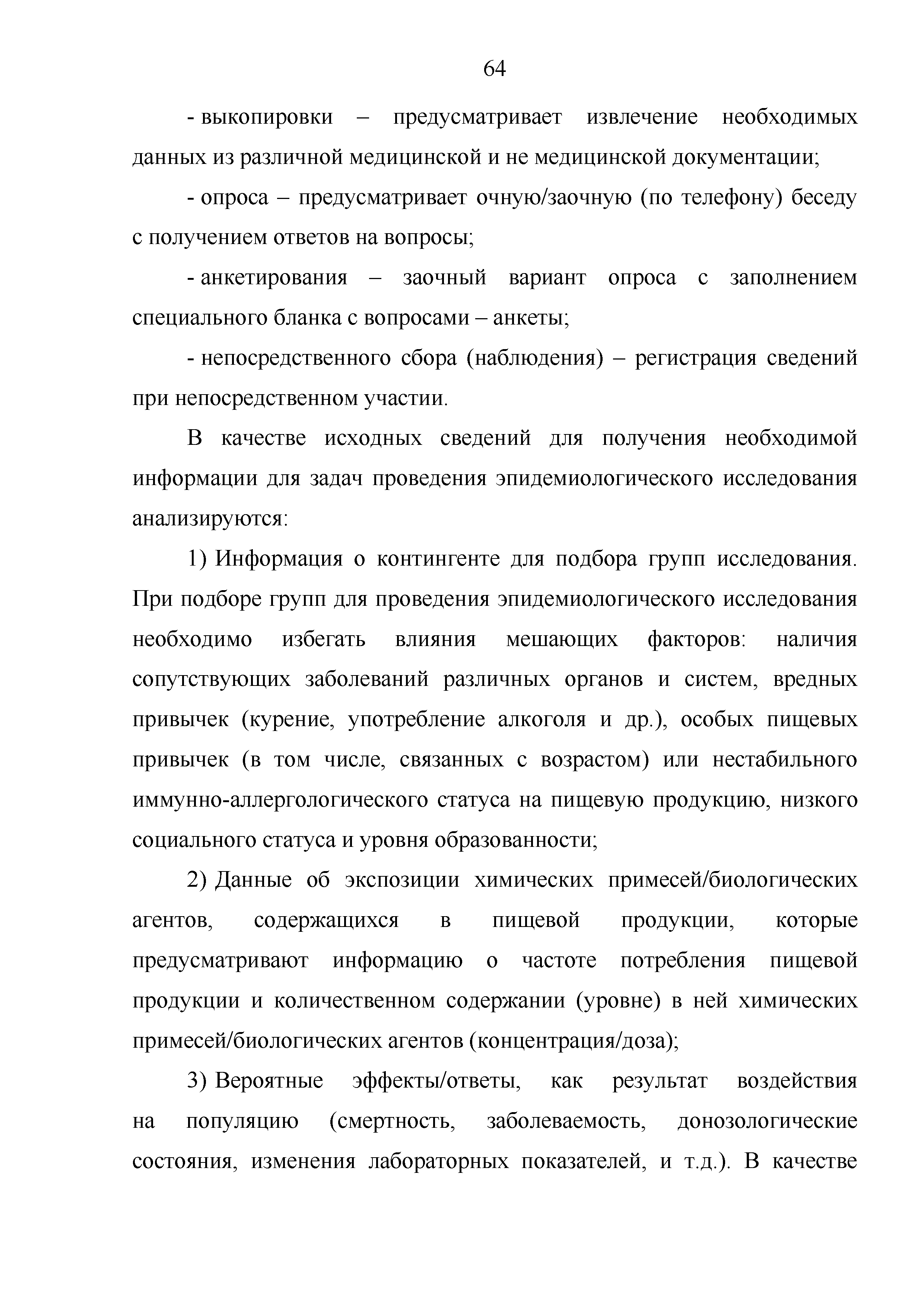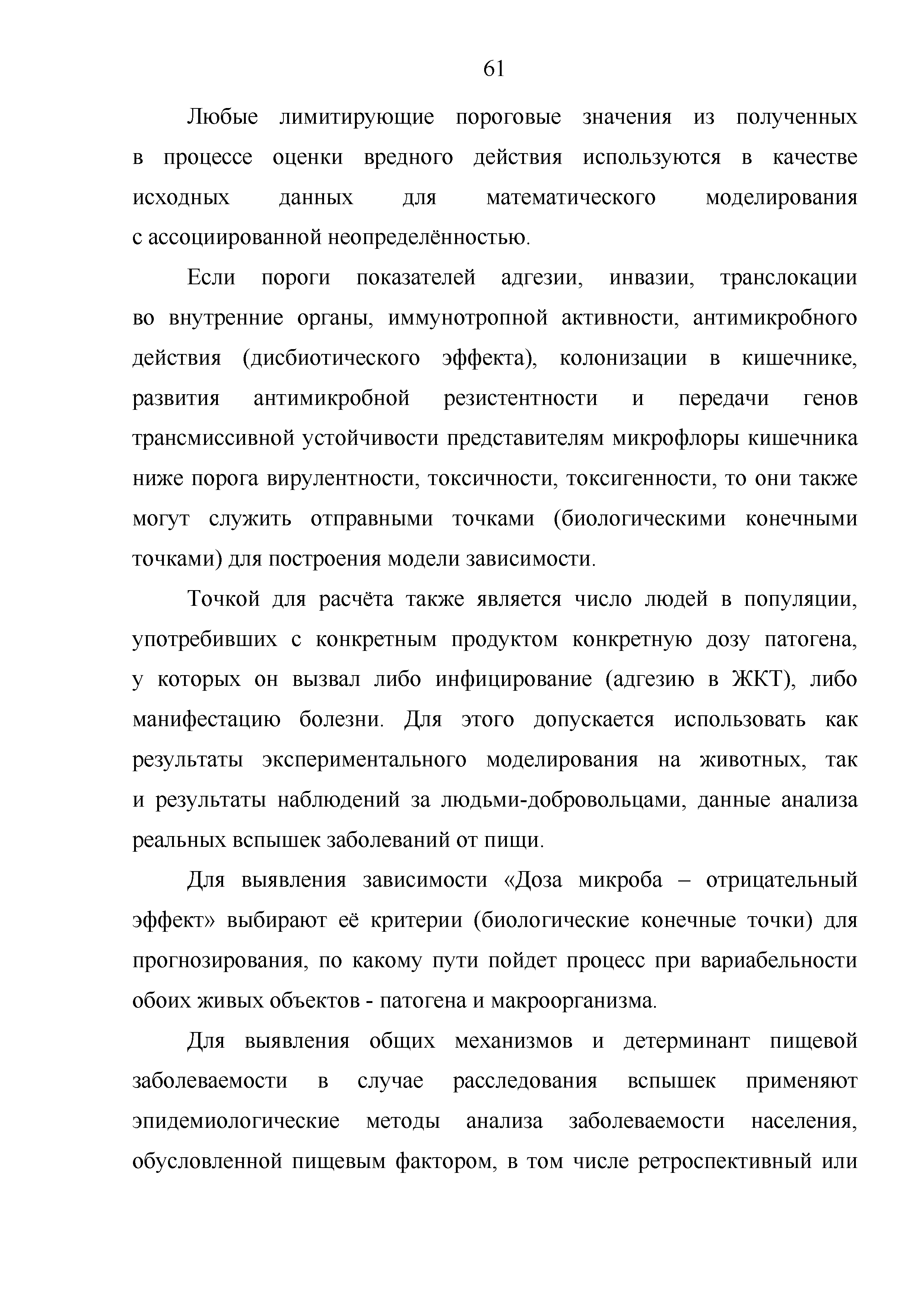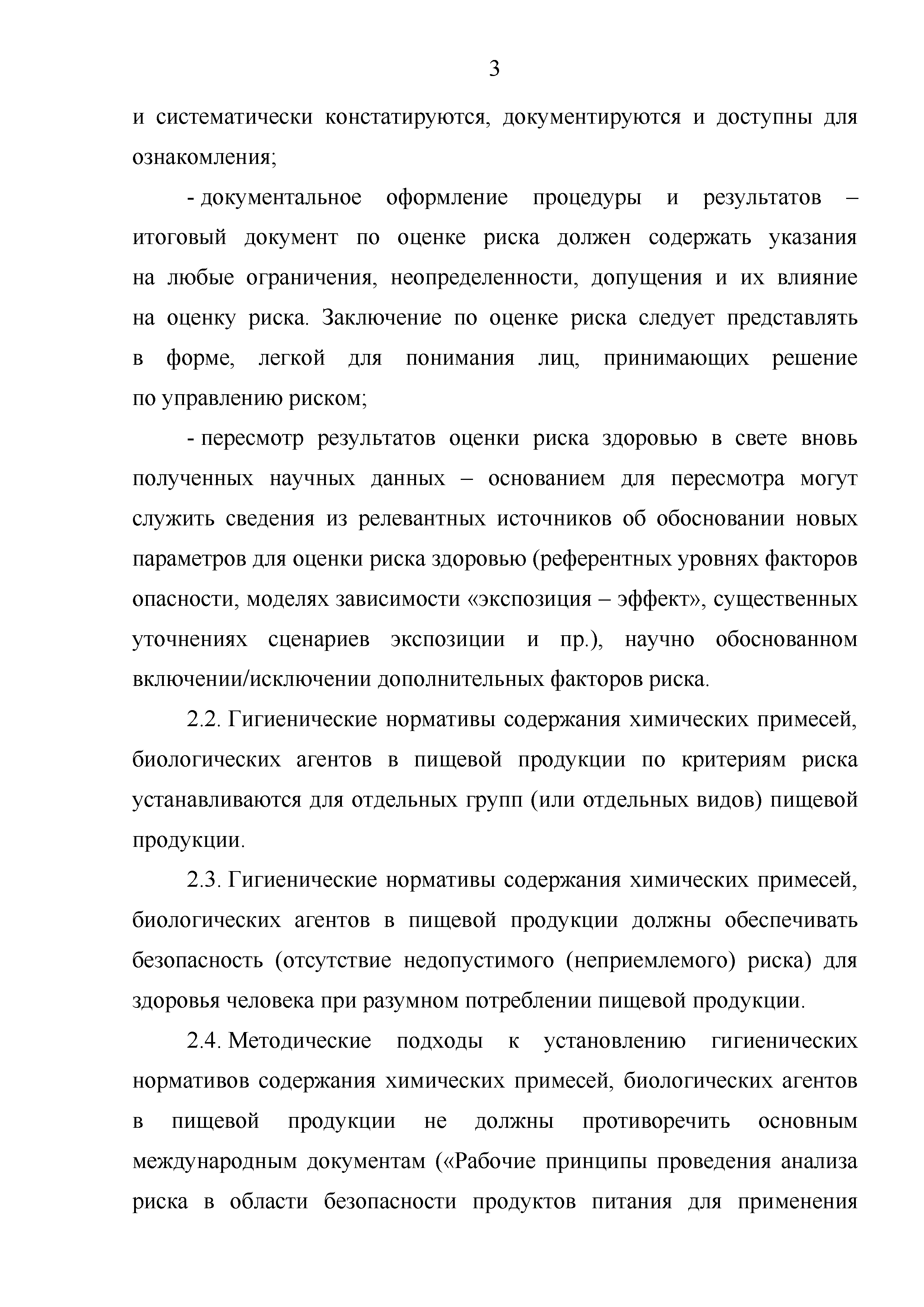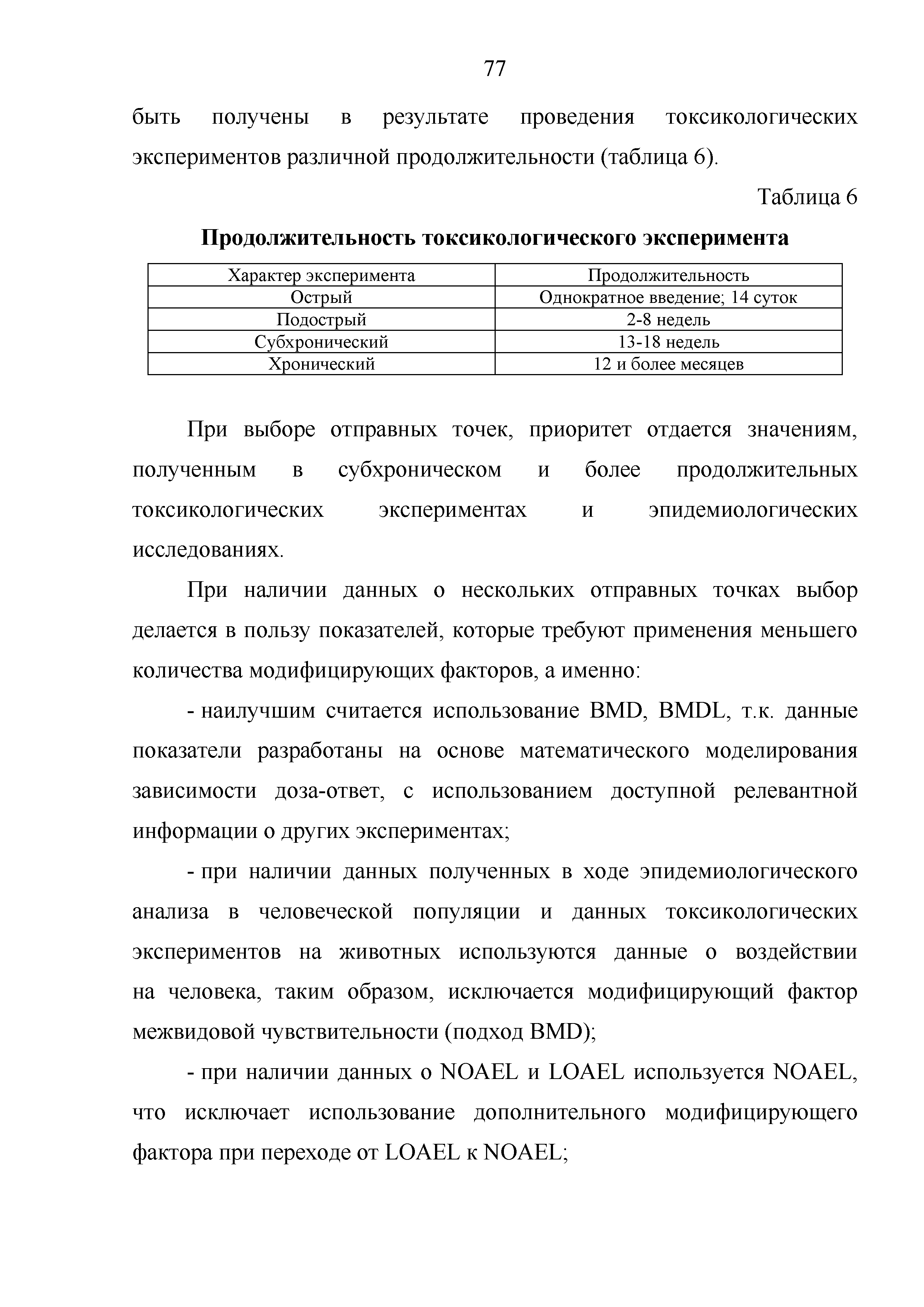 Методические указания по установлению и обоснованию гигиенических нормативов содержания химических примесей, биологических агентов в пищевой продукции по критериям риска для здоровья человека| Статус: | справочные материалы, мп, тпр | | Название рус.: | Методические указания по установлению и обоснованию гигиенических нормативов содержания химических примесей, биологических агентов в пищевой продукции по критериям риска для здоровья человека | | Дата добавления в базу: | 01.01.2021 | | Дата актуализации: | 01.01.2021 | | Область применения: | Документ разработан в целях унификации исходной информации, способов ее обработки и методического обеспечения процедуры разработки новых и планового пересмотра существующих гигиенических нормативов содержания химических примесей, биологических агентов в пищевой продукции по критериям риска для здоровья человека, включенных в Единые санитарно-эпидемиологические и гигиенические требования к продукции (товарам), подлежащей санитарно-эпидемиологическому надзору (контролю), и технические регламенты Таможенного союза (Евразийского экономического союза). | | Оглавление: | 2 Общие положения 3 Выбор релевантной информации для установления гигиенических нормативов содержания химических примесей, биологических агентов в пищевой продукции по критериям риска. 4 Требования к проведению токсикологических экспериментов и необходимого набора тестов и методик проведения токсикологических экспериментов для обоснования ДСД/УПП 5 Требования к проведению экспериментов и необходимого набора методик проведения экспериментов для обоснования гигиенических нормативов содержания биологических агентов в пищевой продукции по критериям риска здоровью человека 6 Требования к проведению эпидемиологических исследований для обоснования гигиенических нормативов содержания химических примесей биологических агентов в пищевой продукции по критериям риска здоровью человека и его эволюции 7 Установление максимально допустимых уровней содержания химических примесей и биологических агентов в пищевой продукции. 8 Верификация ДСД/УПП, химических веществ, поступающих с пищевой продукцией, и уровней экспозиции биологических агентов, соответствующих приемлемому риску, с использованием методологии оценки рисков здоровью населения при воздействии химических и биологических факторов для определения показателей безопасности продукции (товаров) 9 Определение объема потребления пищевой продукции для расчета МДУ 10 Определение максимально допустимых уровней (МДУ) химических примесей и биологических агентов в пищевой продукции. | | Утверждён: | 26.02.2020 Евразийская экономическая комиссия (4)