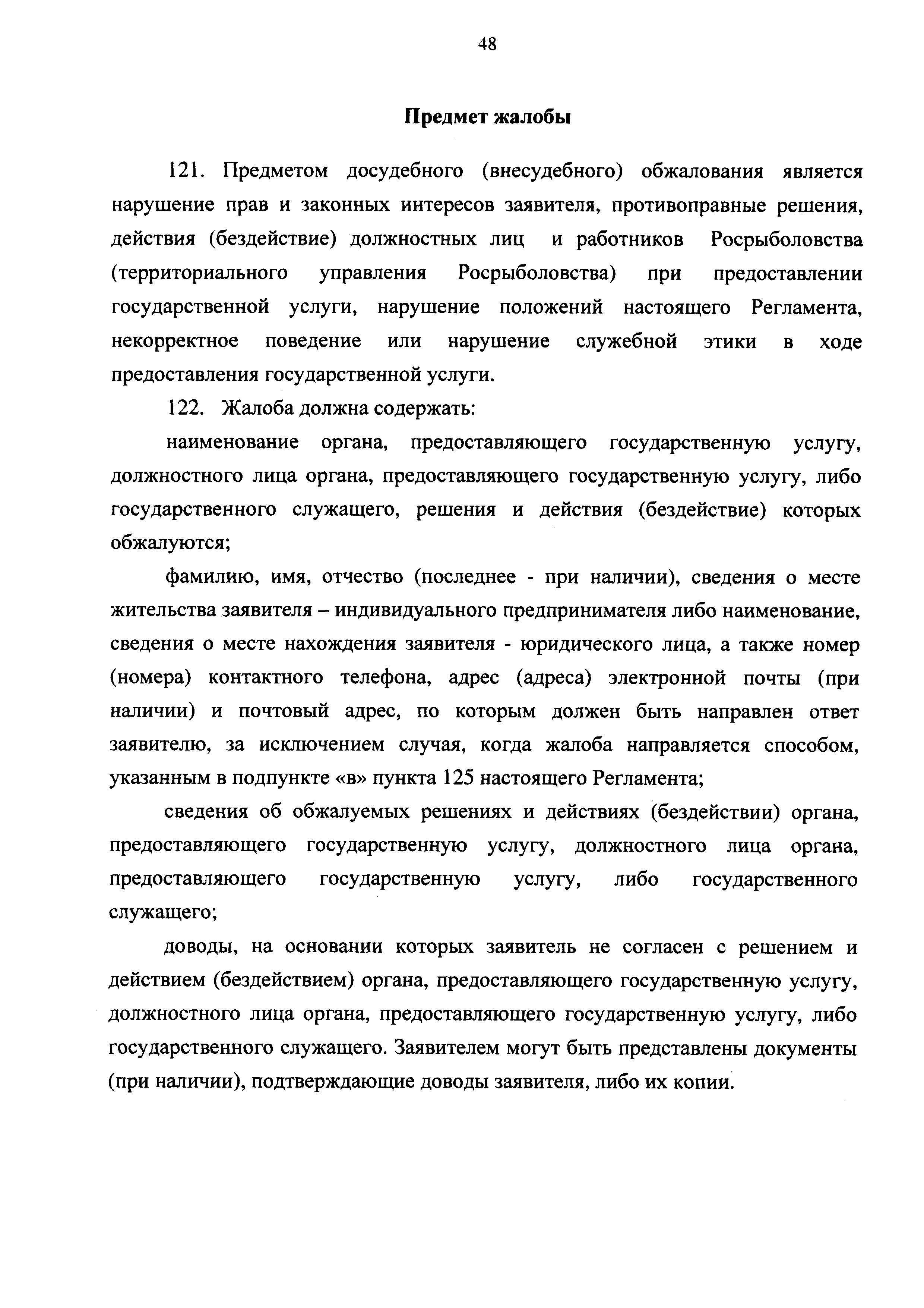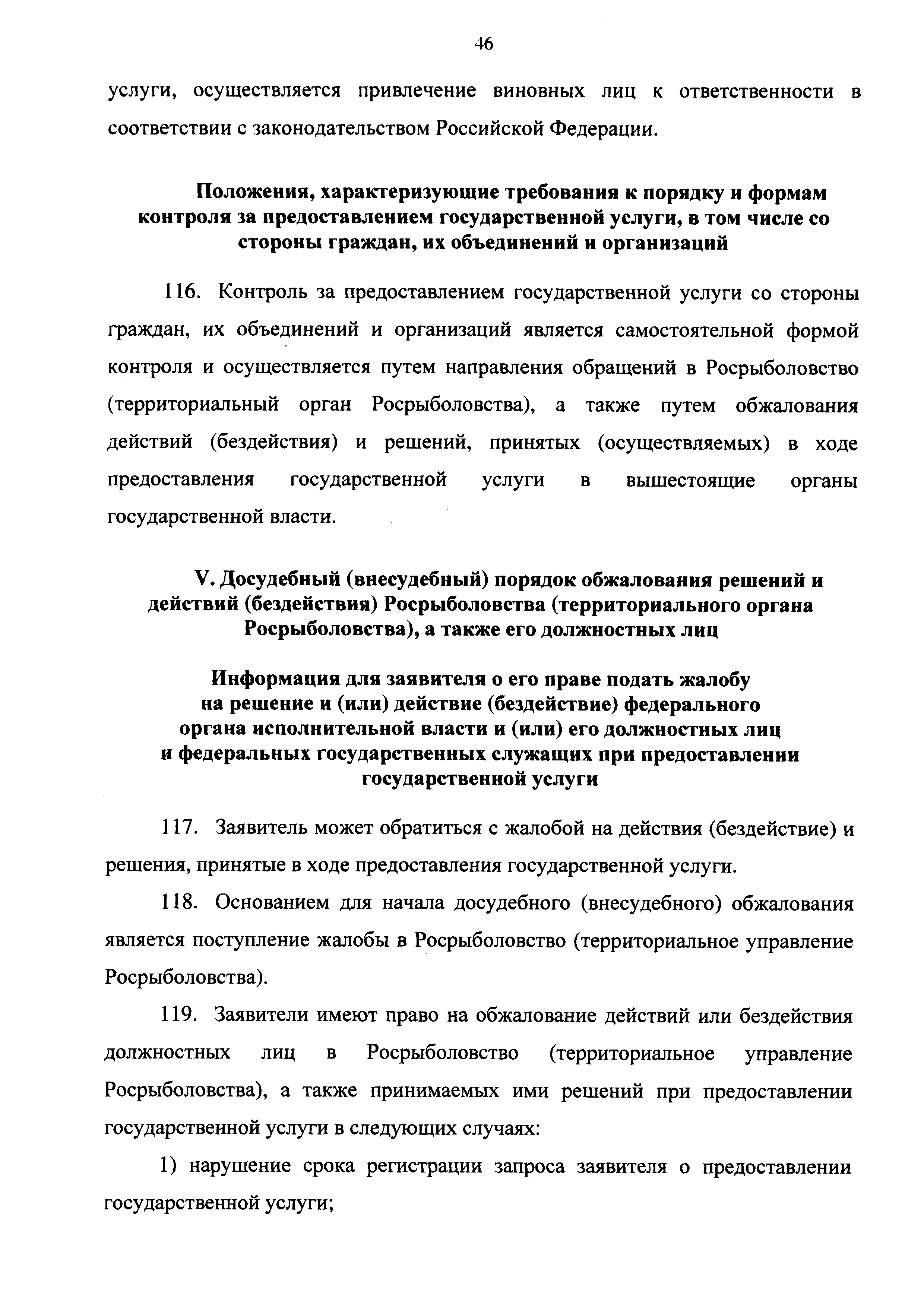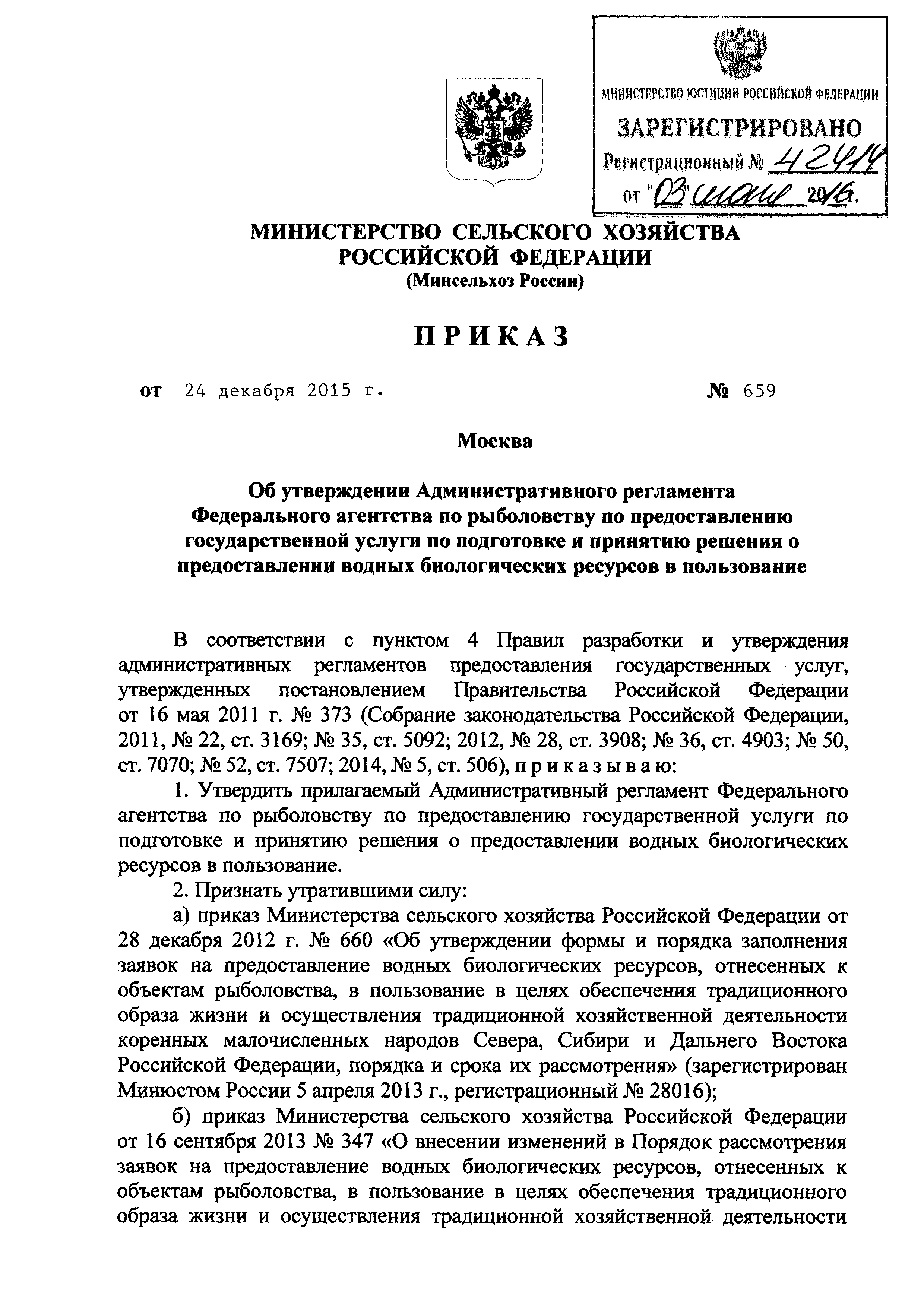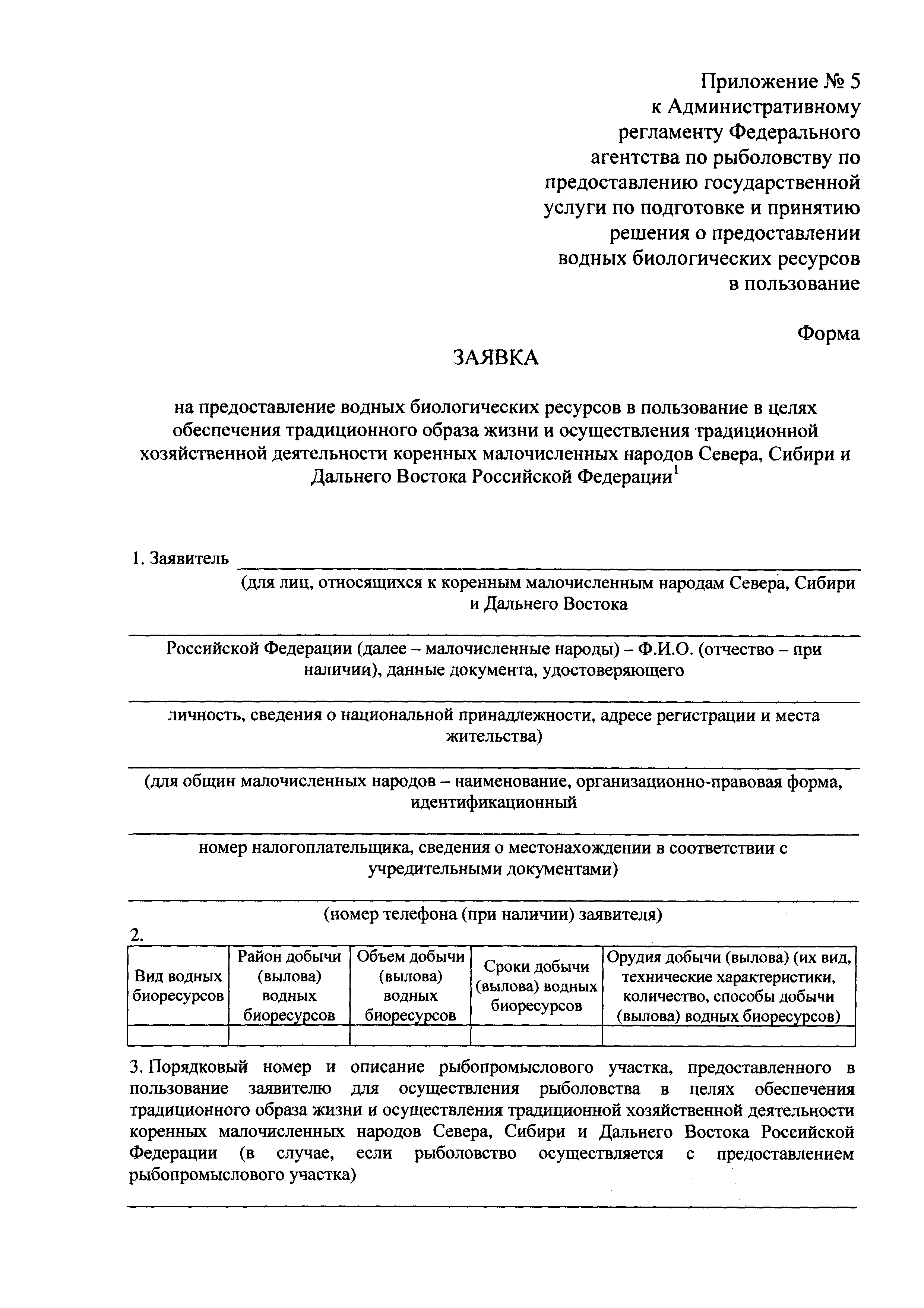 Административный регламент Федерального агентства по рыболовству по предоставлению государственной услуги по подготовке и принятию решения о предоставлении водных биологических ресурсов в пользование| Статус: | действует | | Название рус.: | Административный регламент Федерального агентства по рыболовству по предоставлению государственной услуги по подготовке и принятию решения о предоставлении водных биологических ресурсов в пользование | | Дата добавления в базу: | 01.01.2021 | | Дата актуализации: | 01.01.2021 | | Дата введения: | 18.06.2016 | | Область применения: | Административный регламент Федерального агентства по рыболовству по предоставлению государственной услуги по подготовке и принятию решения о предоставлении водных биологических ресурсов в пользование устанавливает сроки и последовательность административных процедур (действий), осуществляемых Росрыболовством (территориальными органами Росрыболовства), порядок взаимодействия между структурными подразделениями Росрыболовства (территориальных органов Росрыболовства), их должностными лицами, а также взаимодействие Росрыболовства (территориальных органов Росрыболовства) с заявителями при предоставлении государственной услуги | | Оглавление: | I. Общие положения II. Стандарт предоставления государственной услуги III. Состав, последовательность и сроки выполнения административных процедур, требования к порядку их выполнения IV. Формы контроля за предоставлением государственной услуги V. Досудебный (внесудебный) порядок обжалования решений и действий (бездействия) Росрыболовства (территориального органа Росрыболовства), а также его должностных лиц Приложение № 1. Место нахождения, справочные телефоны и график работы территориальных управлений Росрыболовства Приложение № 2. Заявка о предоставлении водных биологических ресурсов в пользование для осуществления рыболовства в научно-исследовательских и контрольных целях Приложение № 3. Заявка о предоставлении водных биологических ресурсов в пользование для осуществления рыболовства в учебных и культурно-просветительских целях Приложение № 4. Заявка о предоставлении водных биологических ресурсов в пользование для осуществления рыболовства в целях аквакультуры (рыбоводства) Приложение № 5. Заявка на предоставление водных биологических ресурсов в пользование в целях обеспечения традиционного образа жизни и осуществления традиционной хозяйственной деятельности коренных малочисленных народов Севера, Сибири и Дальнего Востока Российской Федерации Приложение № 6. Блок-схема предоставления государственной услуги по подготовке и принятию решения о предоставлении водных биологических ресурсов в пользование | | Утверждён: | 24.12.2015 Министерство сельского хозяйства Российской Федерации (659)