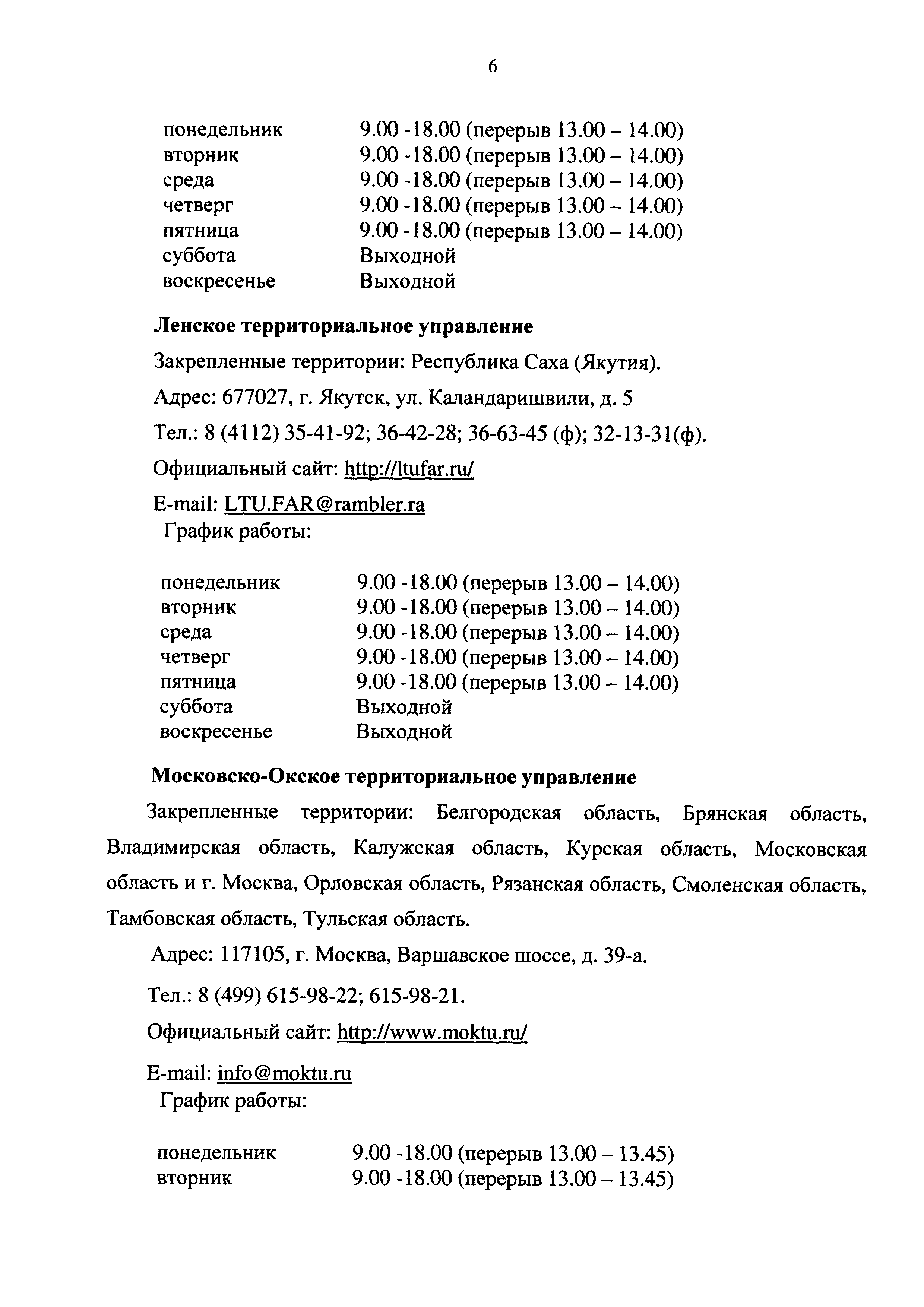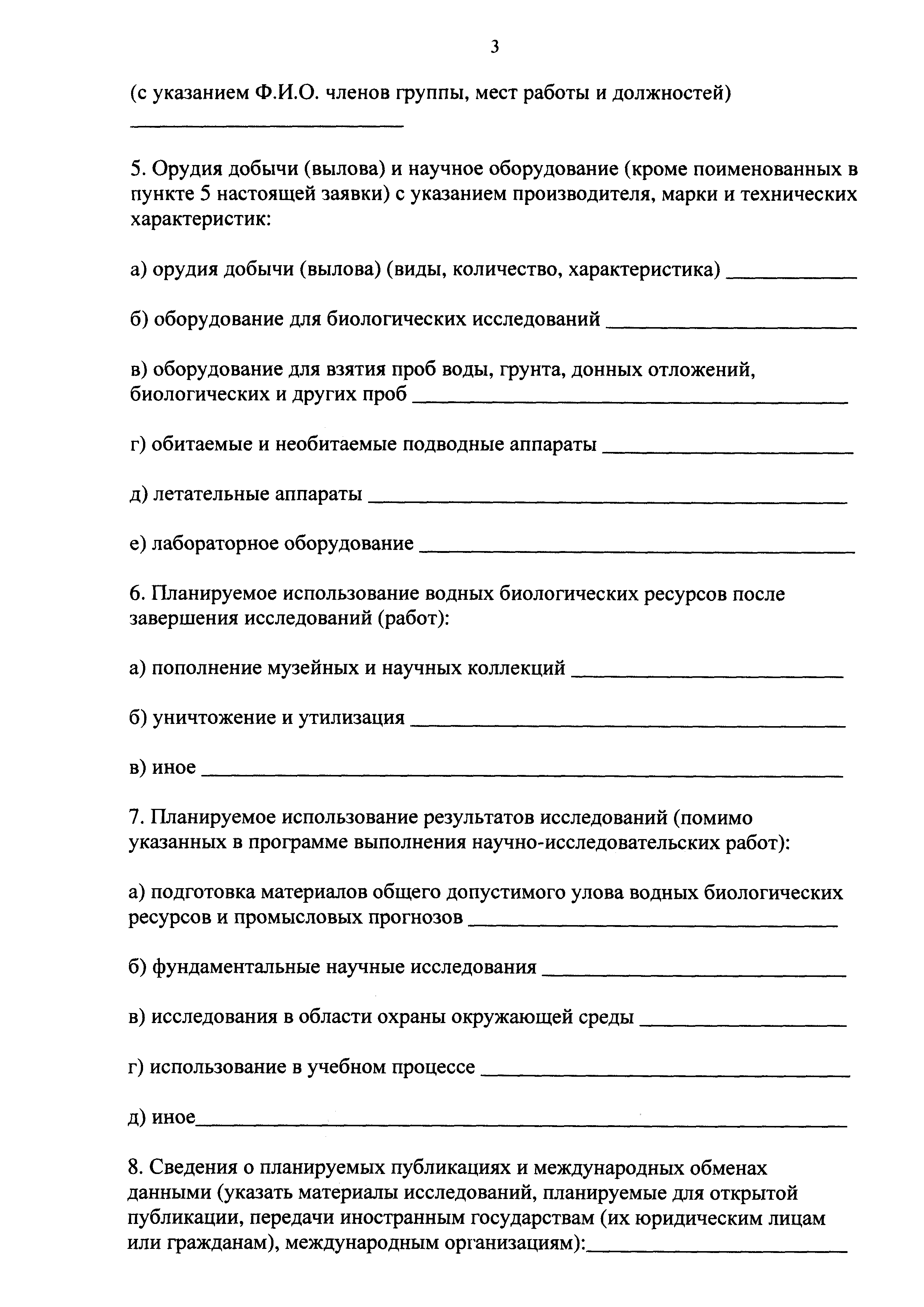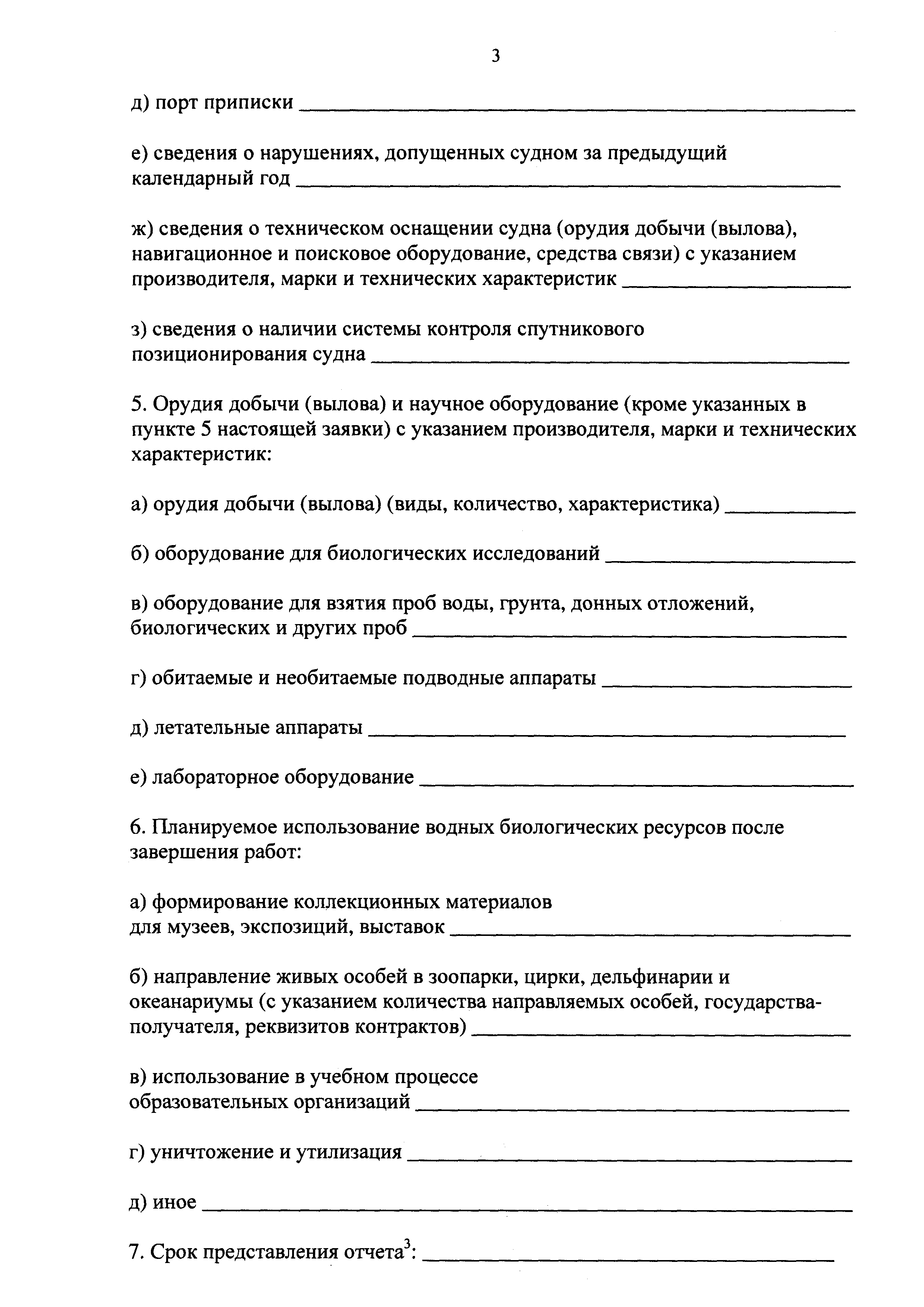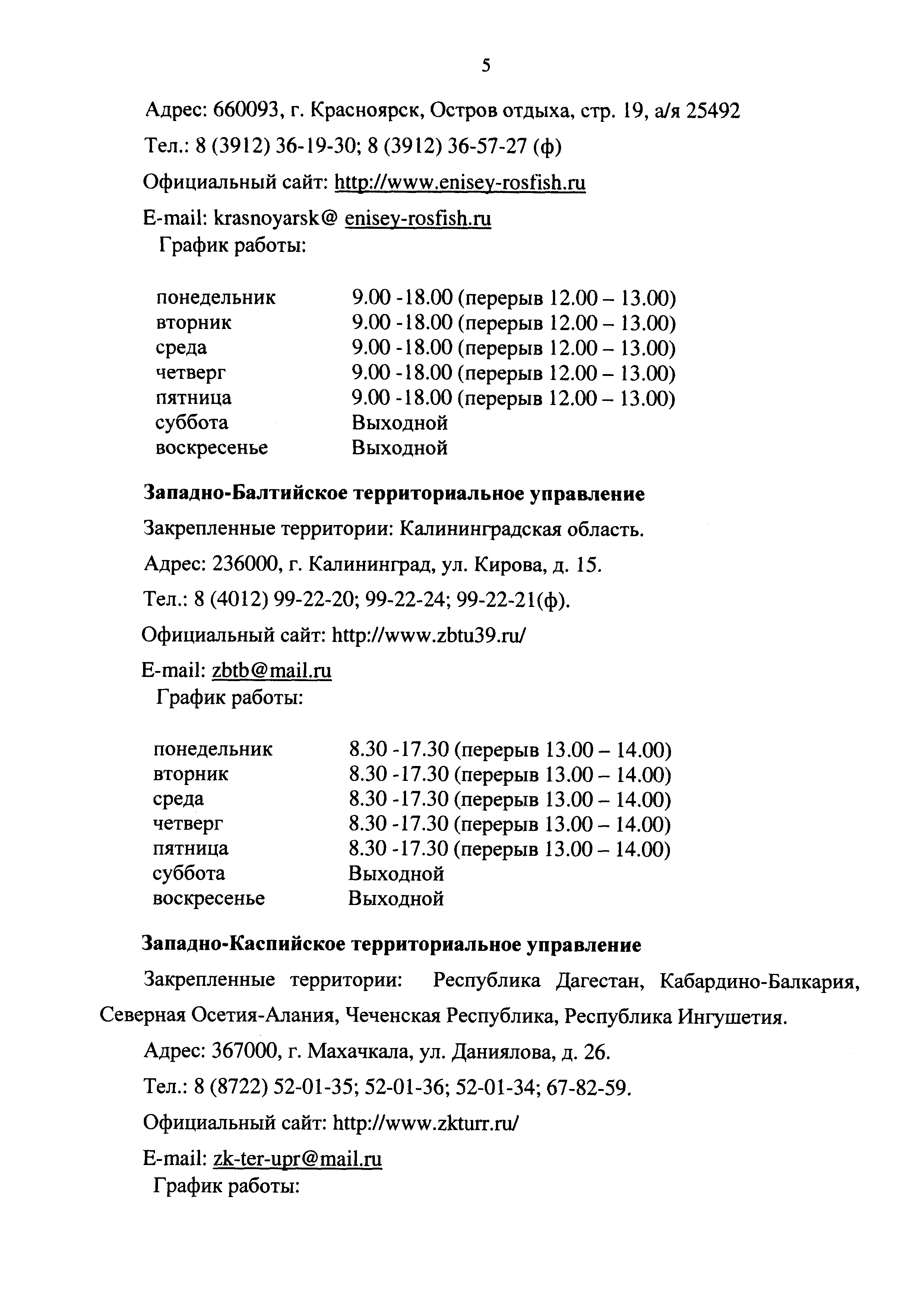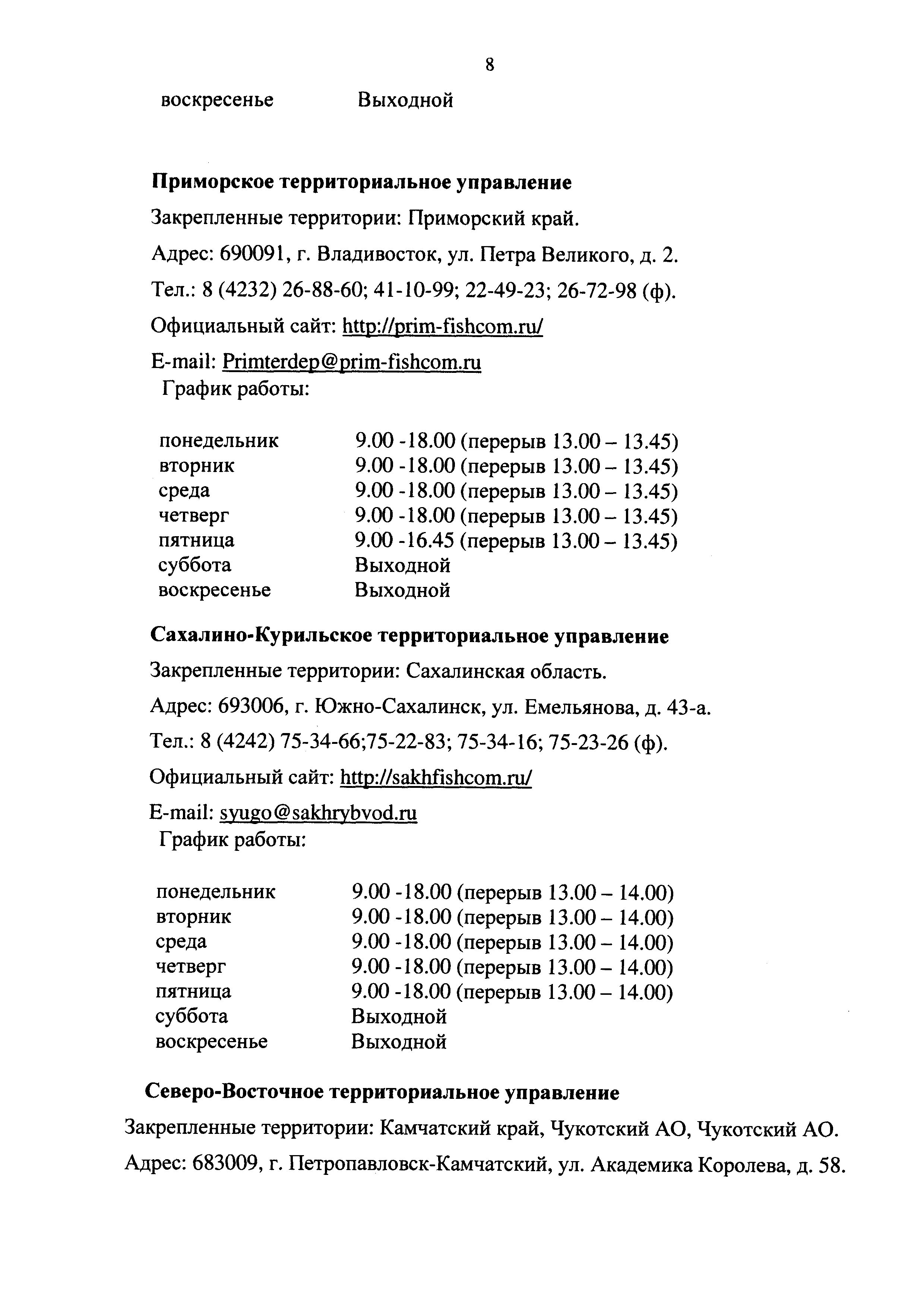 Административный регламент Федерального агентства по рыболовству по предоставлению государственной услуги по подготовке и принятию решения о предоставлении водных биологических ресурсов в пользование| Статус: | действует | | Название рус.: | Административный регламент Федерального агентства по рыболовству по предоставлению государственной услуги по подготовке и принятию решения о предоставлении водных биологических ресурсов в пользование | | Дата добавления в базу: | 01.01.2021 | | Дата актуализации: | 01.01.2021 | | Дата введения: | 18.06.2016 | | Область применения: | Административный регламент Федерального агентства по рыболовству по предоставлению государственной услуги по подготовке и принятию решения о предоставлении водных биологических ресурсов в пользование устанавливает сроки и последовательность административных процедур (действий), осуществляемых Росрыболовством (территориальными органами Росрыболовства), порядок взаимодействия между структурными подразделениями Росрыболовства (территориальных органов Росрыболовства), их должностными лицами, а также взаимодействие Росрыболовства (территориальных органов Росрыболовства) с заявителями при предоставлении государственной услуги | | Оглавление: | I. Общие положения II. Стандарт предоставления государственной услуги III. Состав, последовательность и сроки выполнения административных процедур, требования к порядку их выполнения IV. Формы контроля за предоставлением государственной услуги V. Досудебный (внесудебный) порядок обжалования решений и действий (бездействия) Росрыболовства (территориального органа Росрыболовства), а также его должностных лиц Приложение № 1. Место нахождения, справочные телефоны и график работы территориальных управлений Росрыболовства Приложение № 2. Заявка о предоставлении водных биологических ресурсов в пользование для осуществления рыболовства в научно-исследовательских и контрольных целях Приложение № 3. Заявка о предоставлении водных биологических ресурсов в пользование для осуществления рыболовства в учебных и культурно-просветительских целях Приложение № 4. Заявка о предоставлении водных биологических ресурсов в пользование для осуществления рыболовства в целях аквакультуры (рыбоводства) Приложение № 5. Заявка на предоставление водных биологических ресурсов в пользование в целях обеспечения традиционного образа жизни и осуществления традиционной хозяйственной деятельности коренных малочисленных народов Севера, Сибири и Дальнего Востока Российской Федерации Приложение № 6. Блок-схема предоставления государственной услуги по подготовке и принятию решения о предоставлении водных биологических ресурсов в пользование | | Утверждён: | 24.12.2015 Министерство сельского хозяйства Российской Федерации (659)