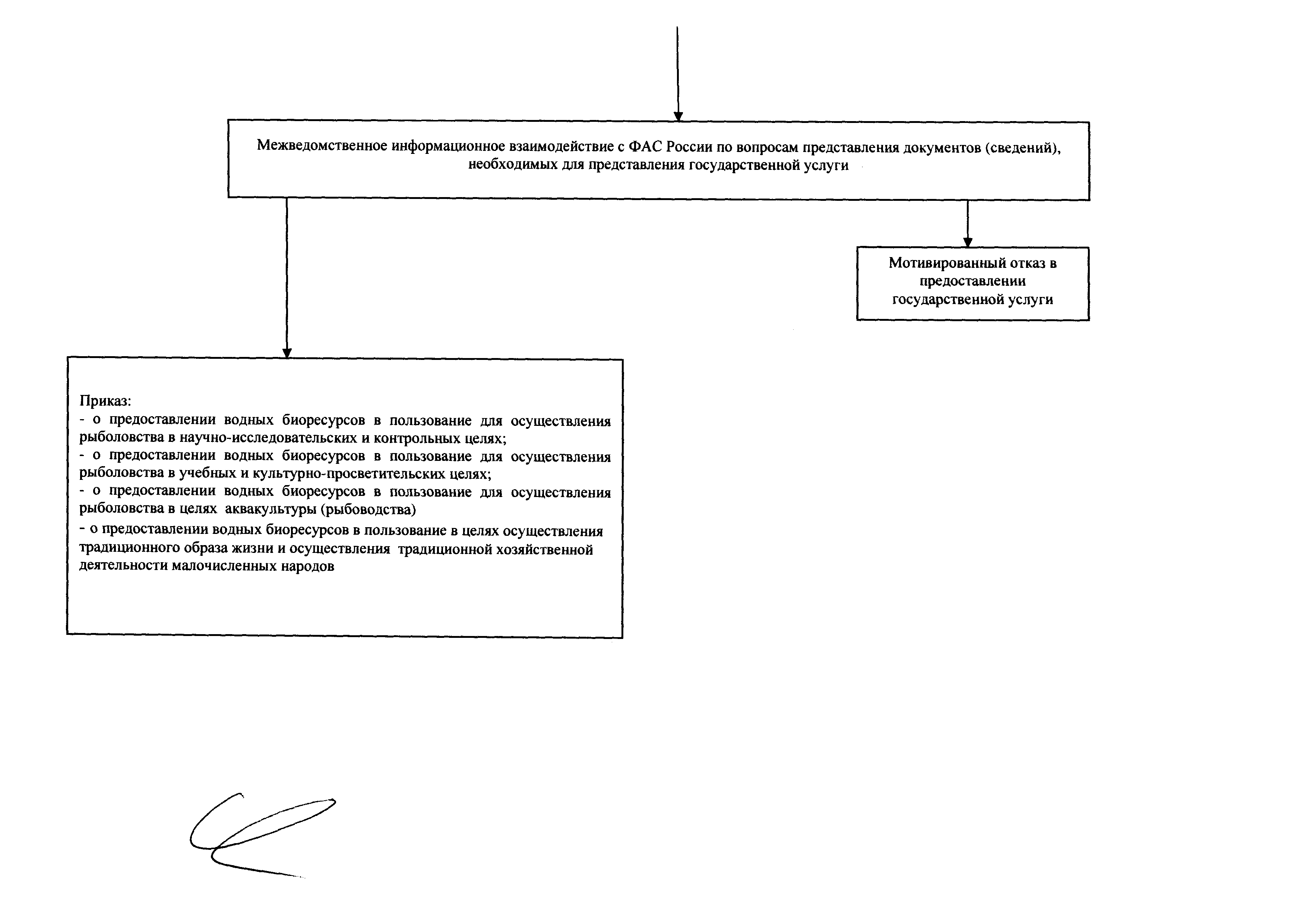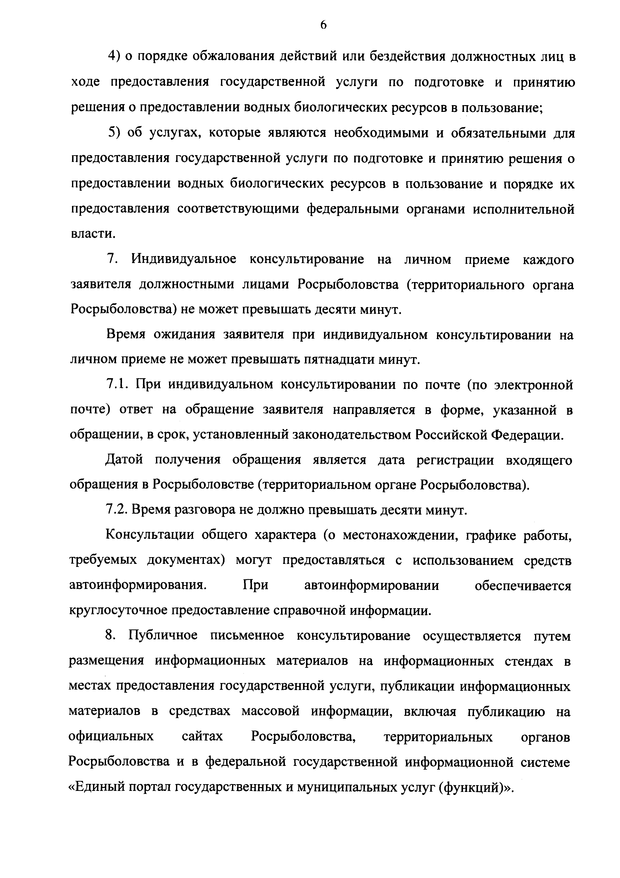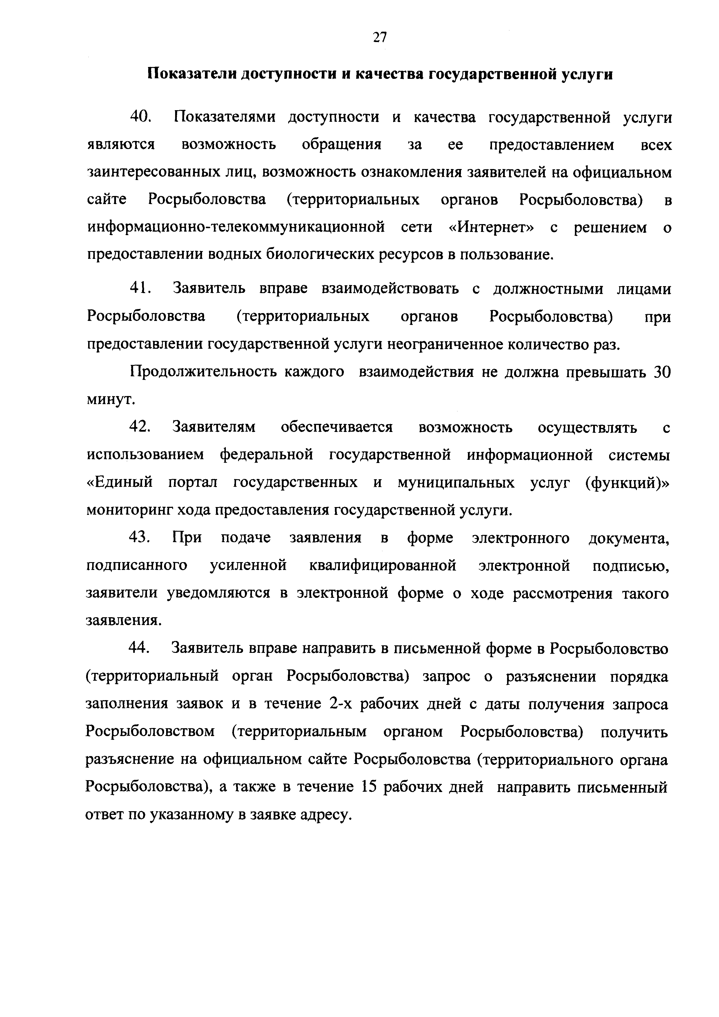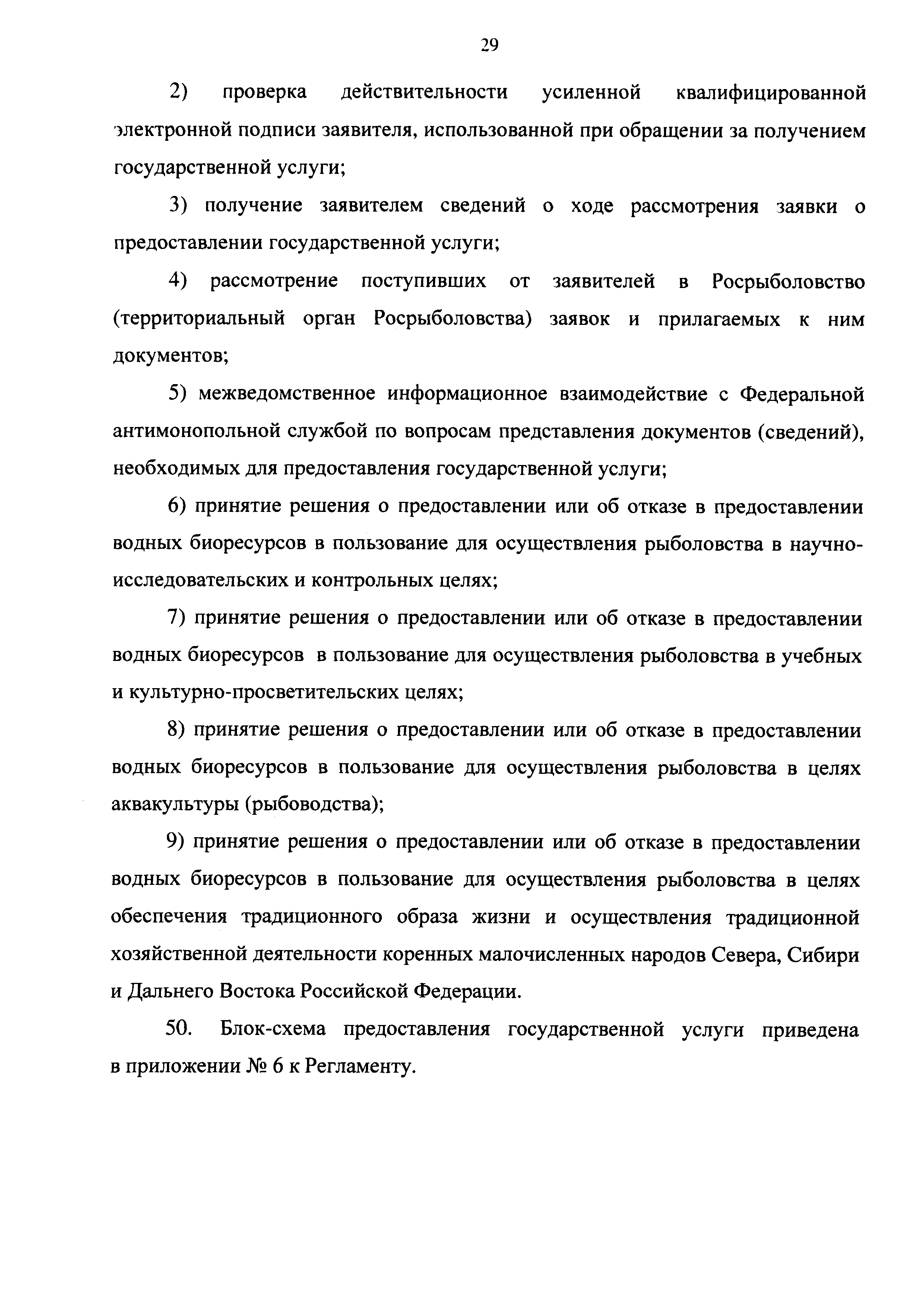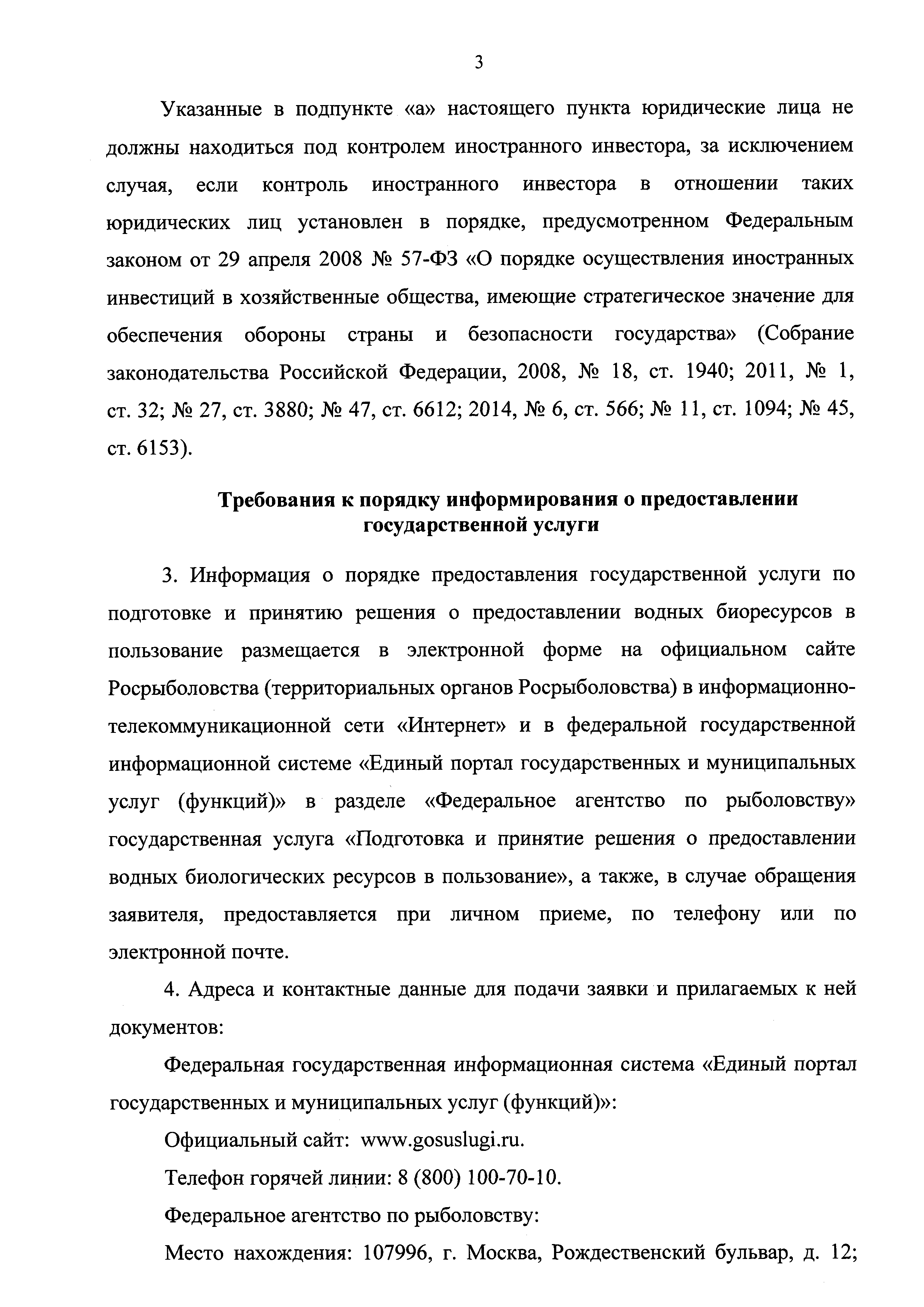 | | Нормативные ссылки: |   Федеральный закон 181-ФЗ «О социальной защите инвалидов в Российской Федерации» Кодекс «Кодекс внутреннего водного транспорта Российской Федерации» «Правила подготовки и принятия решения о предоставлении водных биологических ресурсов в пользование»  Федеральный закон 152-ФЗ «О персональных данных»  Федеральный закон 59-ФЗ «О порядке рассмотрения обращений граждан Российской Федерации»  Федеральный закон 63-ФЗ «Об электронной подписи»  Федеральный закон 166-ФЗ «О рыболовстве и сохранении водных биологических ресурсов» Постановление 373 «О разработке и утверждении административных регламентов осуществления государственного контроля (надзора) и административных регламентов предоставления государственных услуг»  «Требования к предоставлению в электронной форме государственных и муниципальных услуг» Распоряжение 631-р «Об утверждении перечня мест традиционного проживания и традиционной хозяйственной деятельности коренных малочисленных народов Российской Федерации и перечня видов традиционной хозяйственной деятельности коренных малочисленных народов Российской Федерации»  Федеральный закон 57-ФЗ «О порядке осуществления иностранных инвестиций в хозяйственные общества, имеющие стратегическое значение для обеспечения обороны страны и безопасности государства» Постановление 352 «Об утверждении перечня услуг, которые являются необходимыми и обязательными для предоставления федеральными органами исполнительной власти, Государственной корпорацией по атомной энергии "Росатом" государственных услуг и предоставляются организациями, участвующими в предоставлении государственных услуг, и определении размера платы за их оказание» «Положение о единой системе межведомственного электронного взаимодействия» «Правила подачи и рассмотрения жалоб на решения и действия (бездействие) федеральных органов исполнительной власти и их должностных лиц, федеральных государственных служащих, должностных лиц государственных внебюджетных фондов Российской Федерации, государственных корпораций, наделенных в соответствии с федеральными законами полномочиями по предоставлению государственных услуг в установленной сфере деятельности, и их должностных лиц, организаций, предусмотренных частью 1.1 статьи 16 Федерального закона "Об организации предоставления государственных и муниципальных услуг", и их работников, а также многофункциональных центров предоставления государственных и муниципальных услуг и их работников»  «Правила использования усиленной квалифицированной электронной подписи при обращении за получением государственных и муниципальных услуг»  Постановление 444 «О Федеральном агентстве по рыболовству» «Правила организации искусственного воспроизводства водных биологических ресурсов»