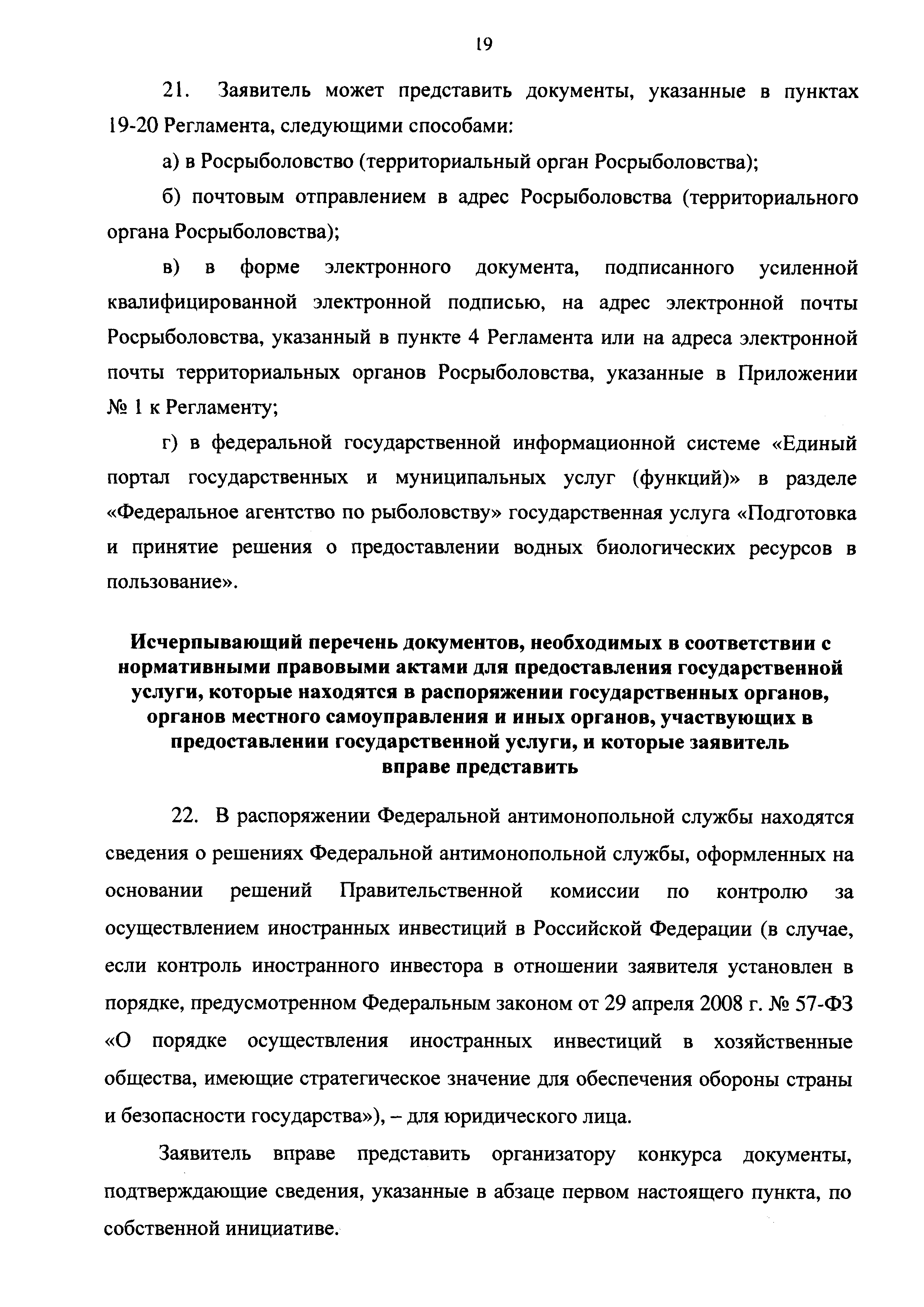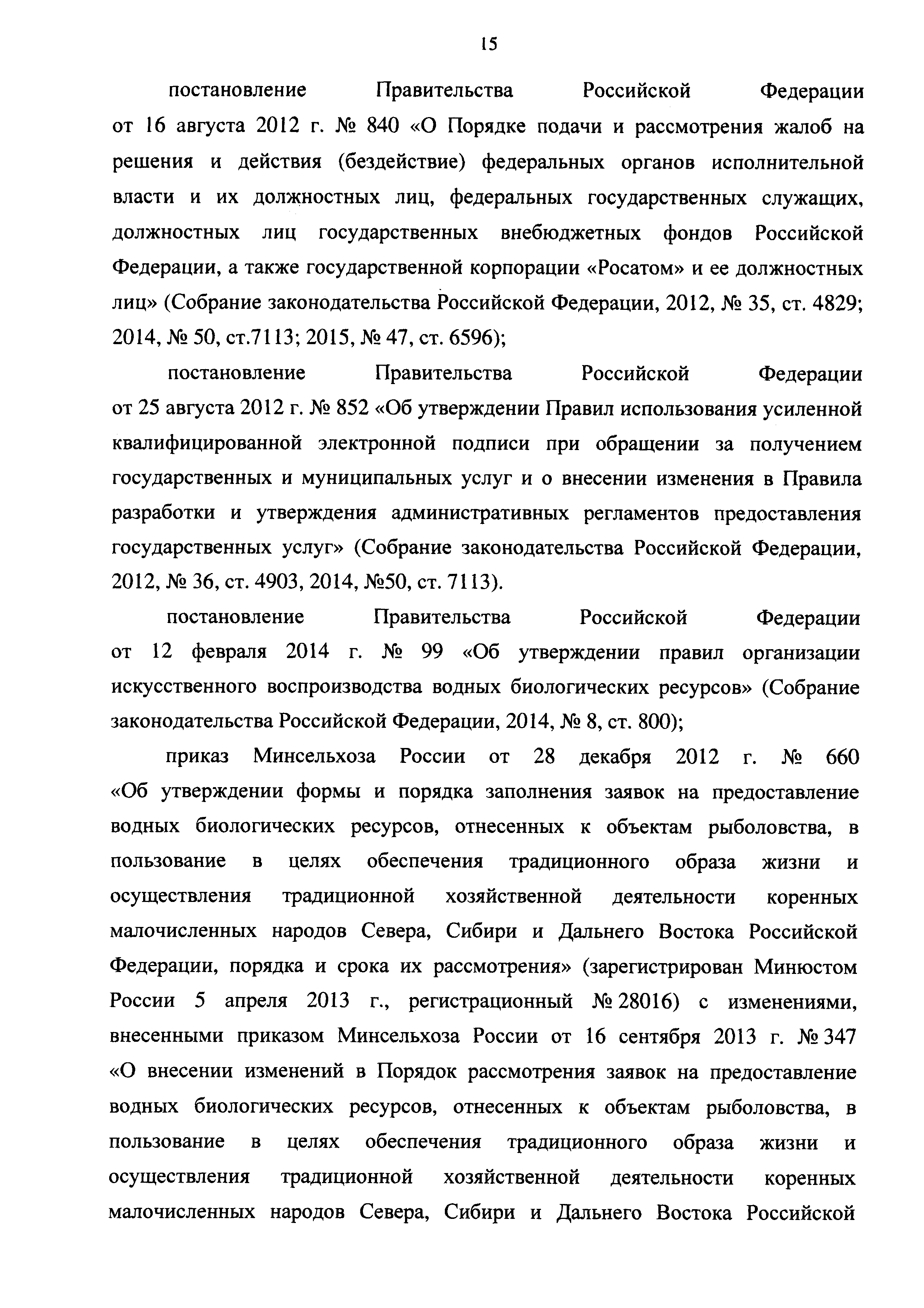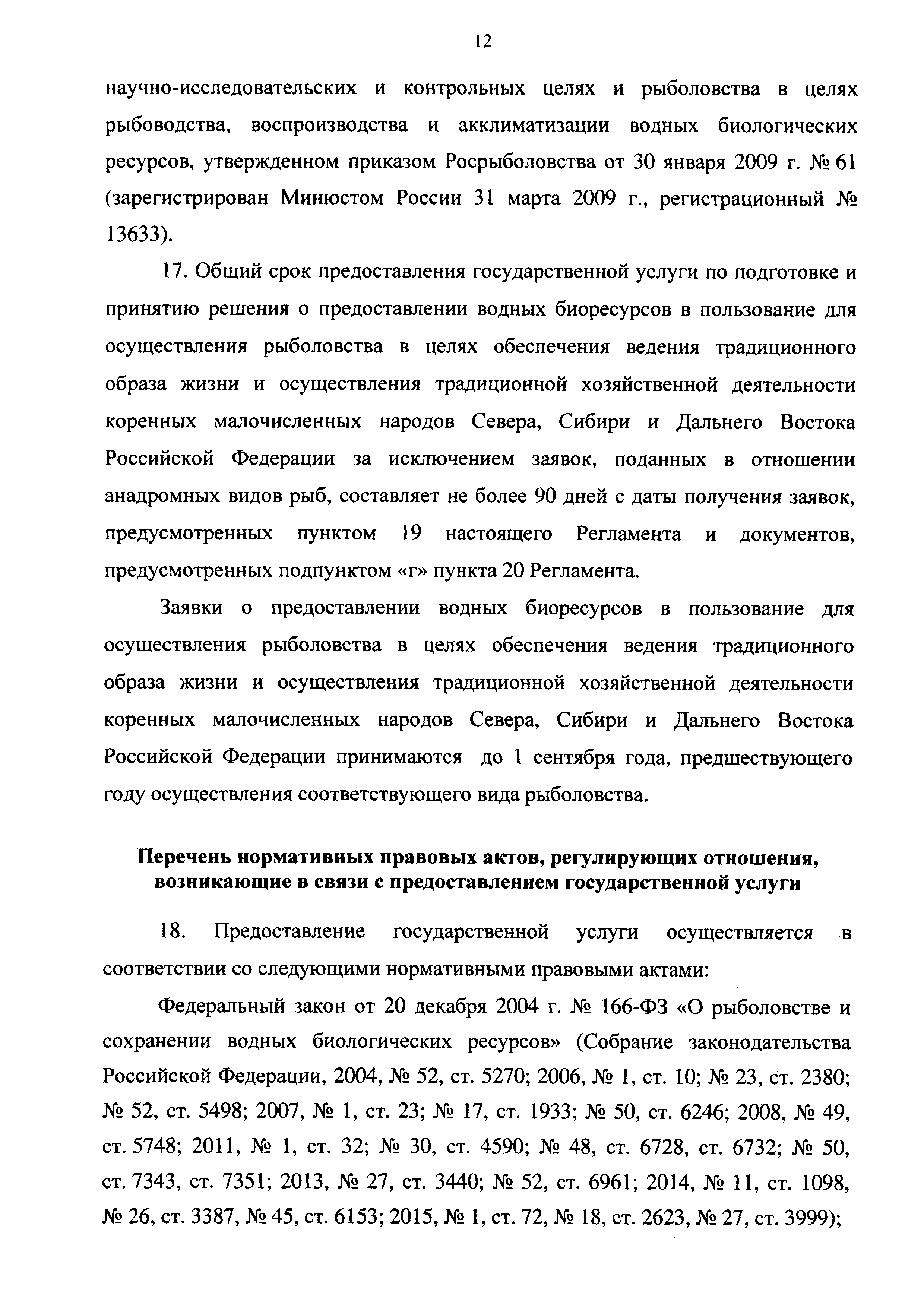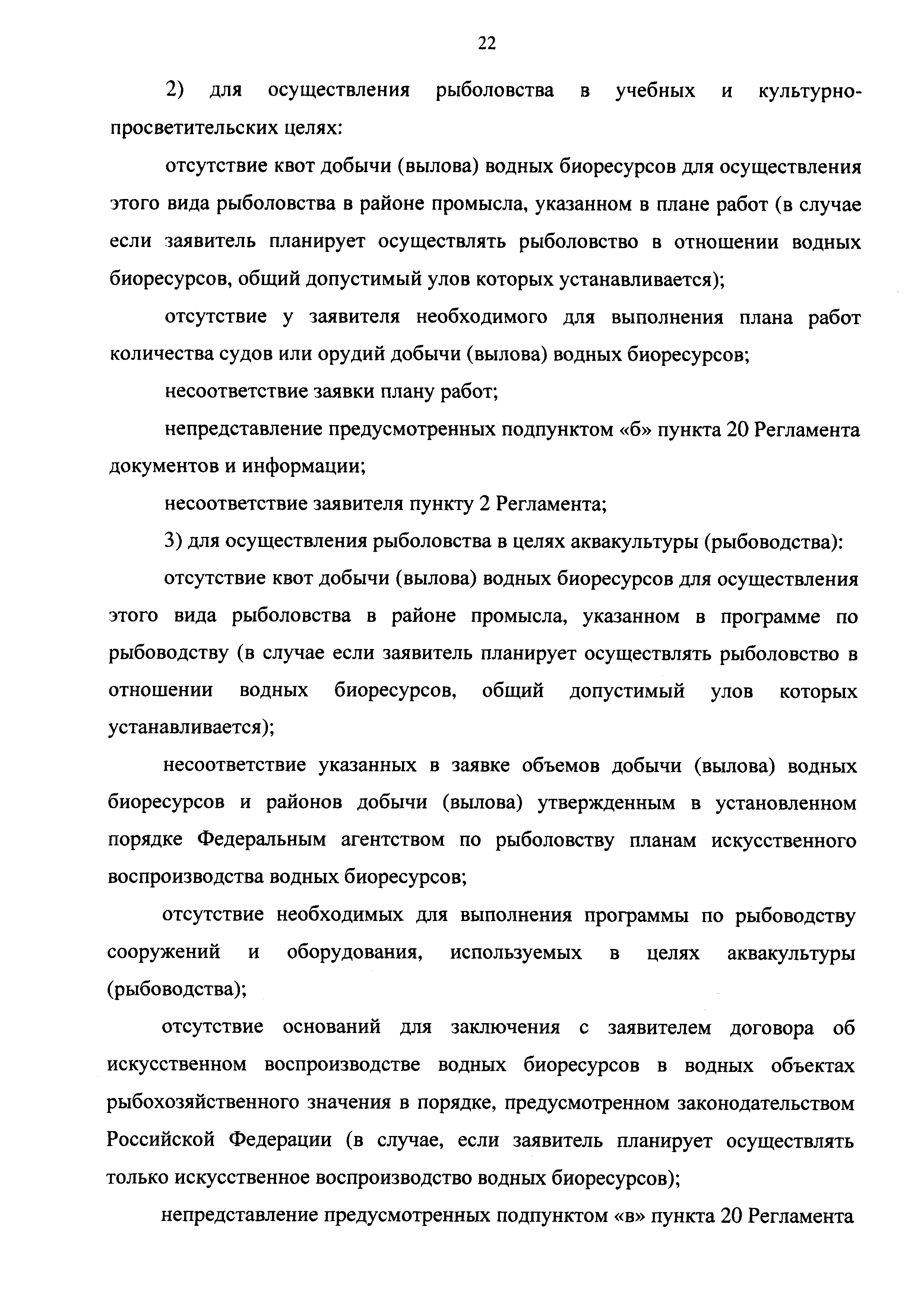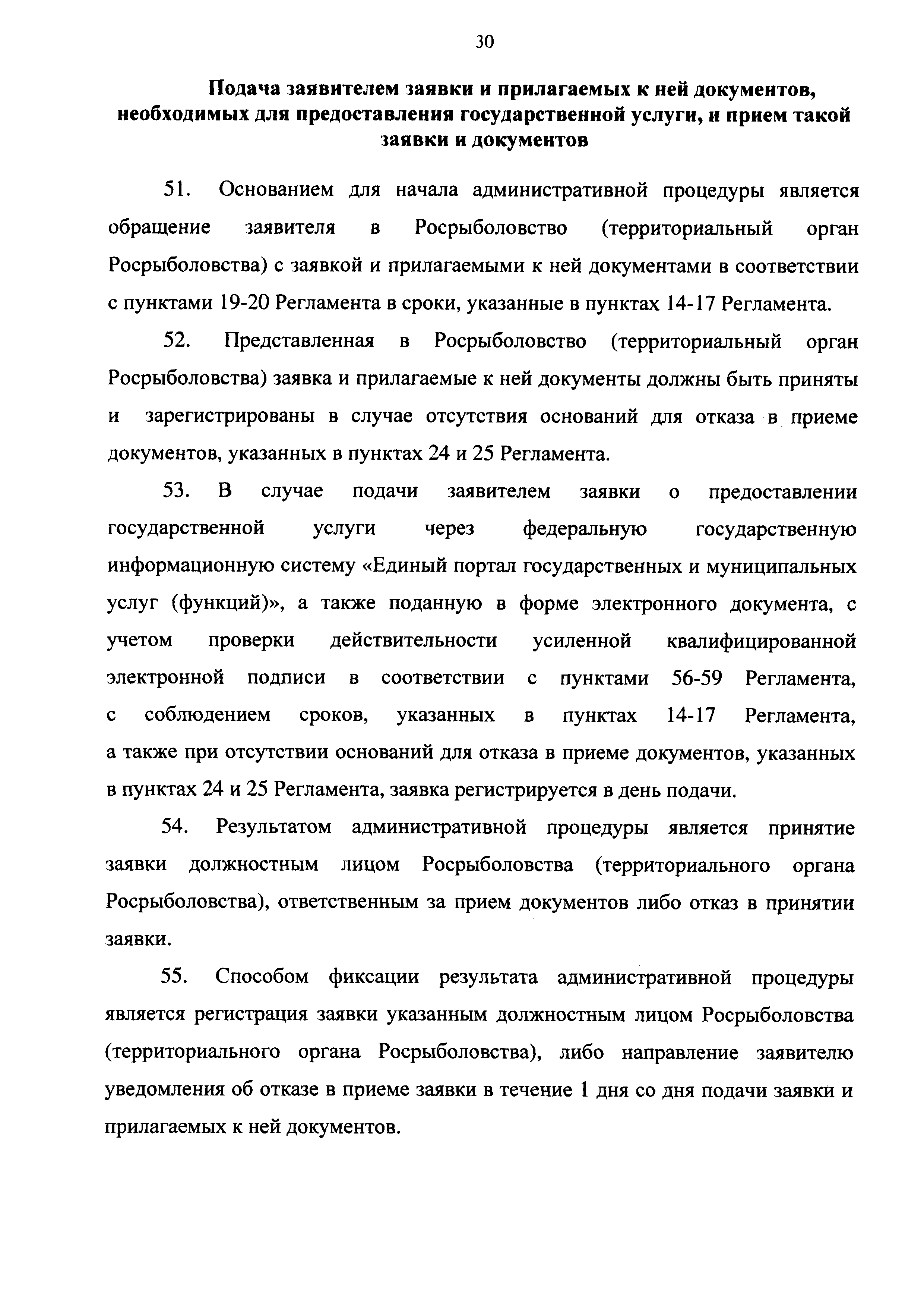 | | Нормативные ссылки: |   Федеральный закон 181-ФЗ «О социальной защите инвалидов в Российской Федерации» Кодекс «Кодекс внутреннего водного транспорта Российской Федерации» «Правила подготовки и принятия решения о предоставлении водных биологических ресурсов в пользование»  Федеральный закон 152-ФЗ «О персональных данных»  Федеральный закон 59-ФЗ «О порядке рассмотрения обращений граждан Российской Федерации»  Федеральный закон 63-ФЗ «Об электронной подписи»  Федеральный закон 166-ФЗ «О рыболовстве и сохранении водных биологических ресурсов» Постановление 373 «О разработке и утверждении административных регламентов осуществления государственного контроля (надзора) и административных регламентов предоставления государственных услуг»  «Требования к предоставлению в электронной форме государственных и муниципальных услуг» Распоряжение 631-р «Об утверждении перечня мест традиционного проживания и традиционной хозяйственной деятельности коренных малочисленных народов Российской Федерации и перечня видов традиционной хозяйственной деятельности коренных малочисленных народов Российской Федерации»  Федеральный закон 57-ФЗ «О порядке осуществления иностранных инвестиций в хозяйственные общества, имеющие стратегическое значение для обеспечения обороны страны и безопасности государства» Постановление 352 «Об утверждении перечня услуг, которые являются необходимыми и обязательными для предоставления федеральными органами исполнительной власти, Государственной корпорацией по атомной энергии "Росатом" государственных услуг и предоставляются организациями, участвующими в предоставлении государственных услуг, и определении размера платы за их оказание» «Положение о единой системе межведомственного электронного взаимодействия» «Правила подачи и рассмотрения жалоб на решения и действия (бездействие) федеральных органов исполнительной власти и их должностных лиц, федеральных государственных служащих, должностных лиц государственных внебюджетных фондов Российской Федерации, государственных корпораций, наделенных в соответствии с федеральными законами полномочиями по предоставлению государственных услуг в установленной сфере деятельности, и их должностных лиц, организаций, предусмотренных частью 1.1 статьи 16 Федерального закона "Об организации предоставления государственных и муниципальных услуг", и их работников, а также многофункциональных центров предоставления государственных и муниципальных услуг и их работников»  «Правила использования усиленной квалифицированной электронной подписи при обращении за получением государственных и муниципальных услуг»  Постановление 444 «О Федеральном агентстве по рыболовству» «Правила организации искусственного воспроизводства водных биологических ресурсов»