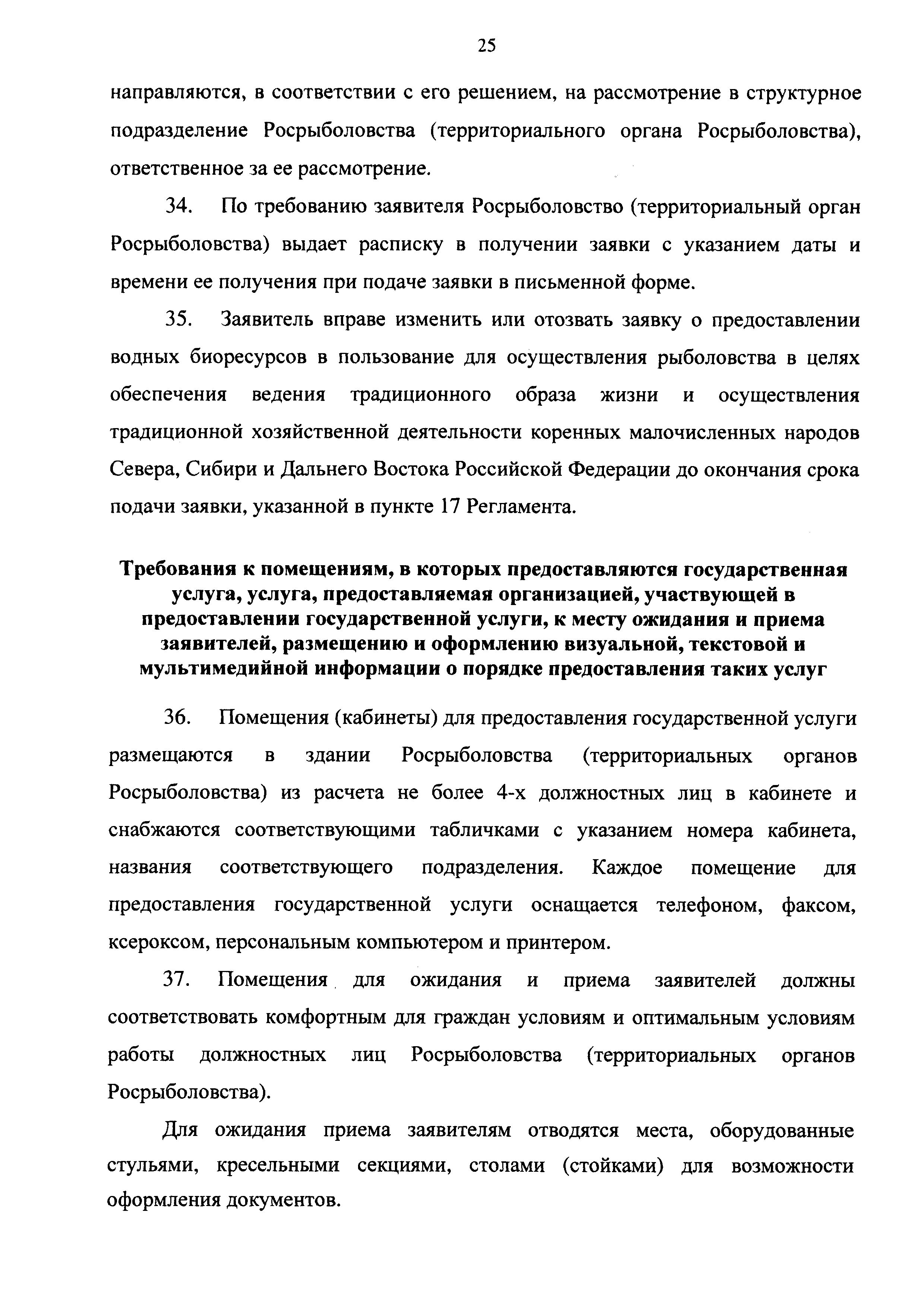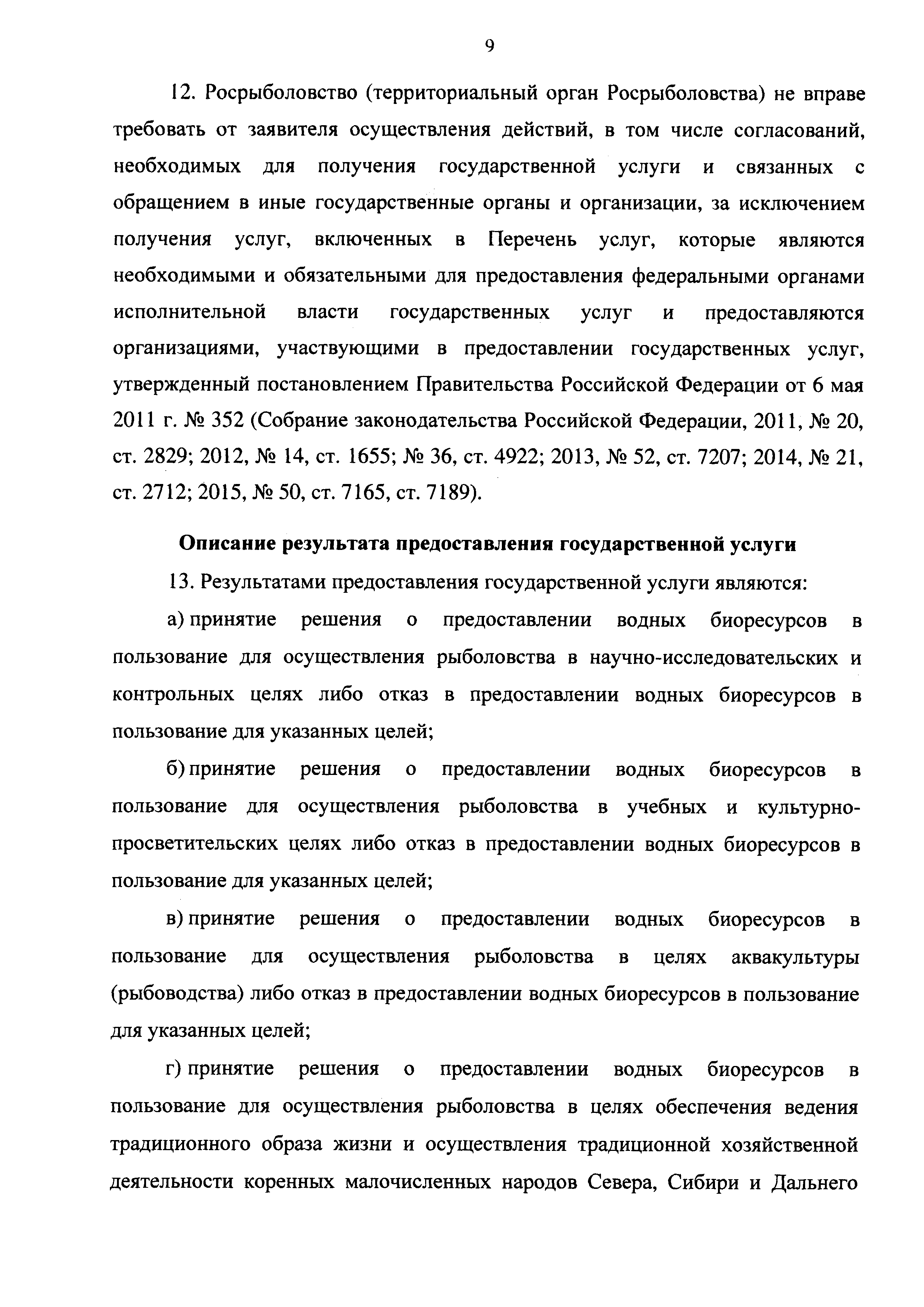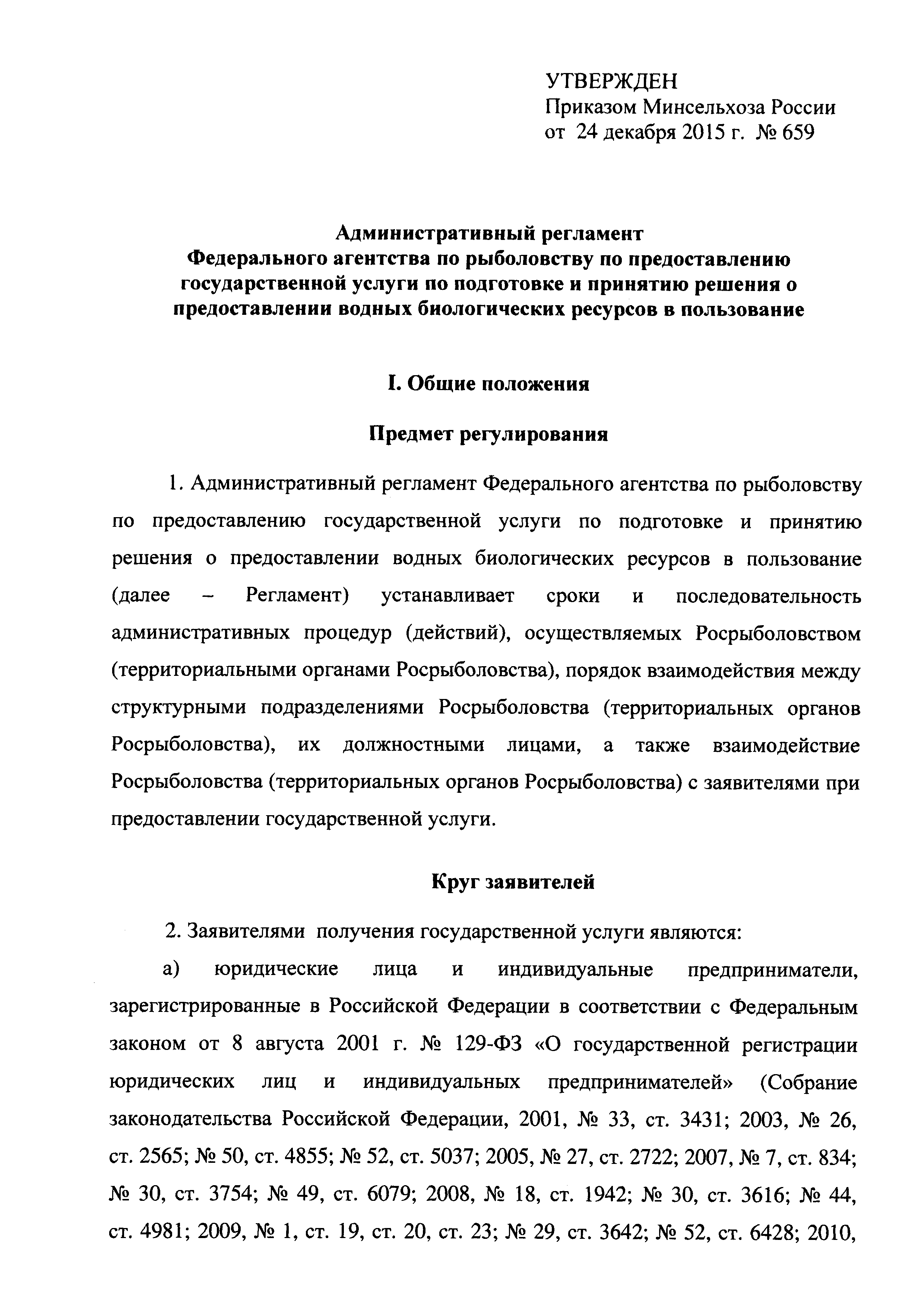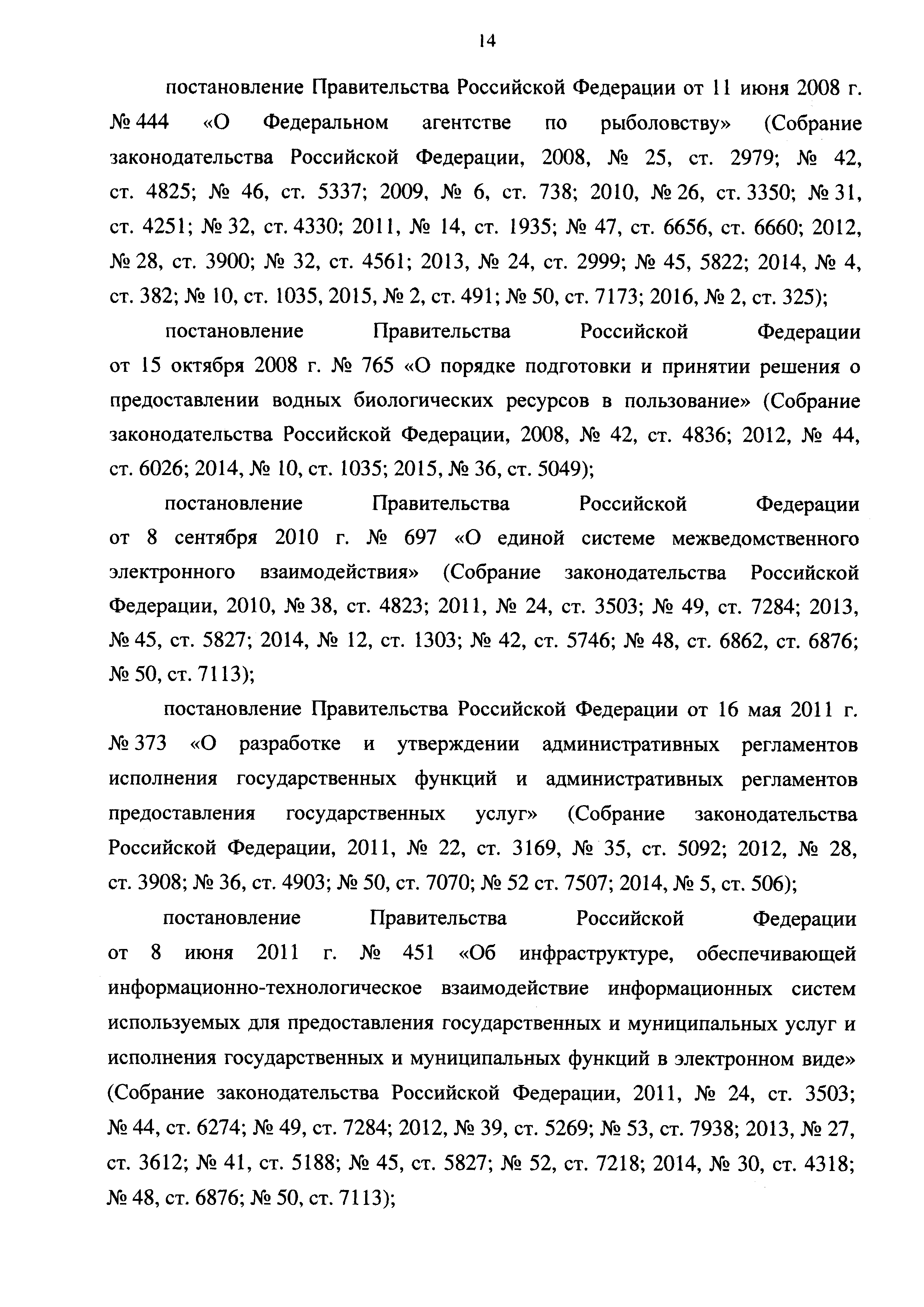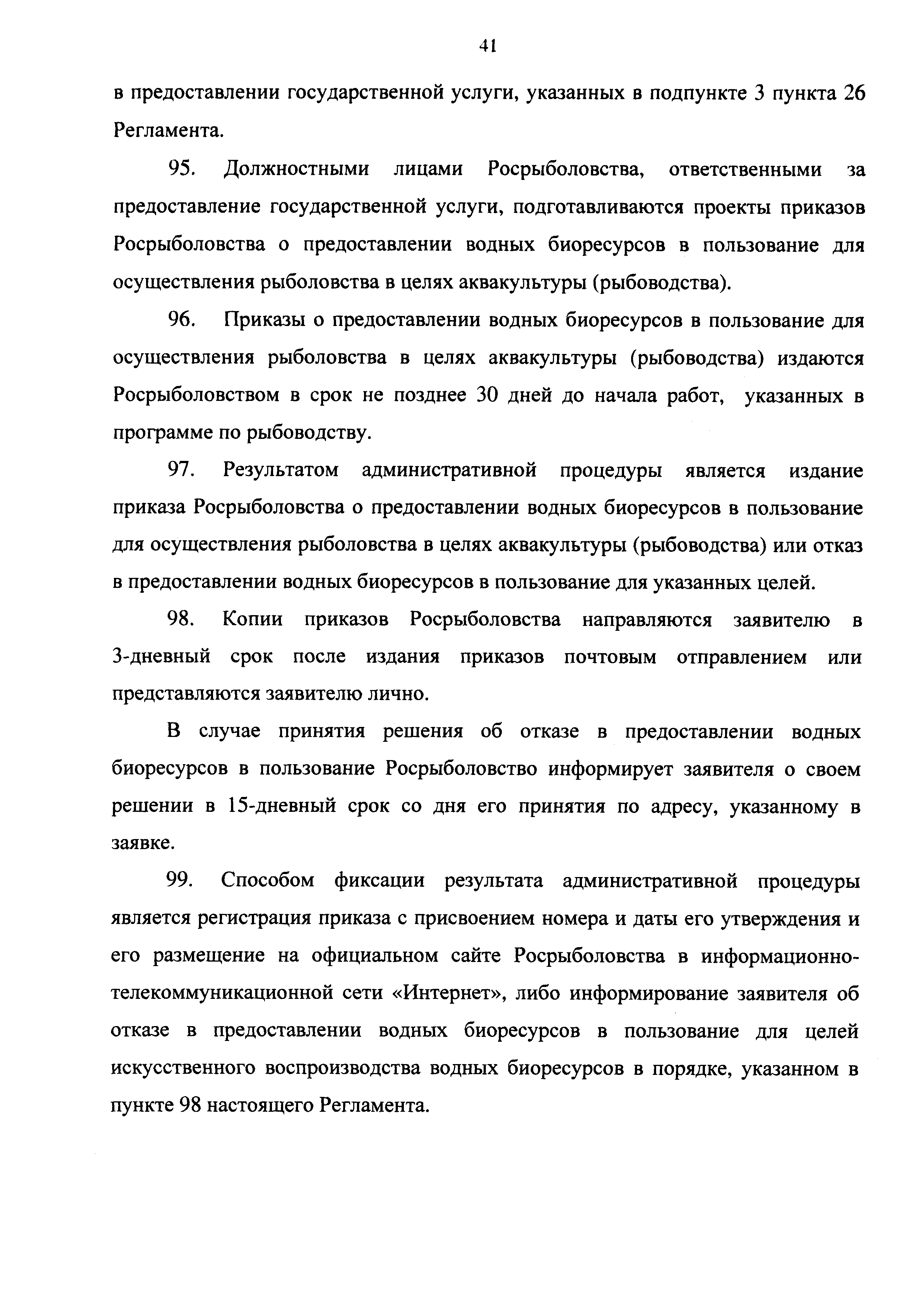 | | Нормативные ссылки: |   Федеральный закон 181-ФЗ «О социальной защите инвалидов в Российской Федерации» Кодекс «Кодекс внутреннего водного транспорта Российской Федерации» «Правила подготовки и принятия решения о предоставлении водных биологических ресурсов в пользование»  Федеральный закон 152-ФЗ «О персональных данных»  Федеральный закон 59-ФЗ «О порядке рассмотрения обращений граждан Российской Федерации»  Федеральный закон 63-ФЗ «Об электронной подписи»  Федеральный закон 166-ФЗ «О рыболовстве и сохранении водных биологических ресурсов» Постановление 373 «О разработке и утверждении административных регламентов осуществления государственного контроля (надзора) и административных регламентов предоставления государственных услуг»  «Требования к предоставлению в электронной форме государственных и муниципальных услуг» Распоряжение 631-р «Об утверждении перечня мест традиционного проживания и традиционной хозяйственной деятельности коренных малочисленных народов Российской Федерации и перечня видов традиционной хозяйственной деятельности коренных малочисленных народов Российской Федерации»  Федеральный закон 57-ФЗ «О порядке осуществления иностранных инвестиций в хозяйственные общества, имеющие стратегическое значение для обеспечения обороны страны и безопасности государства» Постановление 352 «Об утверждении перечня услуг, которые являются необходимыми и обязательными для предоставления федеральными органами исполнительной власти, Государственной корпорацией по атомной энергии "Росатом" государственных услуг и предоставляются организациями, участвующими в предоставлении государственных услуг, и определении размера платы за их оказание» «Положение о единой системе межведомственного электронного взаимодействия» «Правила подачи и рассмотрения жалоб на решения и действия (бездействие) федеральных органов исполнительной власти и их должностных лиц, федеральных государственных служащих, должностных лиц государственных внебюджетных фондов Российской Федерации, государственных корпораций, наделенных в соответствии с федеральными законами полномочиями по предоставлению государственных услуг в установленной сфере деятельности, и их должностных лиц, организаций, предусмотренных частью 1.1 статьи 16 Федерального закона "Об организации предоставления государственных и муниципальных услуг", и их работников, а также многофункциональных центров предоставления государственных и муниципальных услуг и их работников»  «Правила использования усиленной квалифицированной электронной подписи при обращении за получением государственных и муниципальных услуг»  Постановление 444 «О Федеральном агентстве по рыболовству» «Правила организации искусственного воспроизводства водных биологических ресурсов»