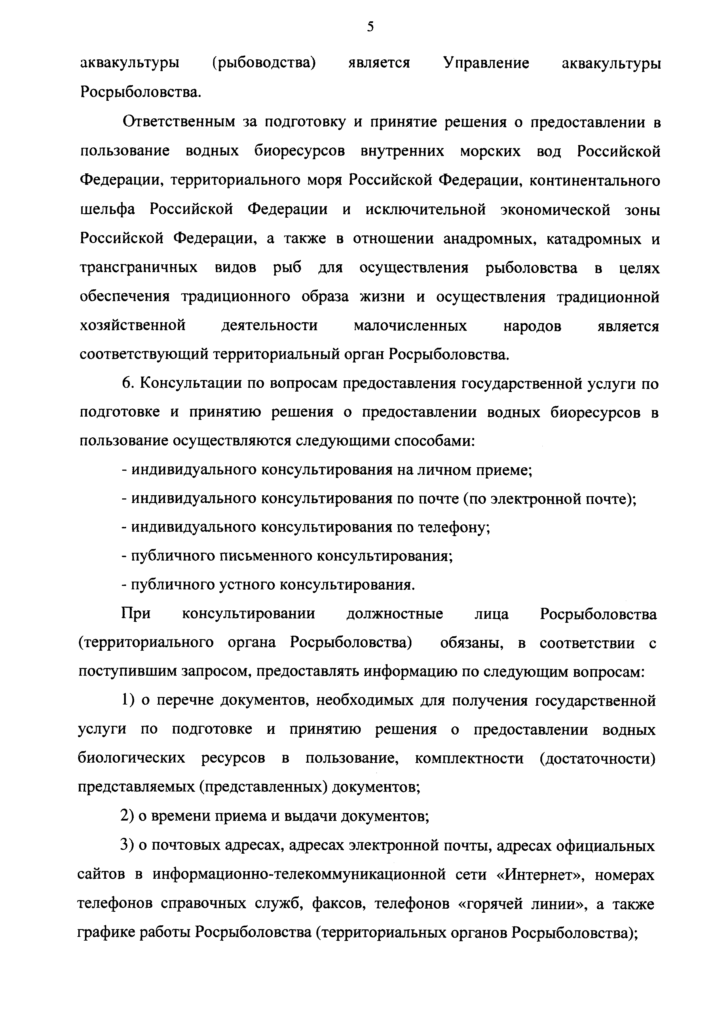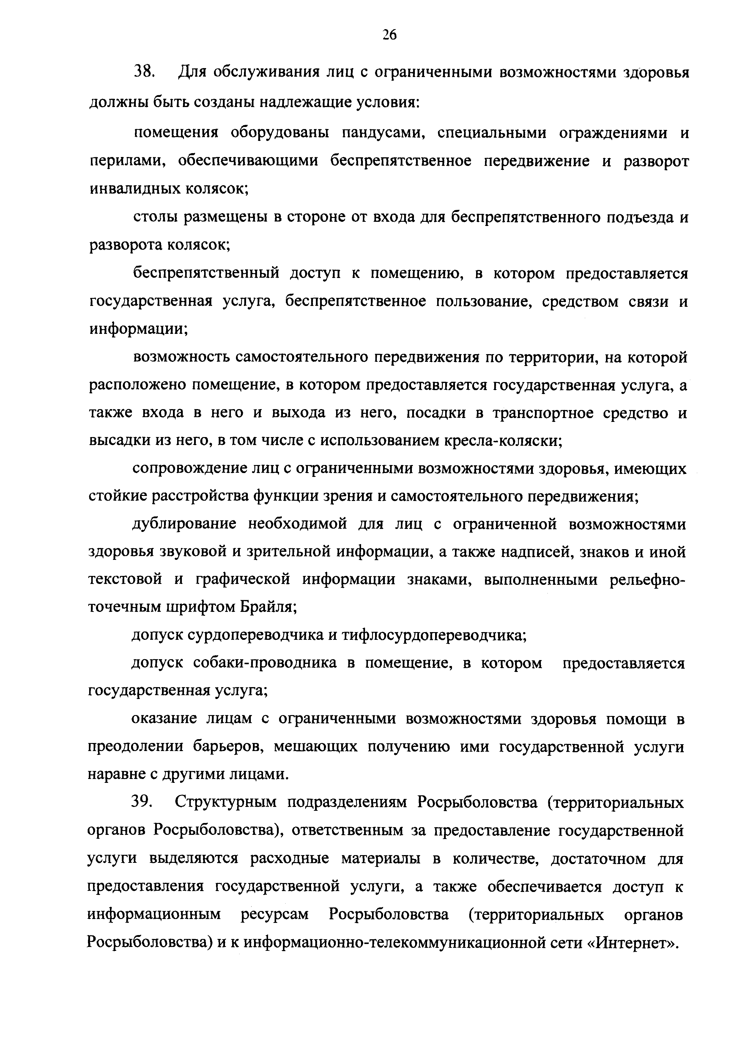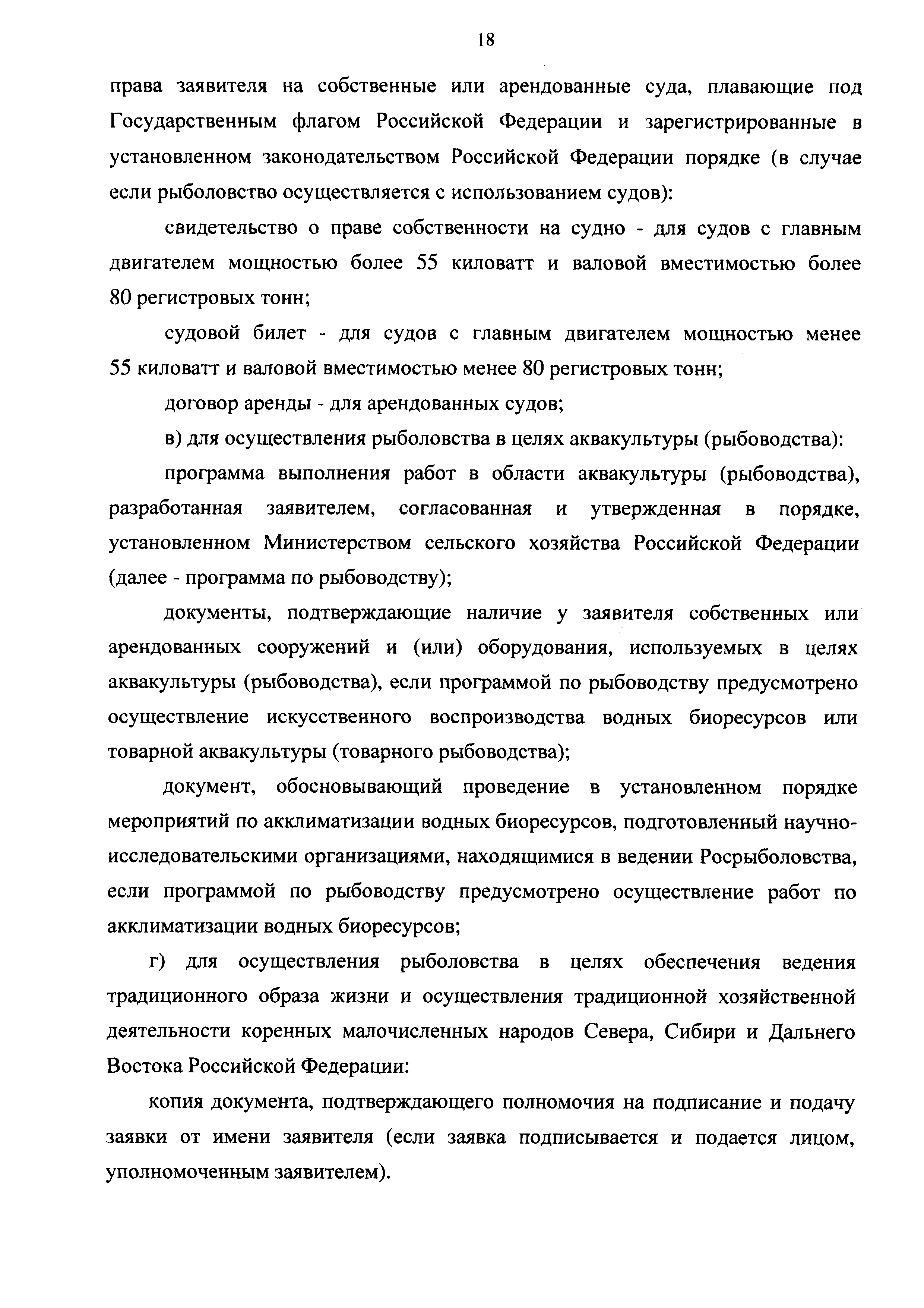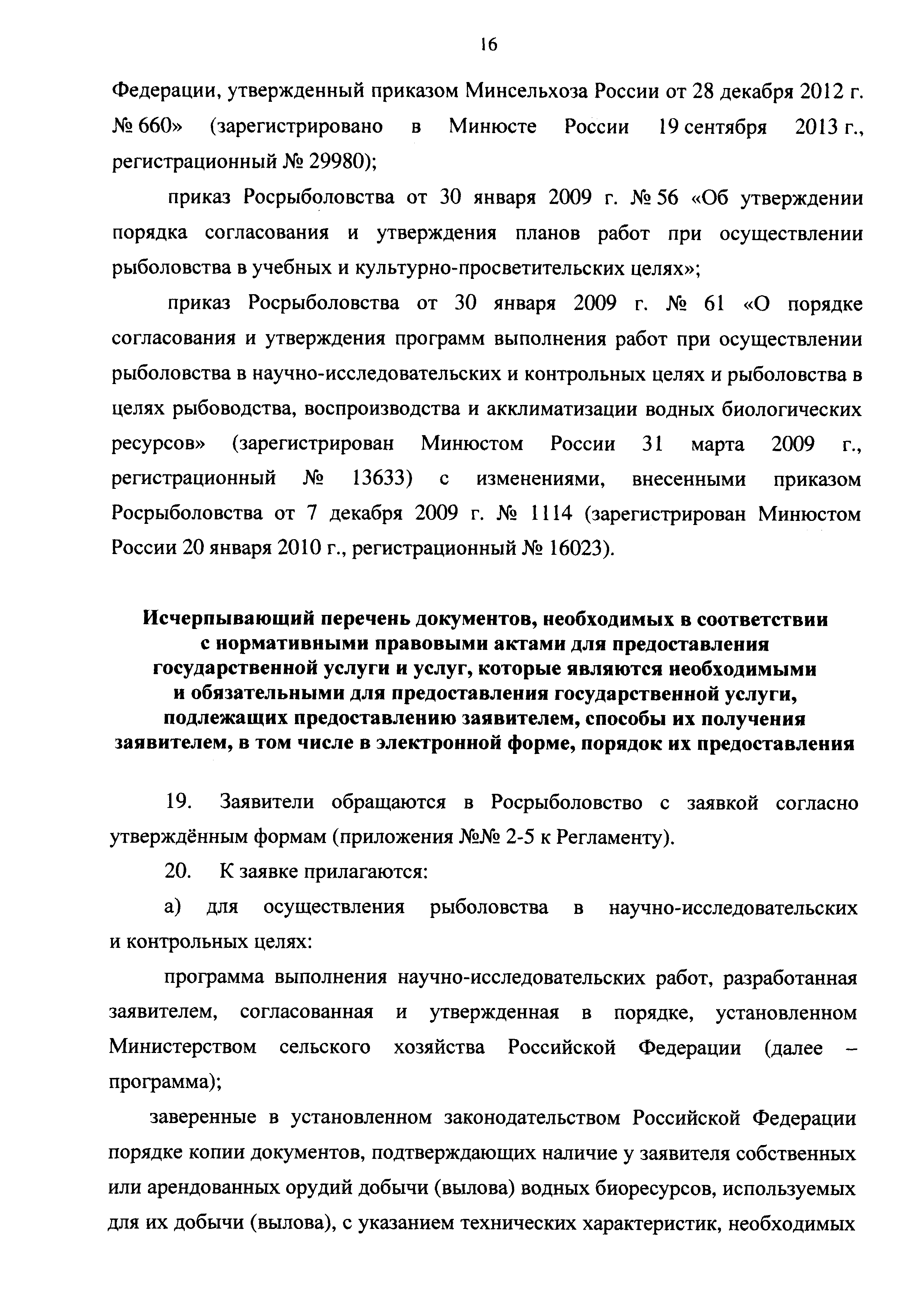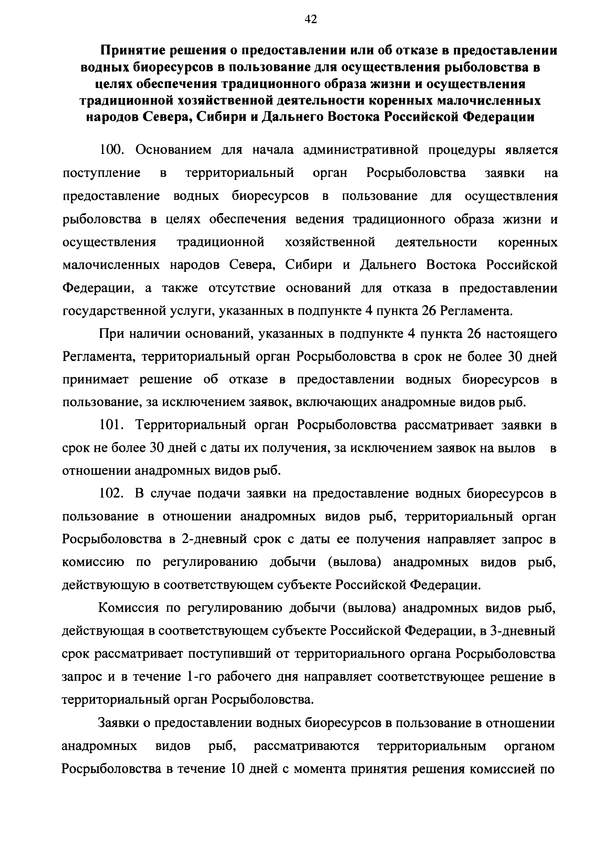 | | Нормативные ссылки: |   Федеральный закон 181-ФЗ «О социальной защите инвалидов в Российской Федерации» Кодекс «Кодекс внутреннего водного транспорта Российской Федерации» «Правила подготовки и принятия решения о предоставлении водных биологических ресурсов в пользование»  Федеральный закон 152-ФЗ «О персональных данных»  Федеральный закон 59-ФЗ «О порядке рассмотрения обращений граждан Российской Федерации»  Федеральный закон 63-ФЗ «Об электронной подписи»  Федеральный закон 166-ФЗ «О рыболовстве и сохранении водных биологических ресурсов» Постановление 373 «О разработке и утверждении административных регламентов осуществления государственного контроля (надзора) и административных регламентов предоставления государственных услуг»  «Требования к предоставлению в электронной форме государственных и муниципальных услуг» Распоряжение 631-р «Об утверждении перечня мест традиционного проживания и традиционной хозяйственной деятельности коренных малочисленных народов Российской Федерации и перечня видов традиционной хозяйственной деятельности коренных малочисленных народов Российской Федерации»  Федеральный закон 57-ФЗ «О порядке осуществления иностранных инвестиций в хозяйственные общества, имеющие стратегическое значение для обеспечения обороны страны и безопасности государства» Постановление 352 «Об утверждении перечня услуг, которые являются необходимыми и обязательными для предоставления федеральными органами исполнительной власти, Государственной корпорацией по атомной энергии "Росатом" государственных услуг и предоставляются организациями, участвующими в предоставлении государственных услуг, и определении размера платы за их оказание» «Положение о единой системе межведомственного электронного взаимодействия» «Правила подачи и рассмотрения жалоб на решения и действия (бездействие) федеральных органов исполнительной власти и их должностных лиц, федеральных государственных служащих, должностных лиц государственных внебюджетных фондов Российской Федерации, государственных корпораций, наделенных в соответствии с федеральными законами полномочиями по предоставлению государственных услуг в установленной сфере деятельности, и их должностных лиц, организаций, предусмотренных частью 1.1 статьи 16 Федерального закона "Об организации предоставления государственных и муниципальных услуг", и их работников, а также многофункциональных центров предоставления государственных и муниципальных услуг и их работников»  «Правила использования усиленной квалифицированной электронной подписи при обращении за получением государственных и муниципальных услуг»  Постановление 444 «О Федеральном агентстве по рыболовству» «Правила организации искусственного воспроизводства водных биологических ресурсов»